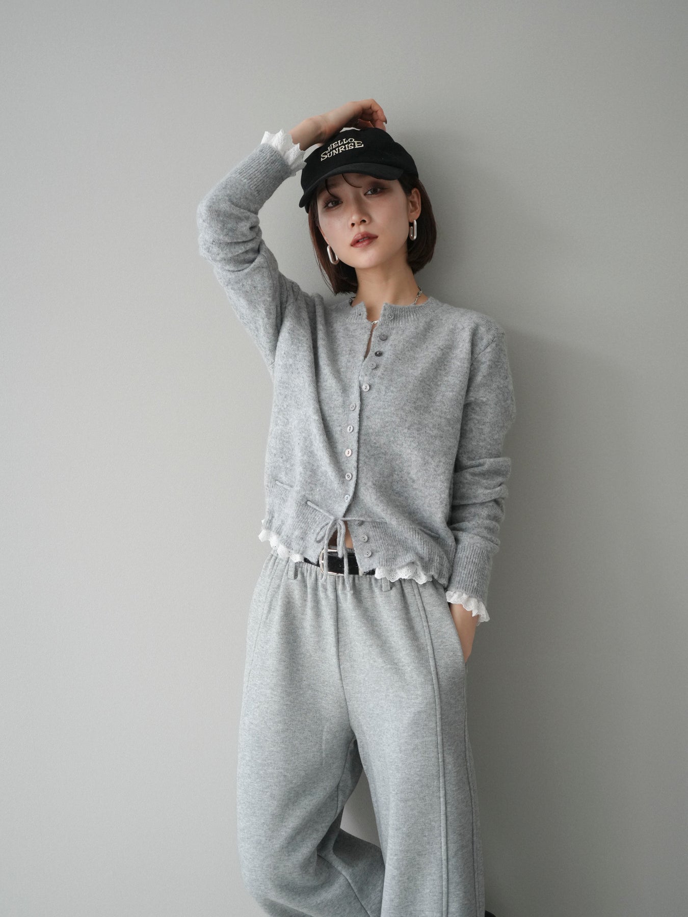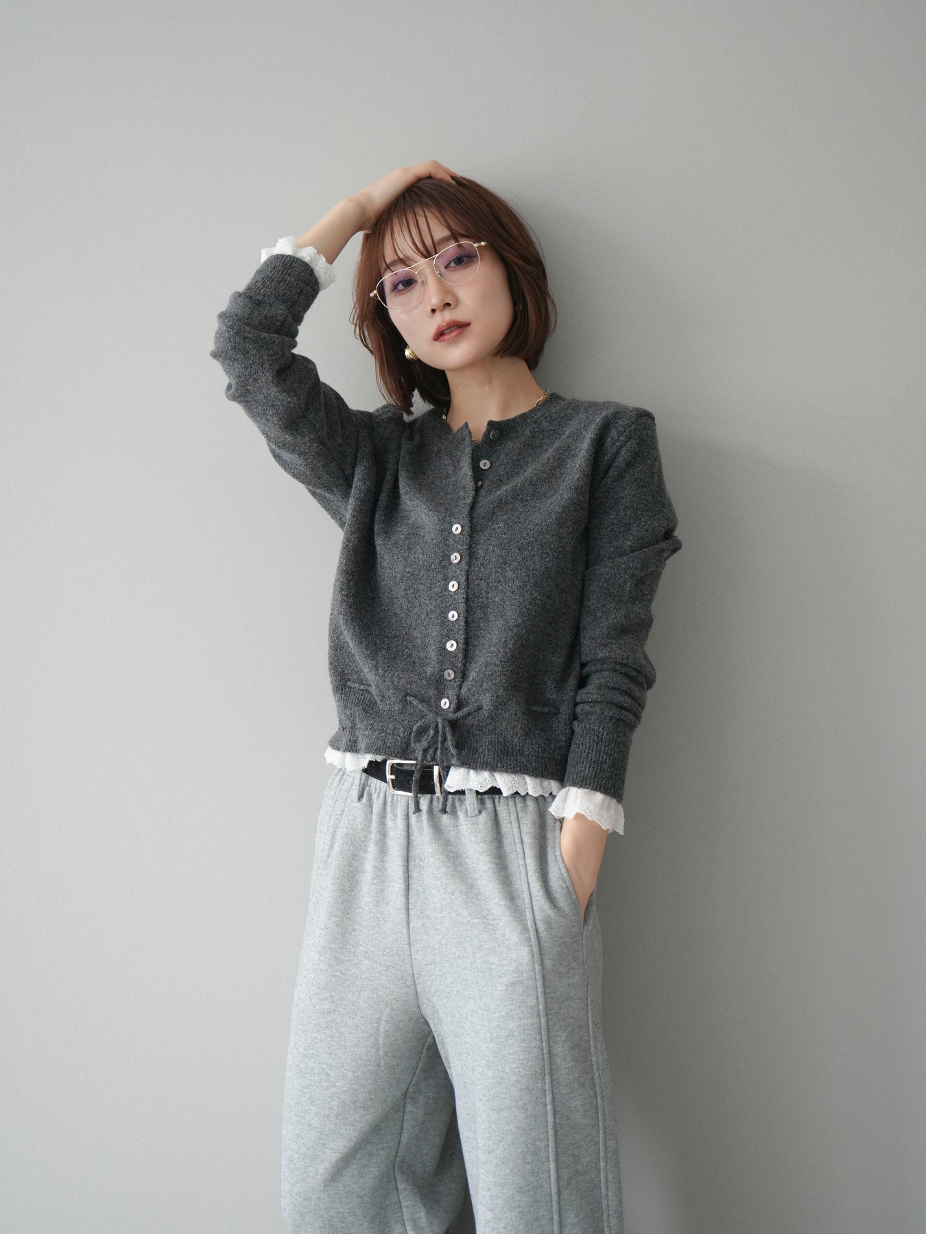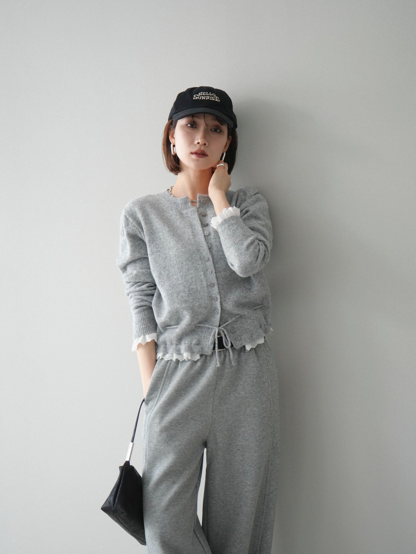 繊細な表情を添えるスカラップレースの切り替えが印象的な、ニットカーディガン。 フロントはボタン仕様で、きちんと感がありながらも、裾や袖口に施されたレースディテールが程よいやわらかさをプラスします。直線的になりすぎないデザインで、シンプルな装いにも自然なアクセントを加えてくれる一枚です。 ニット素材は軽やかで、肌あたりもやさしく、長時間の着用でもストレスを感じにくい仕上がり。ウエスト部分にはさりげない切り替えがあり、全体のバランスを整えつつ、トップスとしても羽織りとしても使いやすい設計です。パンツにもスカートにも合わせやすく、コーディネートに取り入れるだけで雰囲気が引き締まります。 予約商品としてのご用意となり、季節の変わり目にも重宝する一着。レイヤードスタイルにも対応し、着回し力の高さも魅力です。 ※ボトムス、キャミソール(インナー)以外の商品は一律でインナーは付属していません。