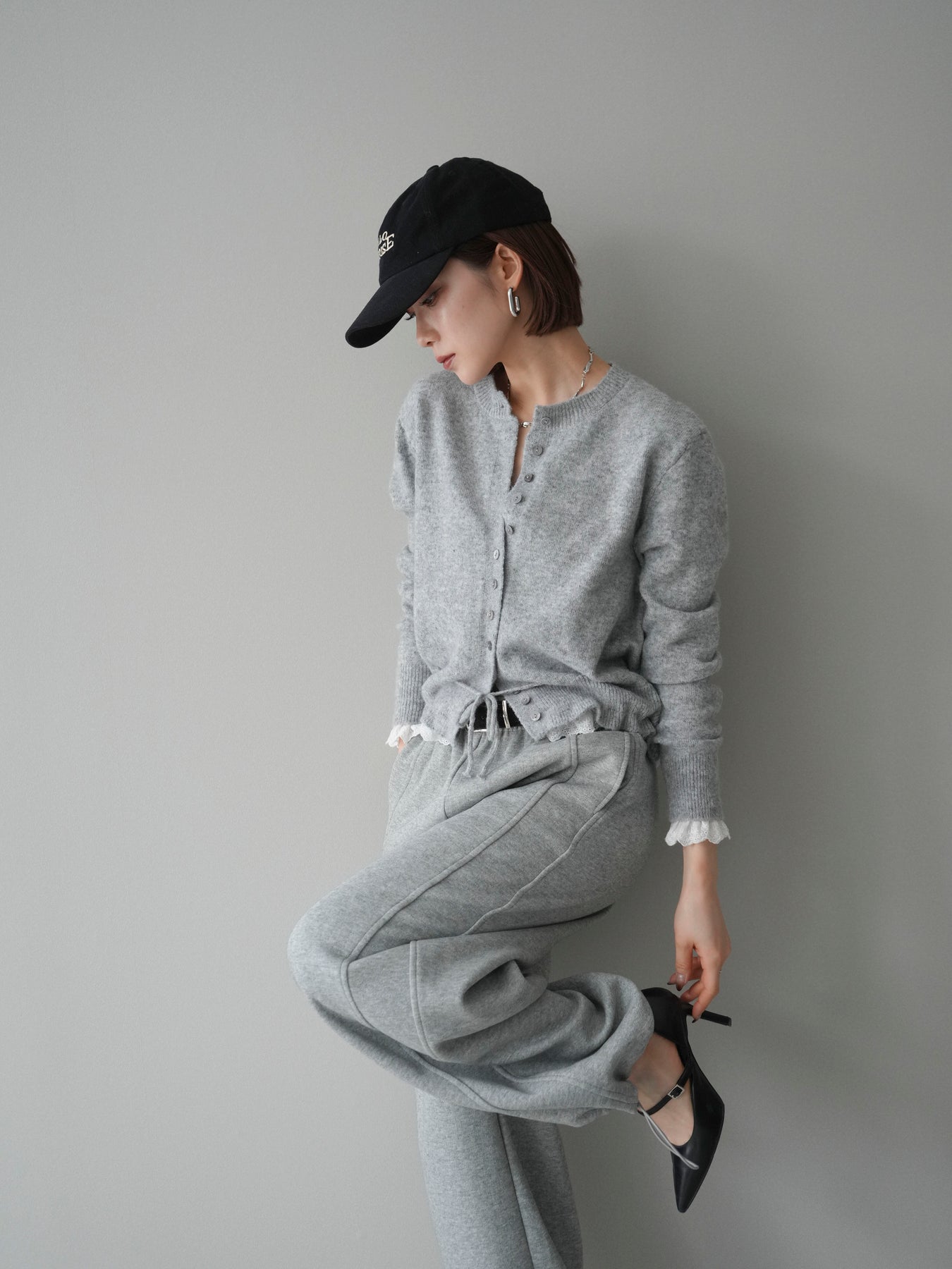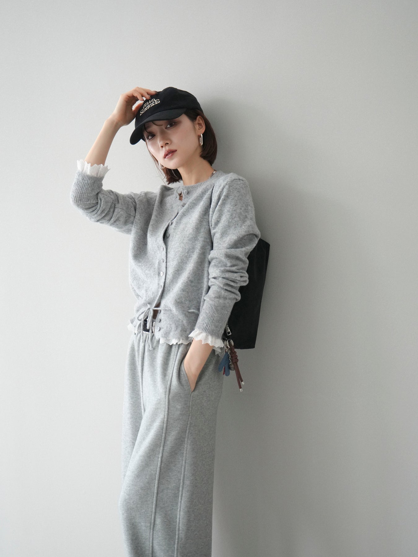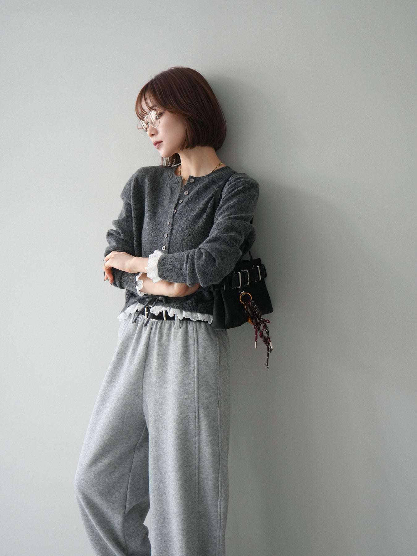 繊細な表情を添えるスカラップレースの切り替えが印象的な、ニットカーディガン。 フロントはボタン仕様で、きちんと感がありながらも、裾や袖口に施されたレースディテールが程よいやわらかさをプラスします。直線的になりすぎないデザインで、シンプルな装いにも自然なアクセントを加えてくれる一枚です。 ニット素材は軽やかで、肌あたりもやさしく、長時間の着用でもストレスを感じにくい仕上がり。ウエスト部分にはさりげない切り替えがあり、全体のバランスを整えつつ、トップスとしても羽織りとしても使いやすい設計です。パンツにもスカートにも合わせやすく、コーディネートに取り入れるだけで雰囲気が引き締まります。 予約商品としてのご用意となり、季節の変わり目にも重宝する一着。レイヤードスタイルにも対応し、着回し力の高さも魅力です。 ※ボトムス、キャミソール(インナー)以外の商品は一律でインナーは付属していません。