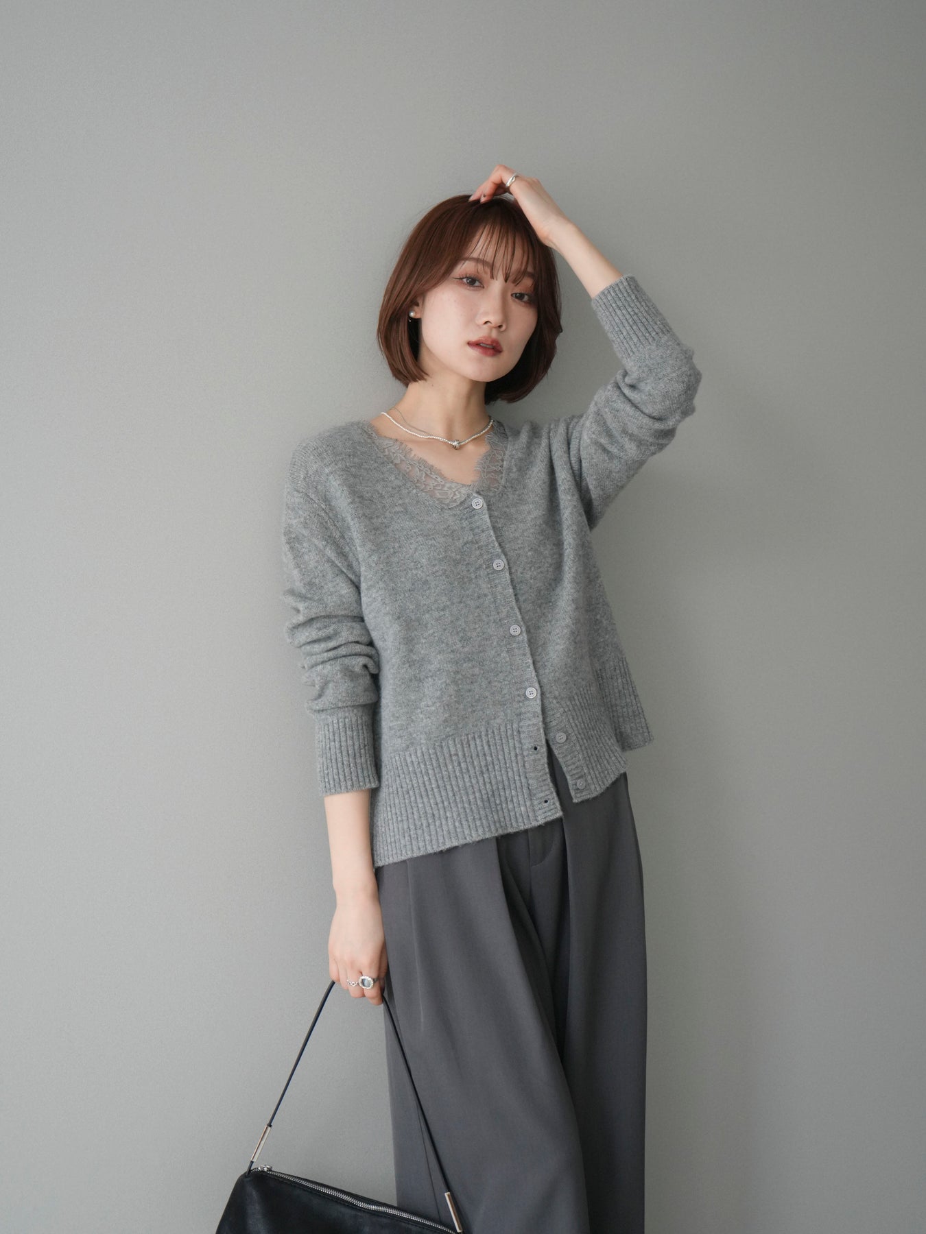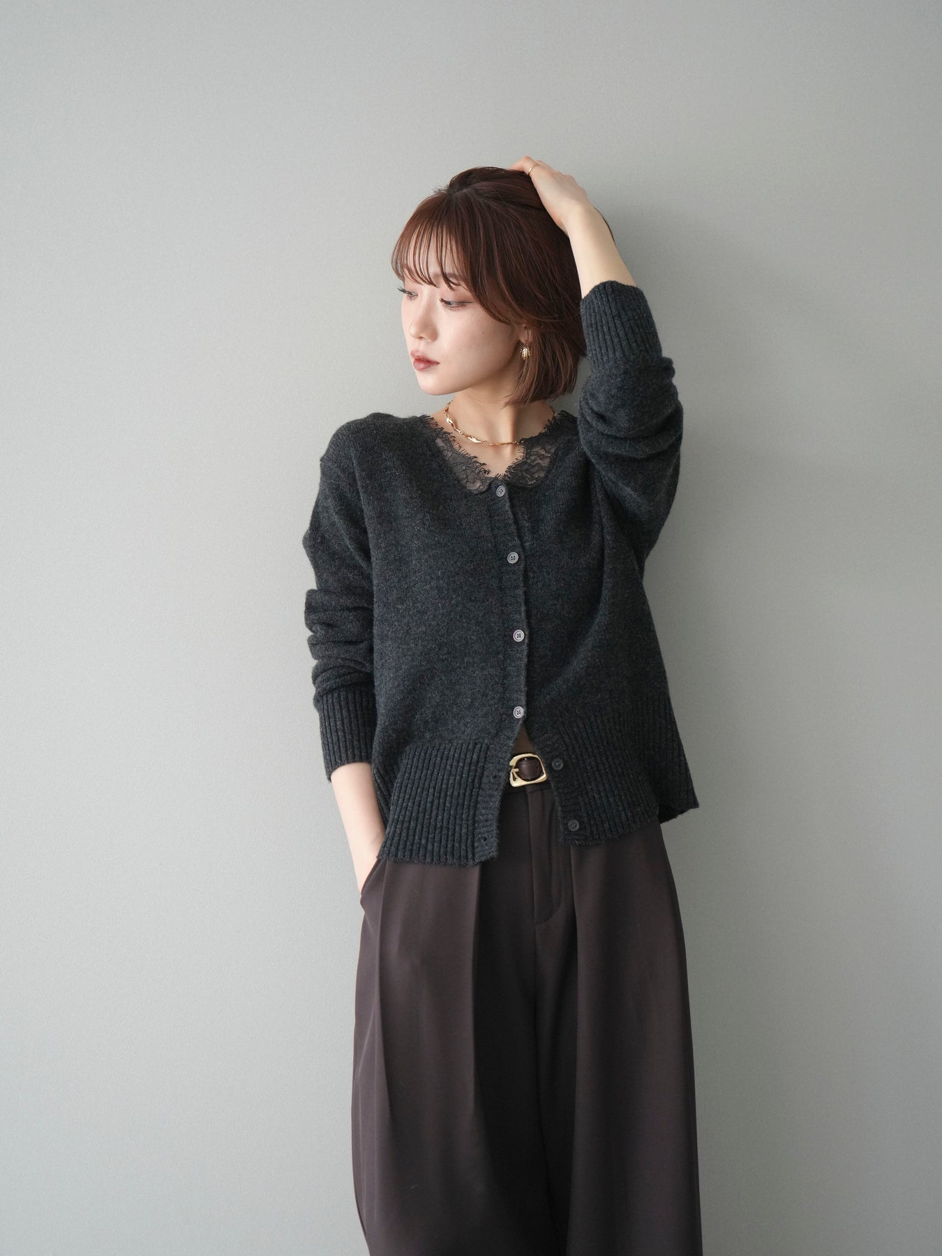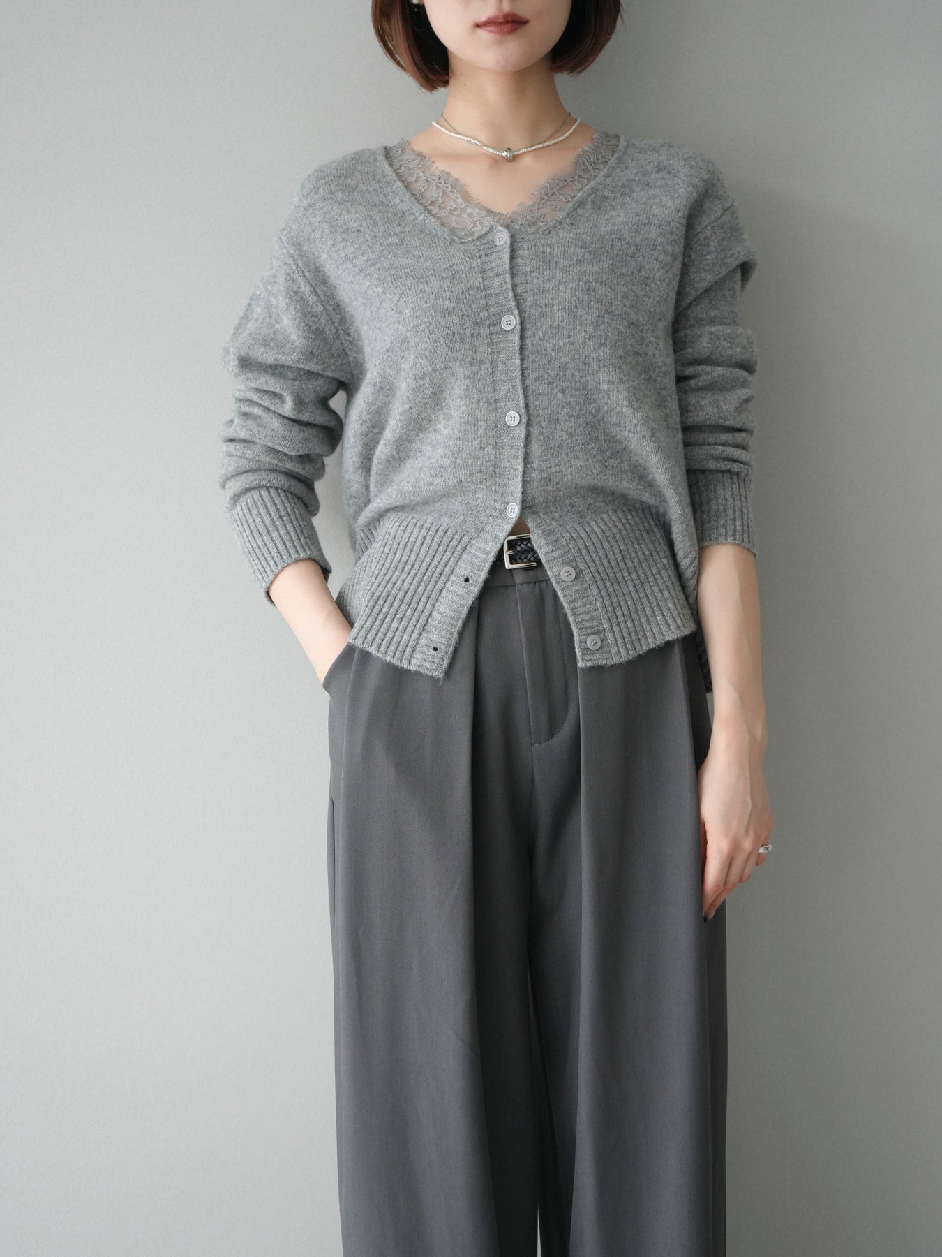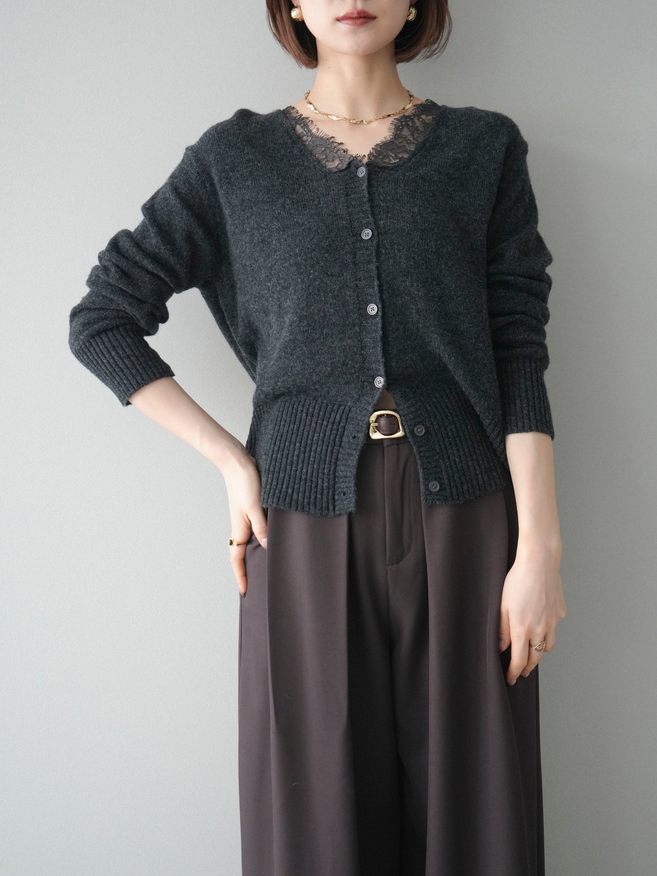 繊細なレースをネックラインにあしらった、表情豊かなニットカーディガン。 シンプルなシルエットの中に、レースの切り替えがさりげないアクセントとなり、顔まわりに奥行きをもたらします。フロントはボタン仕様で、きちんと感がありながらも、程よく力の抜けた雰囲気に仕上がっています。 ニット素材はやわらかく、肌なじみの良い着心地。身頃はすっきりとしつつも、窮屈さを感じにくい設計で、トップスとしても羽織りとしても使いやすい一着です。レース部分が主張しすぎないため、デニムやスラックス、スカートなど幅広いボトムスと自然に馴染みます。 予約商品としてのご用意となり、デイリーに取り入れやすい実用性と、ディテールにこだわったデザイン性を兼ね備えたアイテム。シンプルなスタイリングに取り入れるだけで、程よく印象を変えてくれます。 ※ボトムス、キャミソール(インナー)以外の商品は一律でインナーは付属していません。
