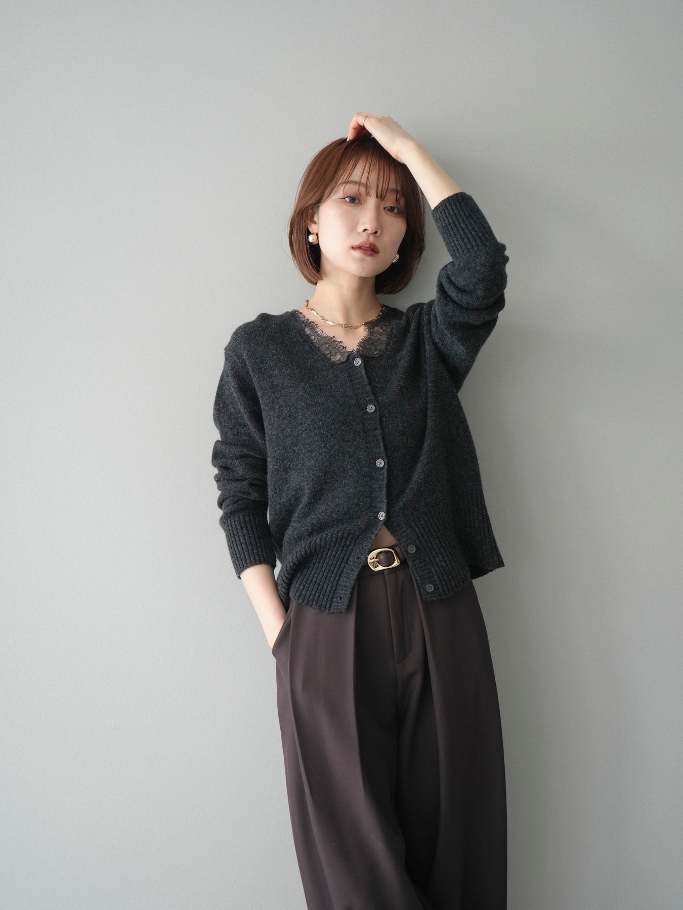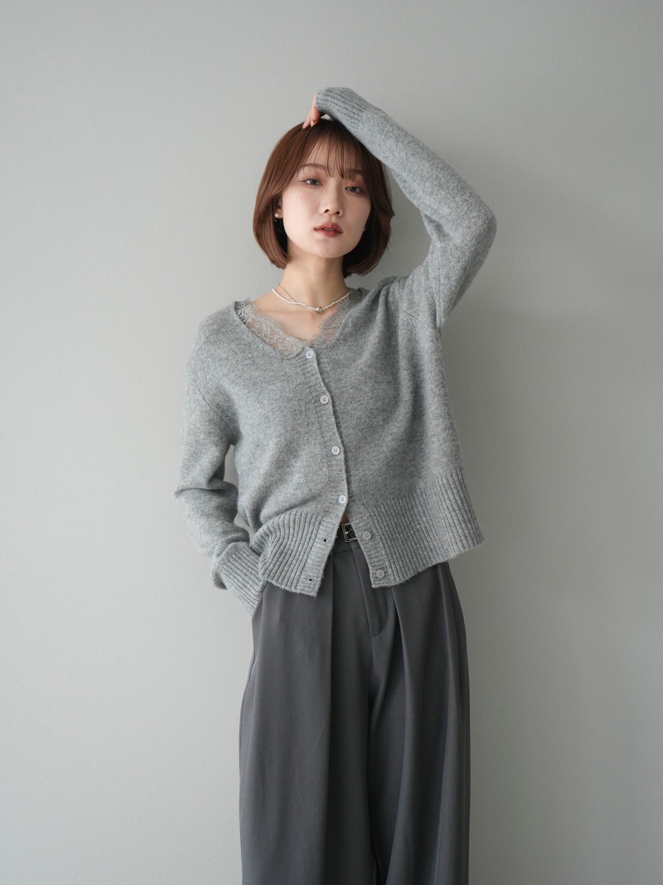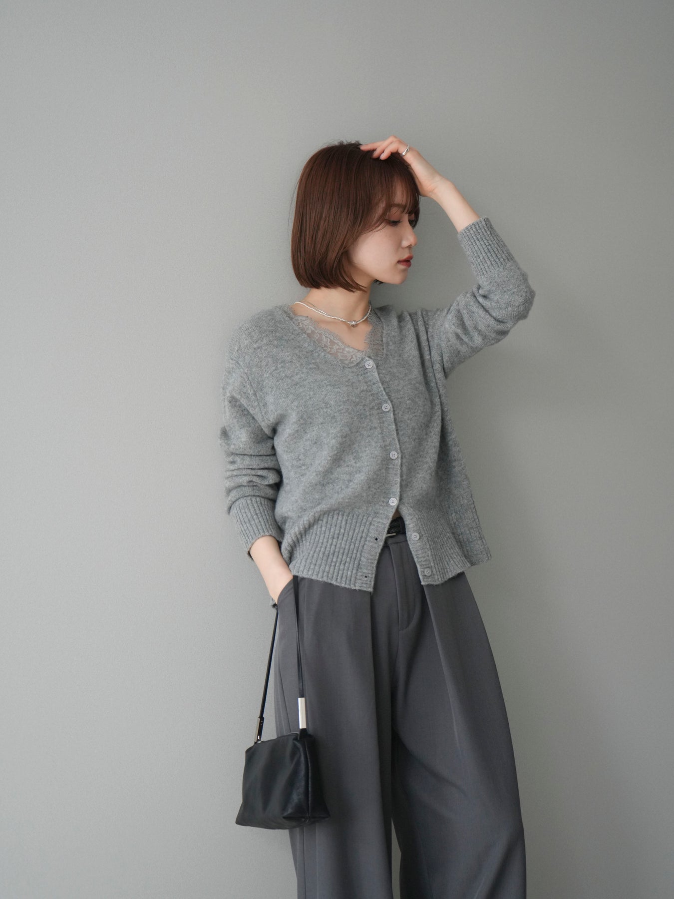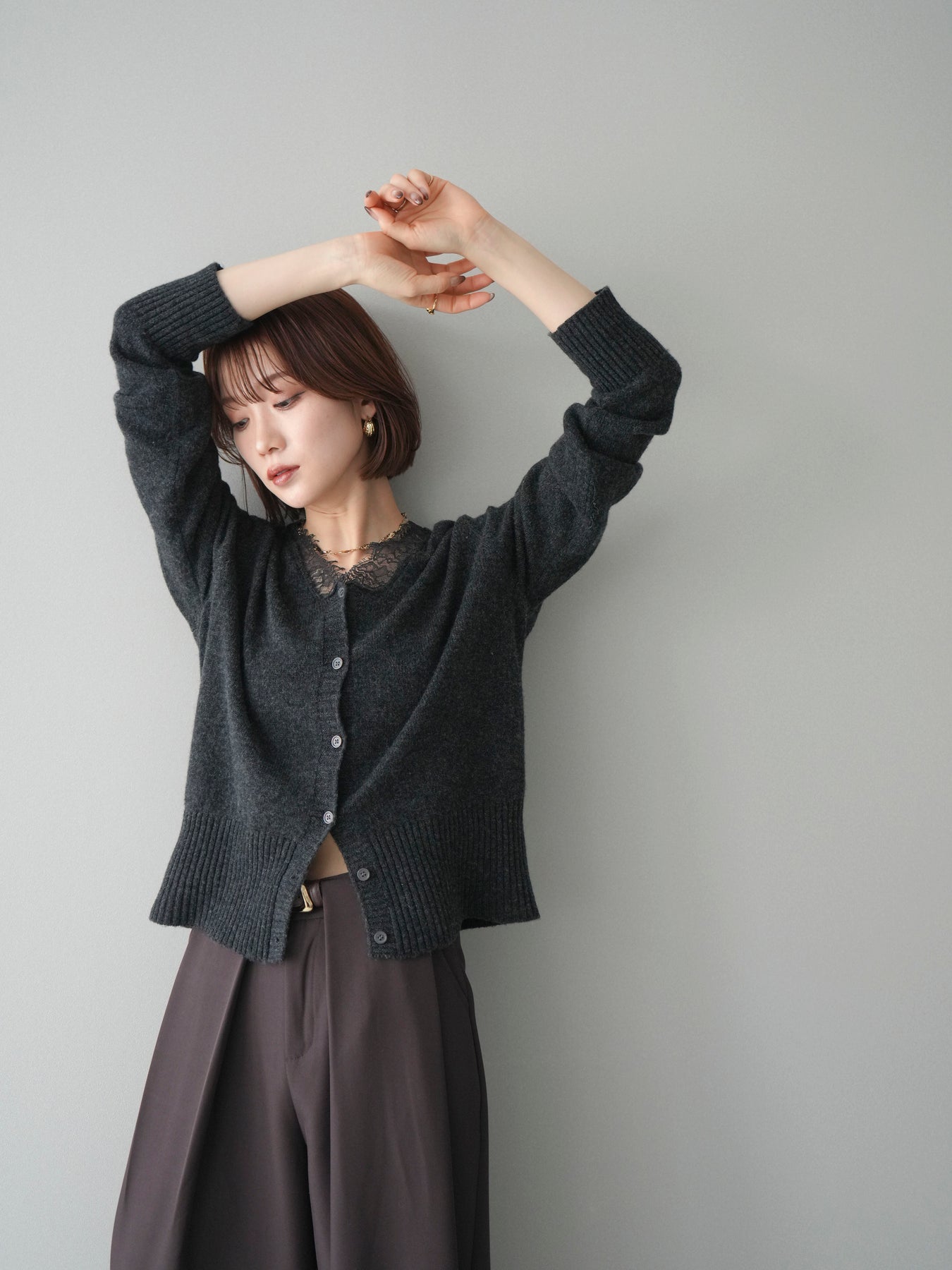 繊細なレースをネックラインにあしらった、表情豊かなニットカーディガン。 シンプルなシルエットの中に、レースの切り替えがさりげないアクセントとなり、顔まわりに奥行きをもたらします。フロントはボタン仕様で、きちんと感がありながらも、程よく力の抜けた雰囲気に仕上がっています。 ニット素材はやわらかく、肌なじみの良い着心地。身頃はすっきりとしつつも、窮屈さを感じにくい設計で、トップスとしても羽織りとしても使いやすい一着です。レース部分が主張しすぎないため、デニムやスラックス、スカートなど幅広いボトムスと自然に馴染みます。 予約商品としてのご用意となり、デイリーに取り入れやすい実用性と、ディテールにこだわったデザイン性を兼ね備えたアイテム。シンプルなスタイリングに取り入れるだけで、程よく印象を変えてくれます。 ※ボトムス、キャミソール(インナー)以外の商品は一律でインナーは付属していません。