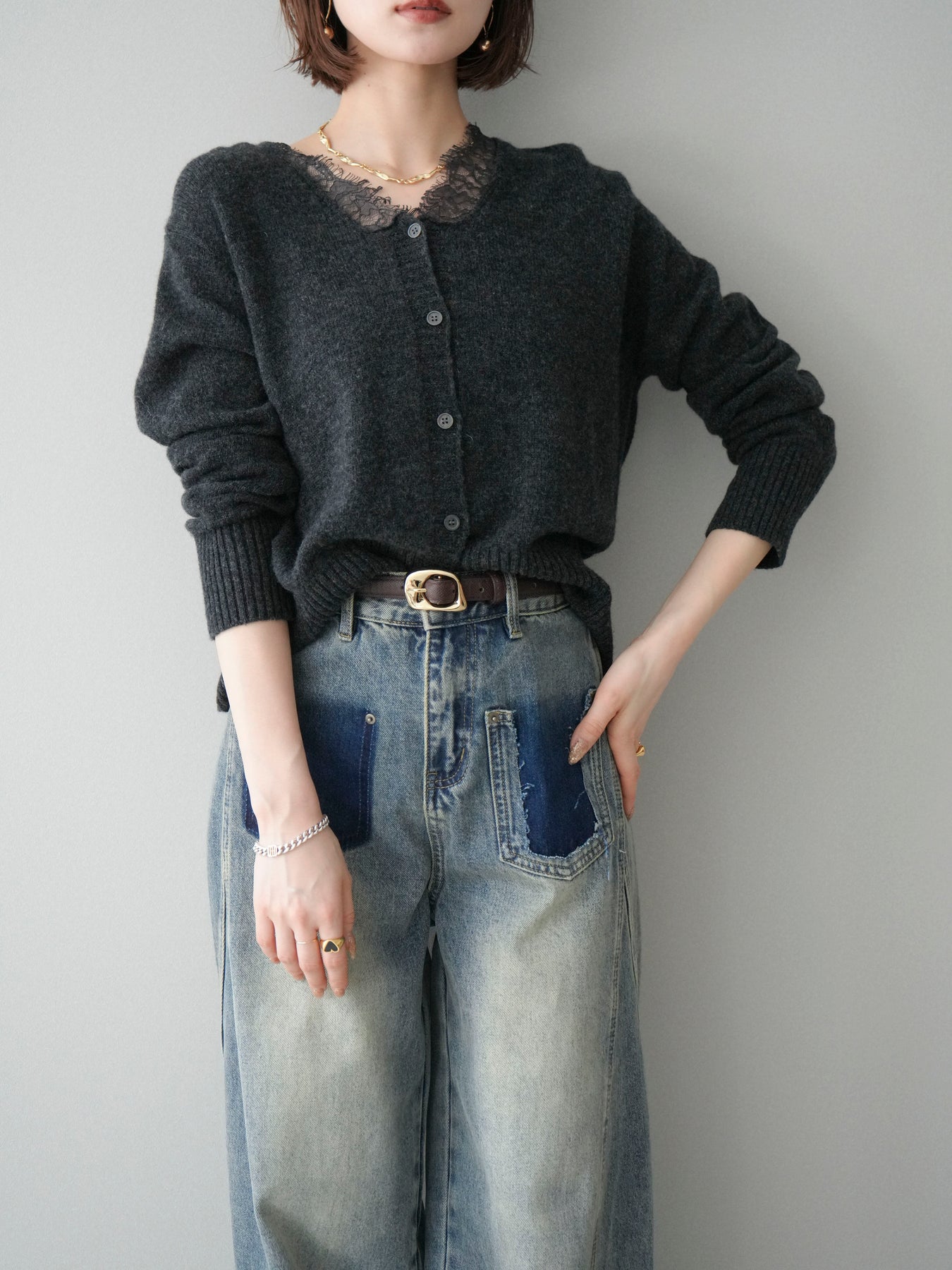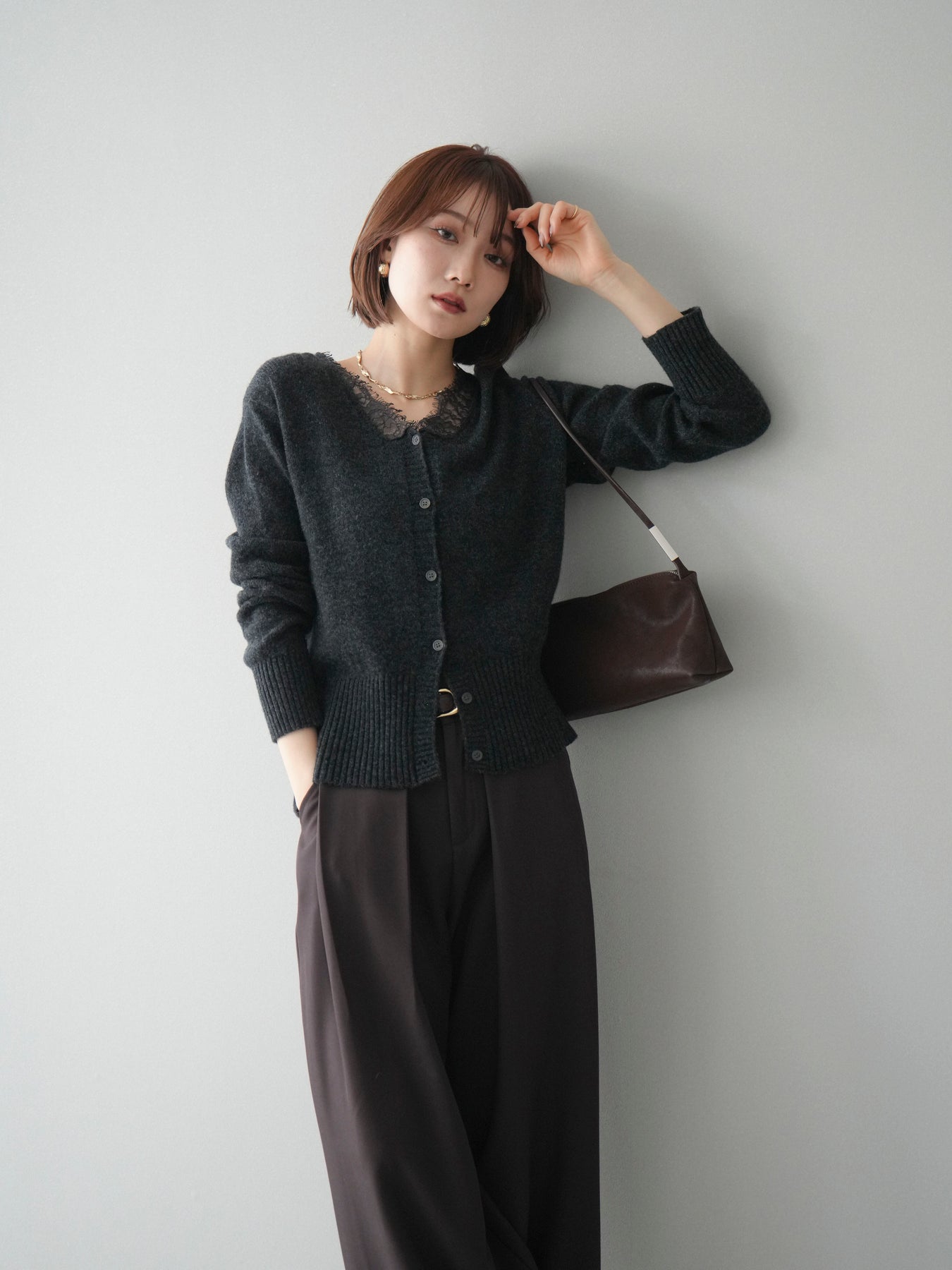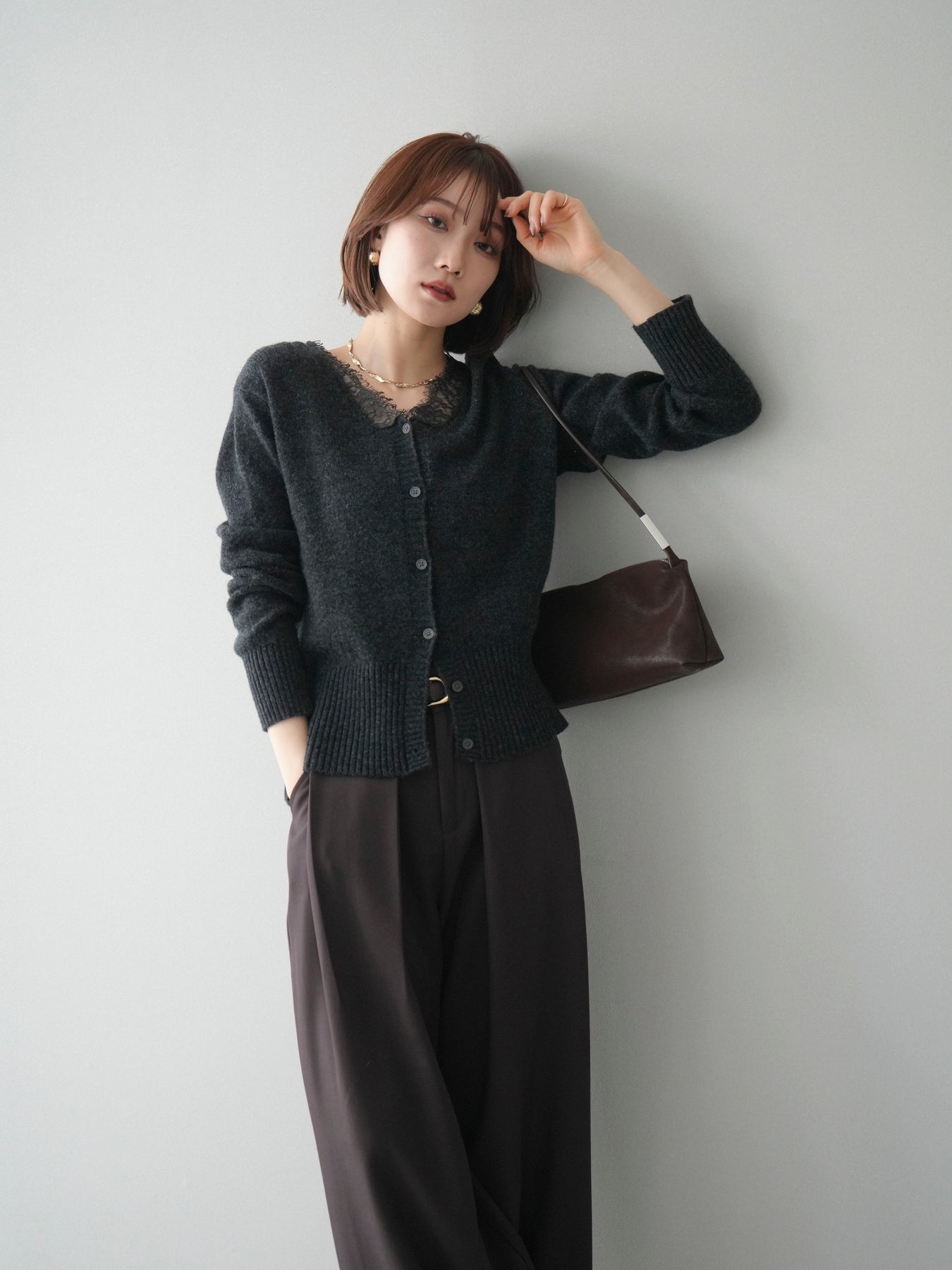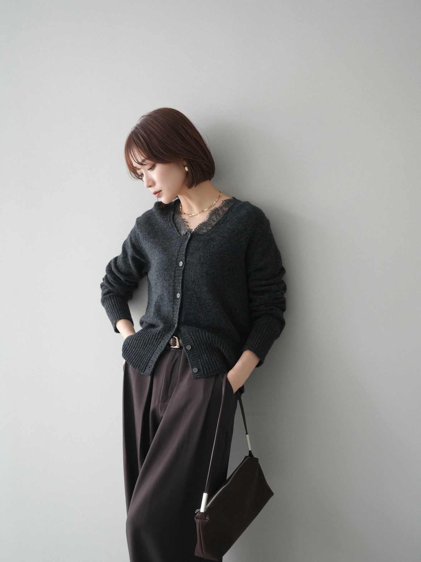 繊細なレースをネックラインにあしらった、表情豊かなニットカーディガン。 シンプルなシルエットの中に、レースの切り替えがさりげないアクセントとなり、顔まわりに奥行きをもたらします。フロントはボタン仕様で、きちんと感がありながらも、程よく力の抜けた雰囲気に仕上がっています。 ニット素材はやわらかく、肌なじみの良い着心地。身頃はすっきりとしつつも、窮屈さを感じにくい設計で、トップスとしても羽織りとしても使いやすい一着です。レース部分が主張しすぎないため、デニムやスラックス、スカートなど幅広いボトムスと自然に馴染みます。 予約商品としてのご用意となり、デイリーに取り入れやすい実用性と、ディテールにこだわったデザイン性を兼ね備えたアイテム。シンプルなスタイリングに取り入れるだけで、程よく印象を変えてくれます。 ※ボトムス、キャミソール(インナー)以外の商品は一律でインナーは付属していません。