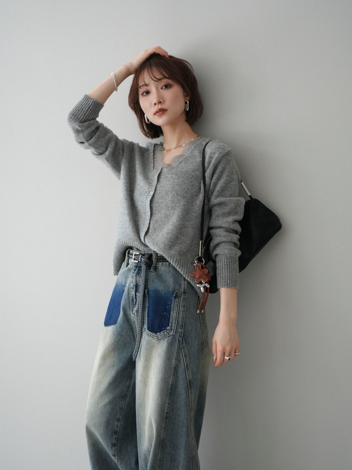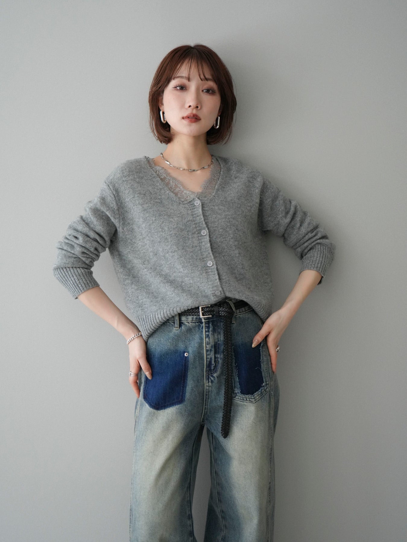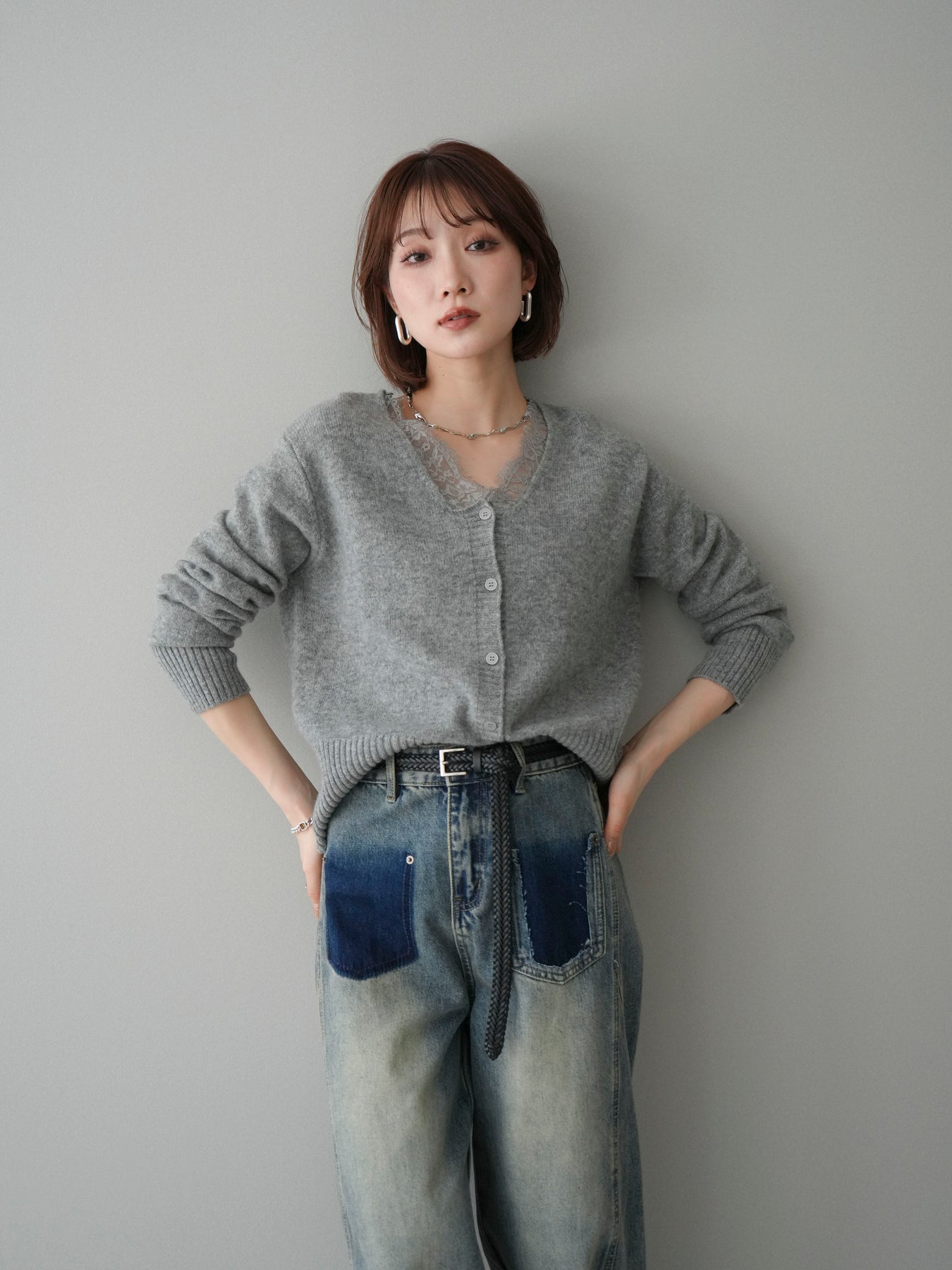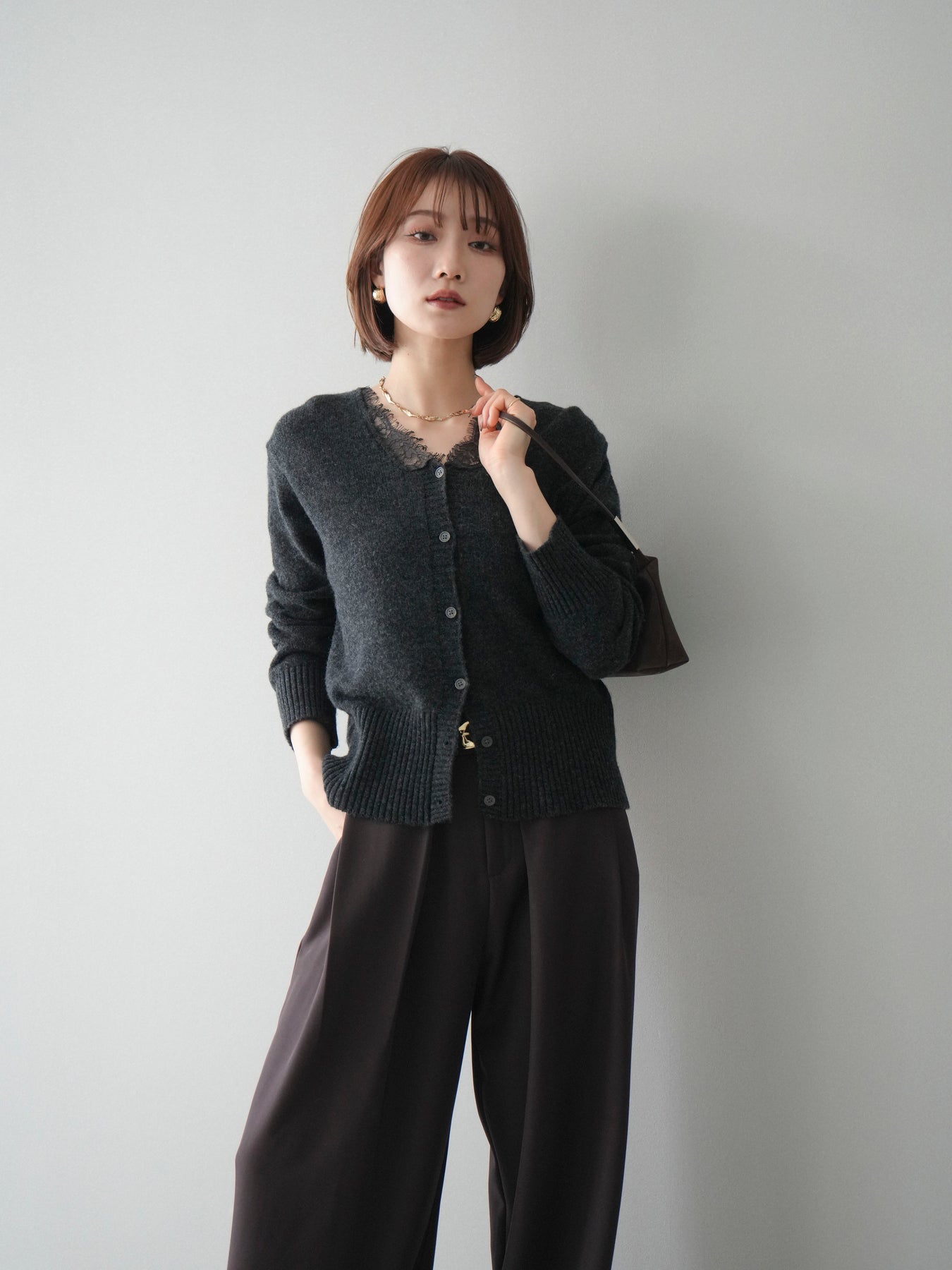繊細なレースをネックラインにあしらった、表情豊かなニットカーディガン。 シンプルなシルエットの中に、レースの切り替えがさりげないアクセントとなり、顔まわりに奥行きをもたらします。フロントはボタン仕様で、きちんと感がありながらも、程よく力の抜けた雰囲気に仕上がっています。 ニット素材はやわらかく、肌なじみの良い着心地。身頃はすっきりとしつつも、窮屈さを感じにくい設計で、トップスとしても羽織りとしても使いやすい一着です。レース部分が主張しすぎないため、デニムやスラックス、スカートなど幅広いボトムスと自然に馴染みます。 予約商品としてのご用意となり、デイリーに取り入れやすい実用性と、ディテールにこだわったデザイン性を兼ね備えたアイテム。シンプルなスタイリングに取り入れるだけで、程よく印象を変えてくれます。 ※ボトムス、キャミソール(インナー)以外の商品は一律でインナーは付属していません。
