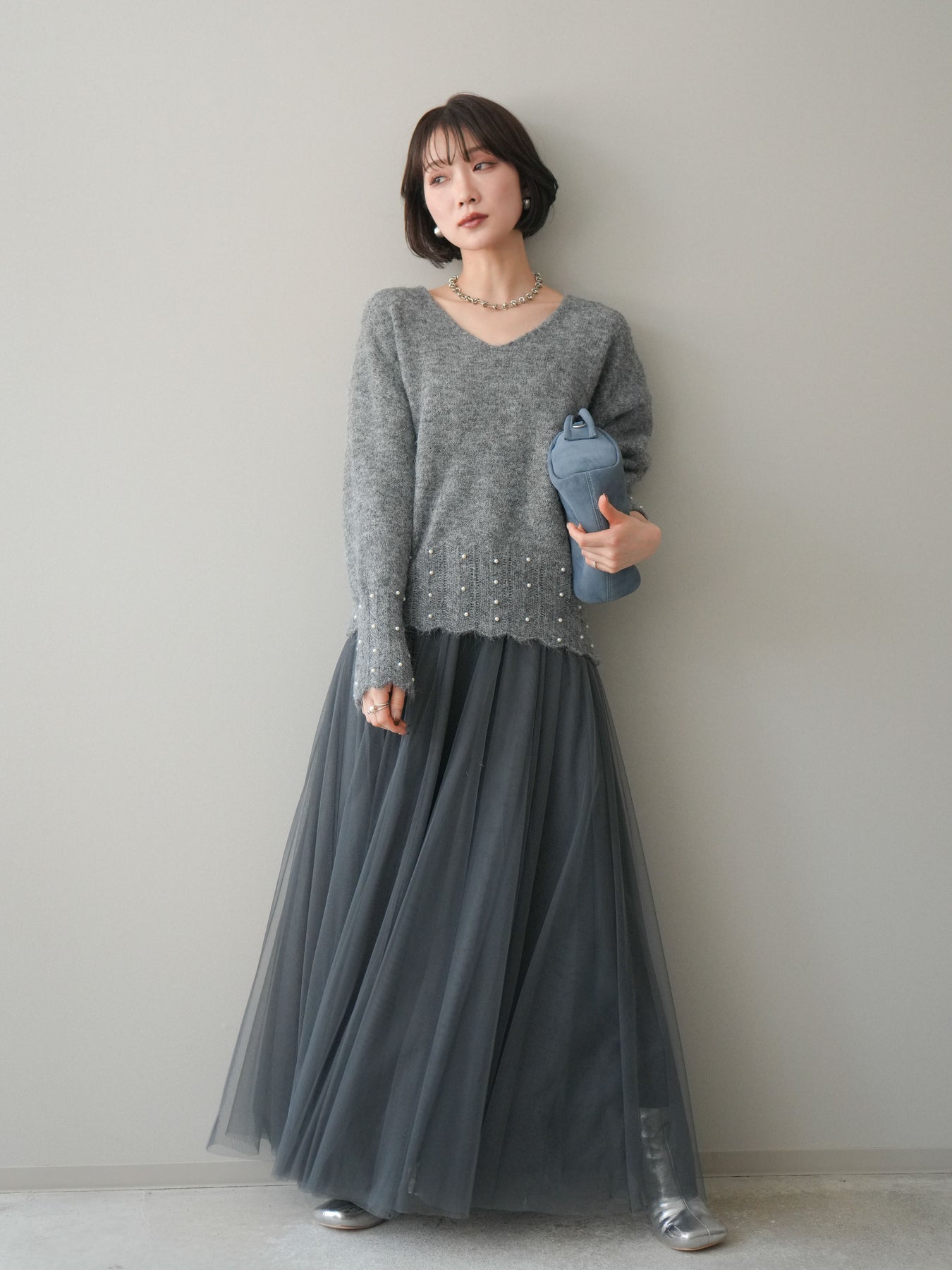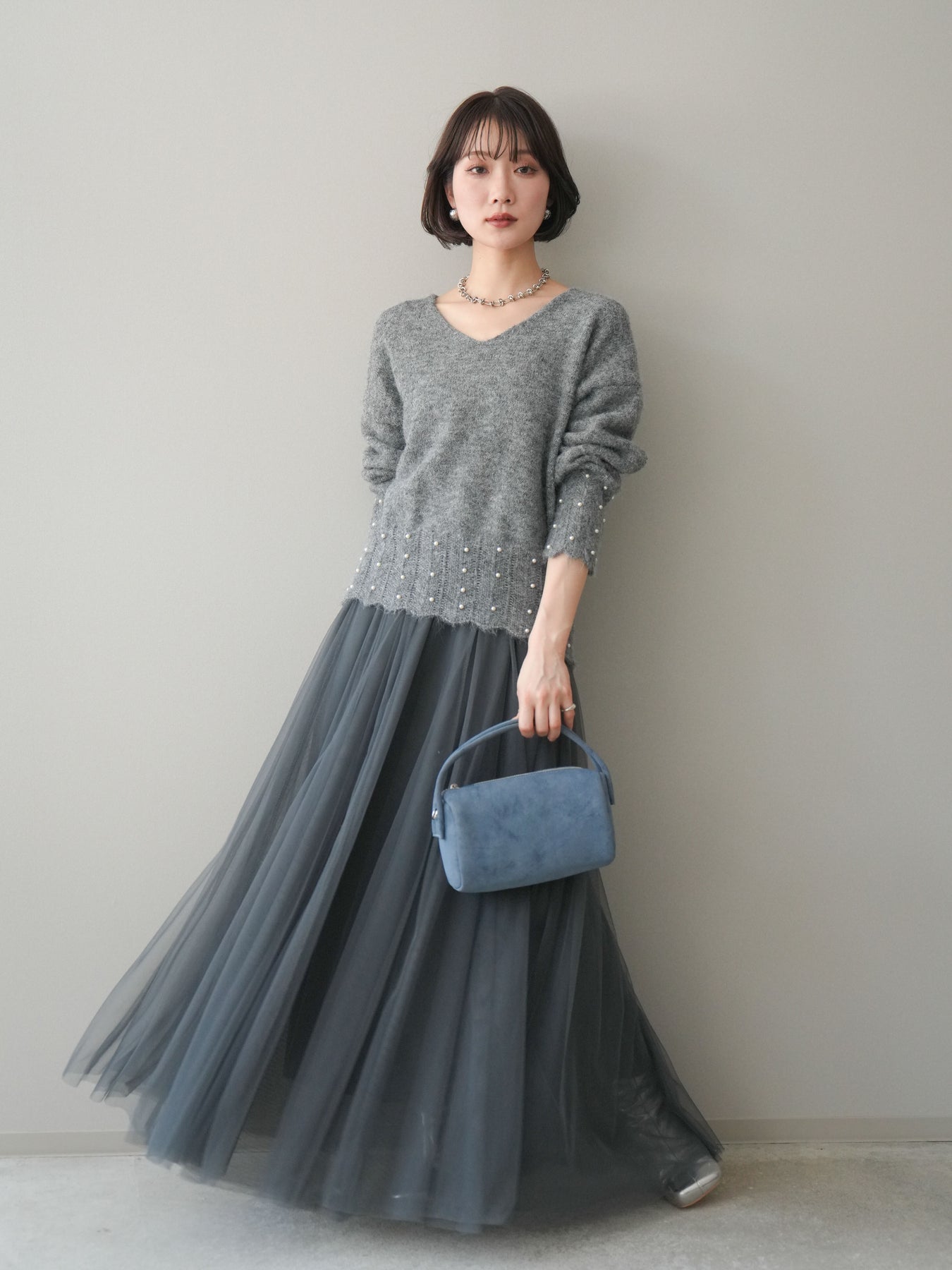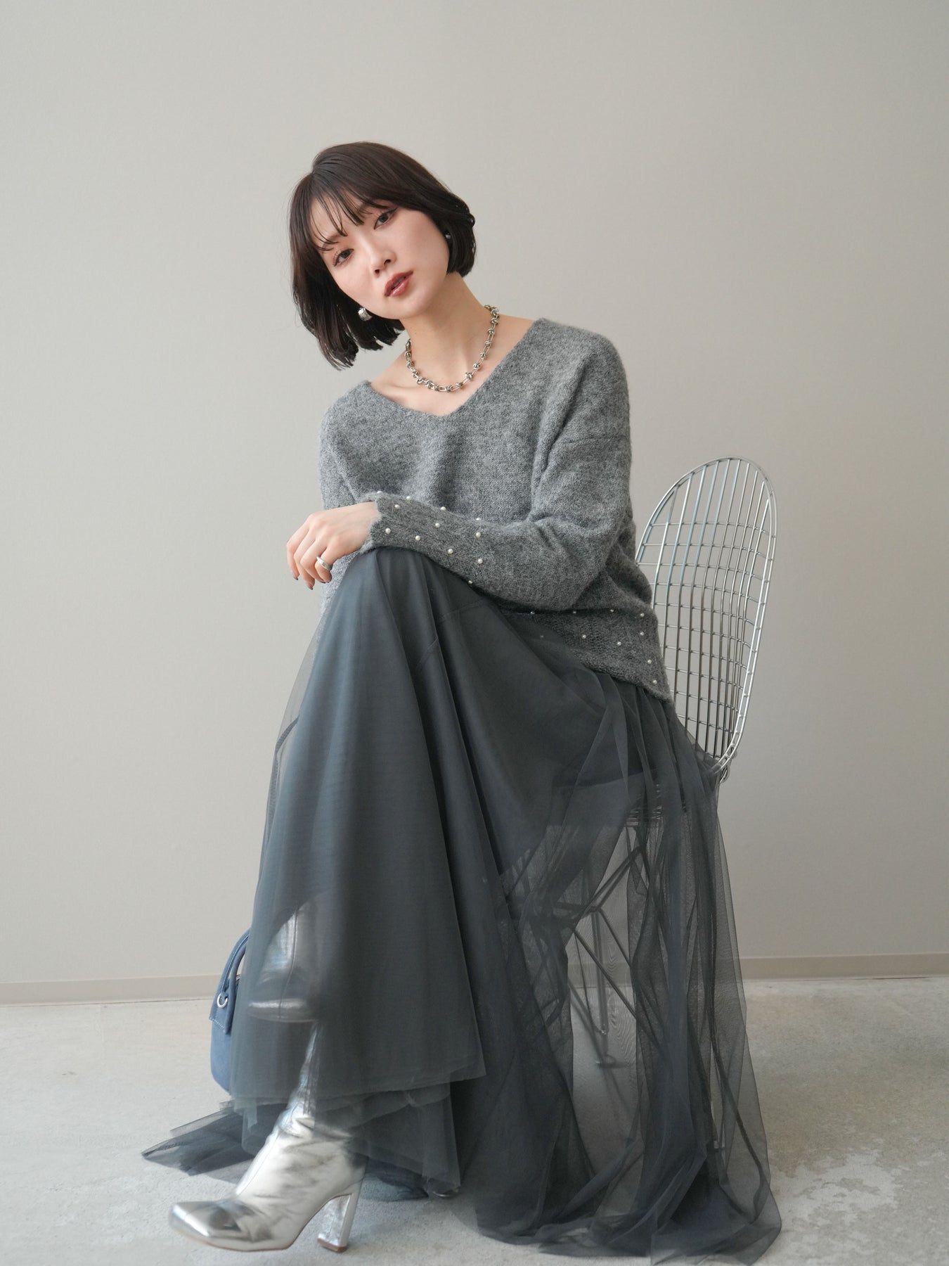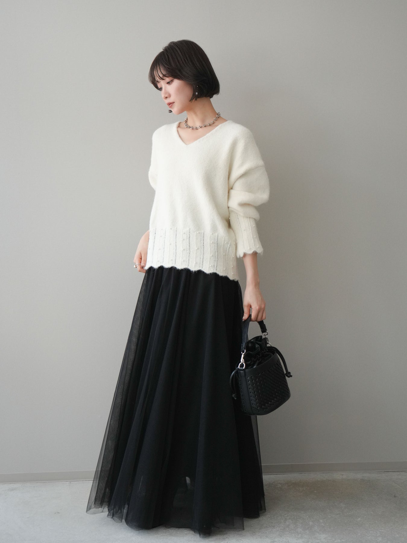 [SET]パールフリルリブヘムニットプルオーバー+チュールボリュームスカート(2set)