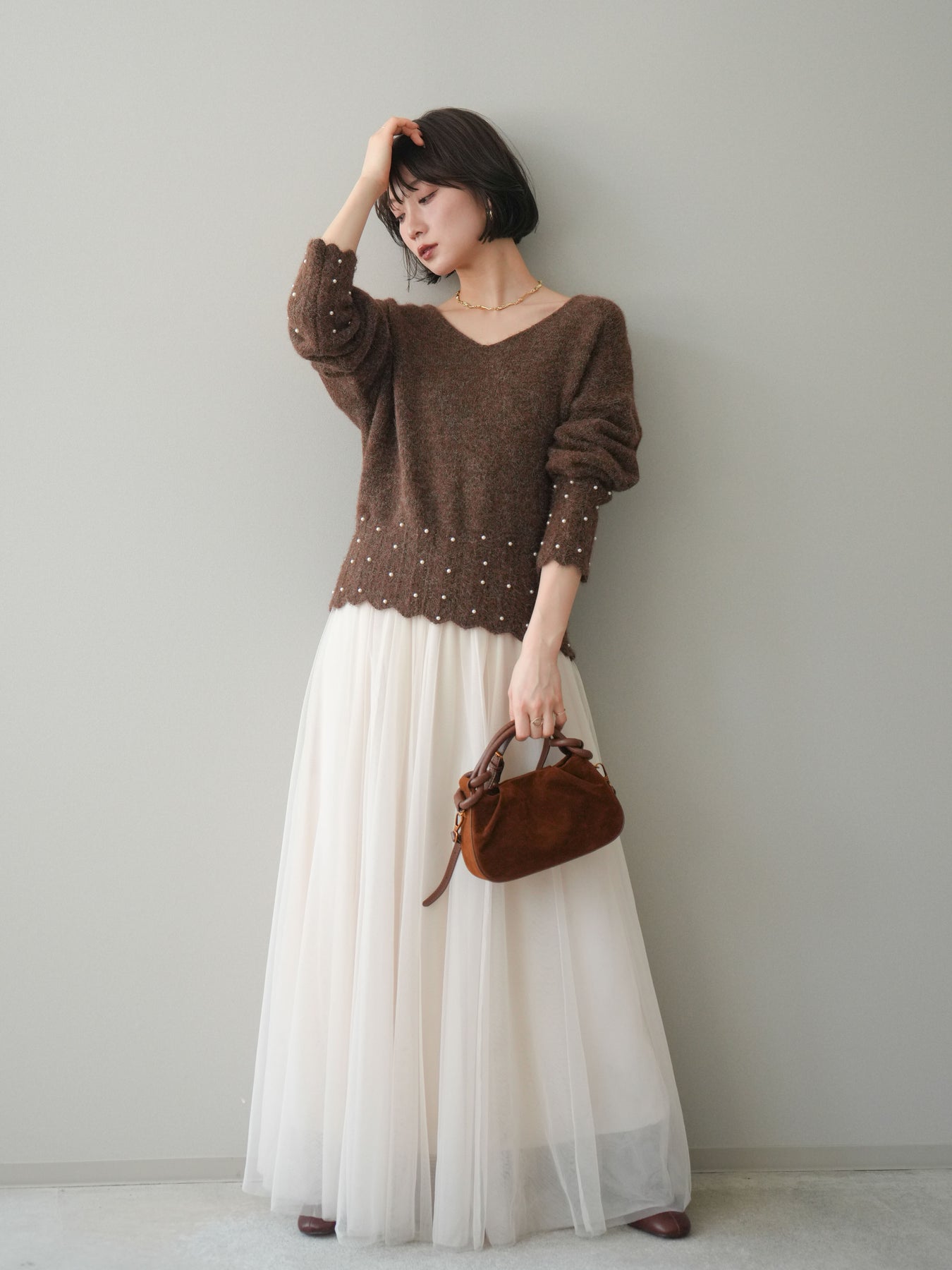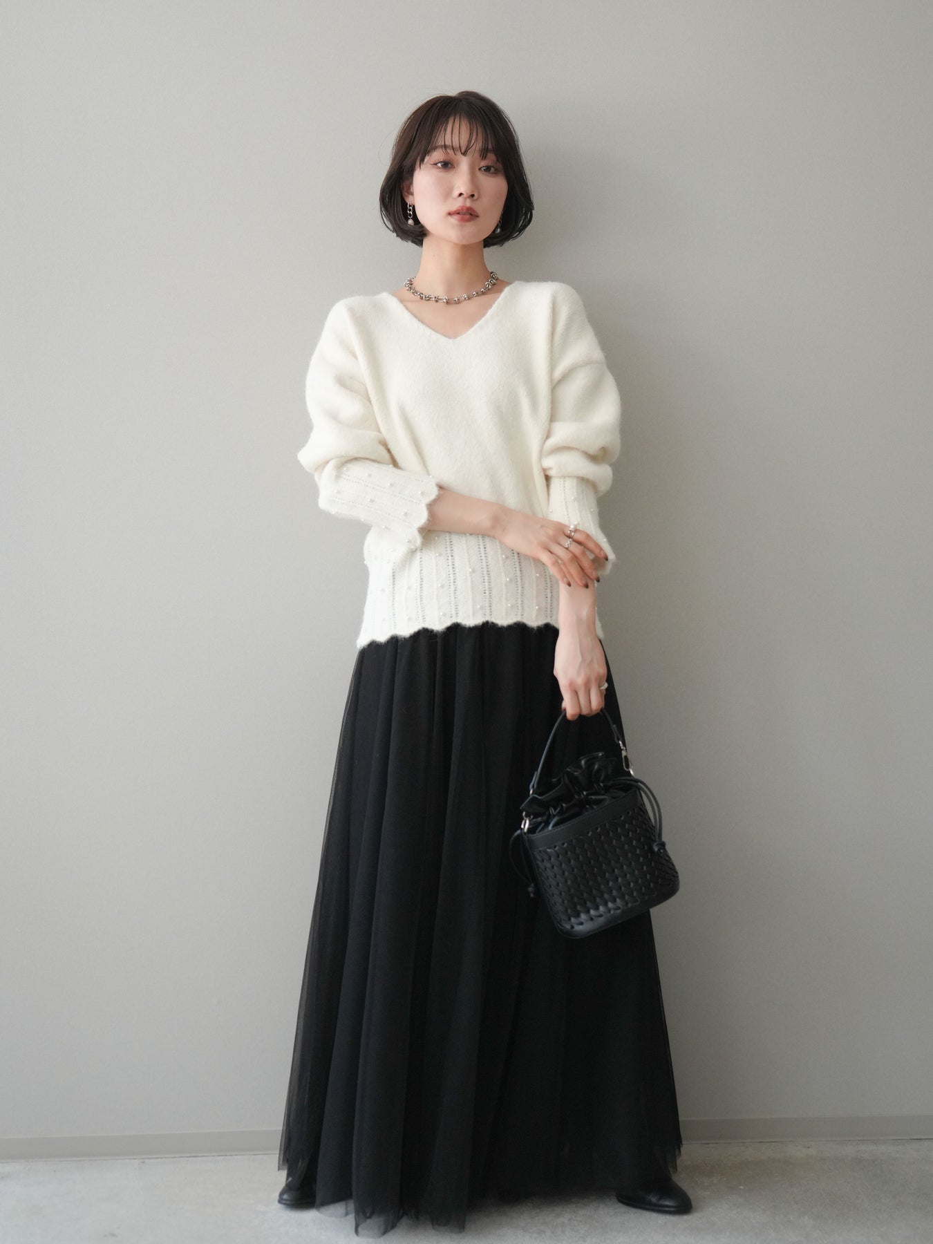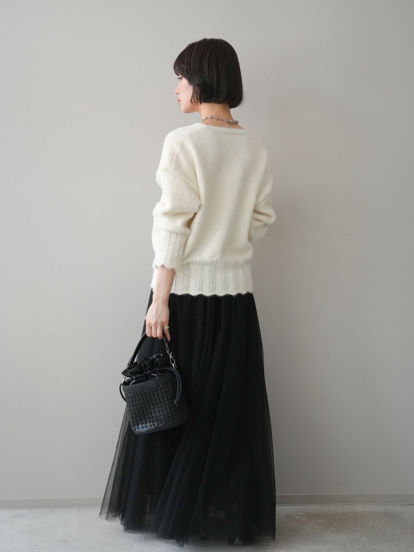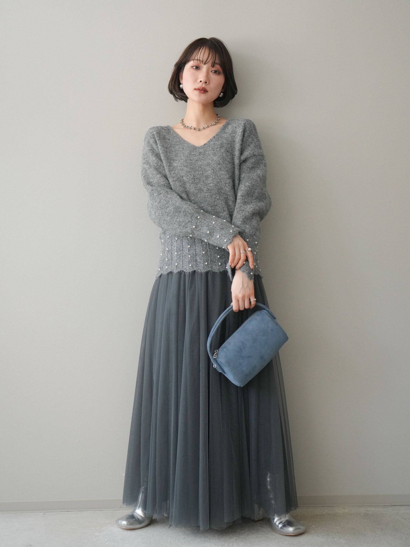 [SET]パールフリルリブヘムニットプルオーバー+チュールボリュームスカート(2set)