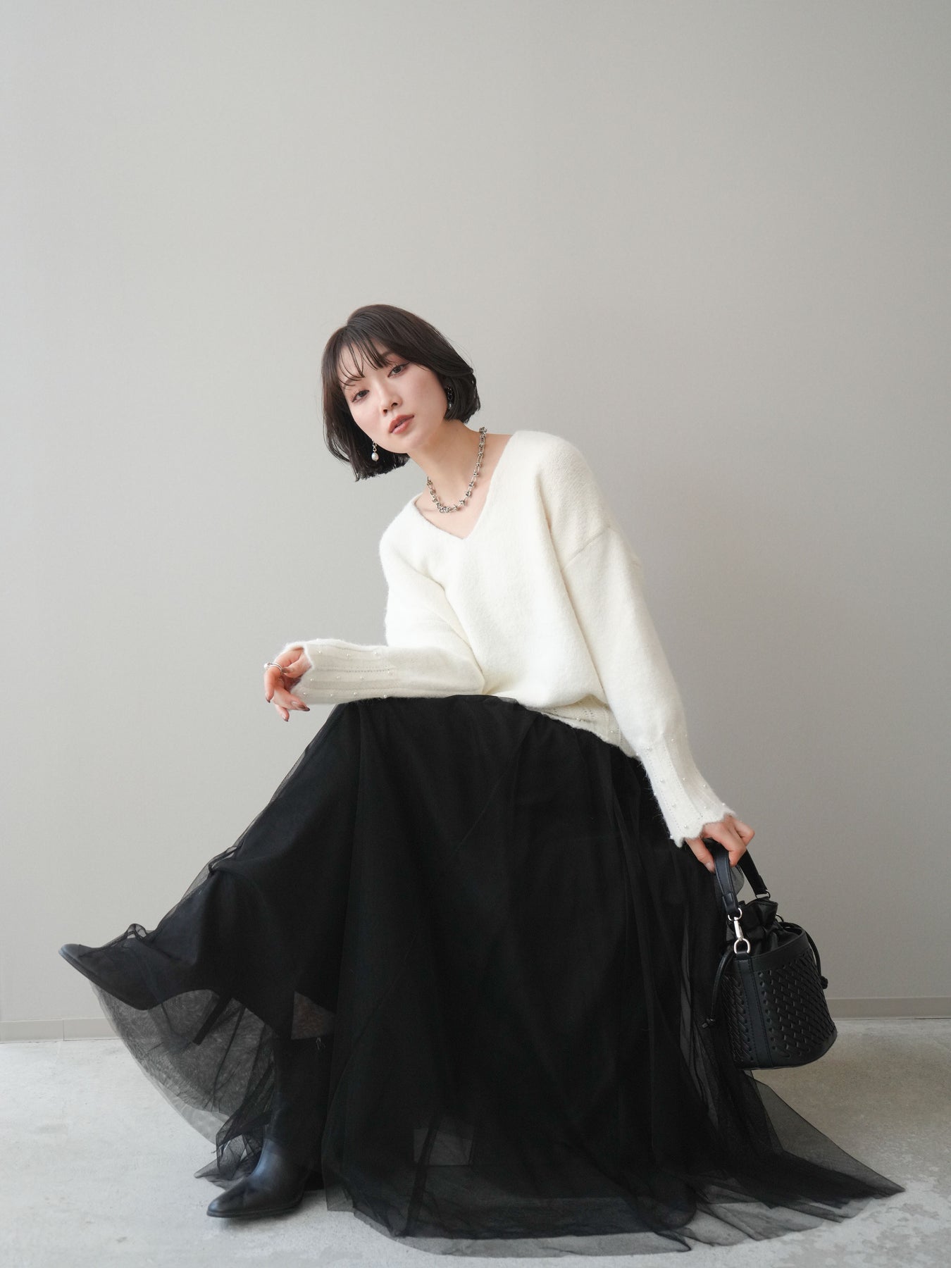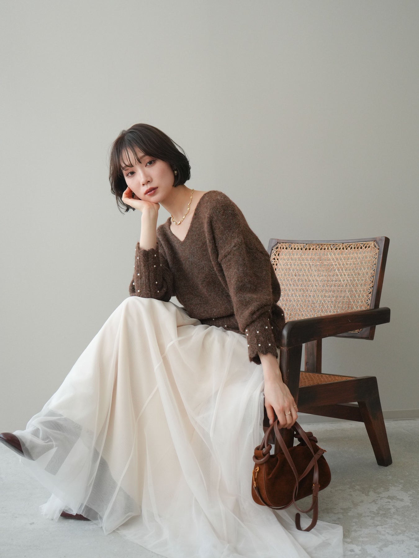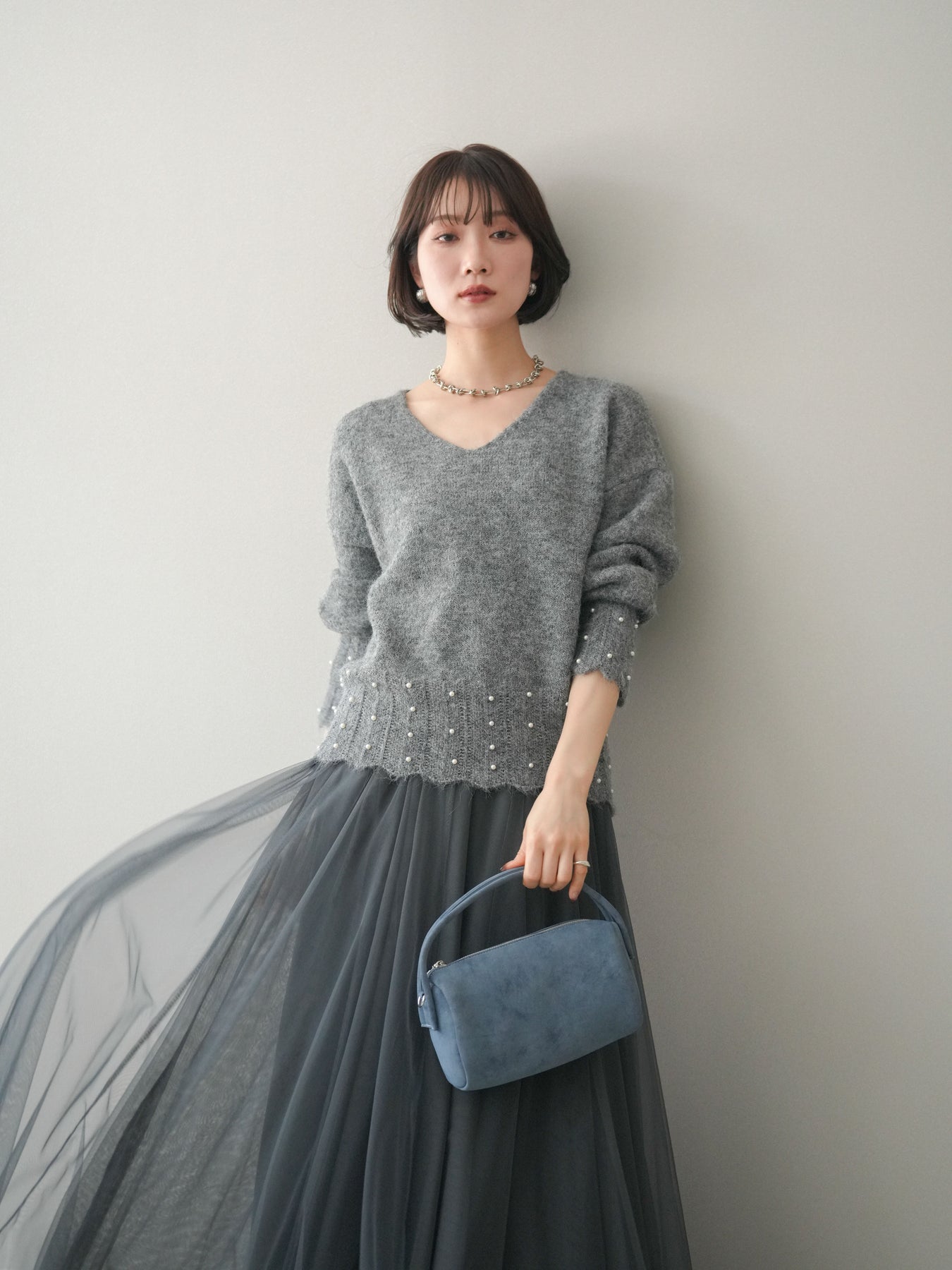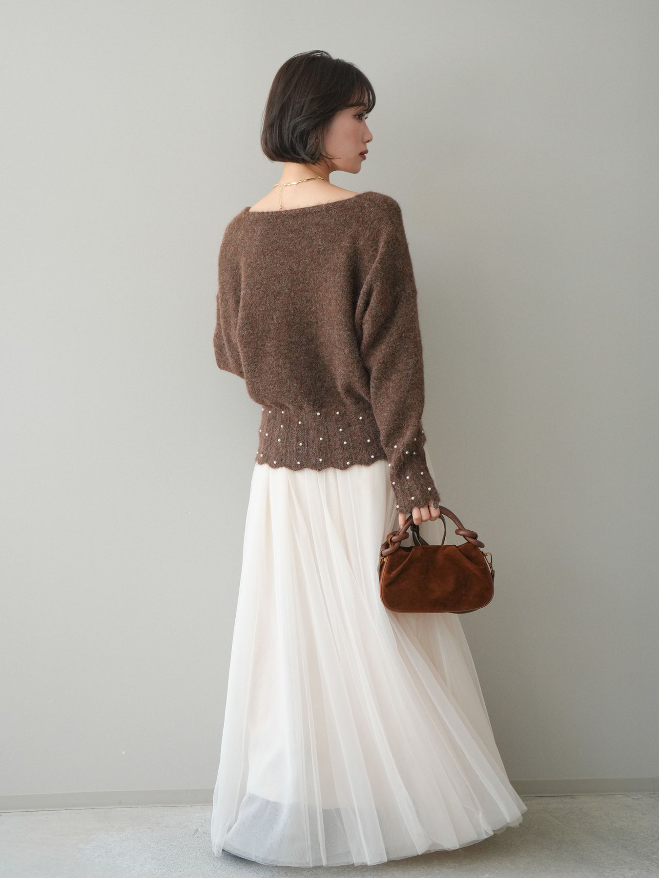 [SET]パールフリルリブヘムニットプルオーバー+チュールボリュームスカート(2set)
