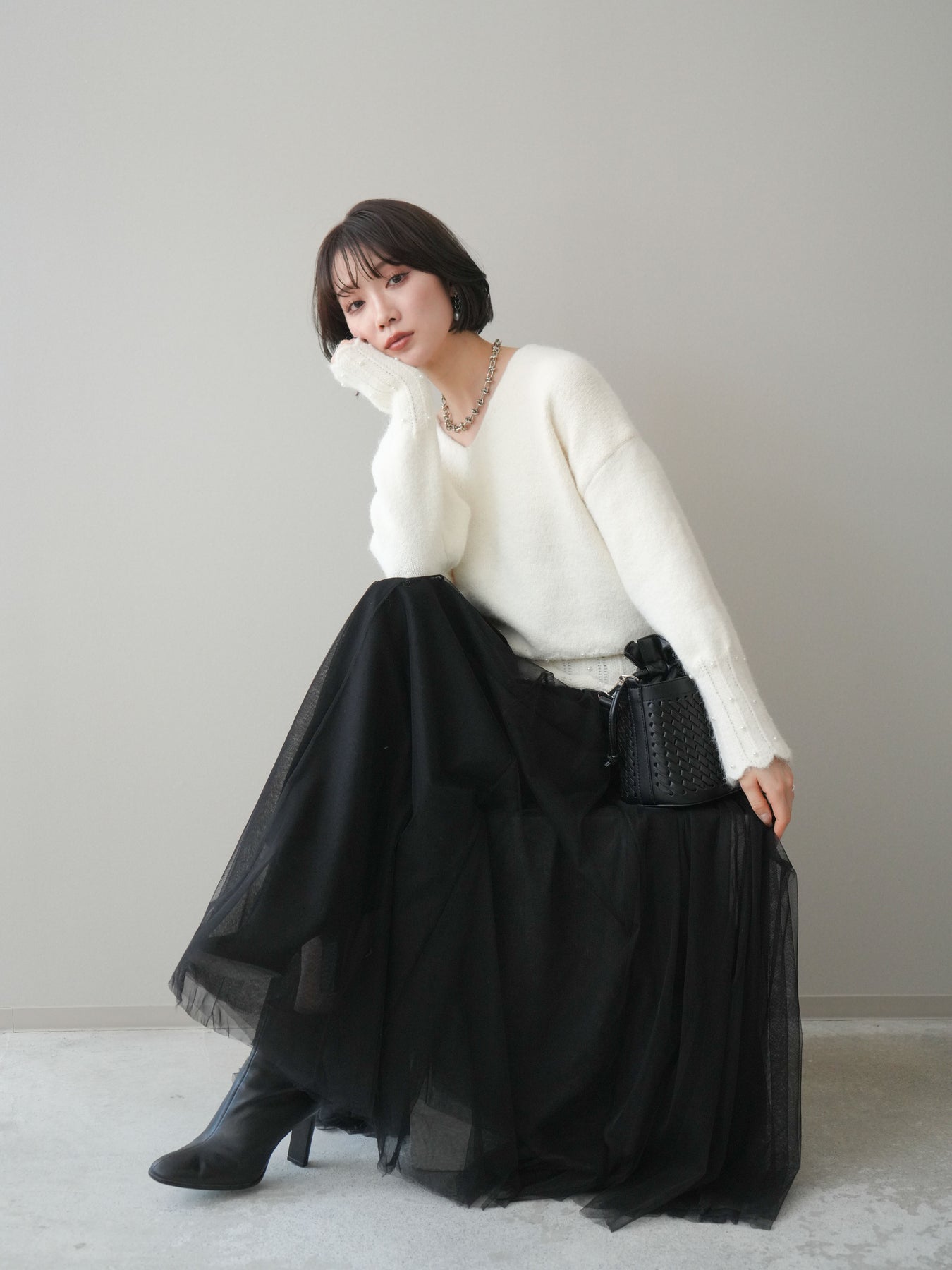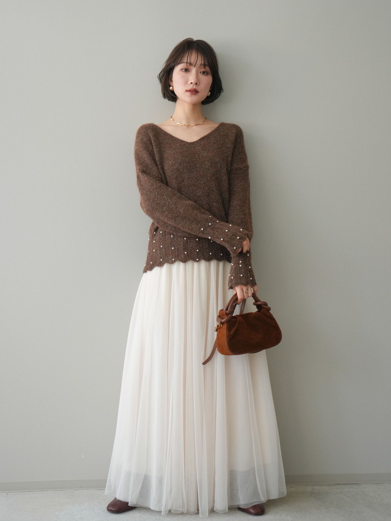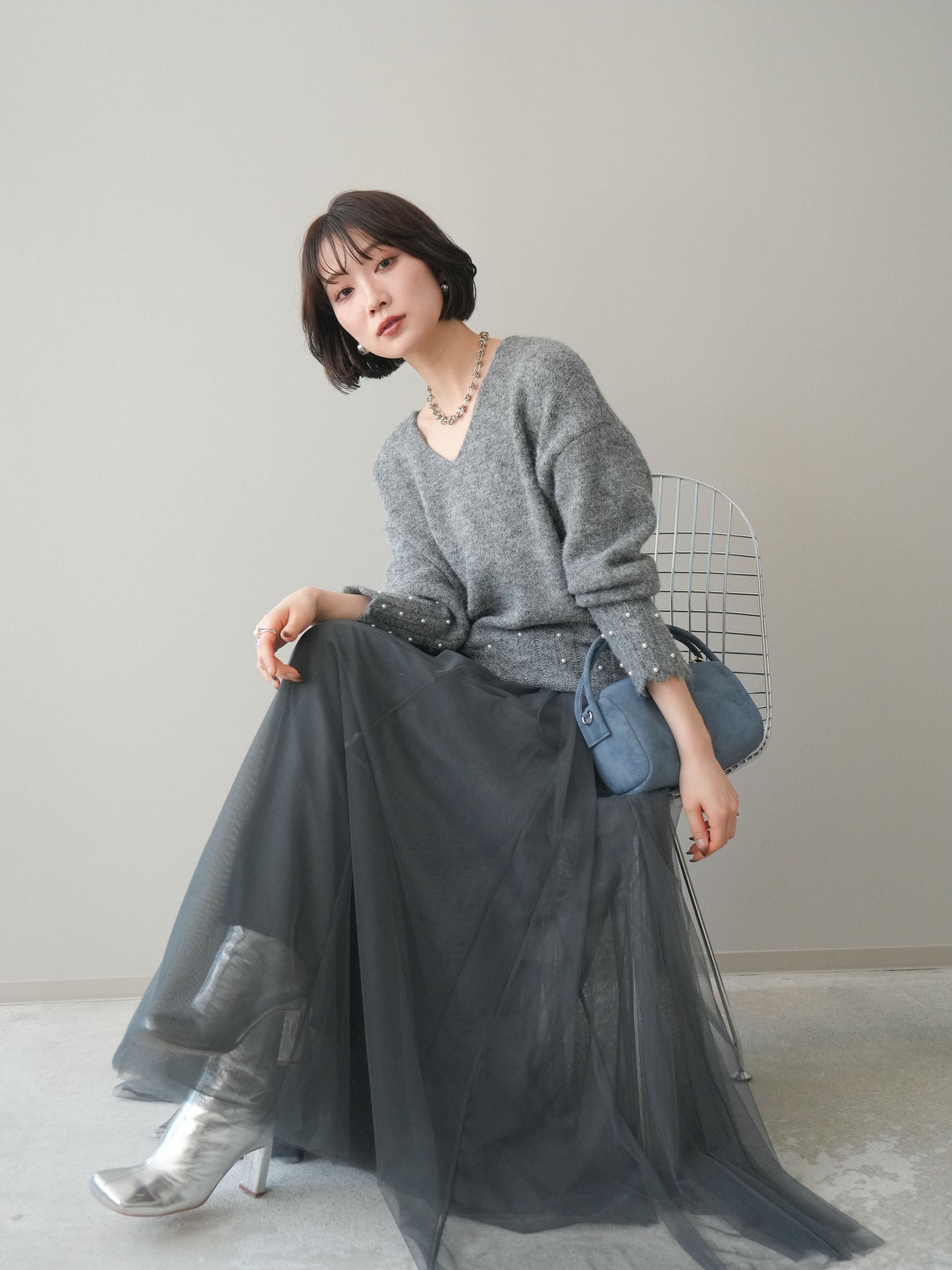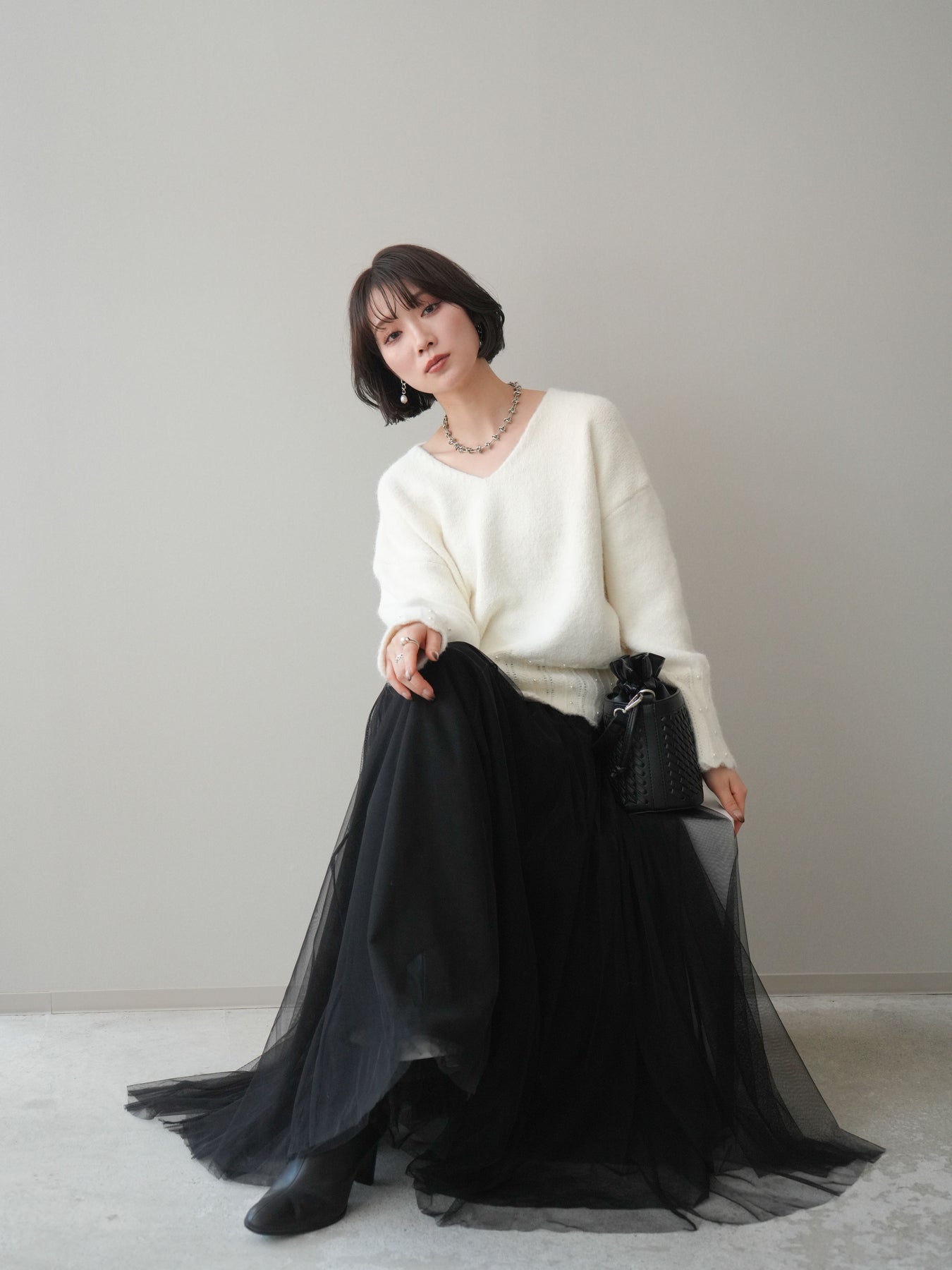 [SET]パールフリルリブヘムニットプルオーバー+チュールボリュームスカート(2set)