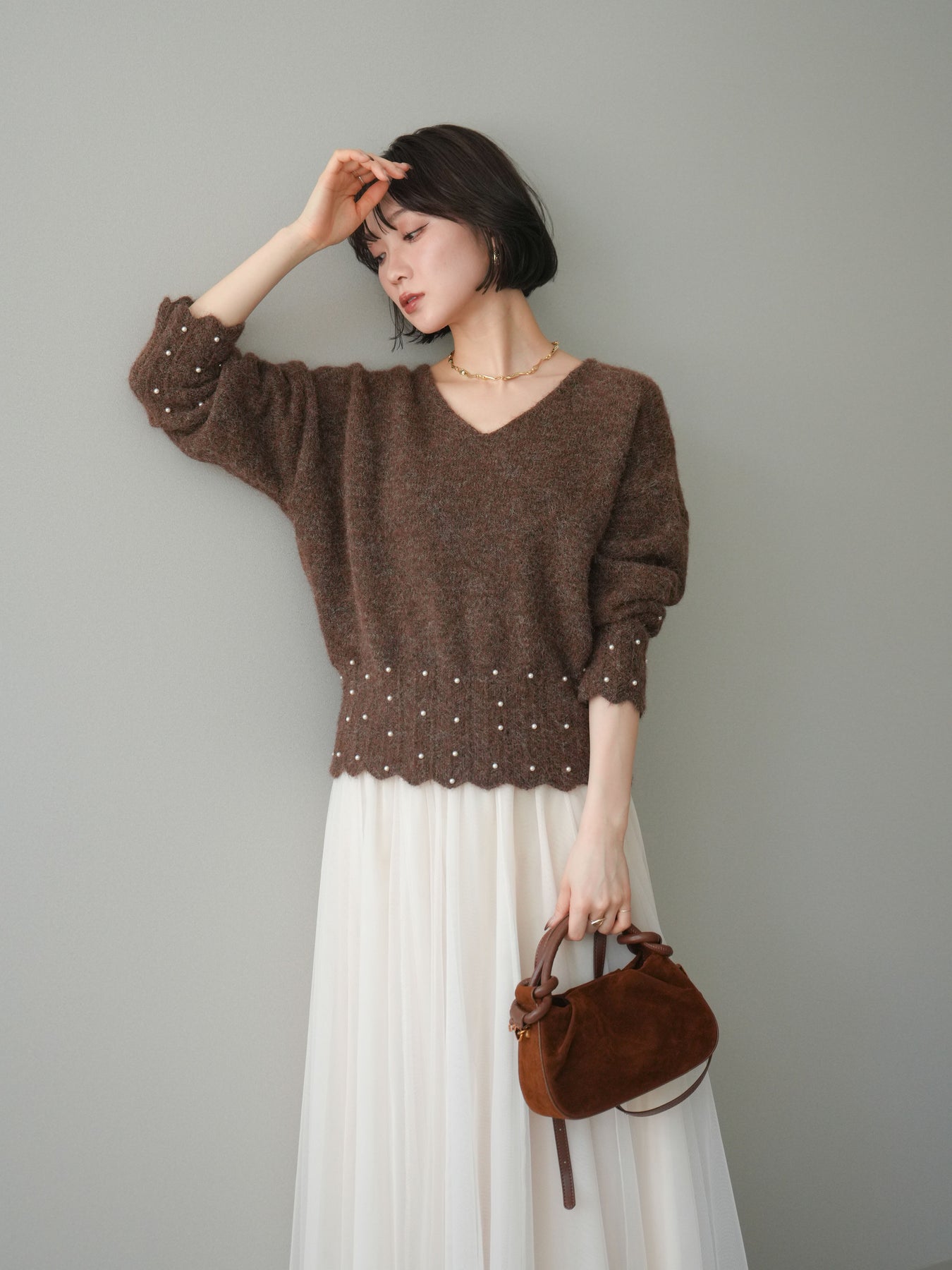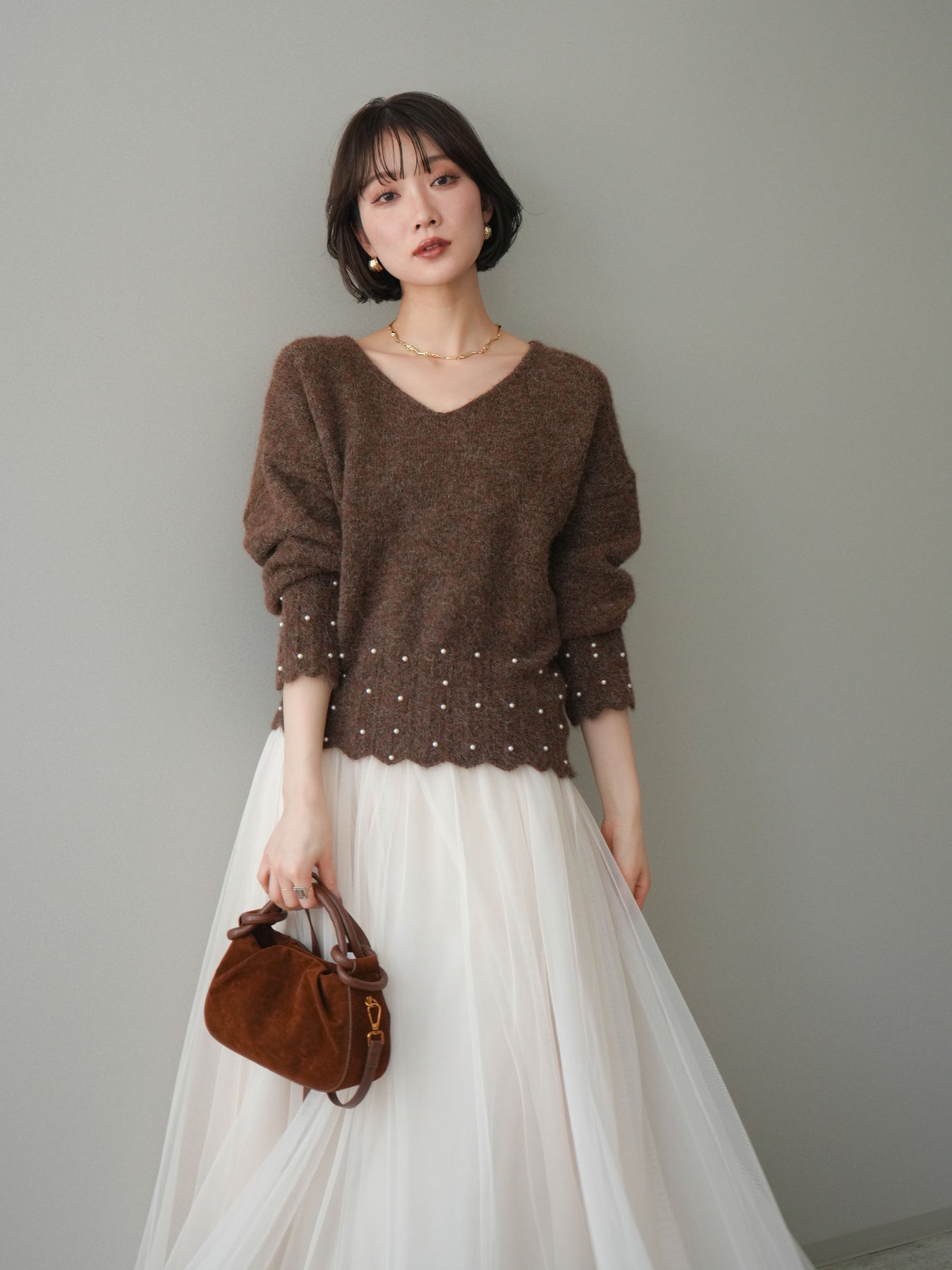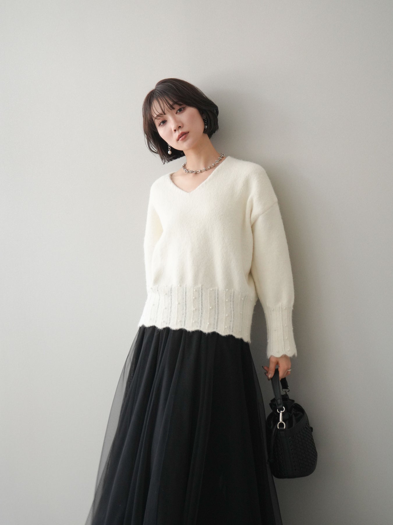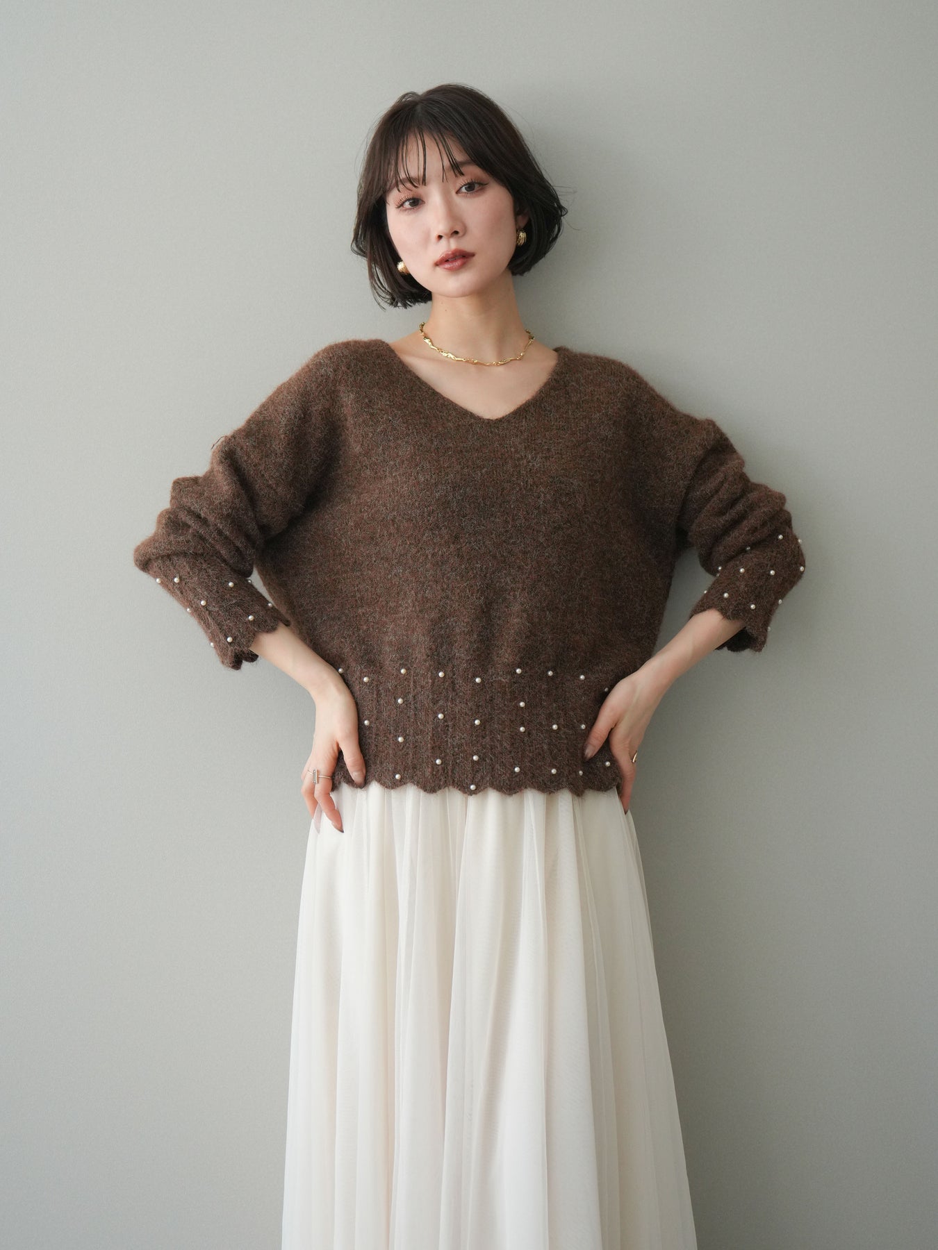繊細なパールディテールと裾のフリルリブが目を惹くニットプルオーバー。柔らかな風合いのニットに、控えめながらも上品な装飾を施すことで、シンプルな中に女性らしい華やかさをプラスしています。程よく開いたネックラインが顔まわりをすっきりと見せ、1枚で着映えするデザインに。コンパクトすぎないシルエットで、パンツにもスカートにも合わせやすく、デイリーからきれいめシーンまで幅広く活躍する一着です。 ※ボトムス、キャミソール(インナー)以外の商品は一律でインナーは付属していません。