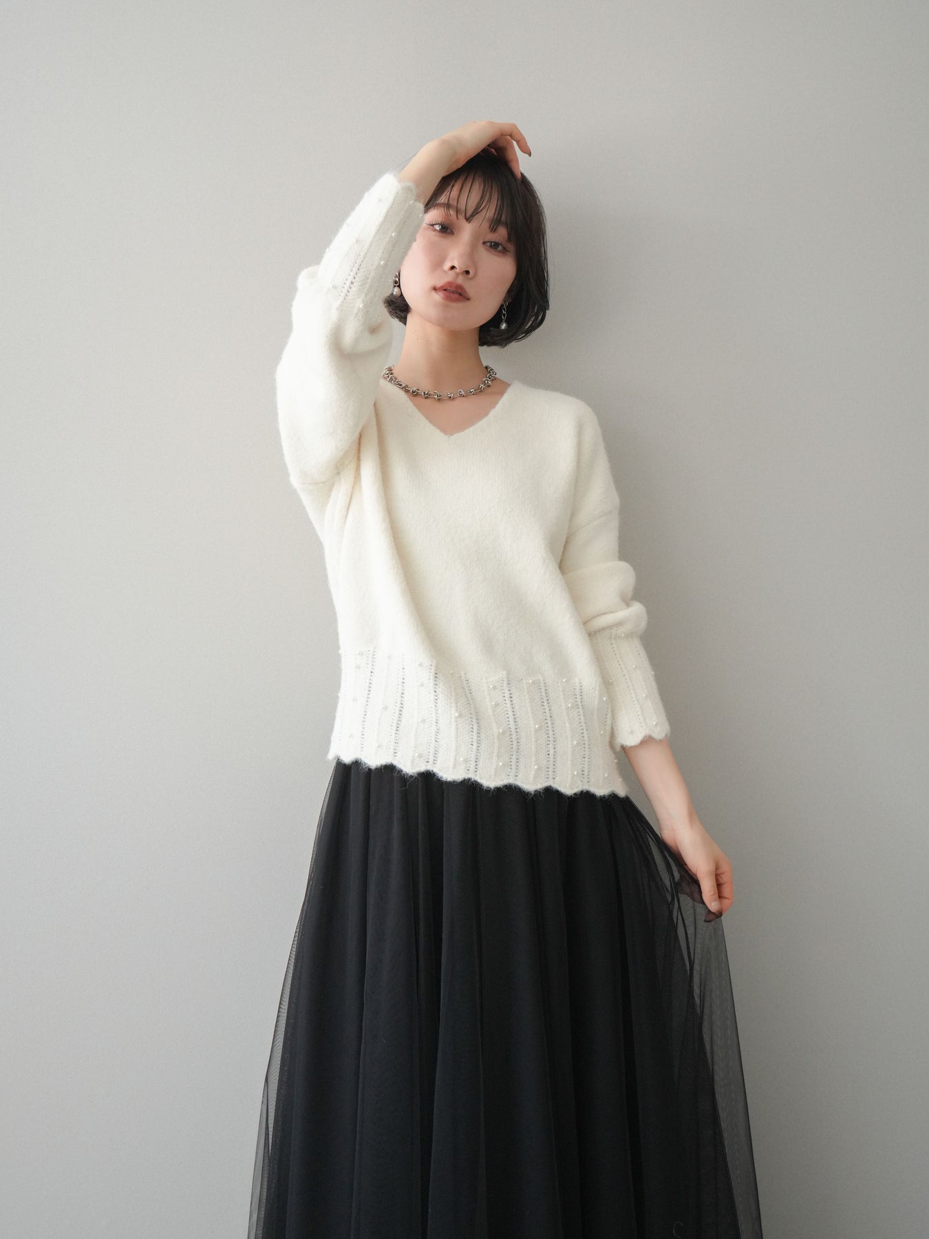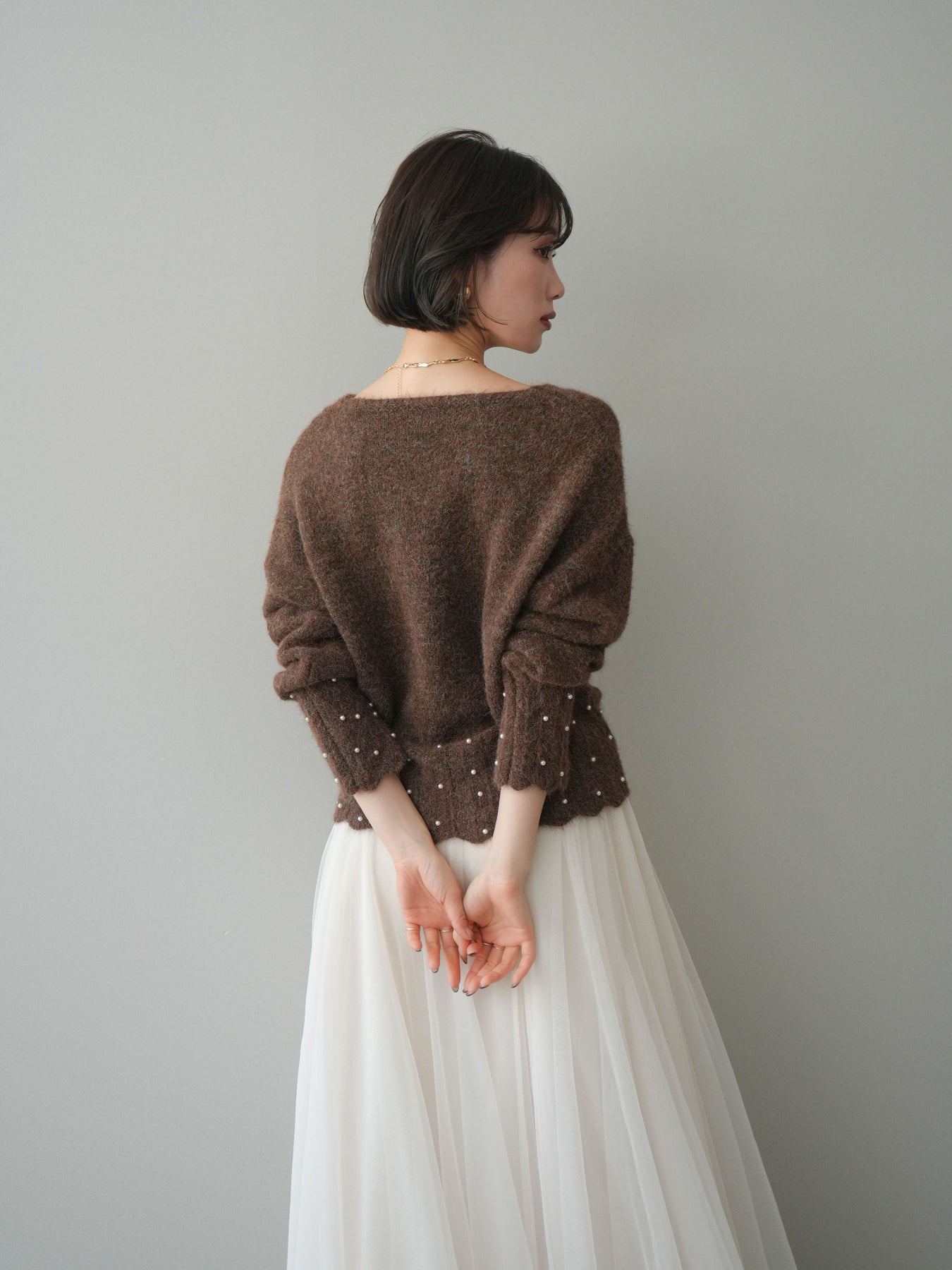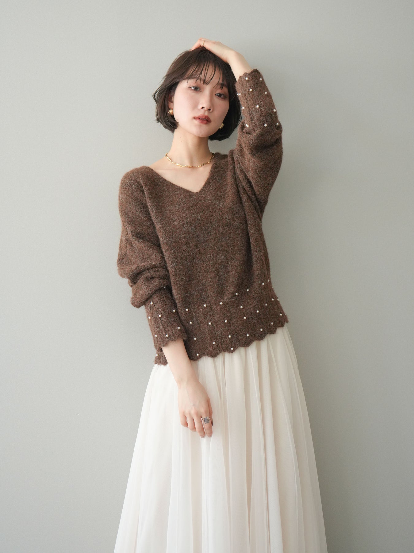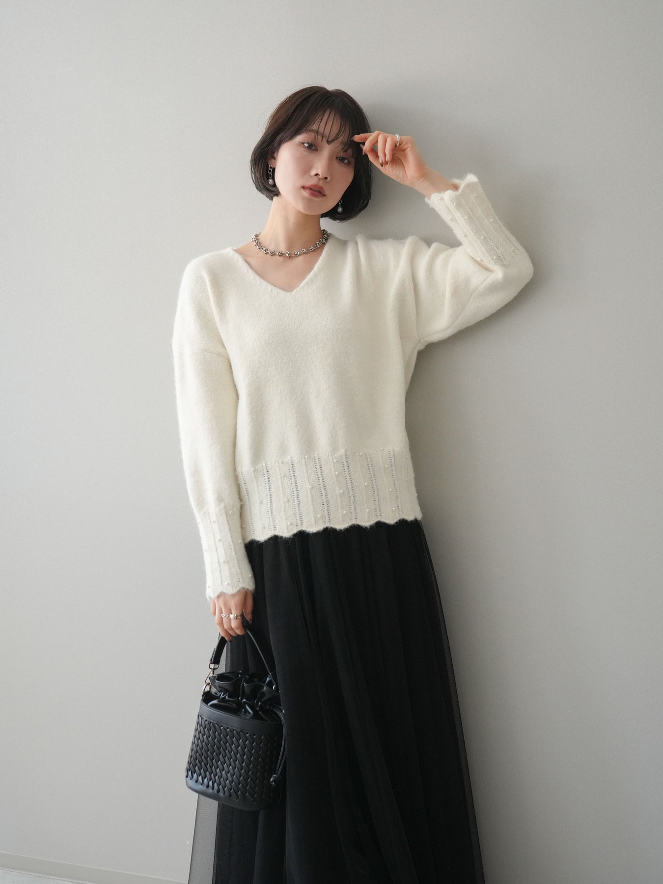 繊細なパールディテールと裾のフリルリブが目を惹くニットプルオーバー。柔らかな風合いのニットに、控えめながらも上品な装飾を施すことで、シンプルな中に女性らしい華やかさをプラスしています。程よく開いたネックラインが顔まわりをすっきりと見せ、1枚で着映えするデザインに。コンパクトすぎないシルエットで、パンツにもスカートにも合わせやすく、デイリーからきれいめシーンまで幅広く活躍する一着です。 ※ボトムス、キャミソール(インナー)以外の商品は一律でインナーは付属していません。