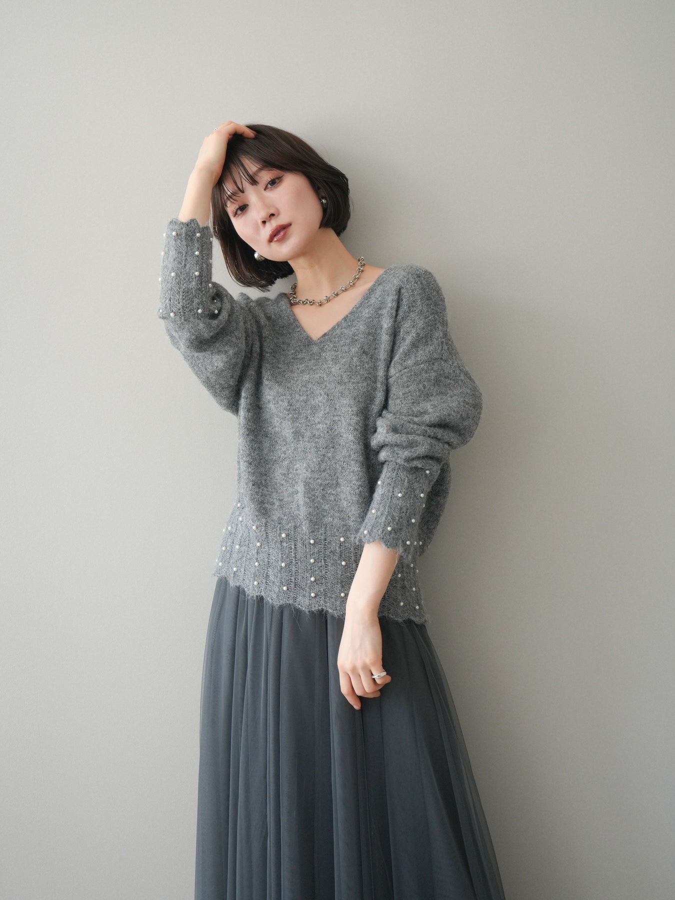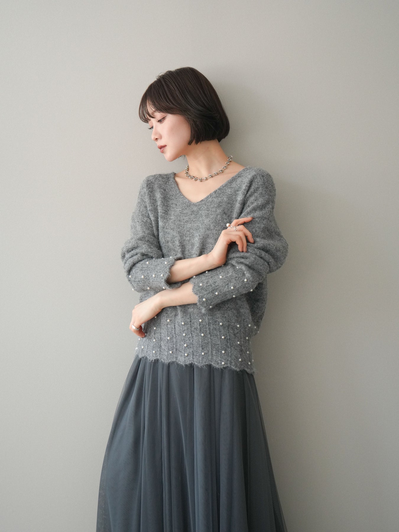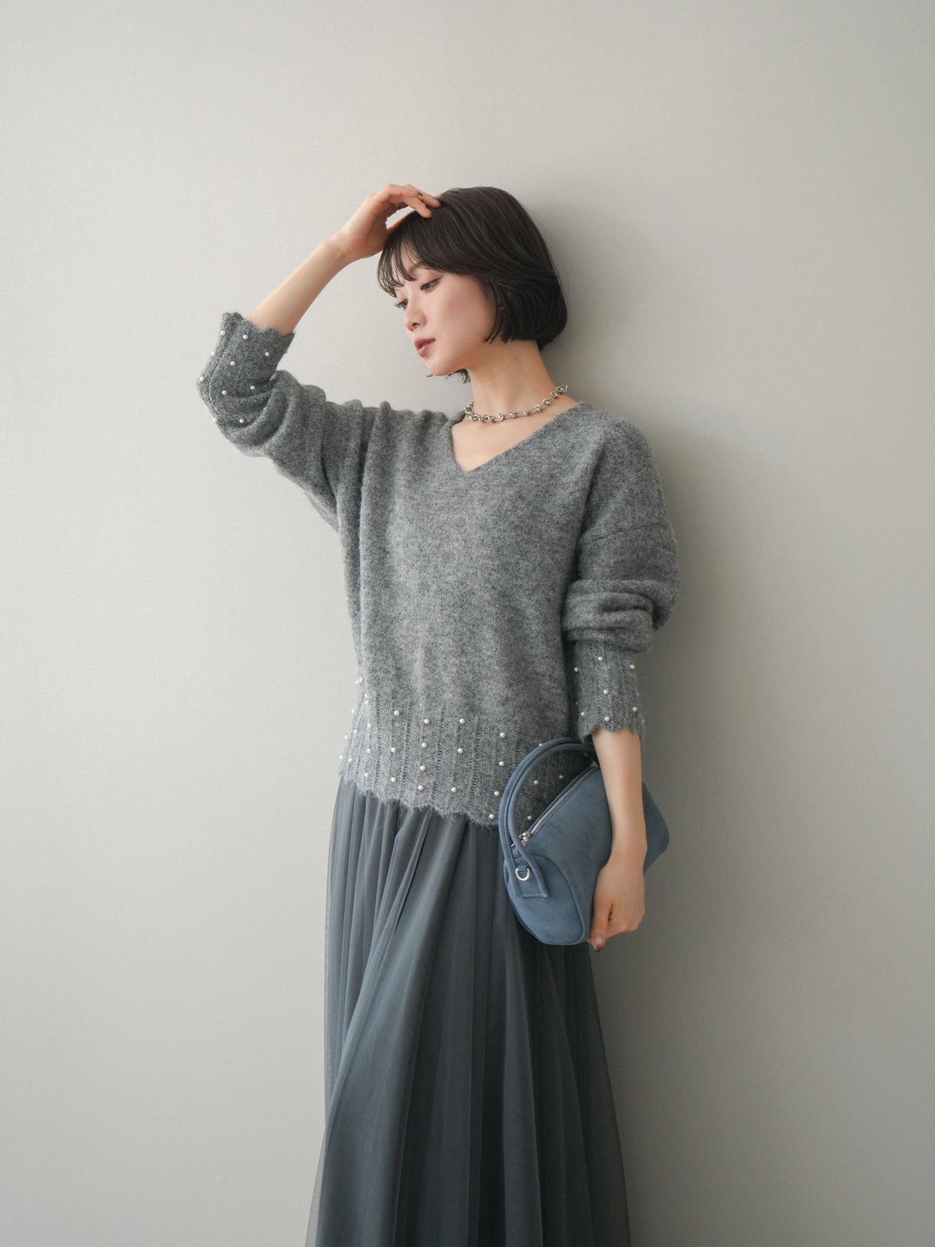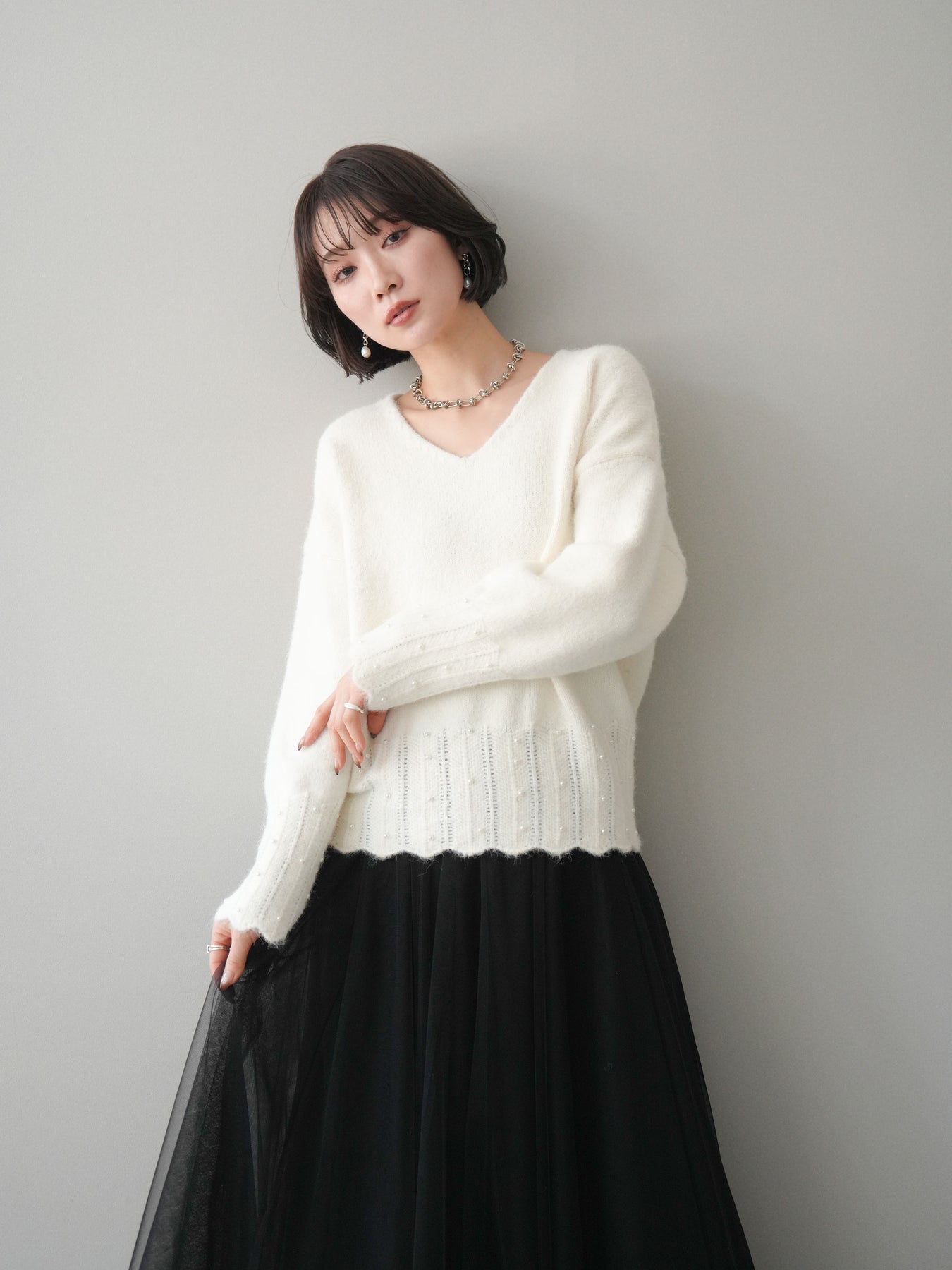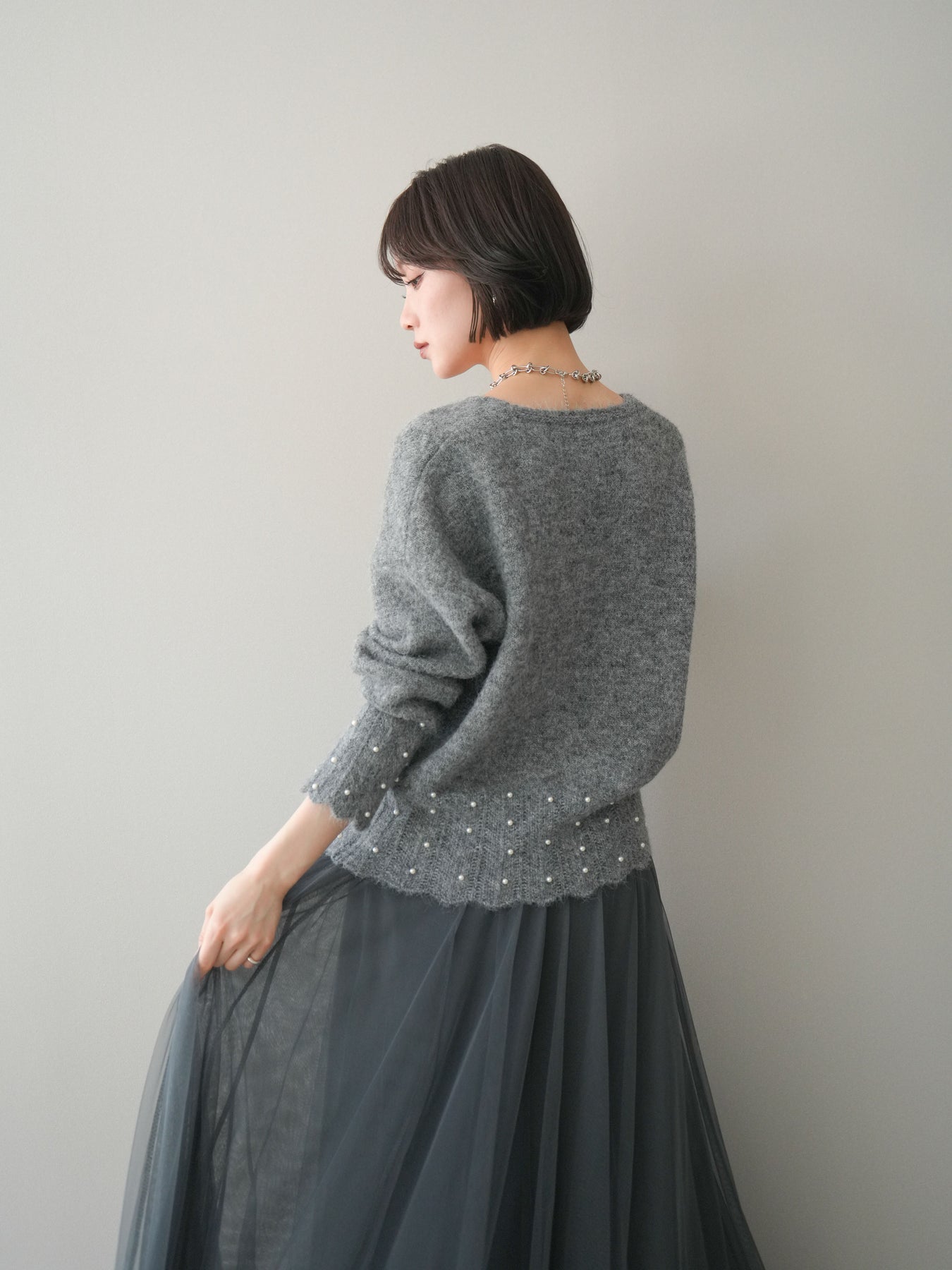 繊細なパールディテールと裾のフリルリブが目を惹くニットプルオーバー。柔らかな風合いのニットに、控えめながらも上品な装飾を施すことで、シンプルな中に女性らしい華やかさをプラスしています。程よく開いたネックラインが顔まわりをすっきりと見せ、1枚で着映えするデザインに。コンパクトすぎないシルエットで、パンツにもスカートにも合わせやすく、デイリーからきれいめシーンまで幅広く活躍する一着です。 ※ボトムス、キャミソール(インナー)以外の商品は一律でインナーは付属していません。