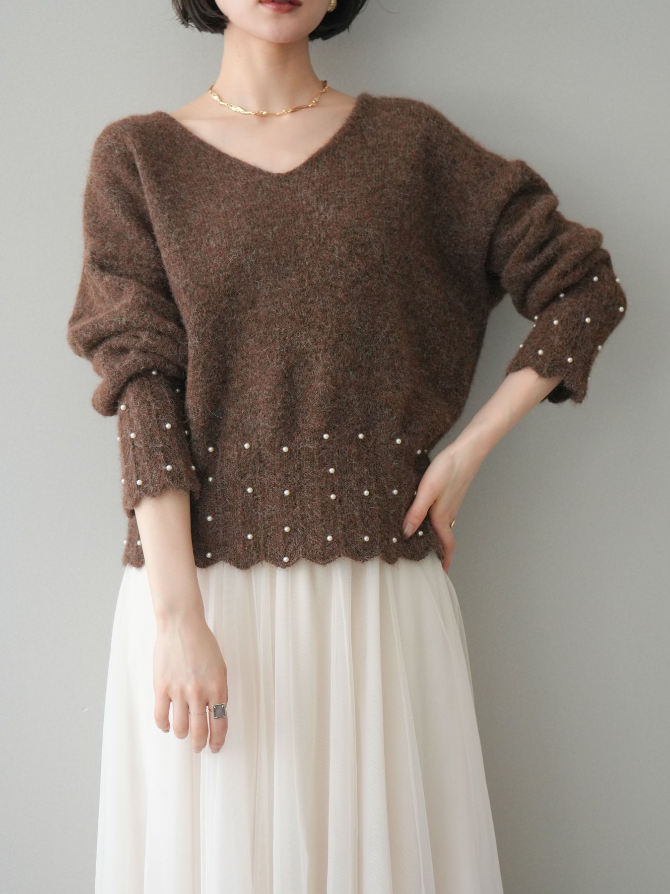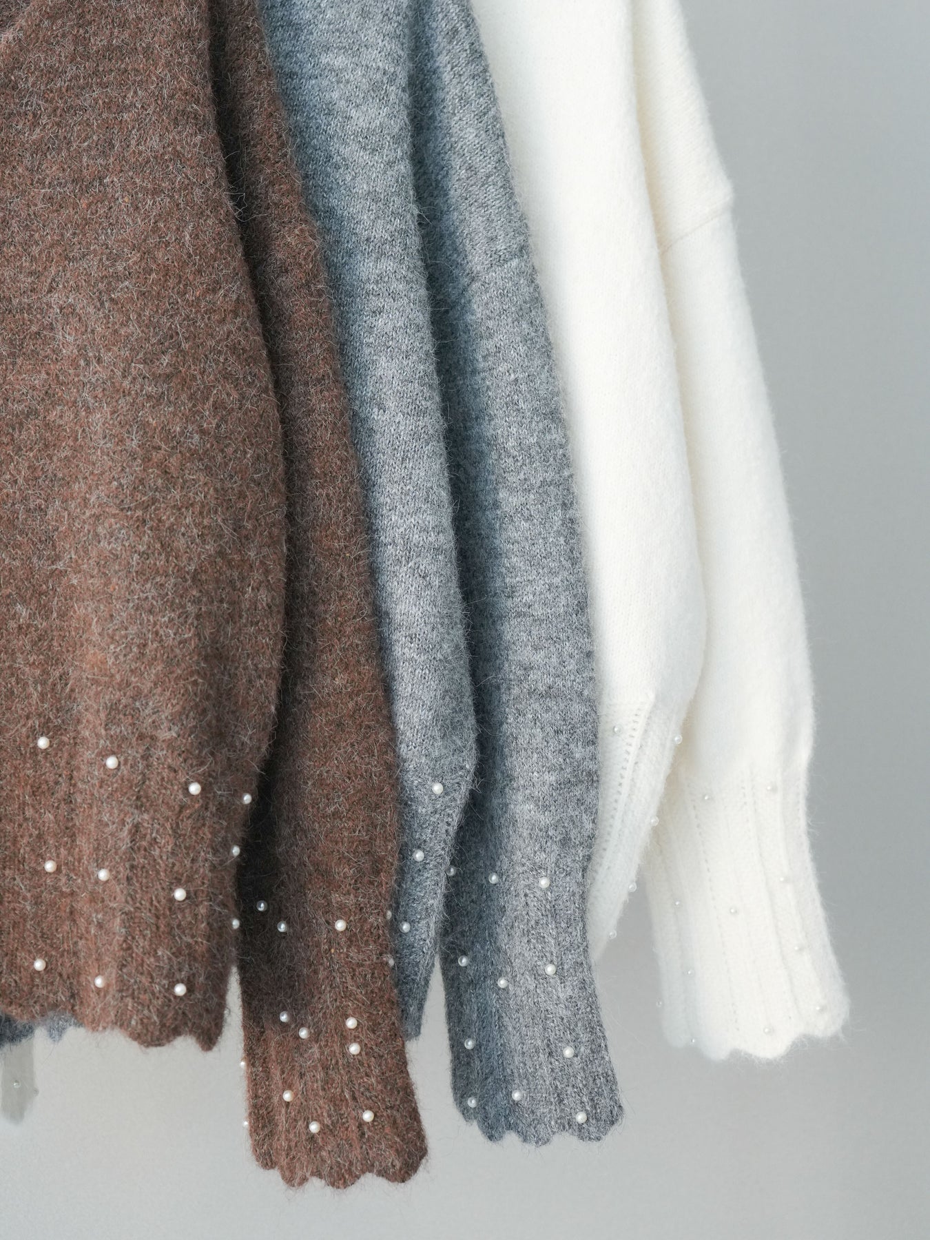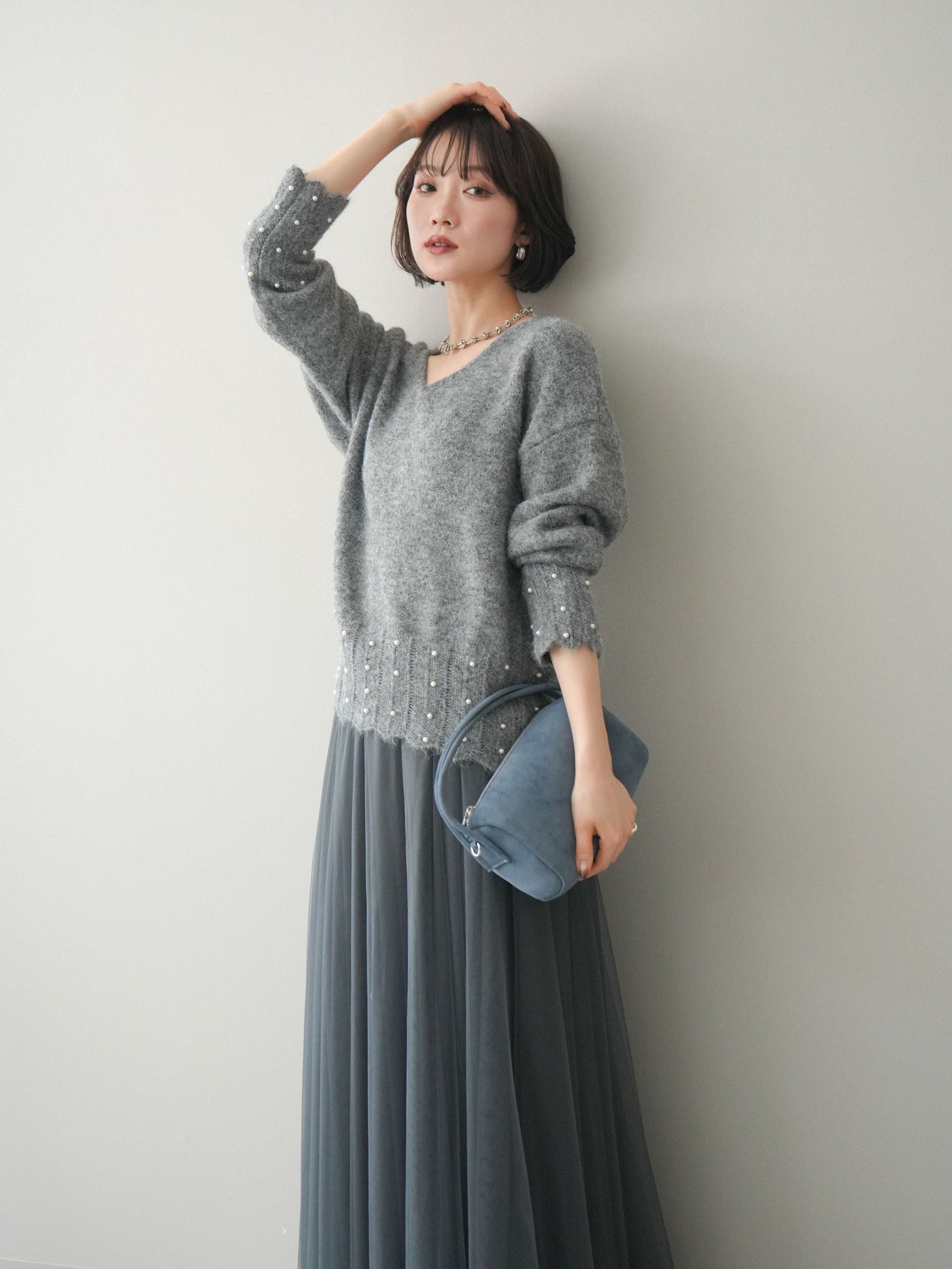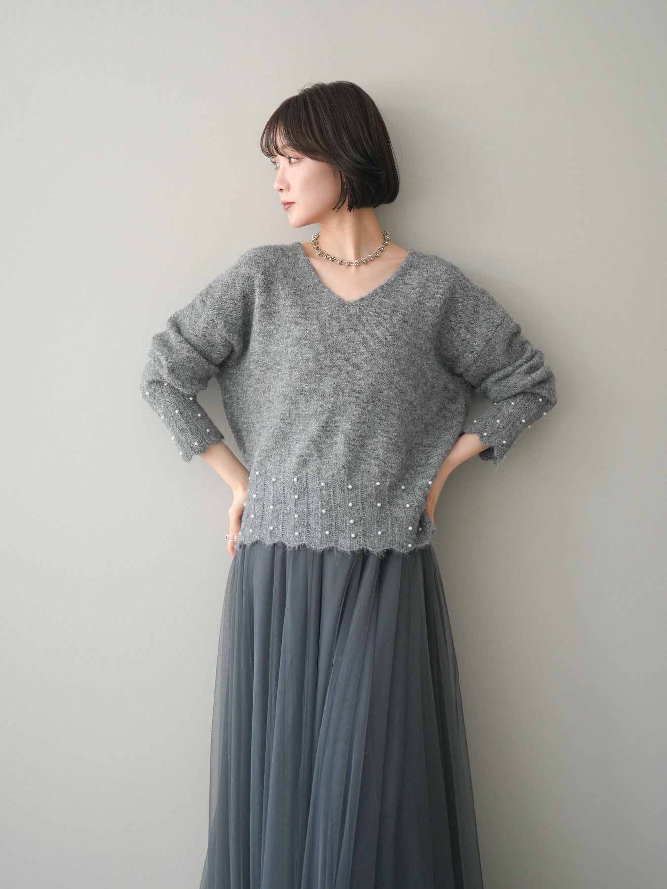 繊細なパールディテールと裾のフリルリブが目を惹くニットプルオーバー。柔らかな風合いのニットに、控えめながらも上品な装飾を施すことで、シンプルな中に女性らしい華やかさをプラスしています。程よく開いたネックラインが顔まわりをすっきりと見せ、1枚で着映えするデザインに。コンパクトすぎないシルエットで、パンツにもスカートにも合わせやすく、デイリーからきれいめシーンまで幅広く活躍する一着です。 ※ボトムス、キャミソール(インナー)以外の商品は一律でインナーは付属していません。