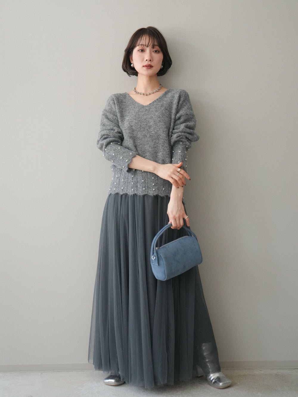 [SET]パールフリルリブヘムニットプルオーバー+チュールボリュームスカート(2set)