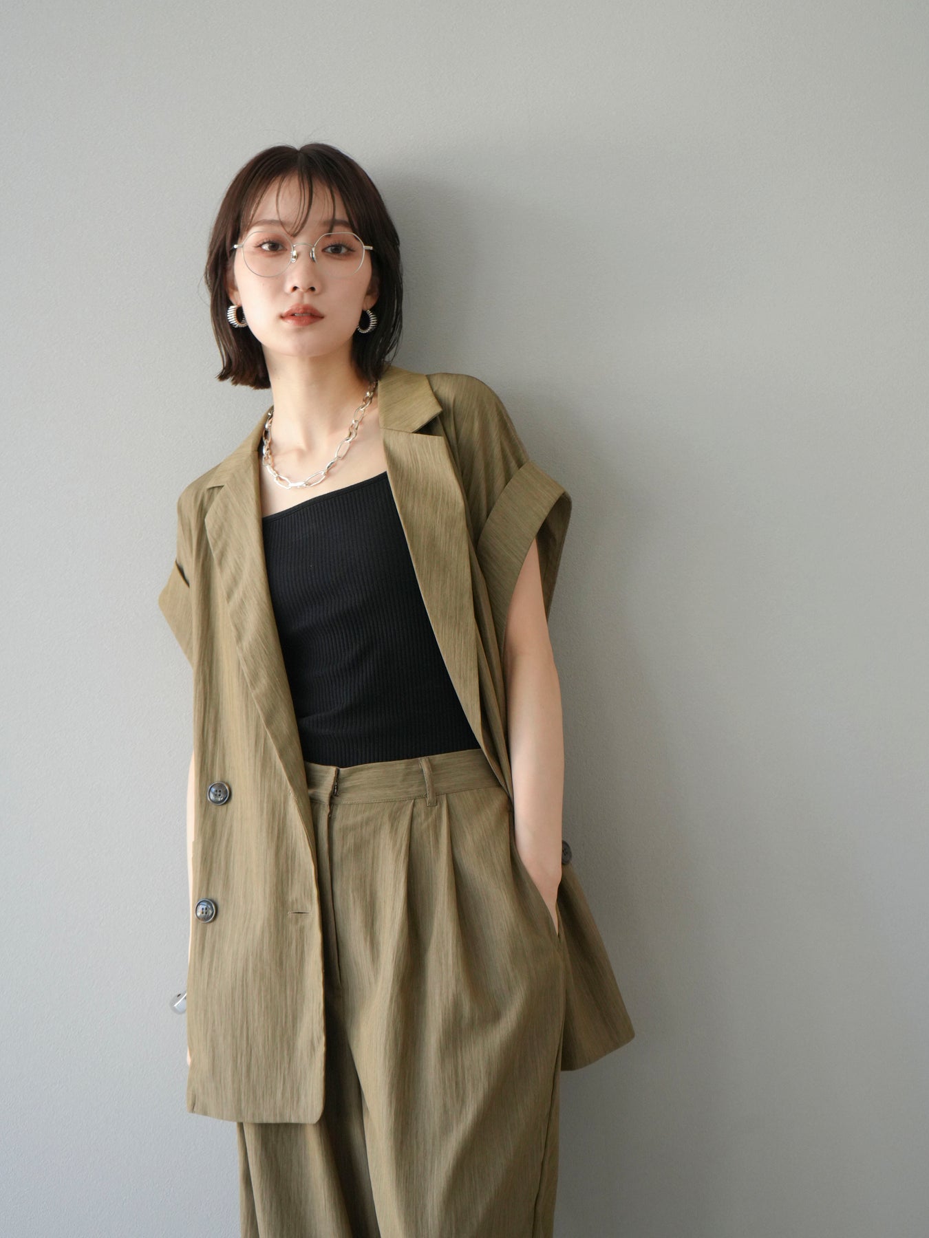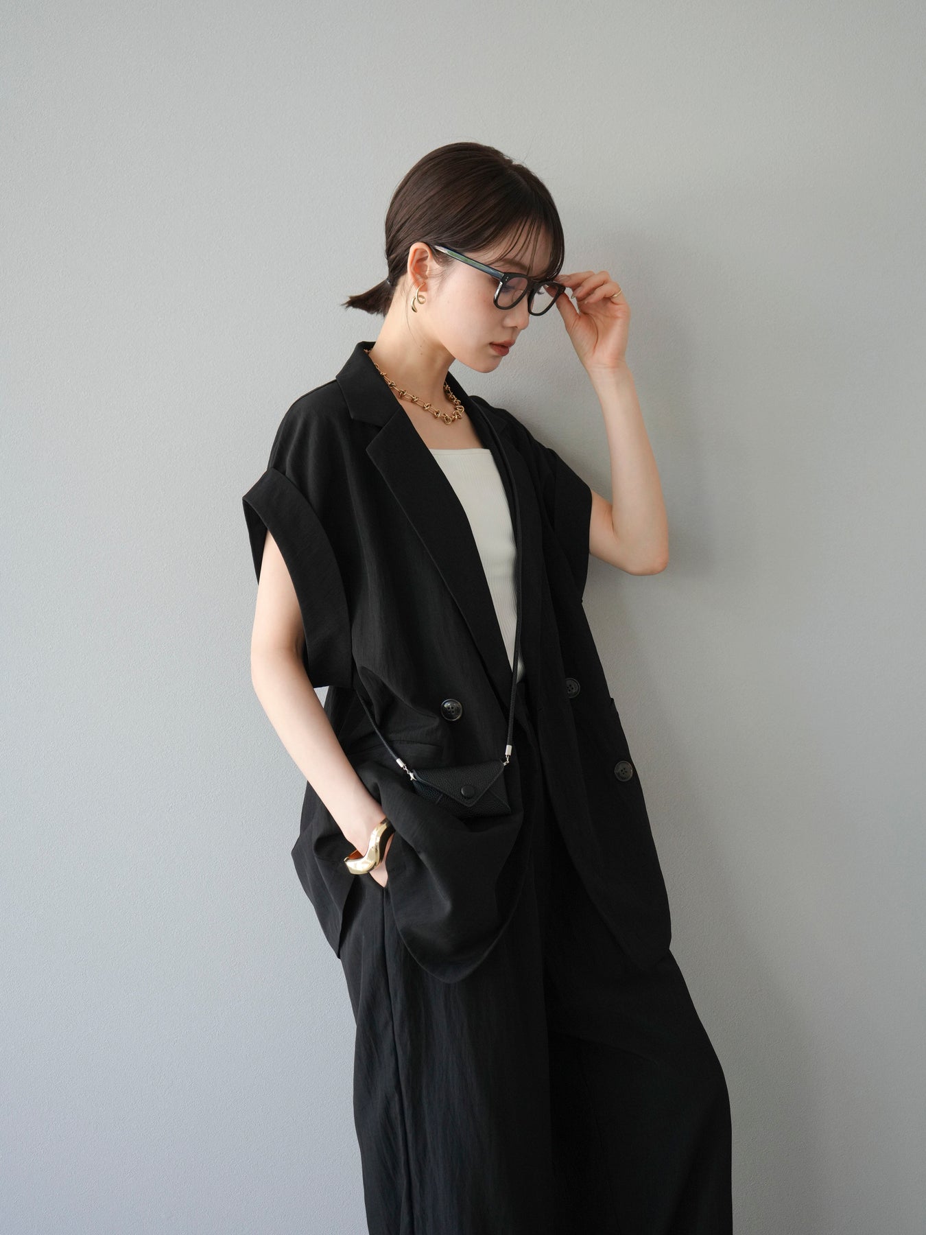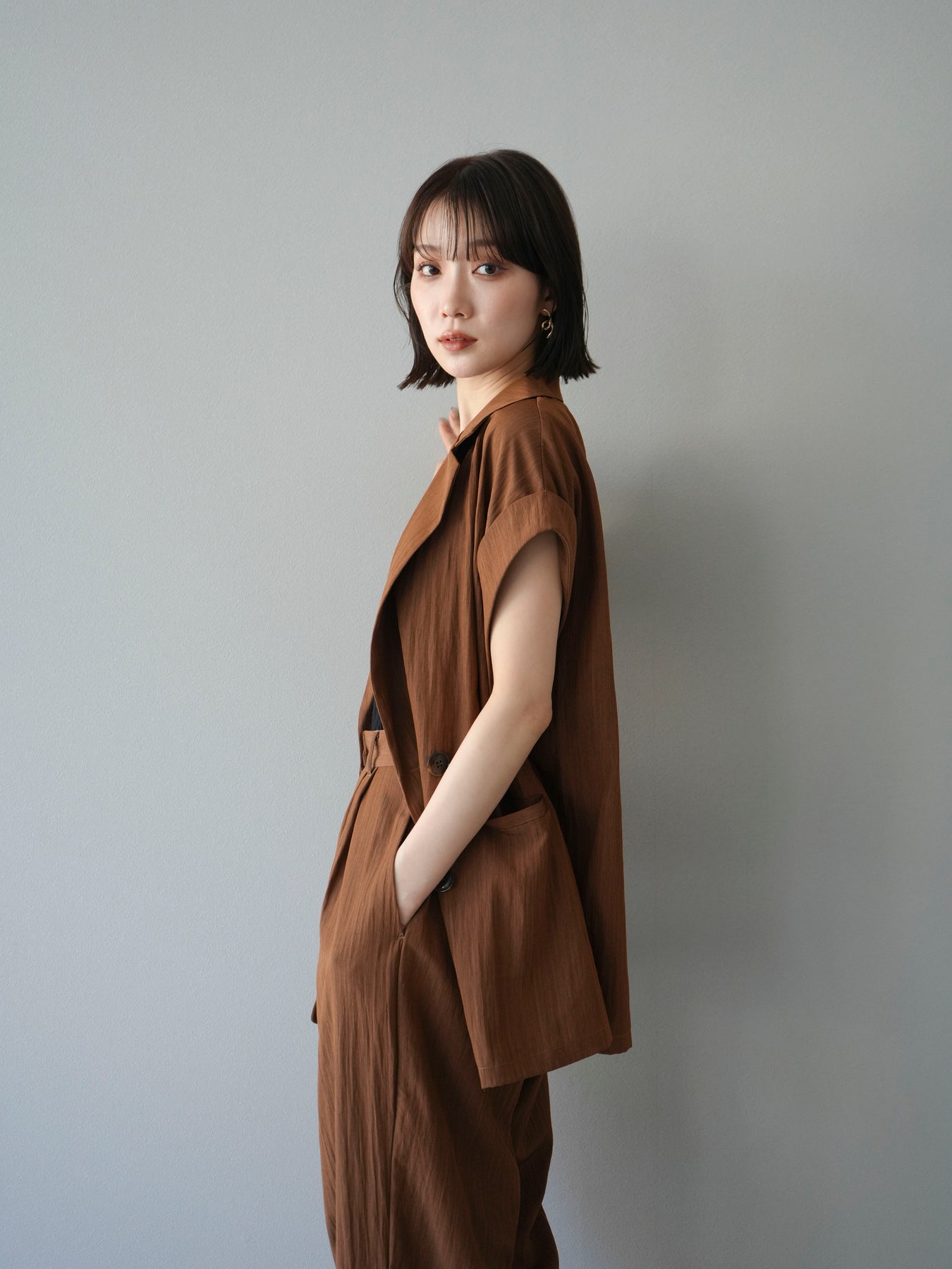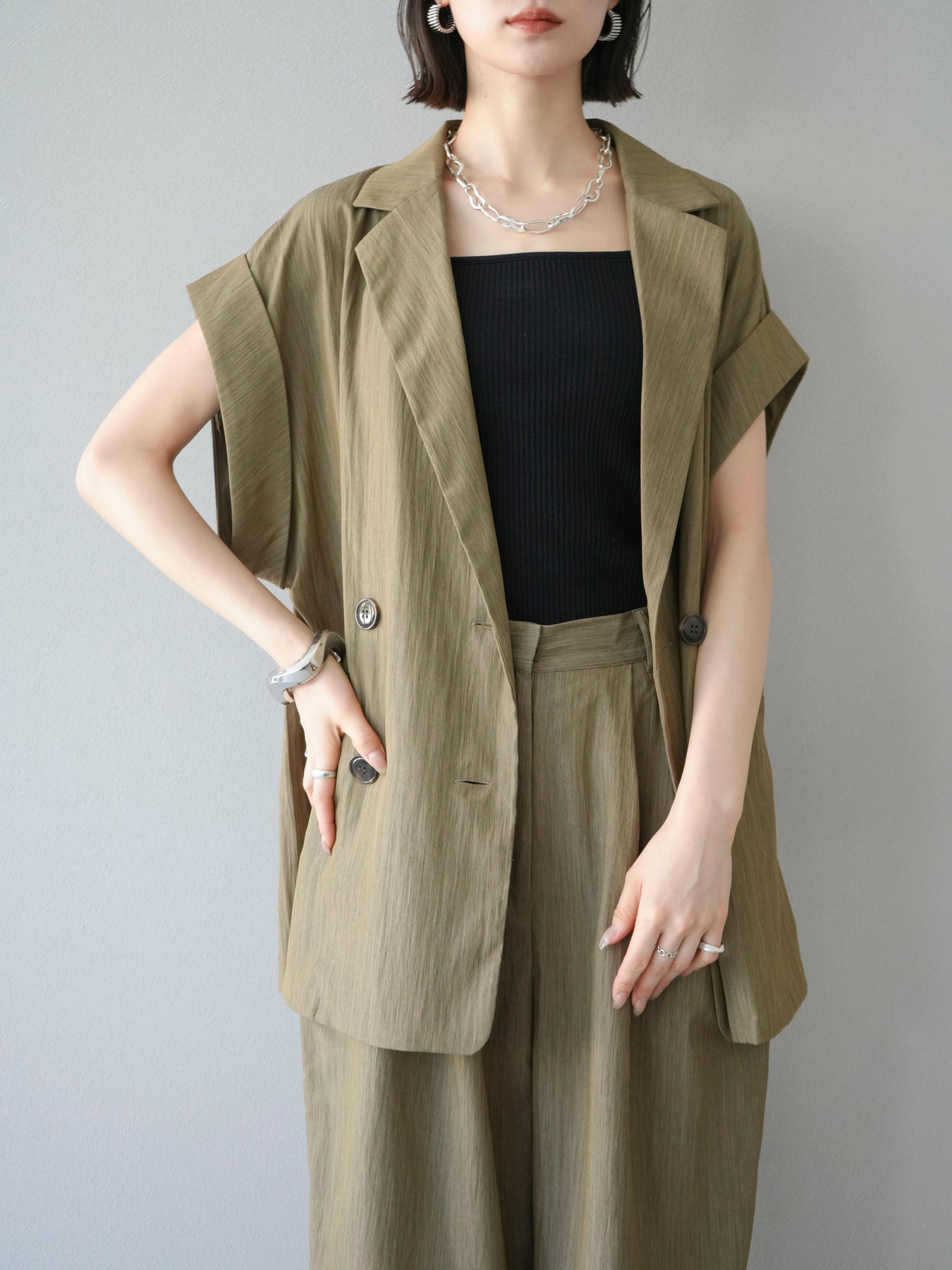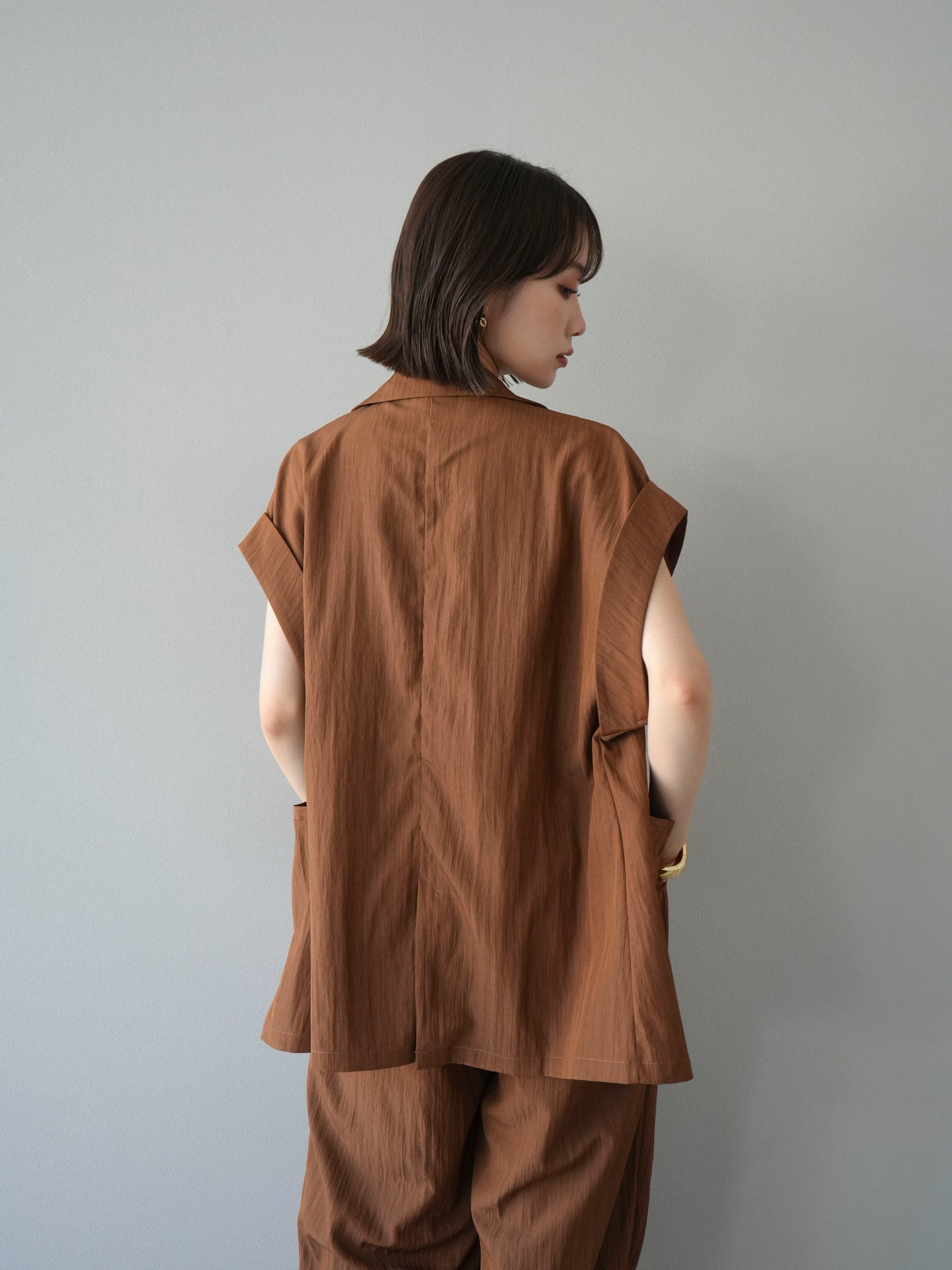 這款雙扣無袖背心採用天然亞麻材質製成。法式長袖恰到好處地垂落於肩部,寬鬆的輪廓營造出輕鬆幹練的氛圍。長款設計包覆臀部,垂直的線條營造出隱藏身材、提升氣質的效果。搭配T卹或無袖上衣,即可打造幹練的疊穿造型。也推薦作為套裝穿著。 *除下裝和吊帶背心(內衣)外,所有商品均不包含內衣。
