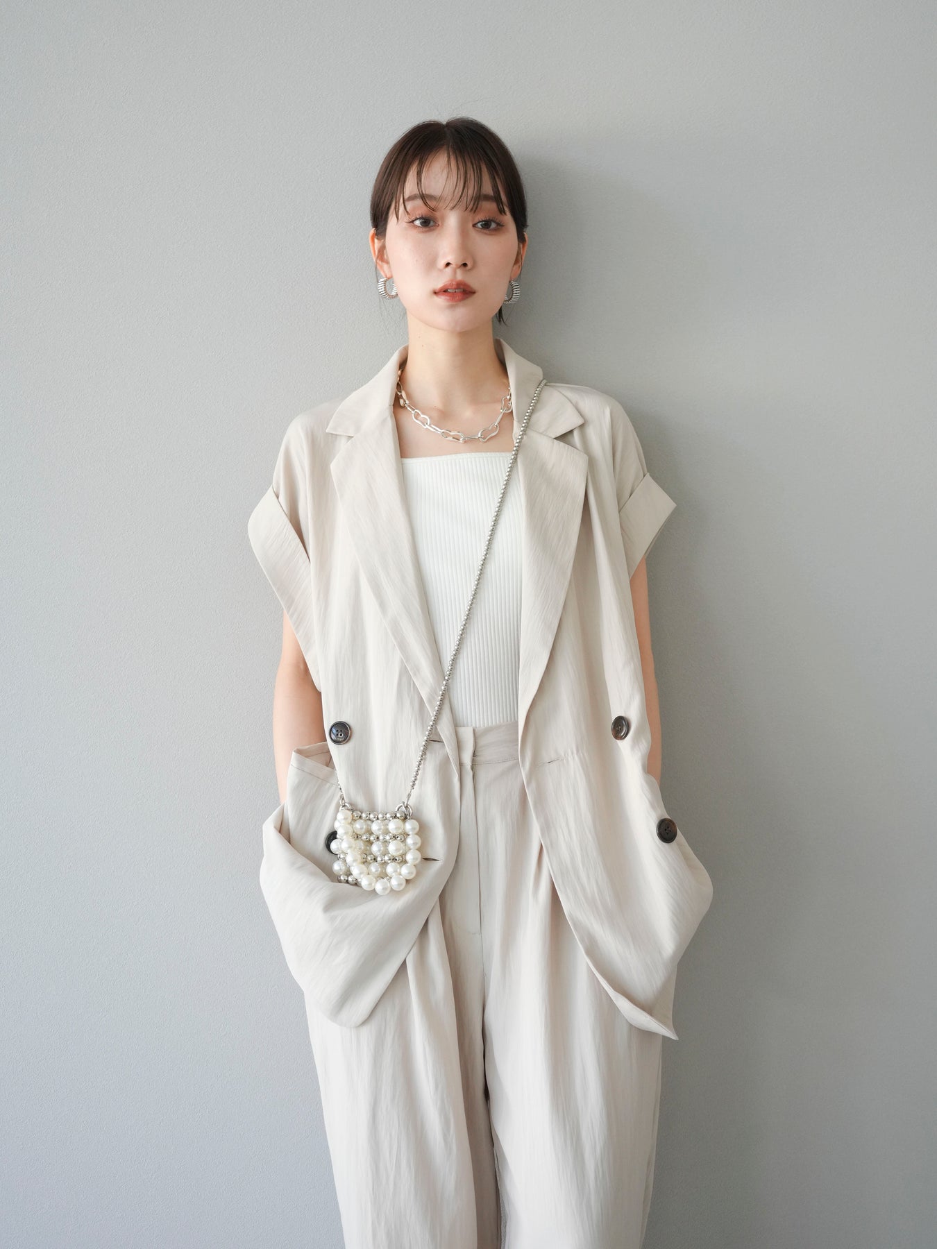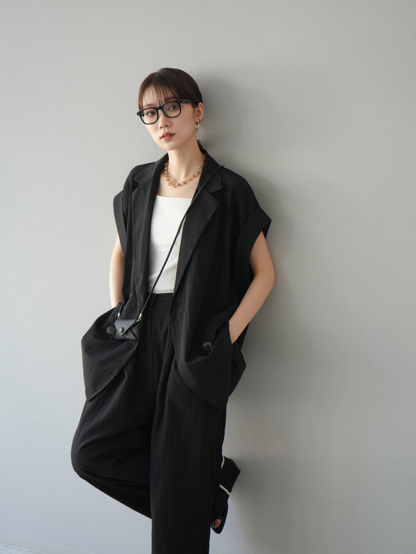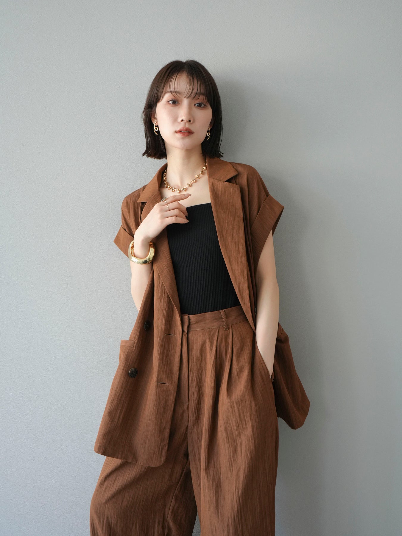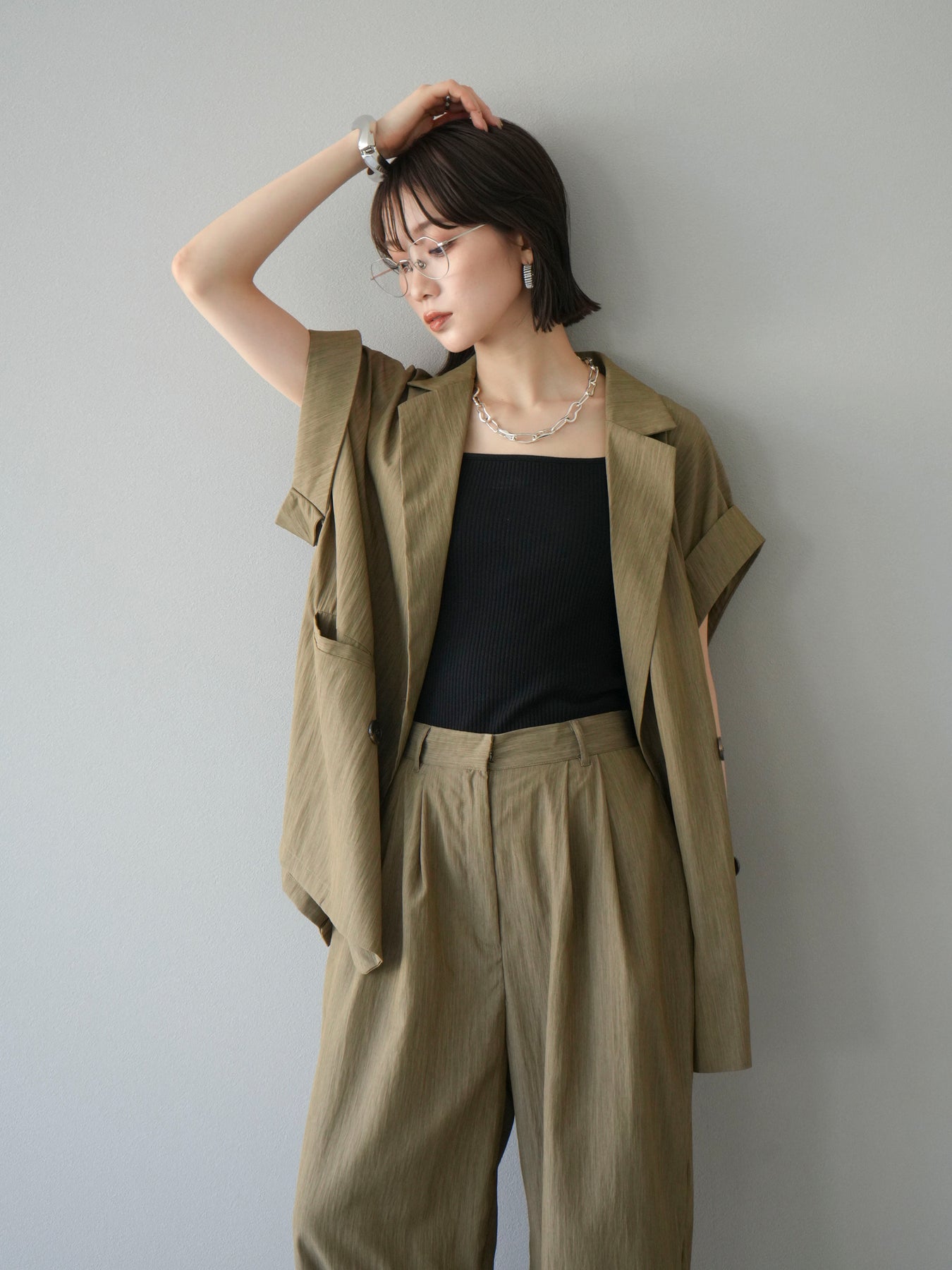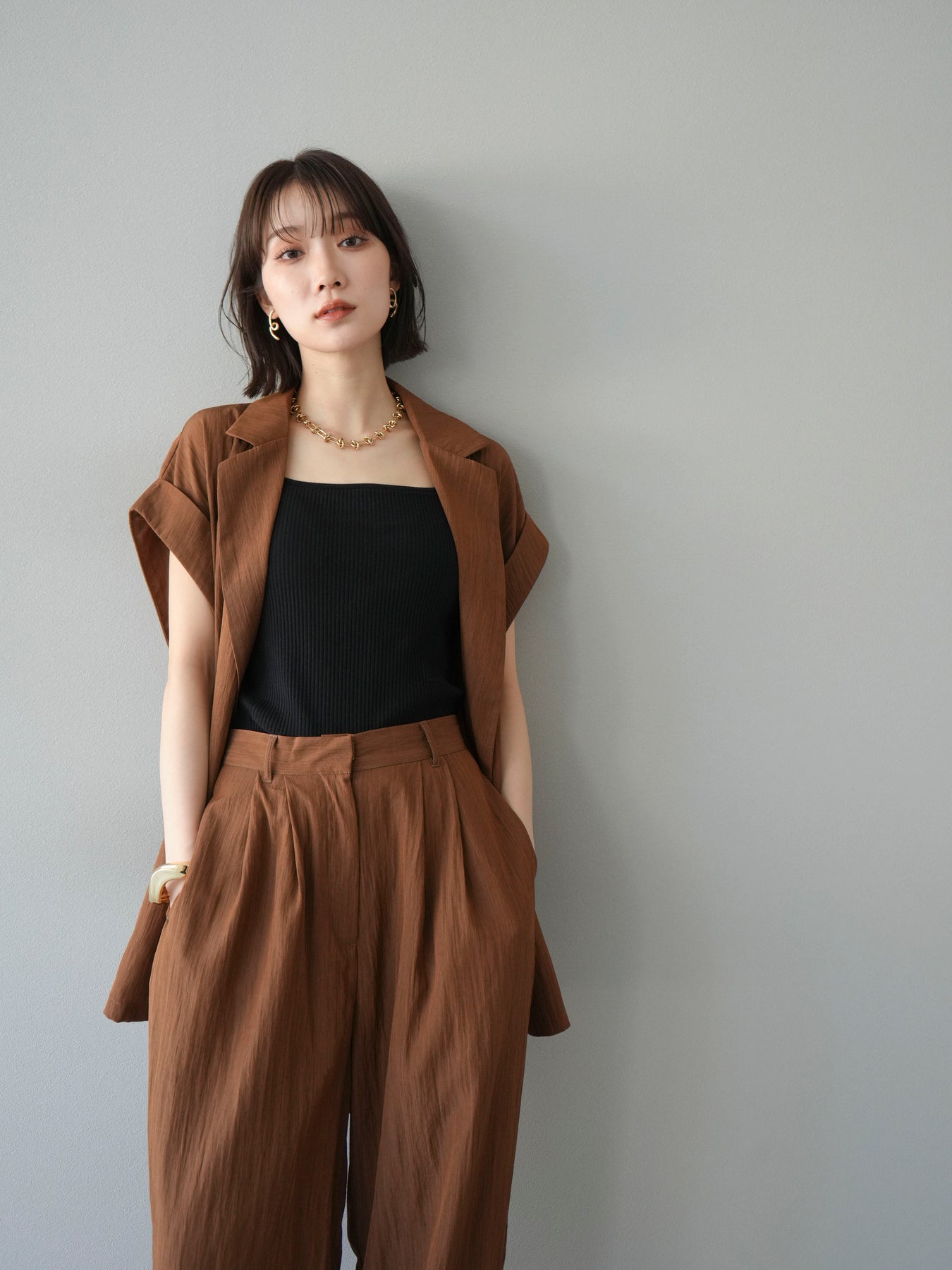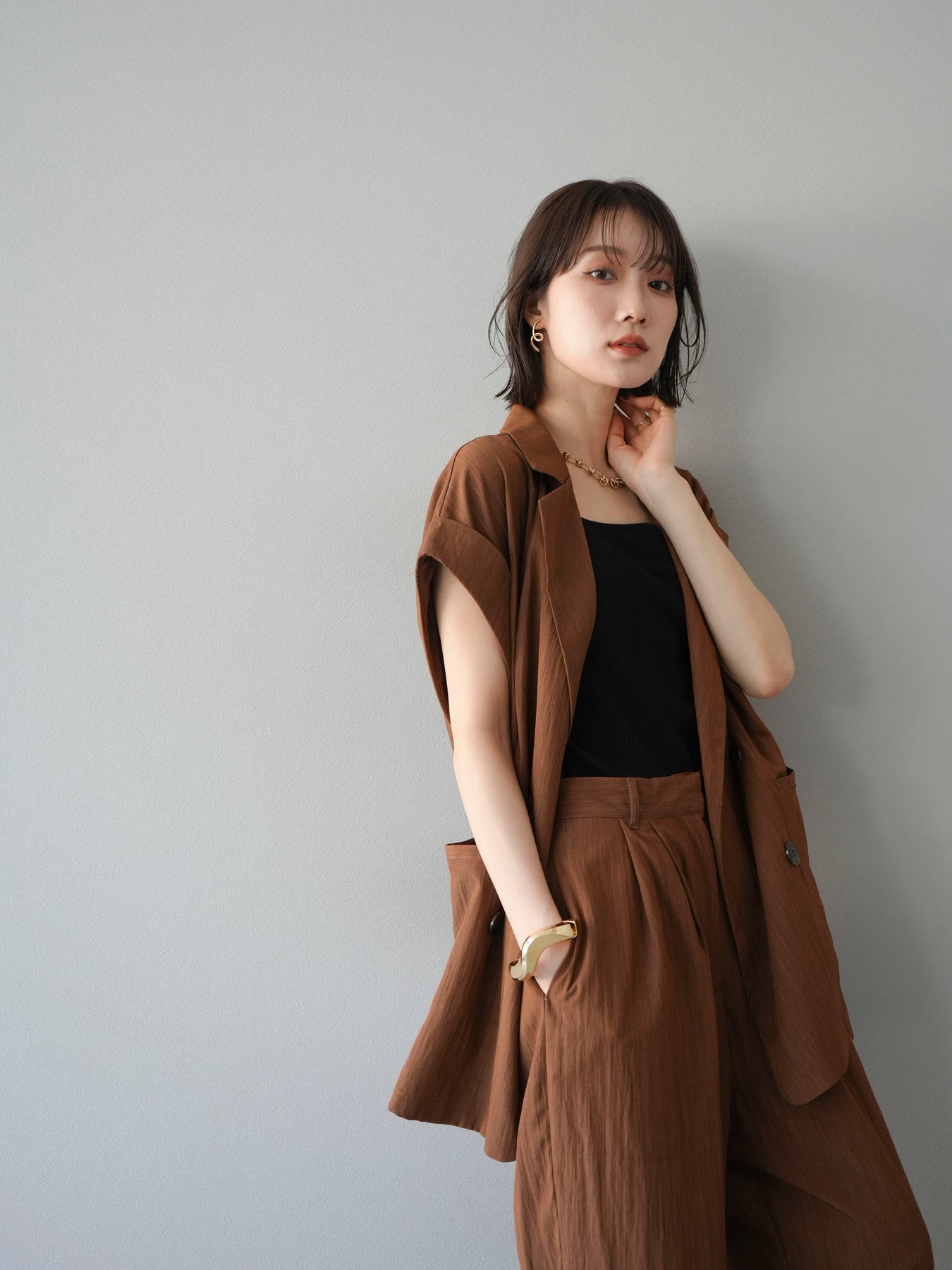 這款雙扣無袖背心採用天然亞麻材質製成。法式長袖恰到好處地垂落於肩部,寬鬆的輪廓營造出輕鬆幹練的氛圍。長款設計包覆臀部,垂直的線條營造出隱藏身材、提升氣質的效果。搭配T卹或無袖上衣,即可打造幹練的疊穿造型。也推薦作為套裝穿著。 *除下裝和吊帶背心(內衣)外,所有商品均不包含內衣。