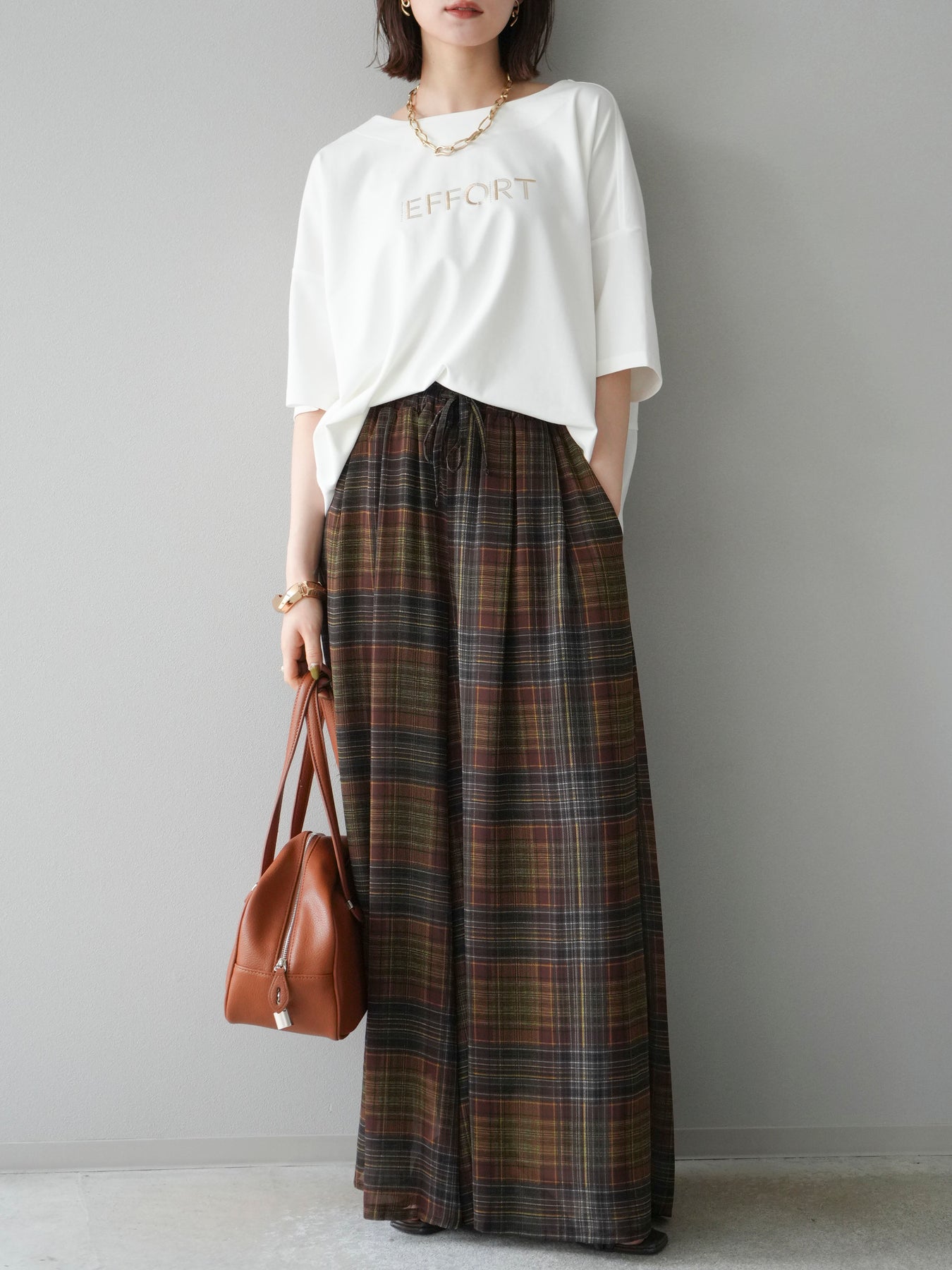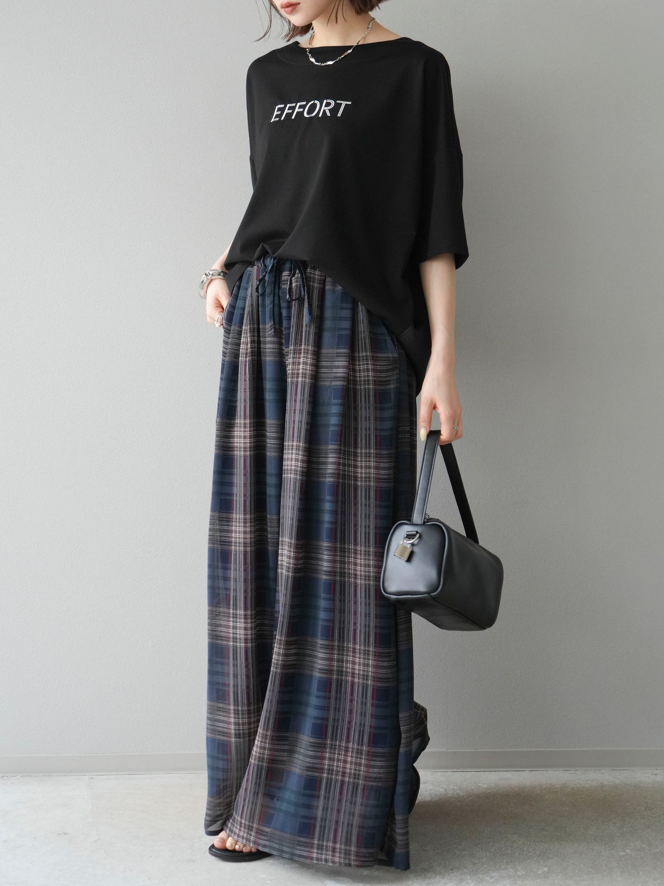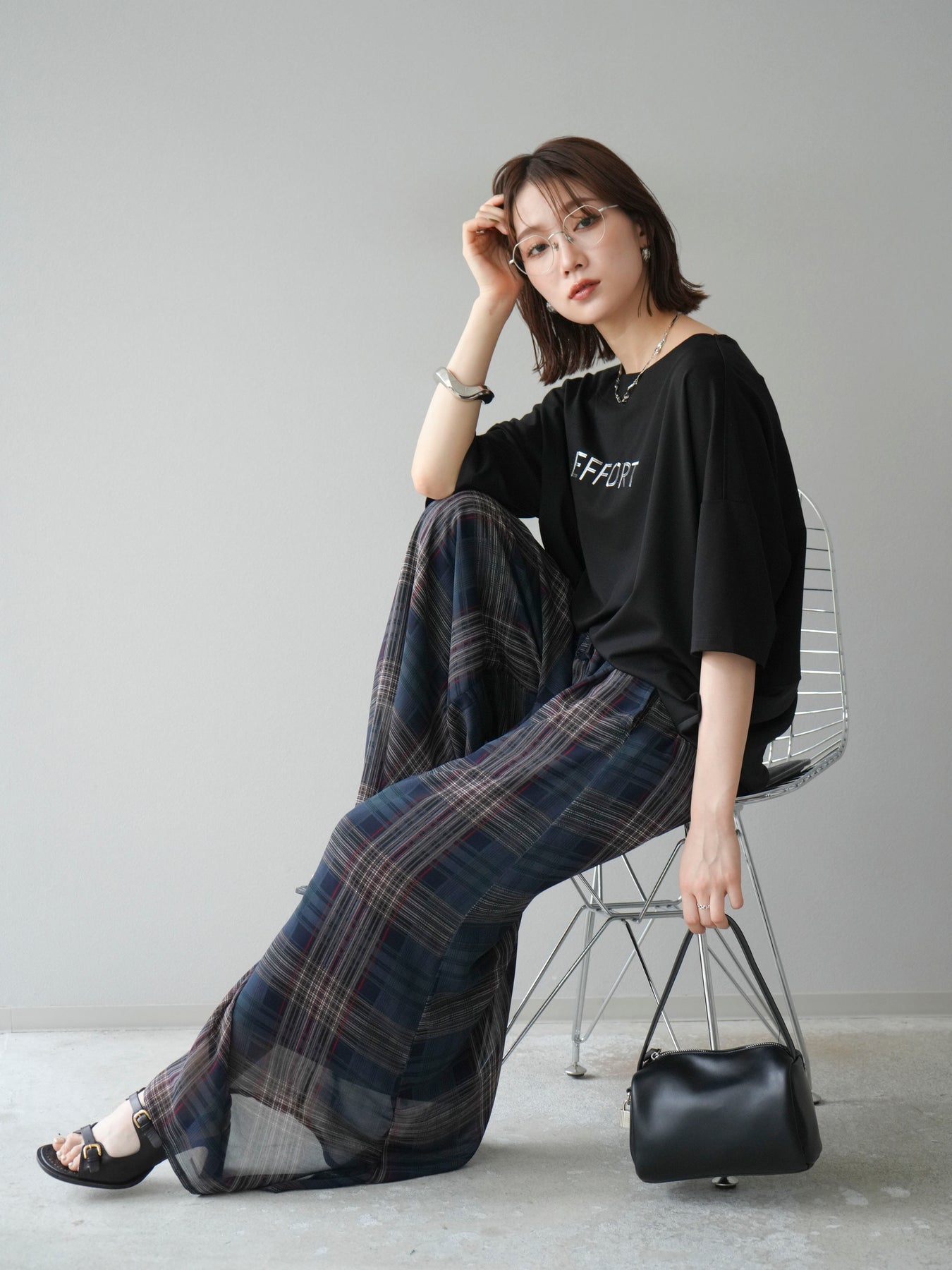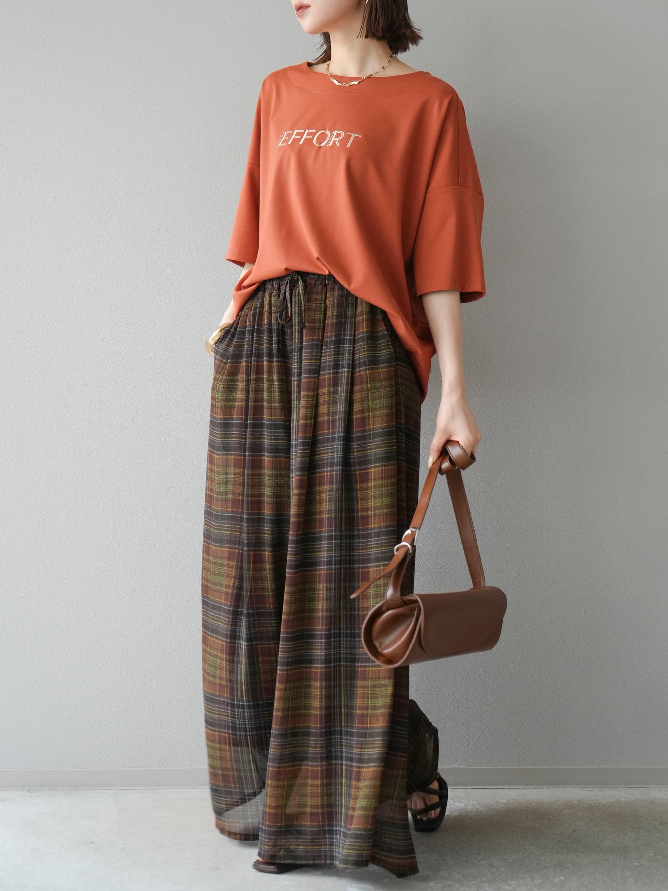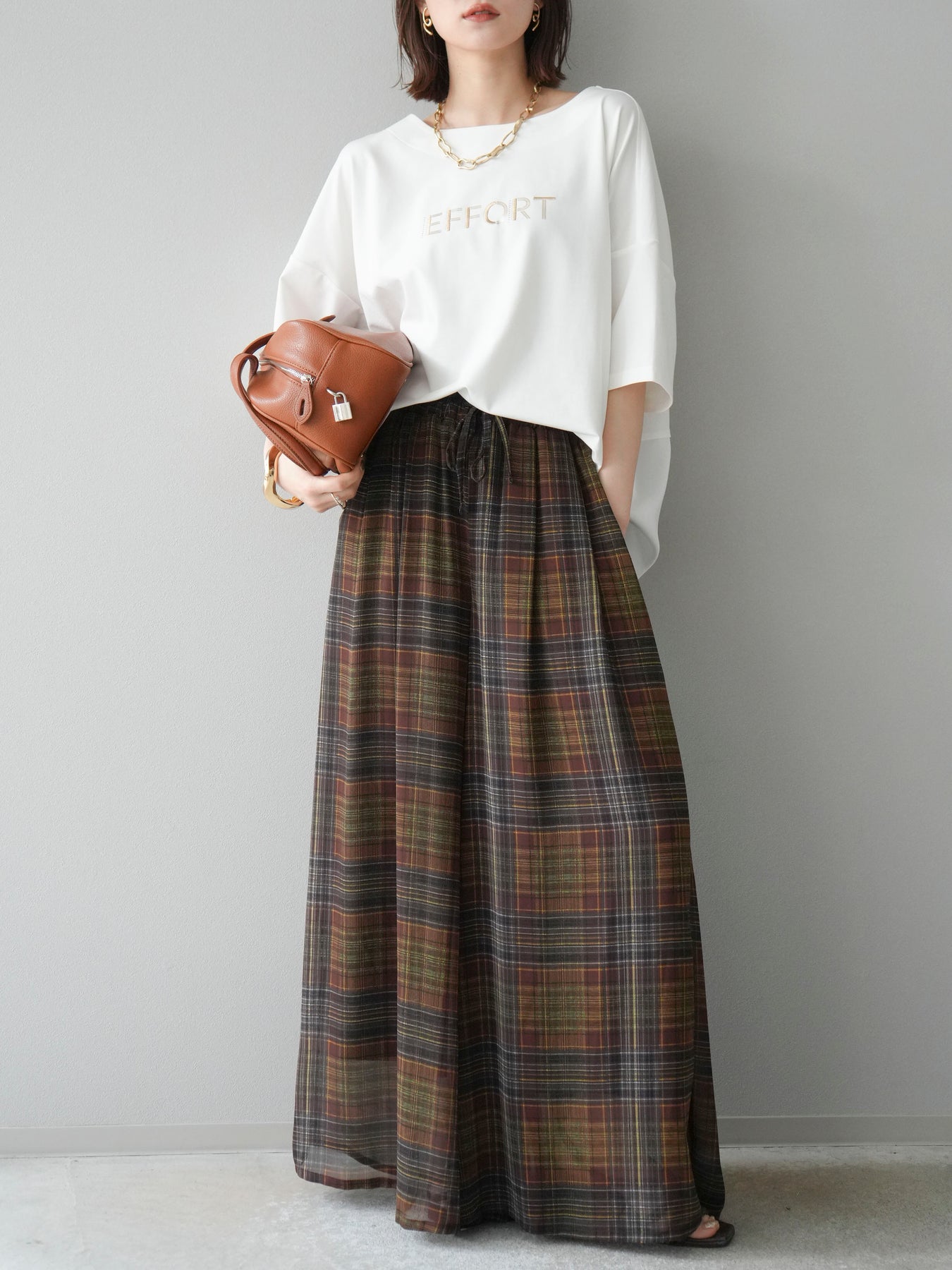 這款寬鬆褲休閒又不失成熟,深色格紋圖案搭配透視布料,更能襯托出季節的氛圍。適度的透明度營造出輕盈飄逸的感覺,是一條既能提升時尚感又不失休閒感的褲子。 腰部採用全彈性設計,並配有抽繩,穿著舒適。布料厚實,垂墜感十足,讓您隨動作優雅擺動。 這是一款引人注目的單品,只需搭配一件簡單的上衣即可為您的服裝增添亮點。