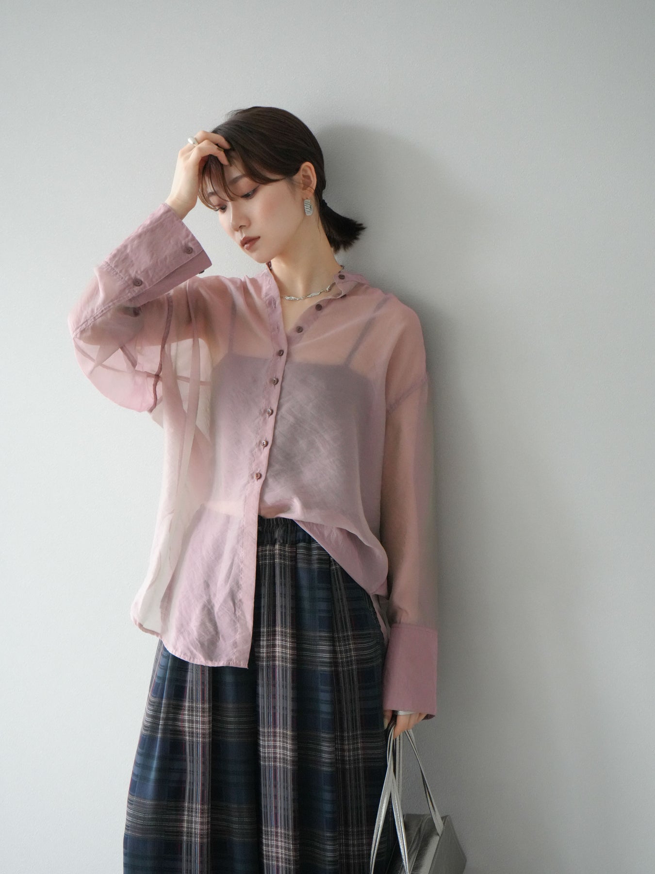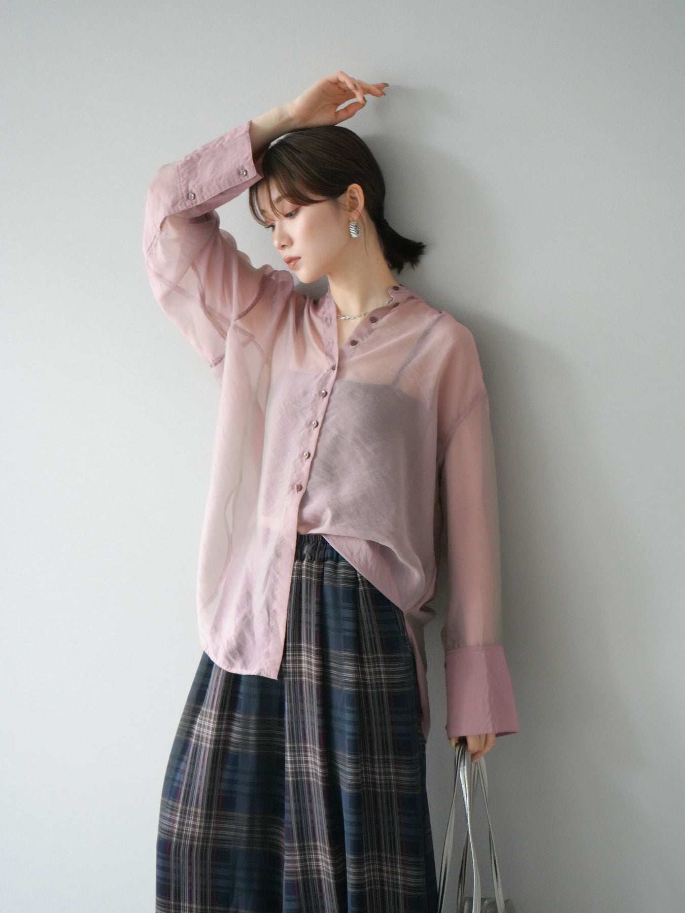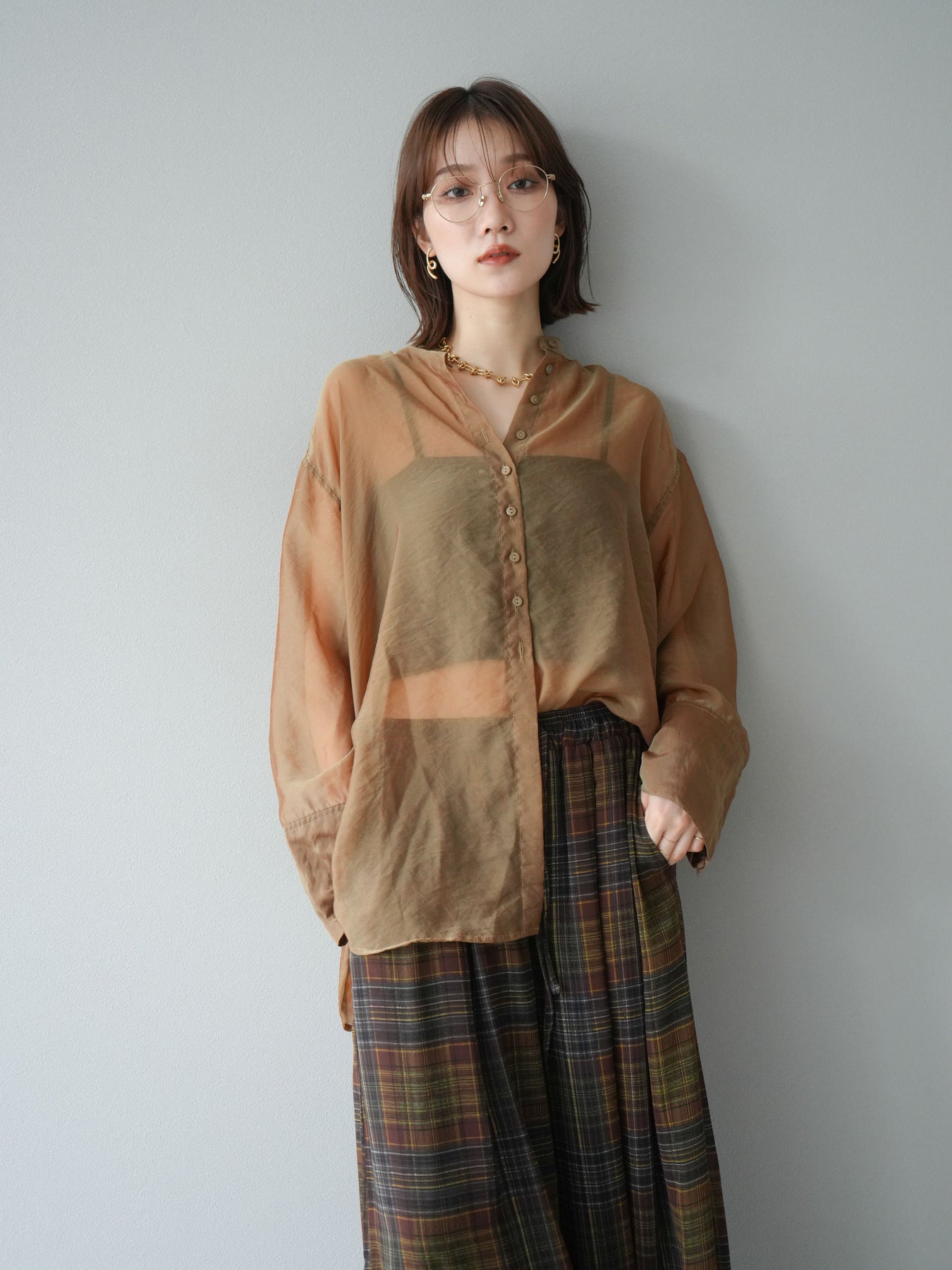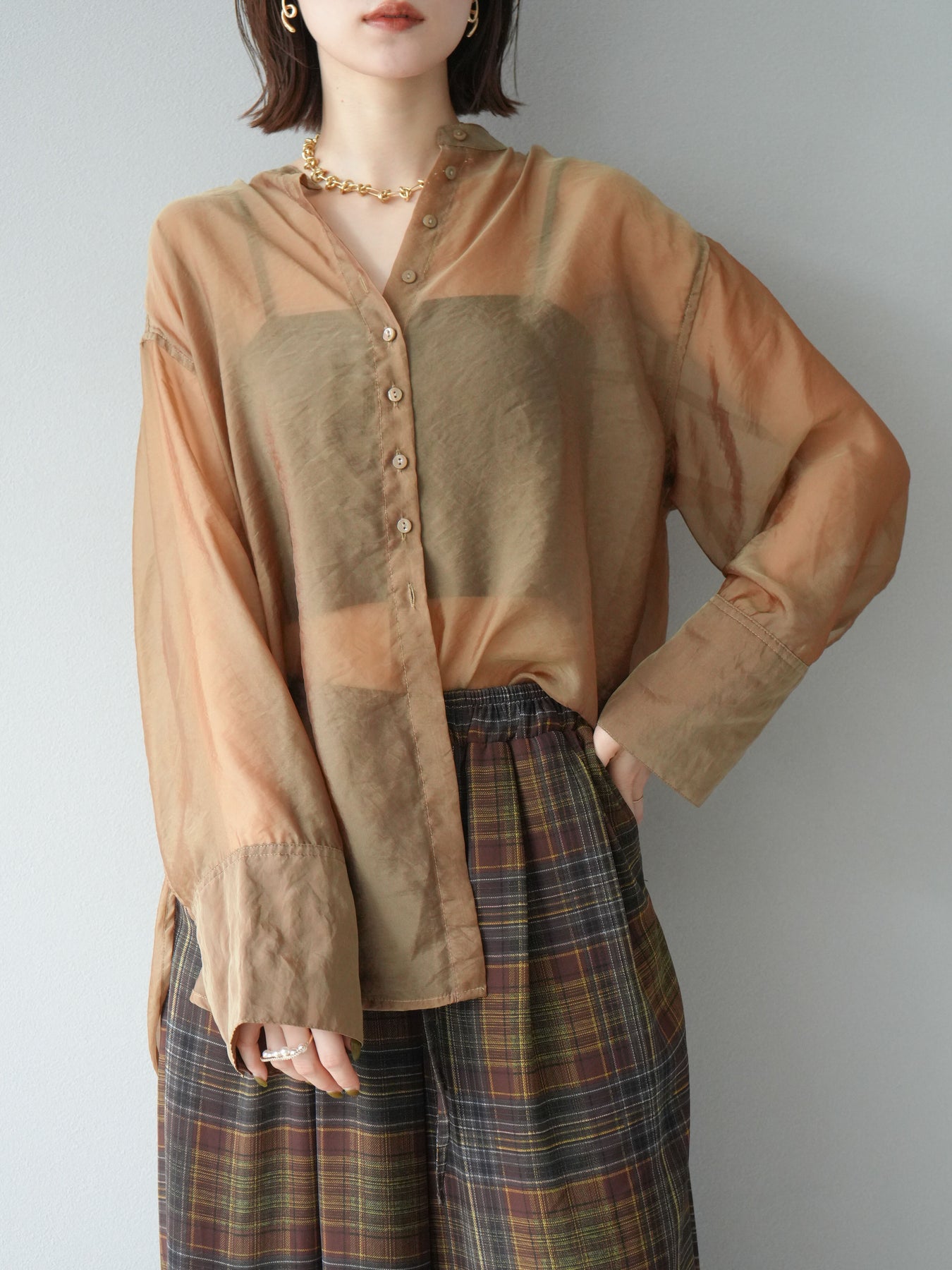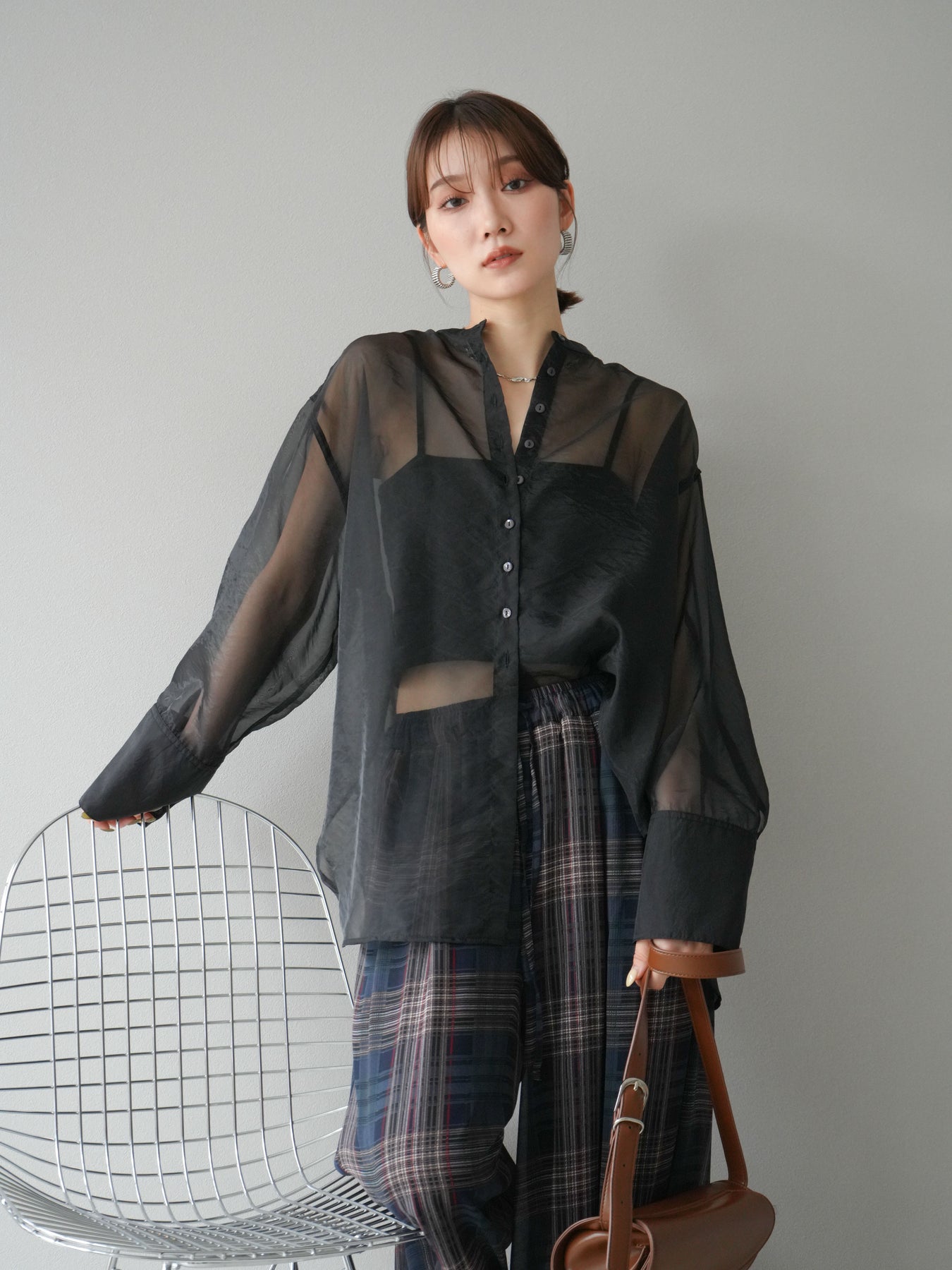 這款立領襯衫採用略帶光澤的透視布料製成,優雅又時尚。輕盈的透明度營造出休閒的造型,使其成為可單獨穿著的點睛之筆。 略長的長度和寬鬆的廓形,方便塞進或放出褲腰,打造均衡的造型。袖口收褶設計,更添一絲女性柔和。 這是一件用途極為廣泛的單品,可以根據您使用的內衣和分層以不同的方式穿著。 ※除下裝、吊帶背心(內衣)以外的商品均不含內衣。