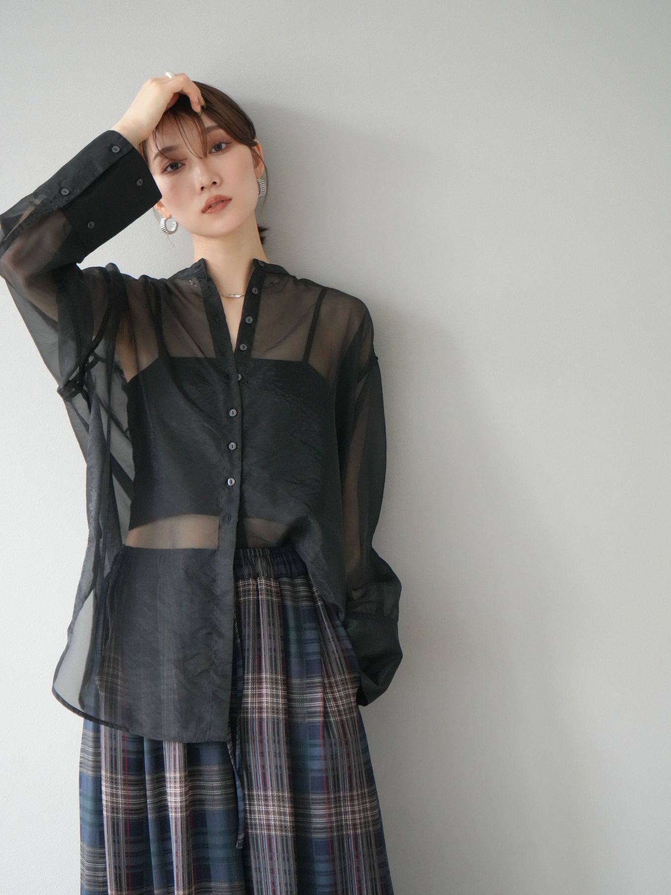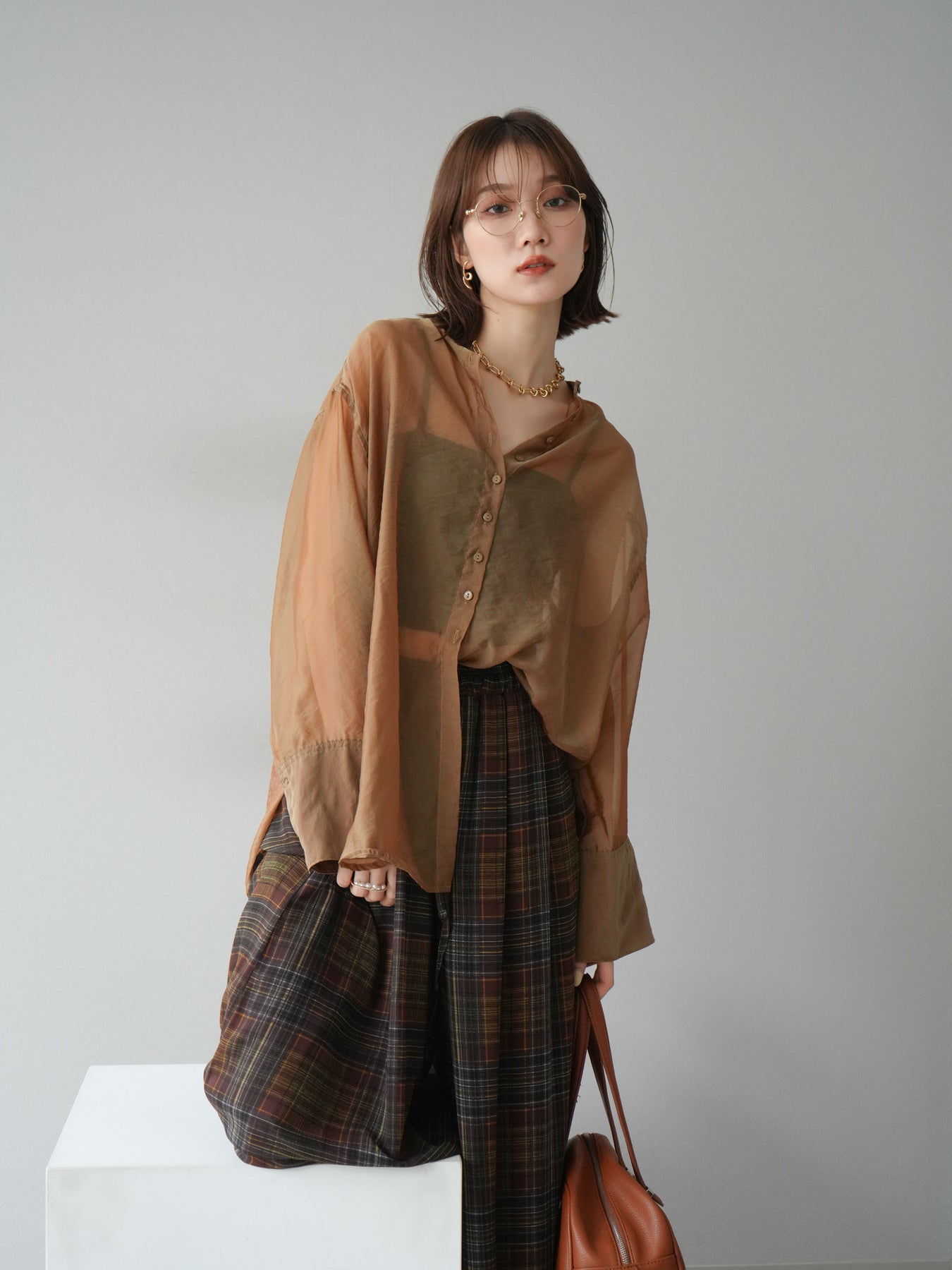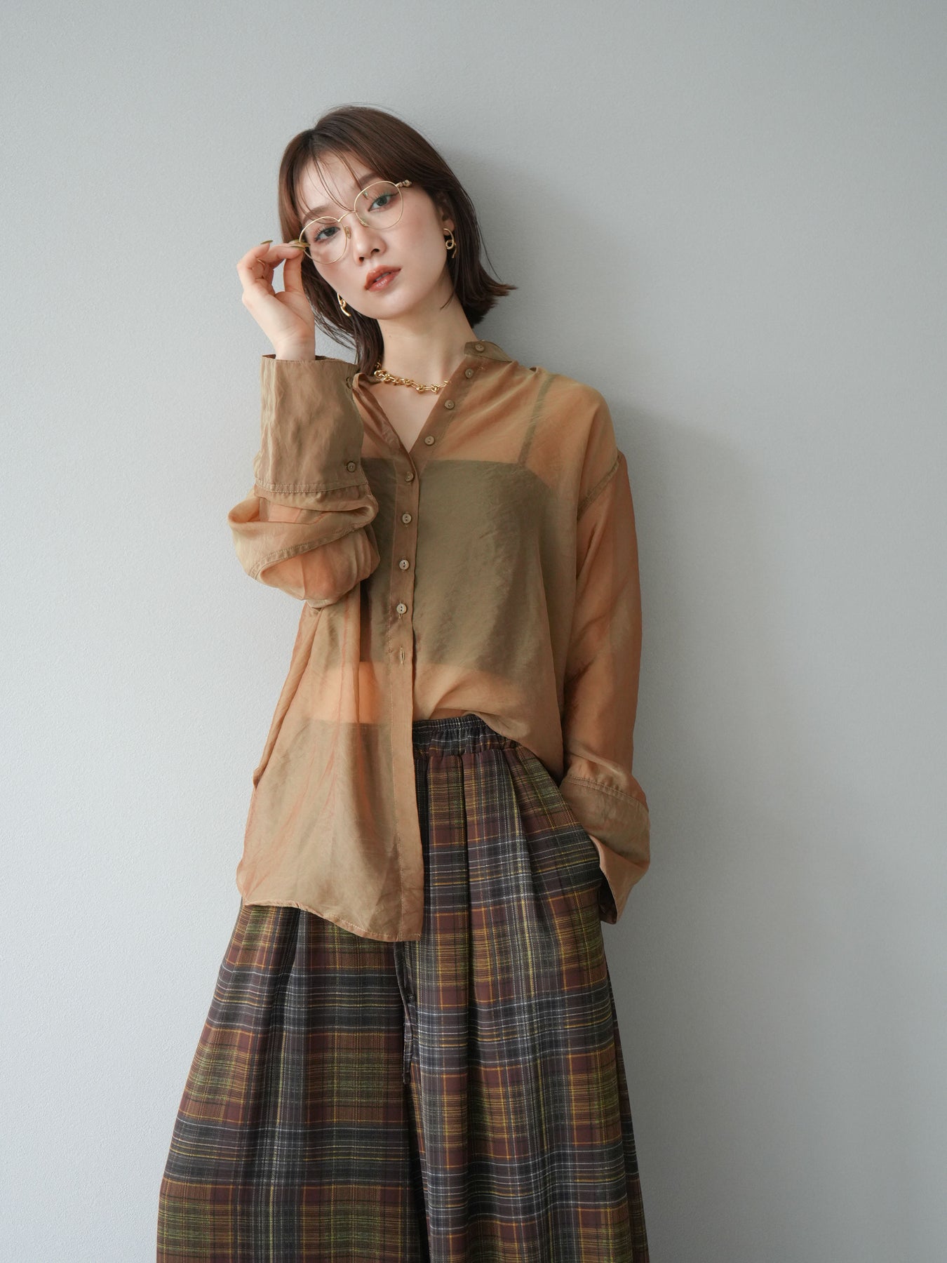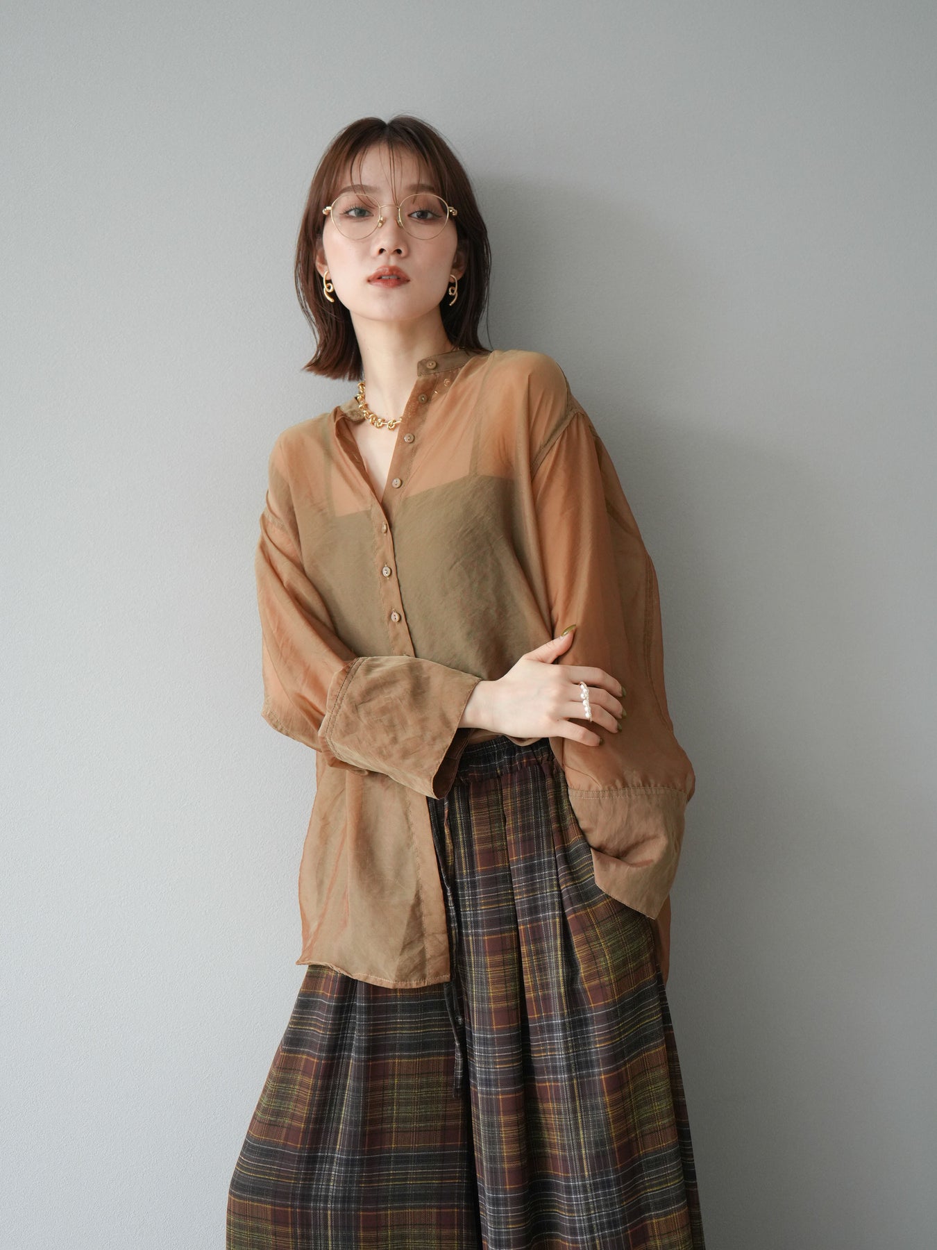 這款立領襯衫採用略帶光澤的透視布料製成,優雅又時尚。輕盈的透明度營造出休閒的造型,使其成為可單獨穿著的點睛之筆。 略長的長度和寬鬆的廓形,方便塞進或放出褲腰,打造均衡的造型。袖口收褶設計,更添一絲女性柔和。 這是一件用途極為廣泛的單品,可以根據您使用的內衣和分層以不同的方式穿著。 ※除下裝、吊帶背心(內衣)以外的商品均不含內衣。