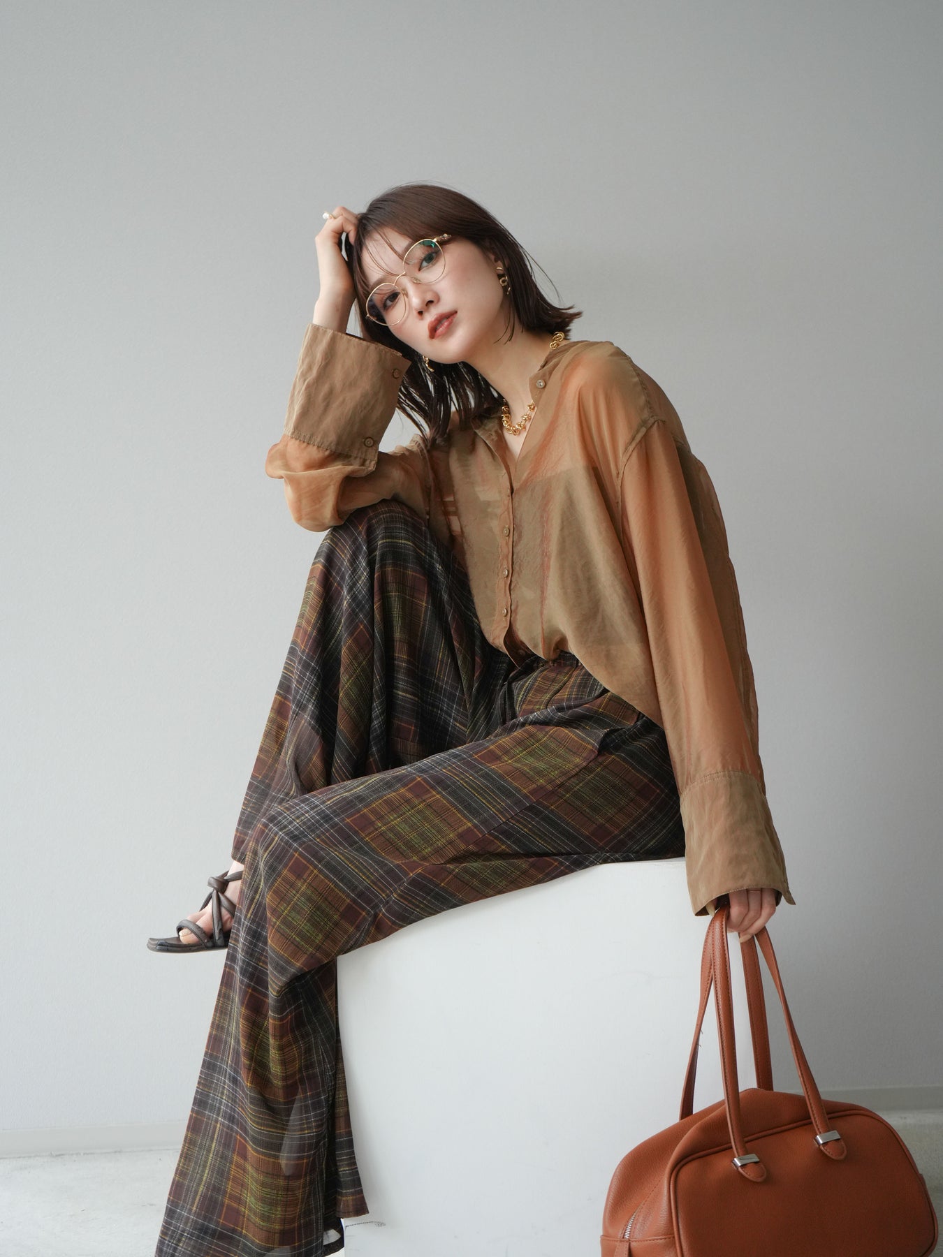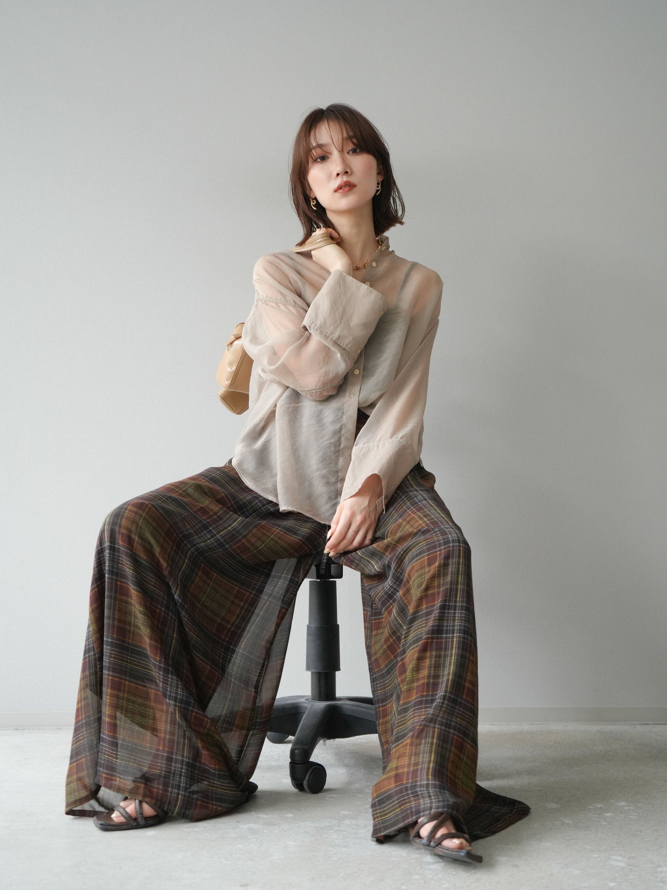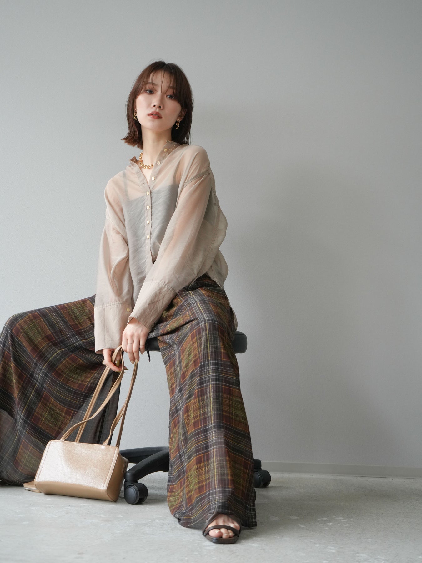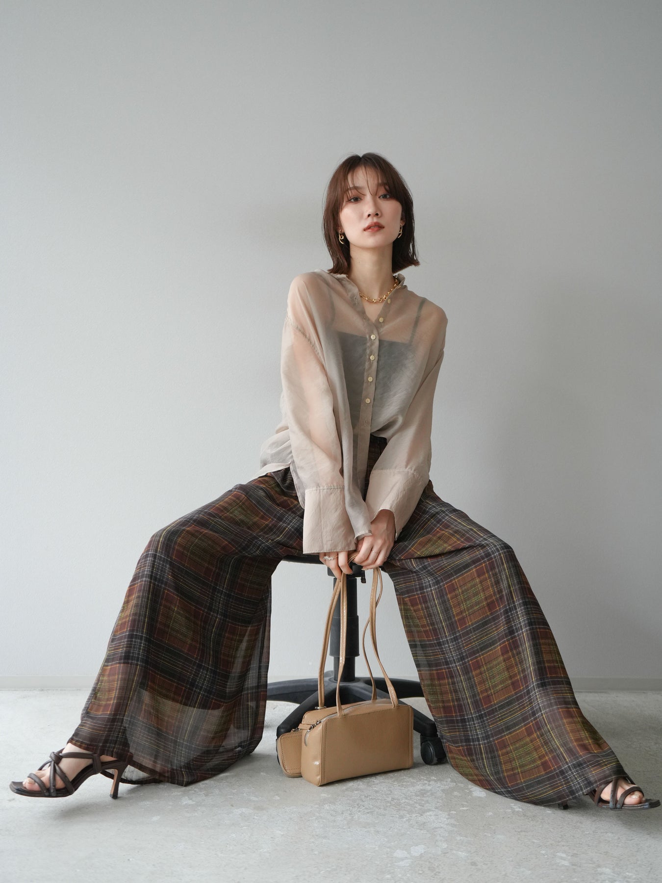 這款寬鬆褲休閒成熟,深色格紋圖案搭配透視布料,更能襯托出季節的氛圍。適度的透明度營造出輕盈飄逸的感覺,是一條既能提升時尚感又不失休閒感的褲子。 腰部採用全彈性設計,並配有抽繩,穿著舒適。布料厚實,垂墜感十足,讓您隨動作優雅擺動。 這是一款引人注目的單品,只需搭配一件簡單的上衣即可為您的服裝增添亮點。
