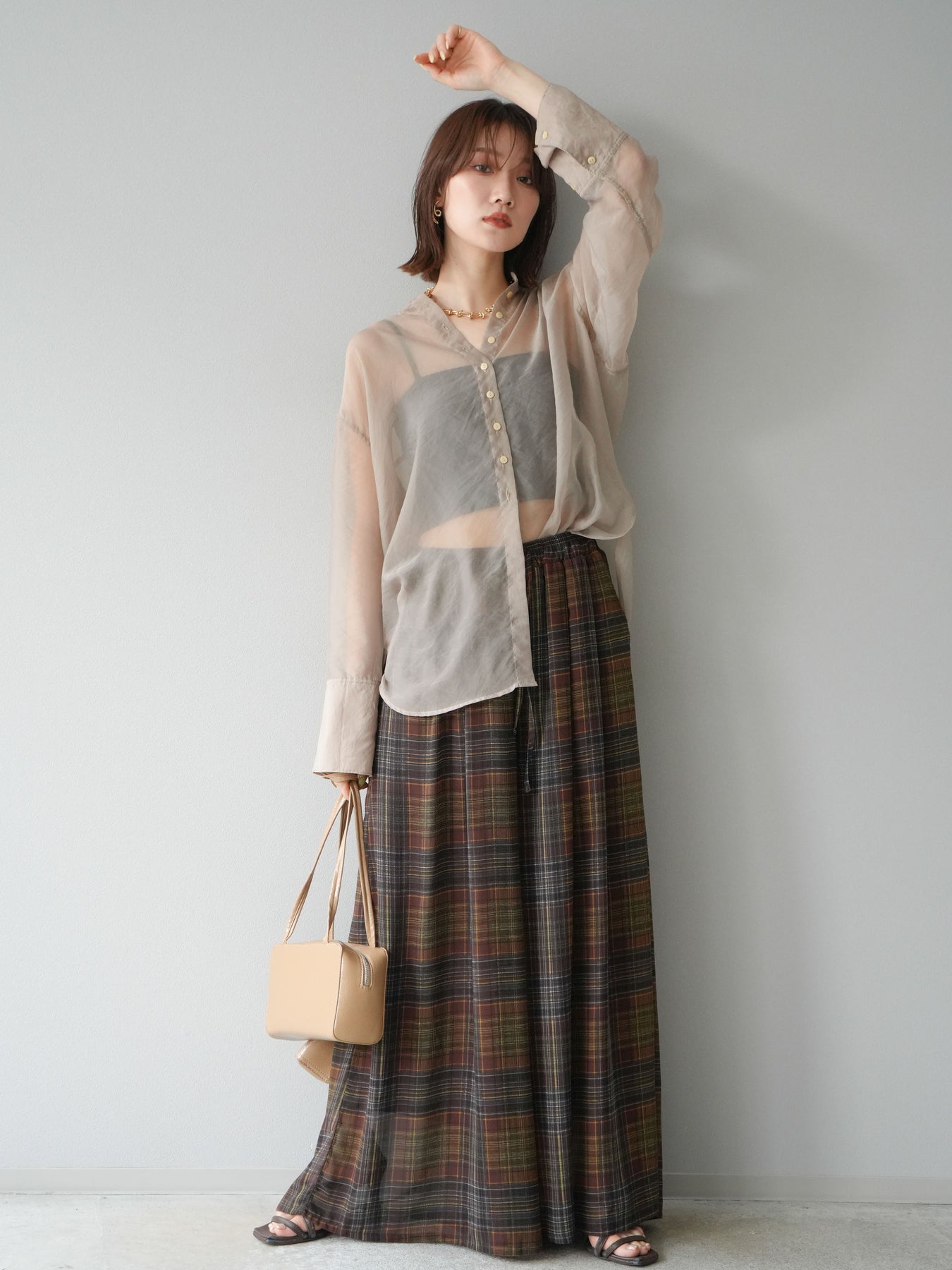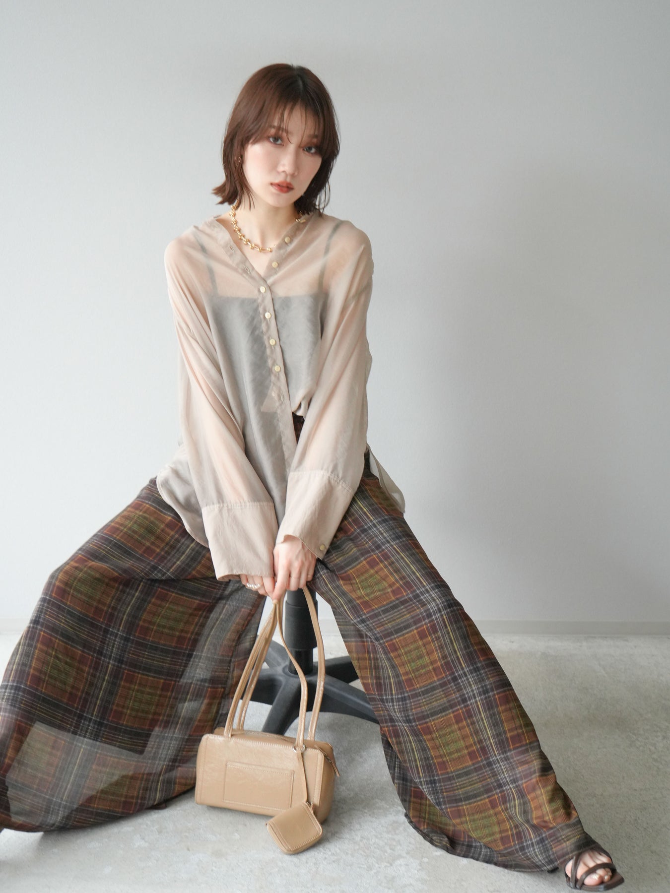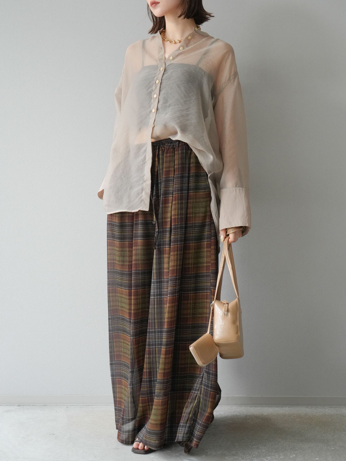 這款寬鬆褲休閒成熟,深色格紋圖案搭配透視布料,更能襯托出季節的氛圍。適度的透明度營造出輕盈飄逸的感覺,是一條既能提升時尚感又不失休閒感的褲子。 腰部採用全彈性設計,並配有抽繩,穿著舒適。布料厚實,垂墜感十足,讓您隨動作優雅擺動。 這是一款引人注目的單品,只需搭配一件簡單的上衣即可為您的服裝增添亮點。