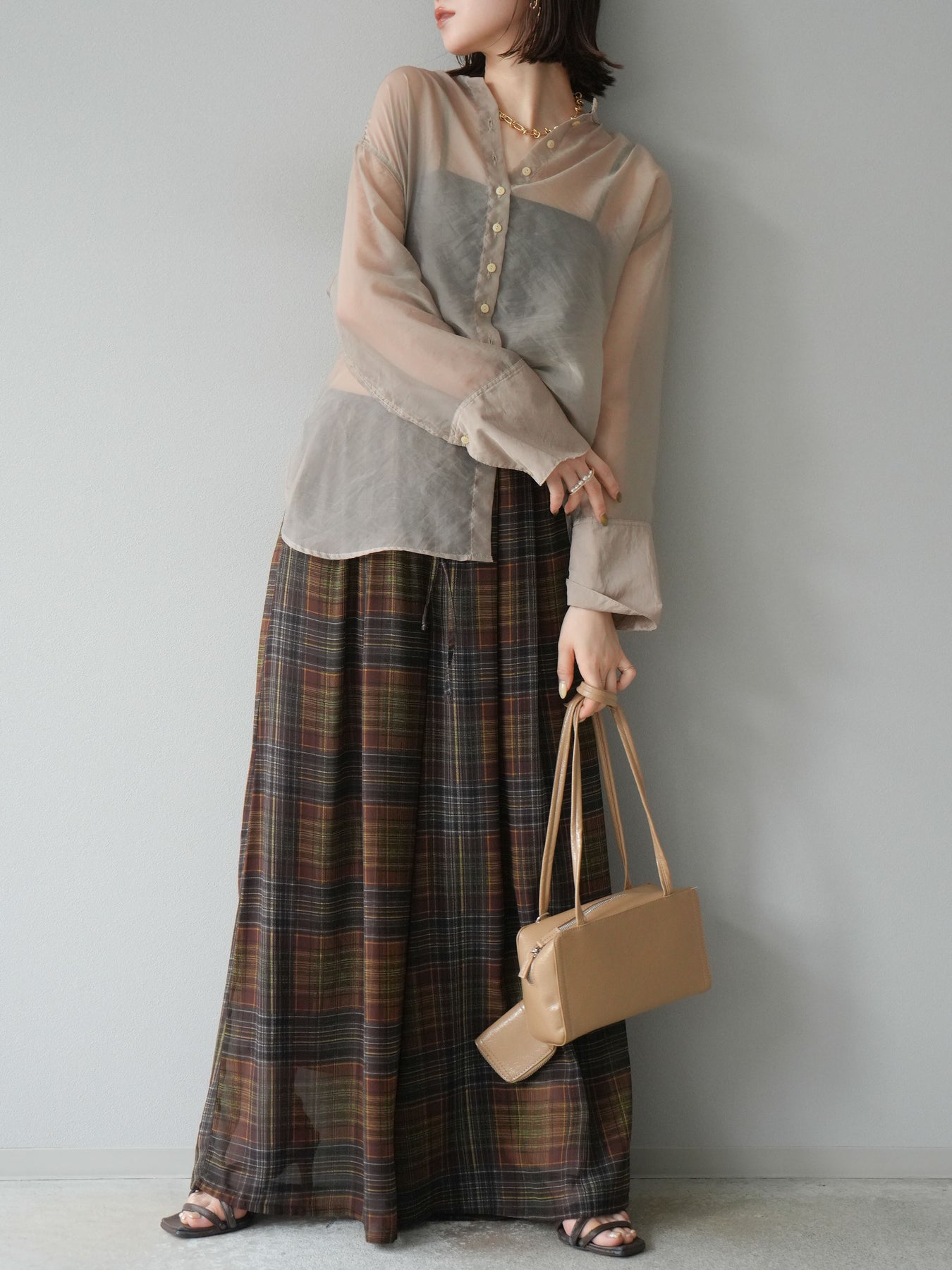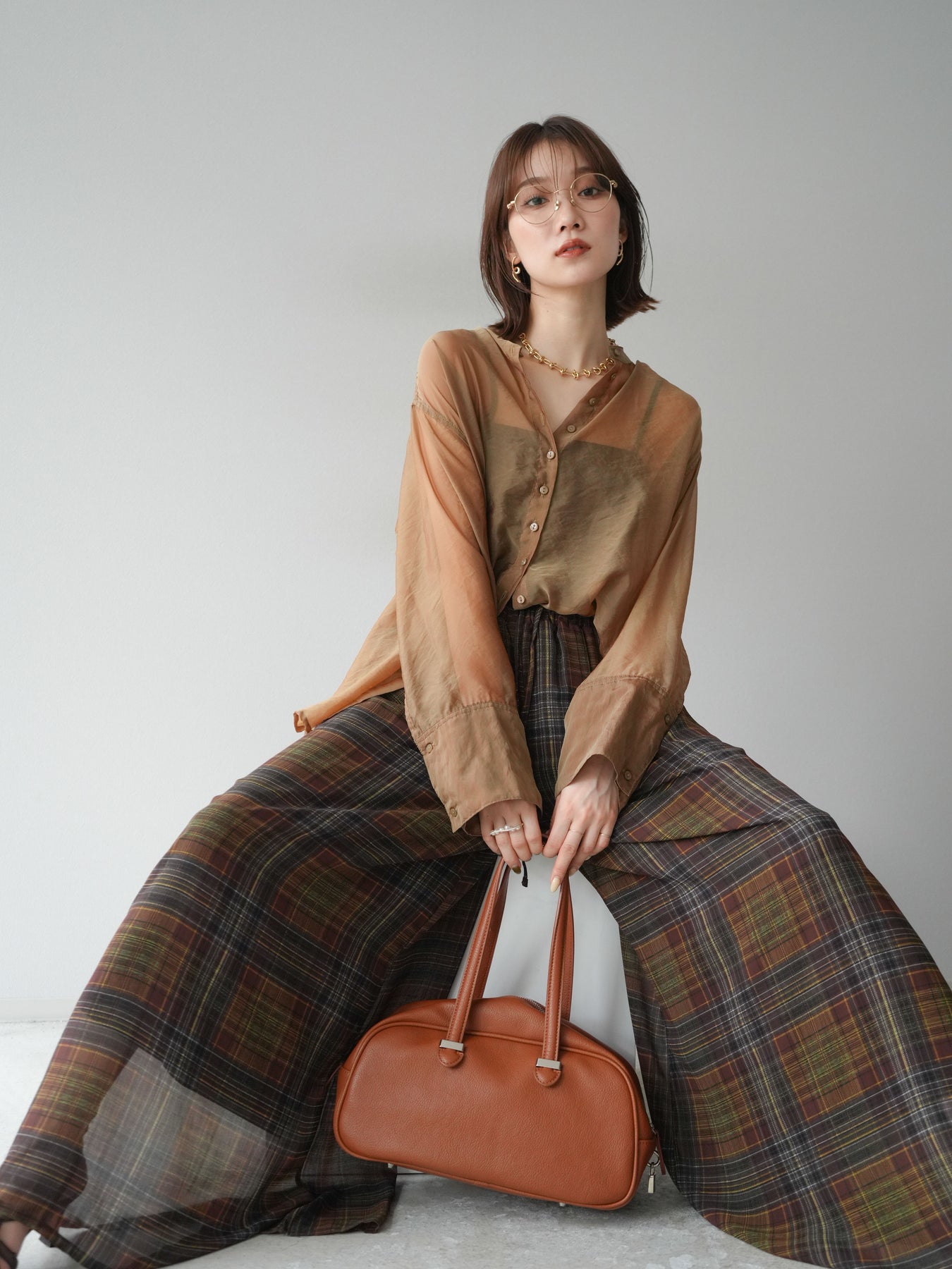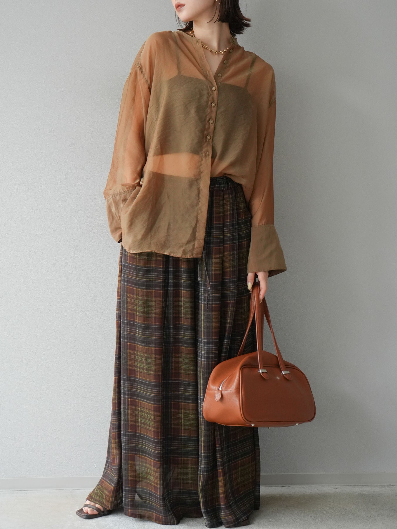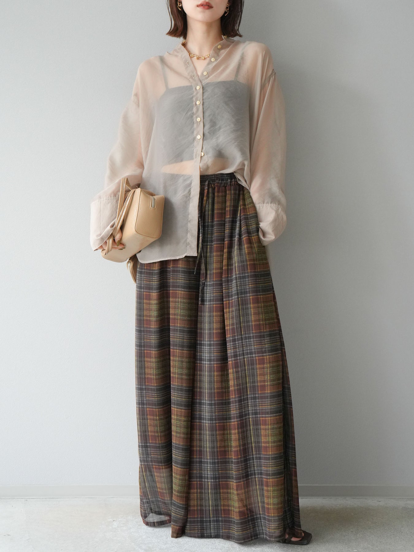 這款寬鬆褲休閒成熟,深色格紋圖案搭配透視布料,更能襯托出季節的氛圍。適度的透明度營造出輕盈飄逸的感覺,是一條既能提升時尚感又不失休閒感的褲子。 腰部採用全彈性設計,並配有抽繩,穿著舒適。布料厚實,垂墜感十足,讓您隨動作優雅擺動。 這是一款引人注目的單品,只需搭配一件簡單的上衣即可為您的服裝增添亮點。