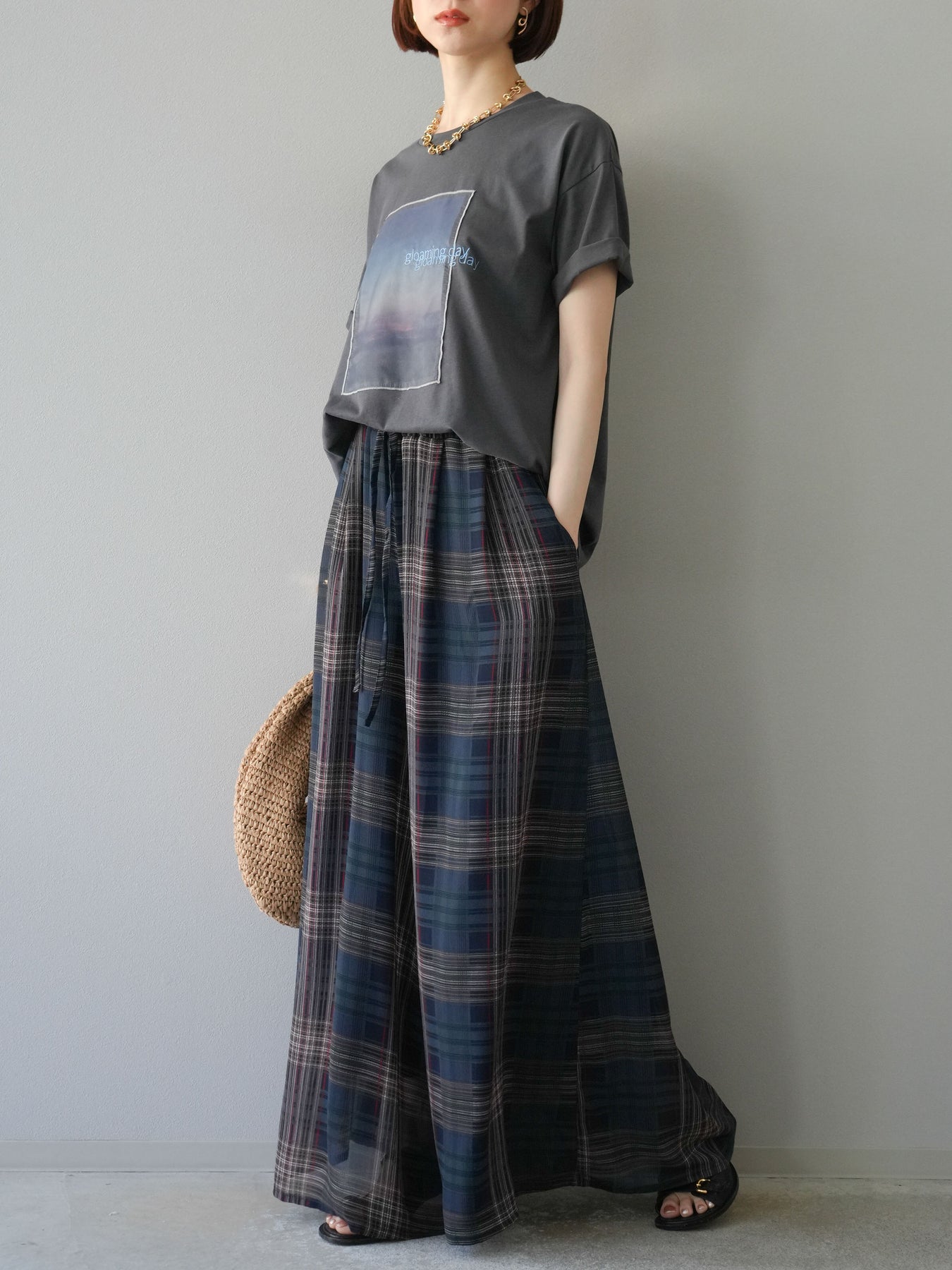 這款寬鬆褲休閒成熟,深色格紋圖案搭配透視布料,更添季節氣息。適度的透明度營造出輕盈飄逸的視覺效果,讓您在穿著時既時尚又不失休閒感。 腰部採用全彈性設計,並配有抽繩,穿著舒適。布料厚實,垂墜感十足,讓您隨動作優雅擺動。 這是一款引人注目的單品,只需搭配一件簡單的上衣即可為您的服裝增添亮點。
