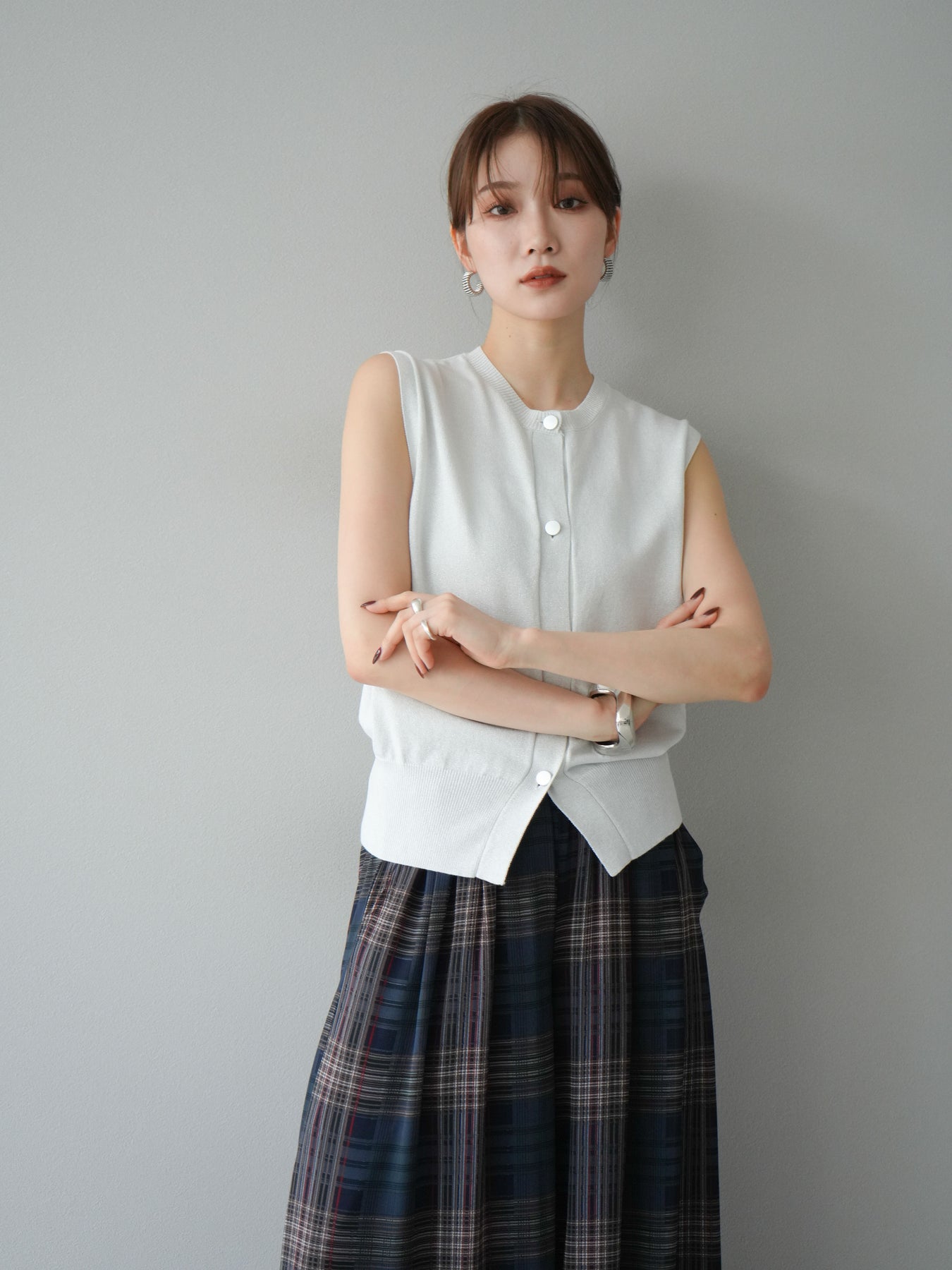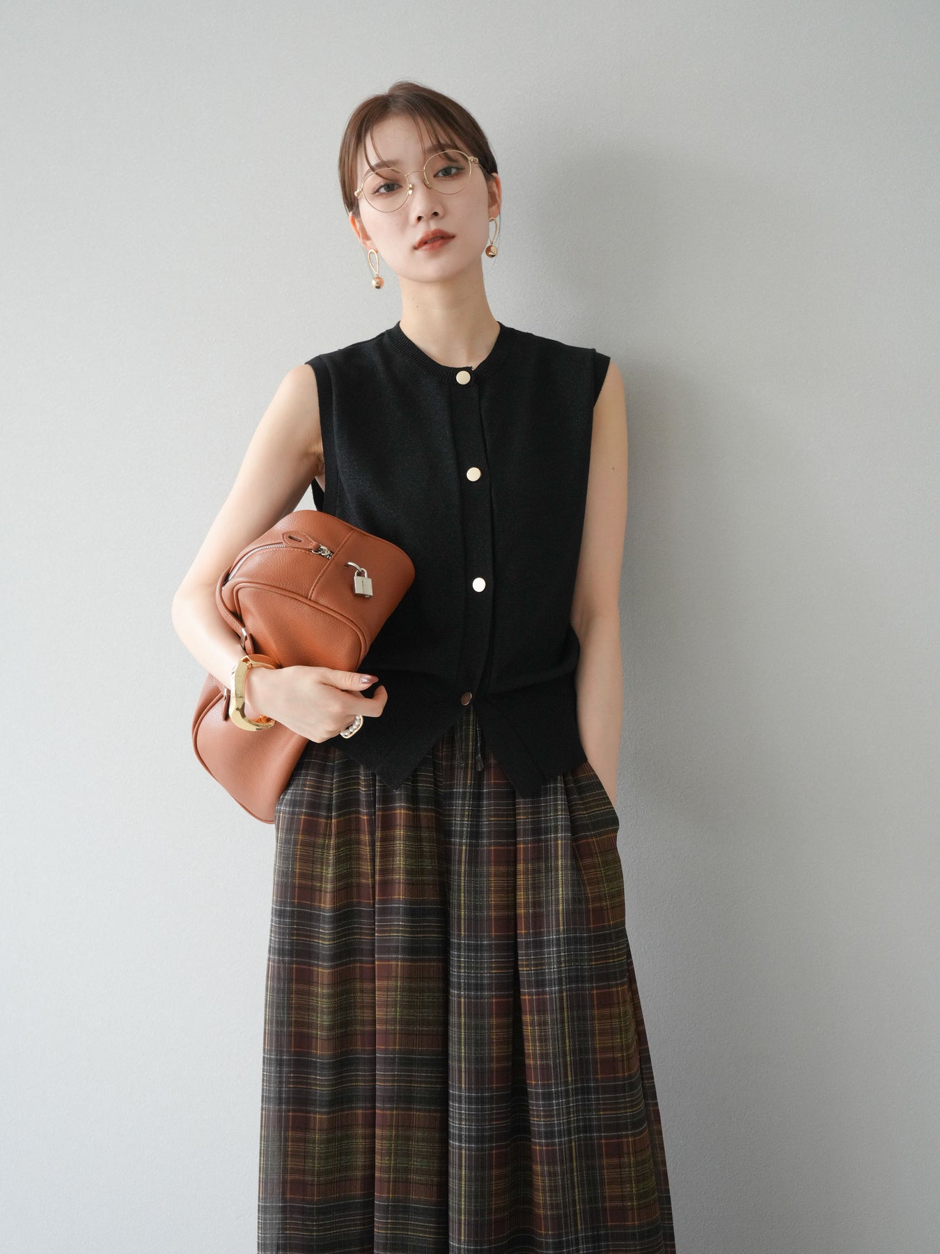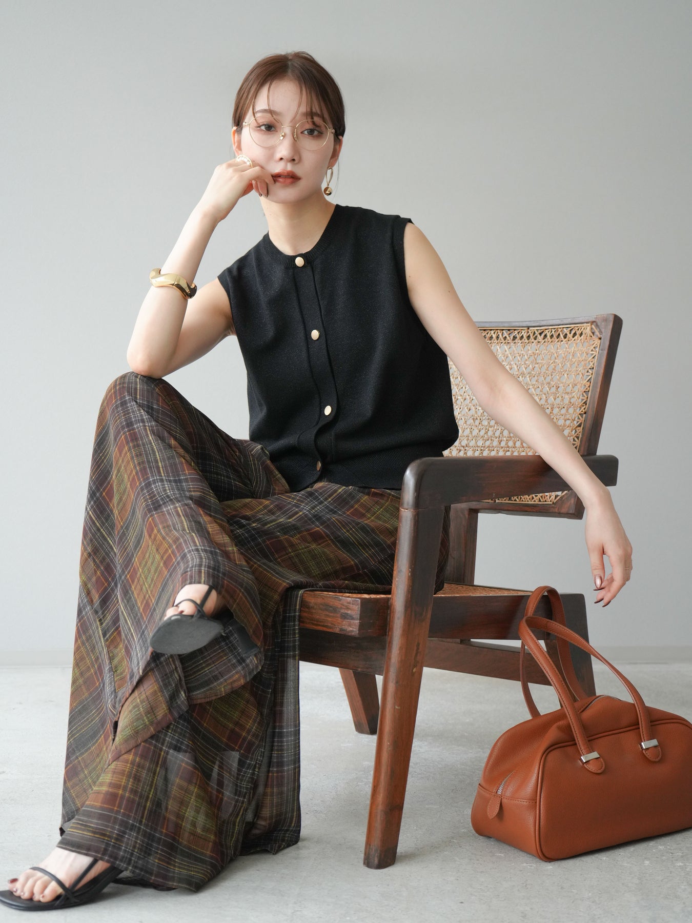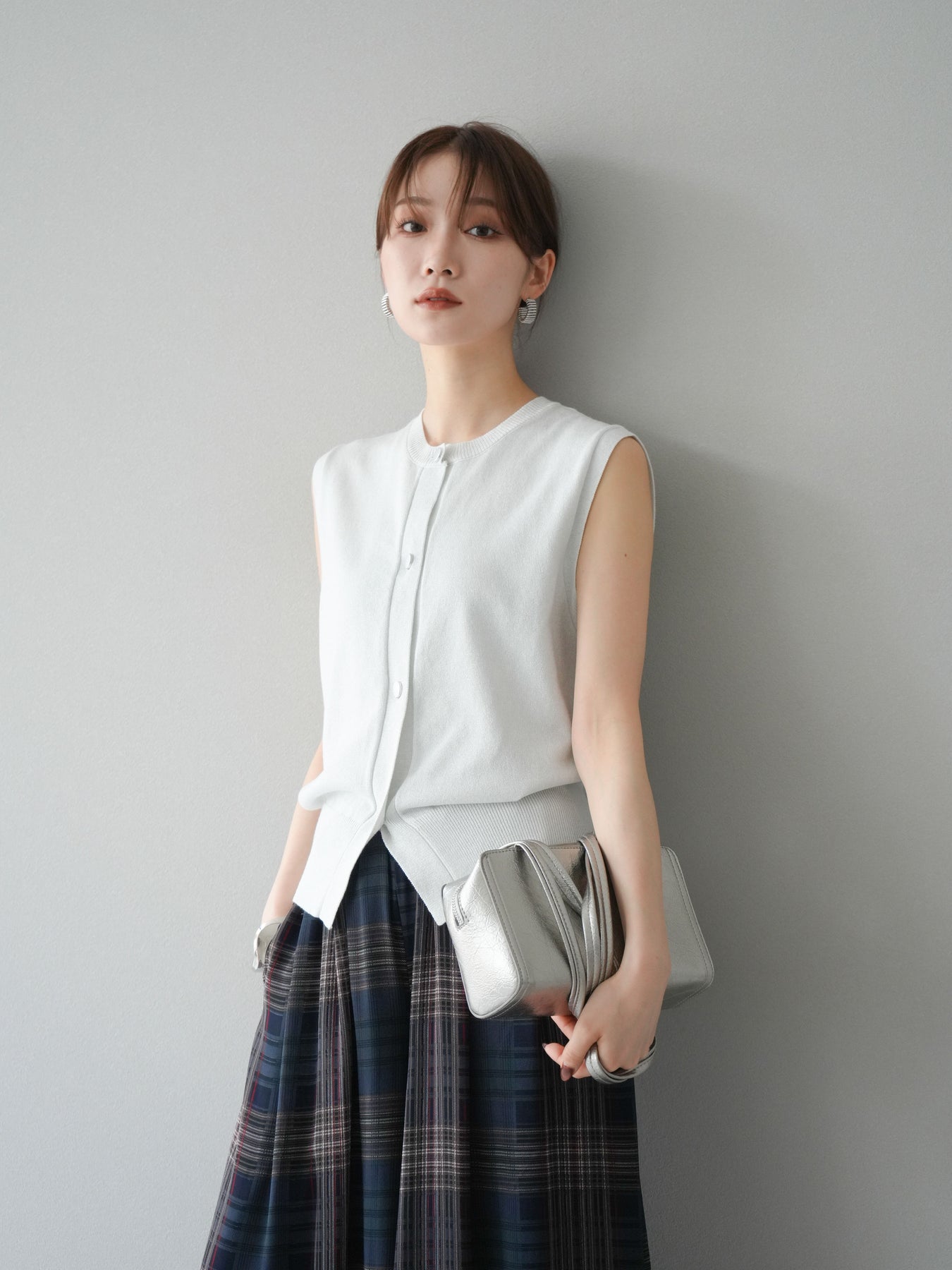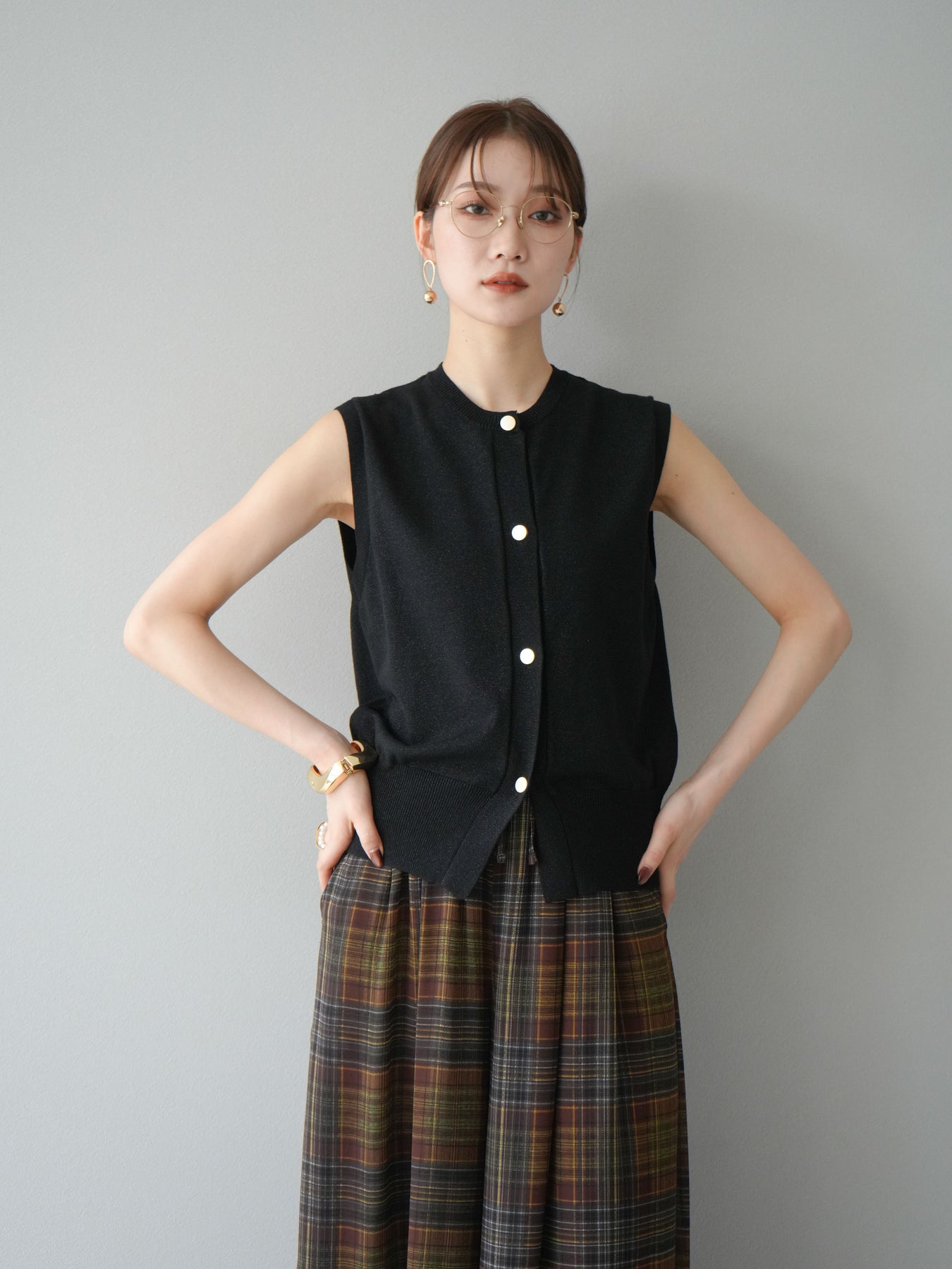 無袖針織背心,帶有微妙的閃光,閃耀優雅。 正面的金屬紐扣增添了經典的點綴,營造出簡約優雅的外觀。 它由柔軟的針織材料製成,可以單獨穿著,也可以與襯衫或剪裁上衣搭配。 該設計允許您將其在前面敞開作為背心穿著,使其成為可以在任何季節穿著的多功能服裝。 ※除下裝、吊帶背心(內衣)以外的商品均不含內衣。