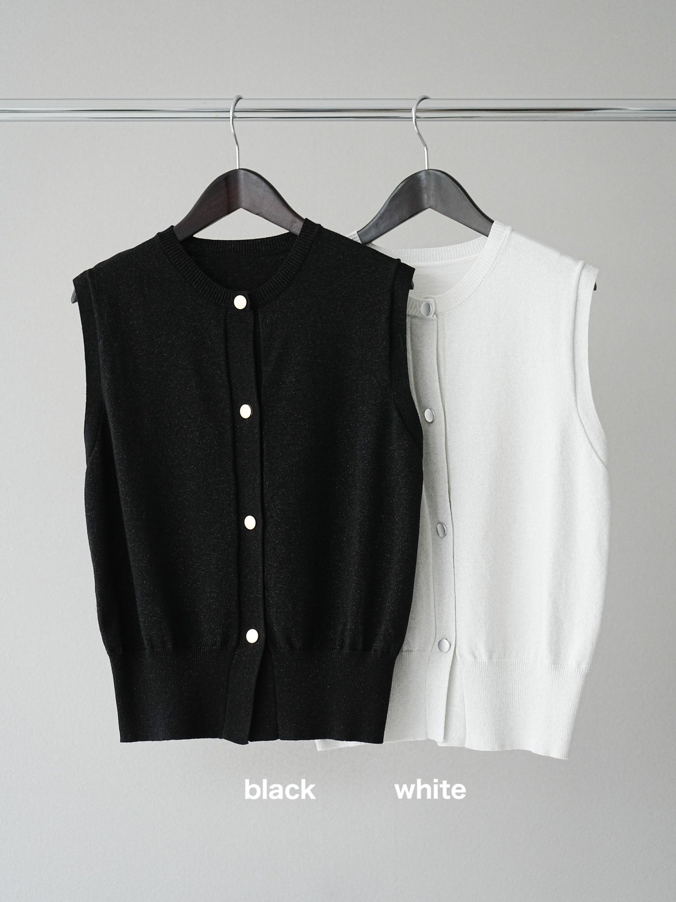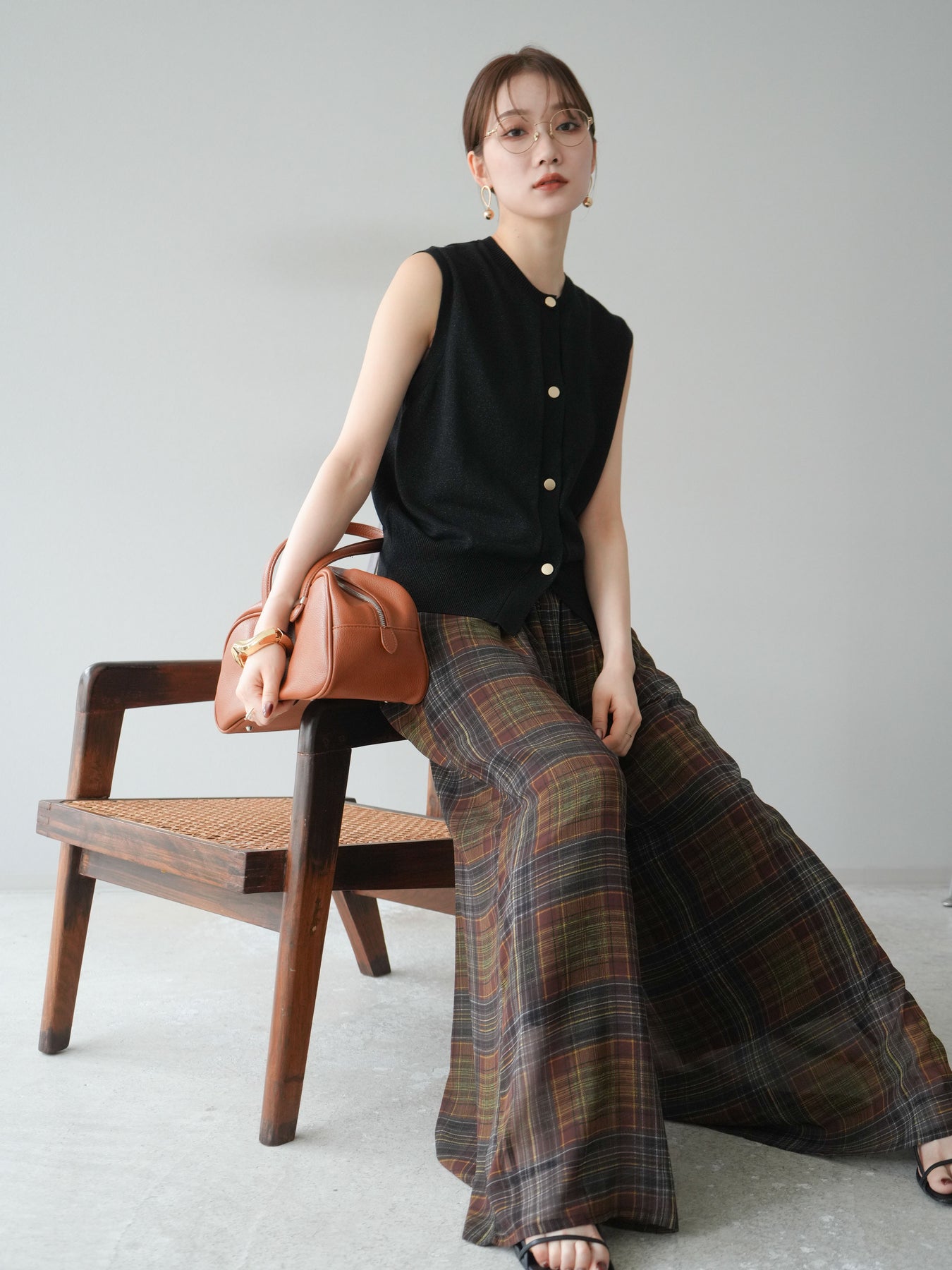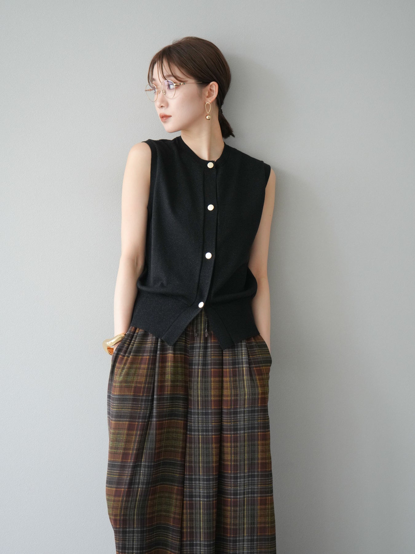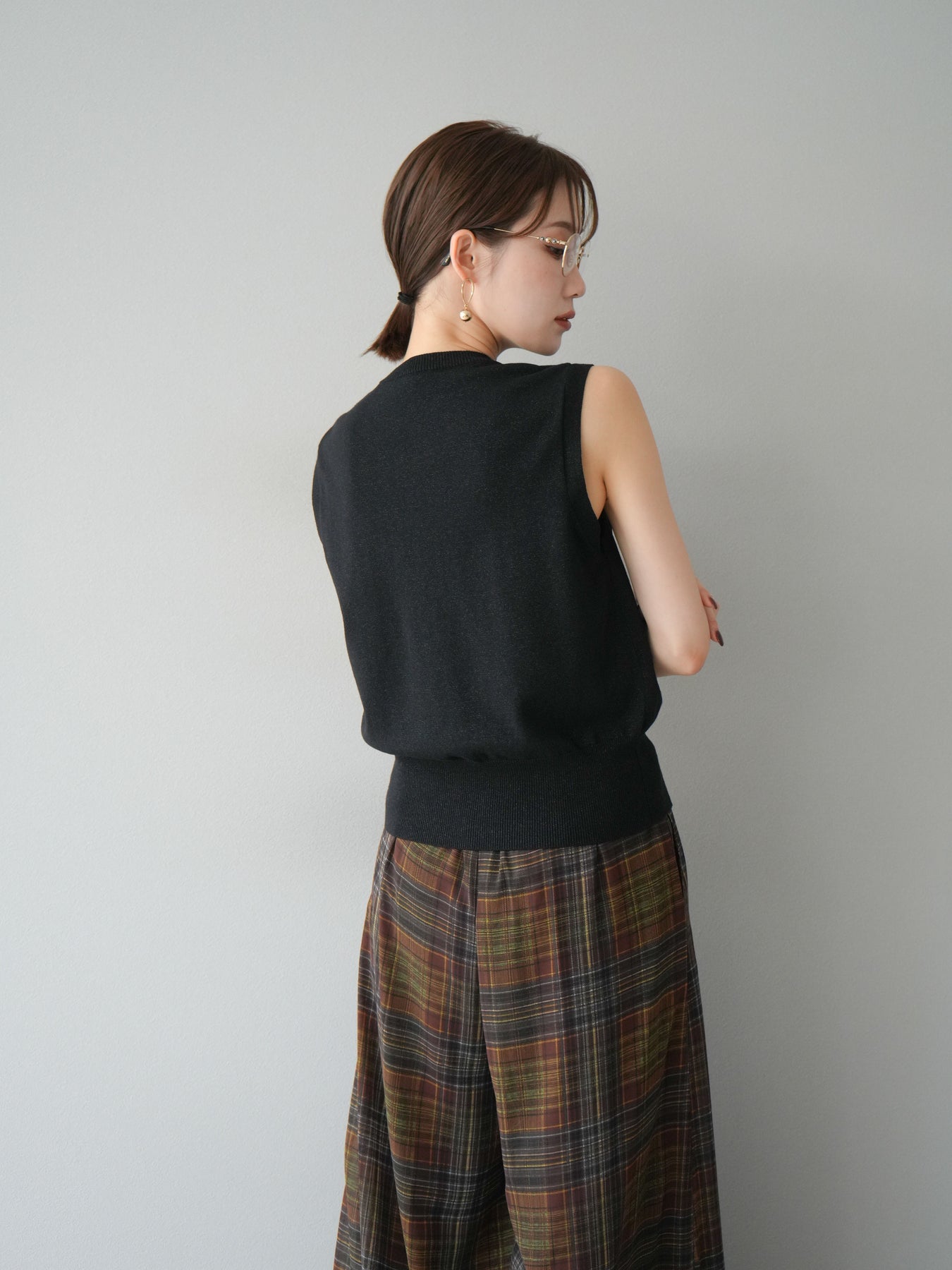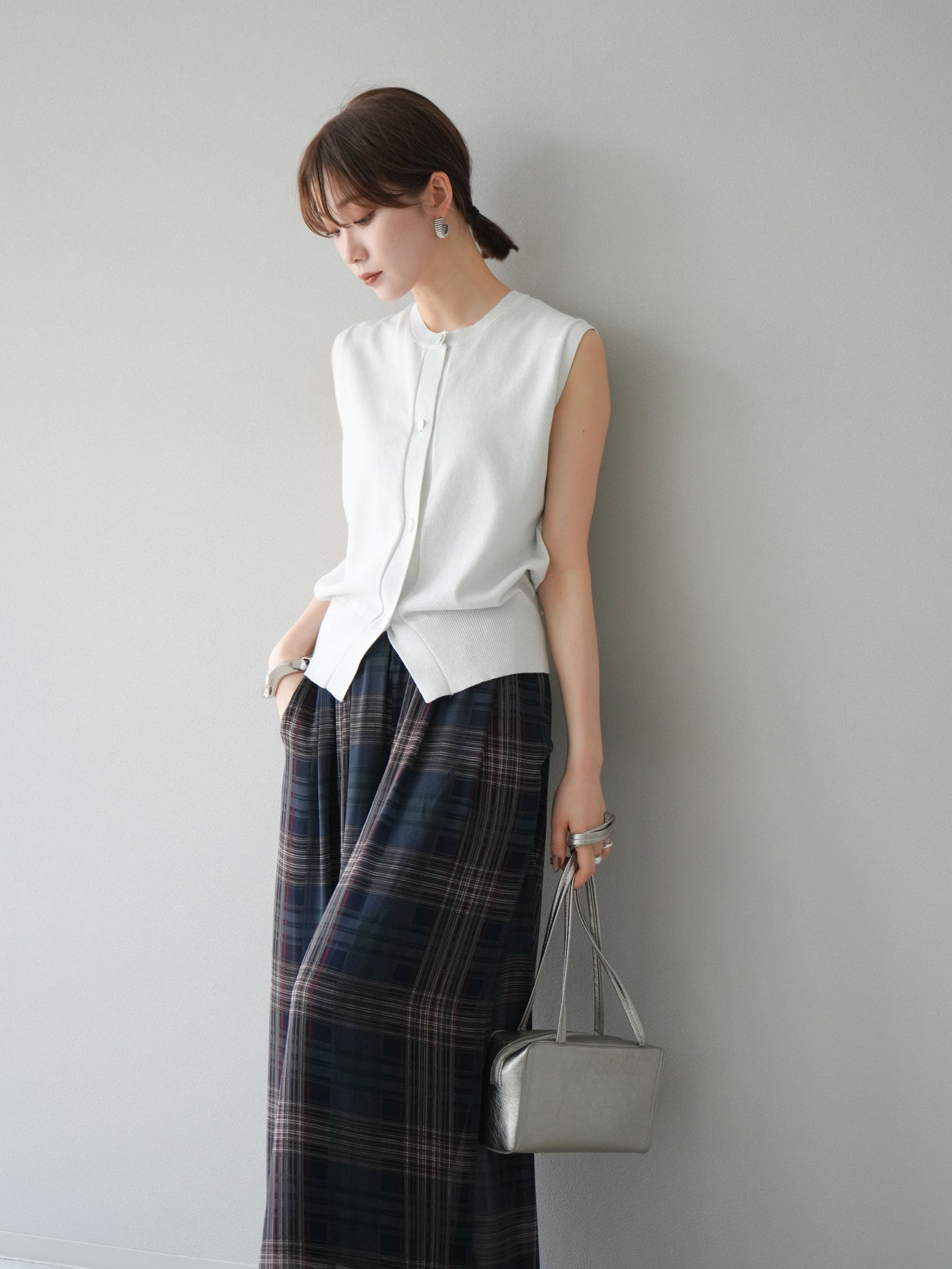 無袖針織背心,帶有微妙的閃光,閃耀優雅。 正面的金屬紐扣增添了經典的點綴,營造出簡約優雅的外觀。 它由柔軟的針織材料製成,可以單獨穿著,也可以與襯衫或剪裁上衣搭配。 該設計允許您將其在前面敞開作為背心穿著,使其成為可以在任何季節穿著的多功能服裝。 ※除下裝、吊帶背心(內衣)以外的商品均不含內衣。