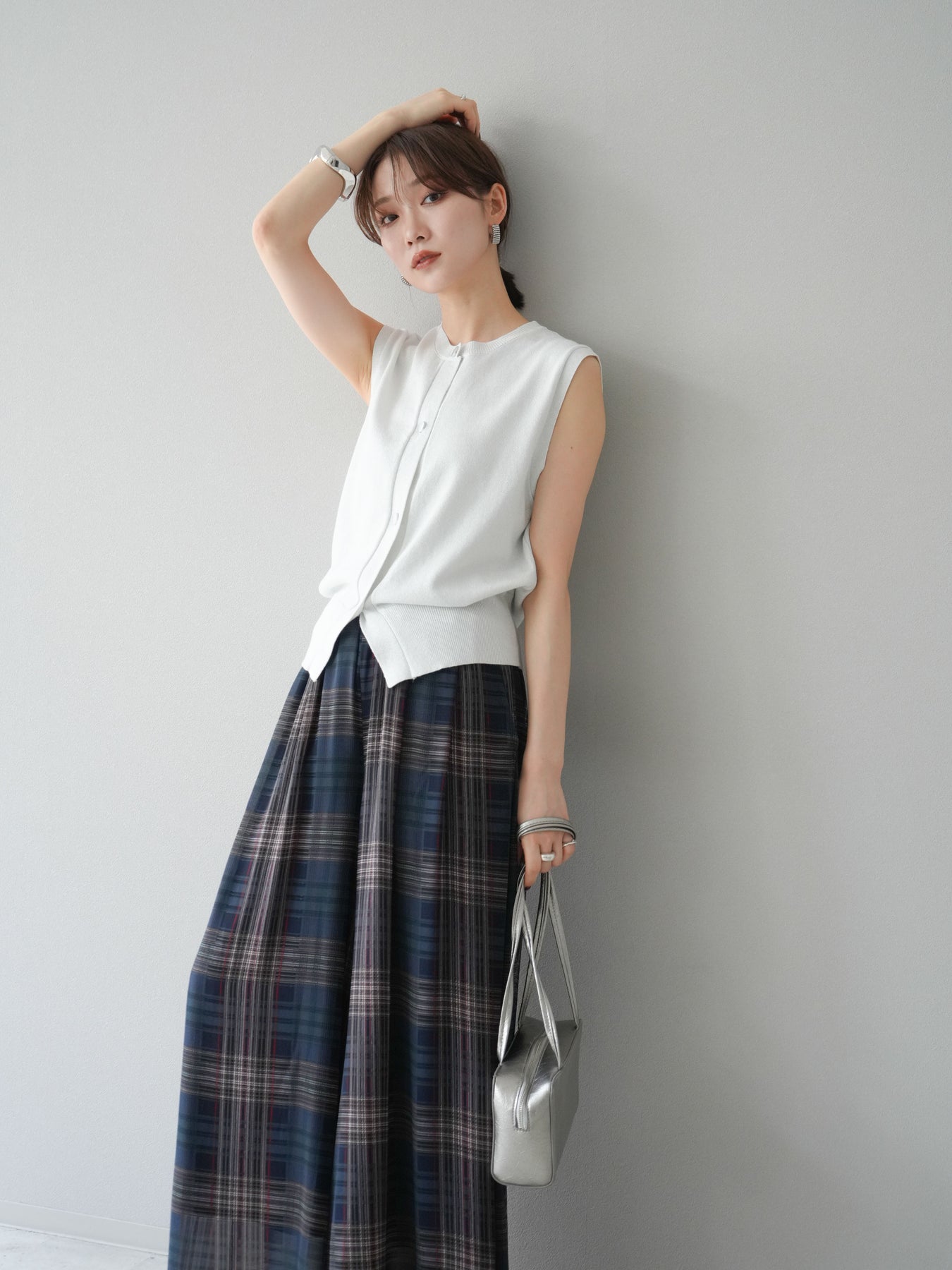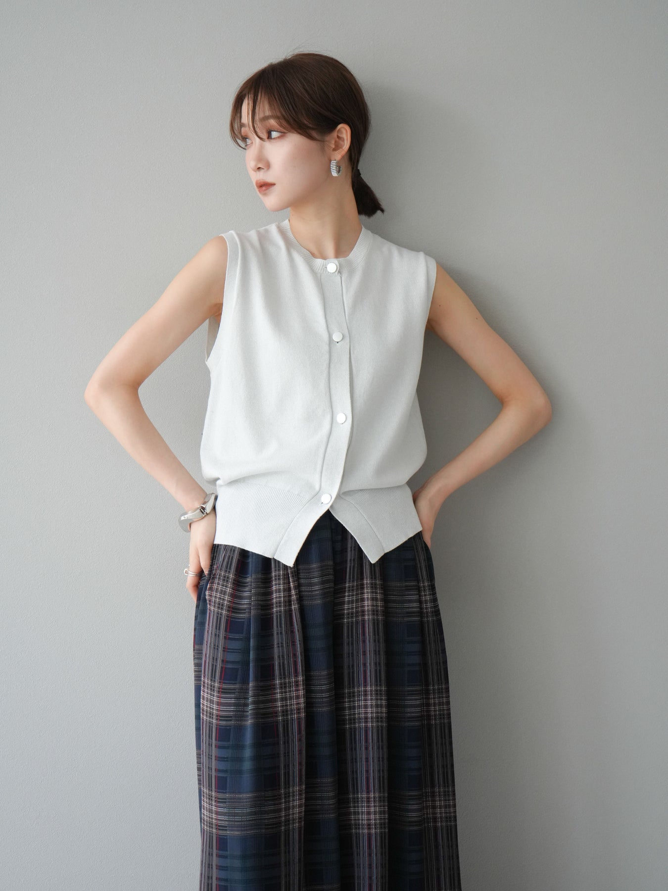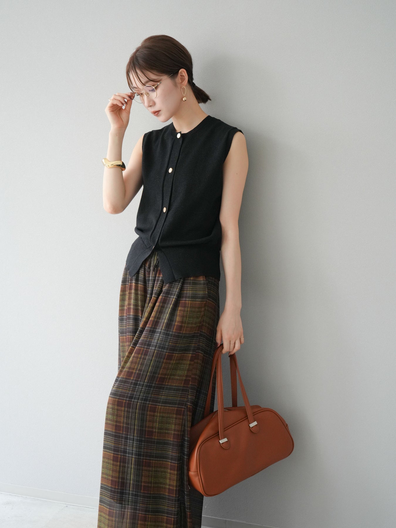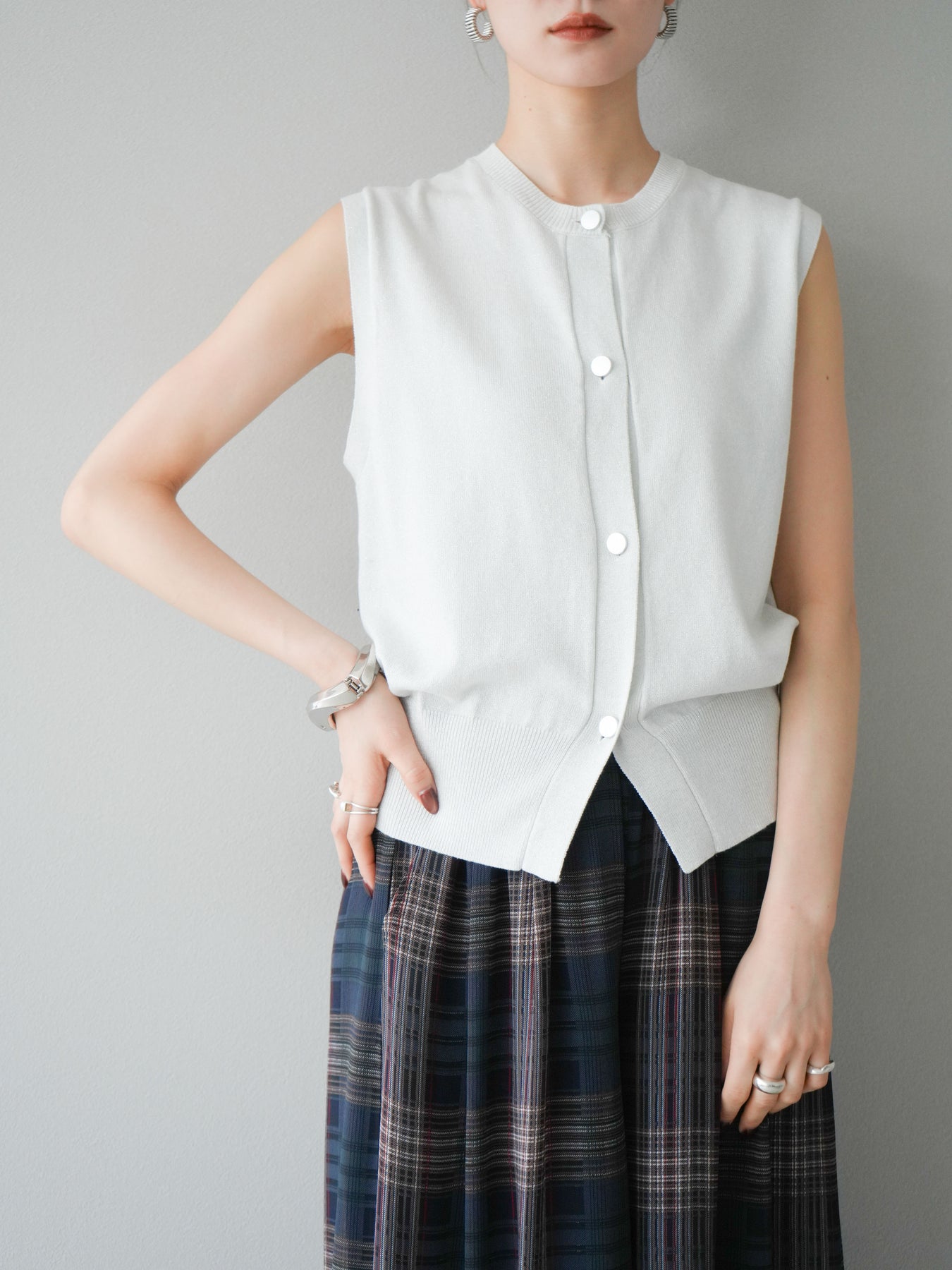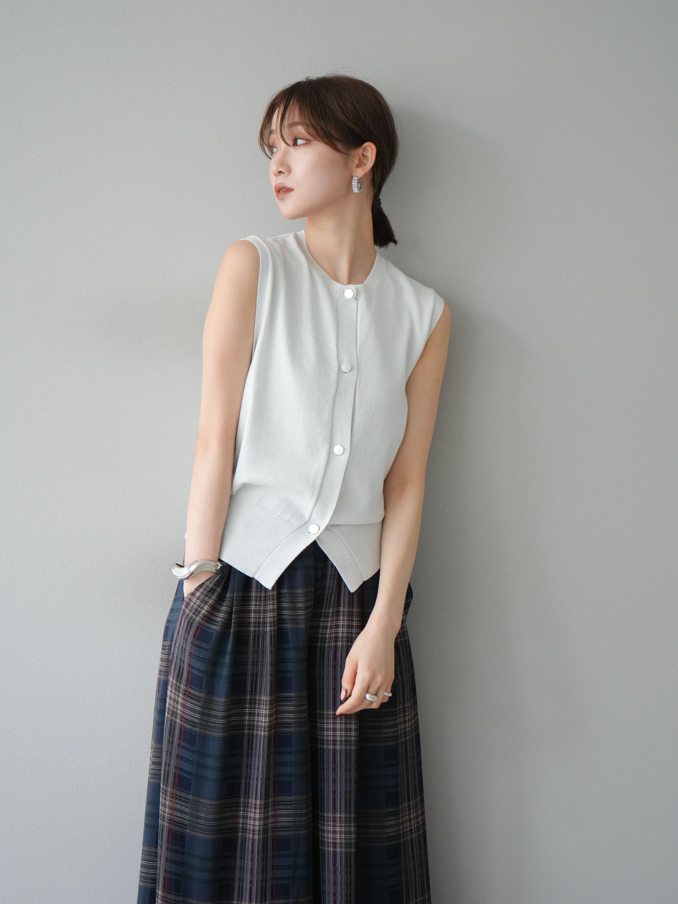 無袖針織背心,帶有微妙的閃光,閃耀優雅。 正面的金屬紐扣增添了經典的點綴,營造出簡約優雅的外觀。 它由柔軟的針織材料製成,可以單獨穿著,也可以與襯衫或剪裁上衣搭配。 該設計允許您將其在前面敞開作為背心穿著,使其成為可以在任何季節穿著的多功能服裝。 ※除下裝、吊帶背心(內衣)以外的商品均不含內衣。