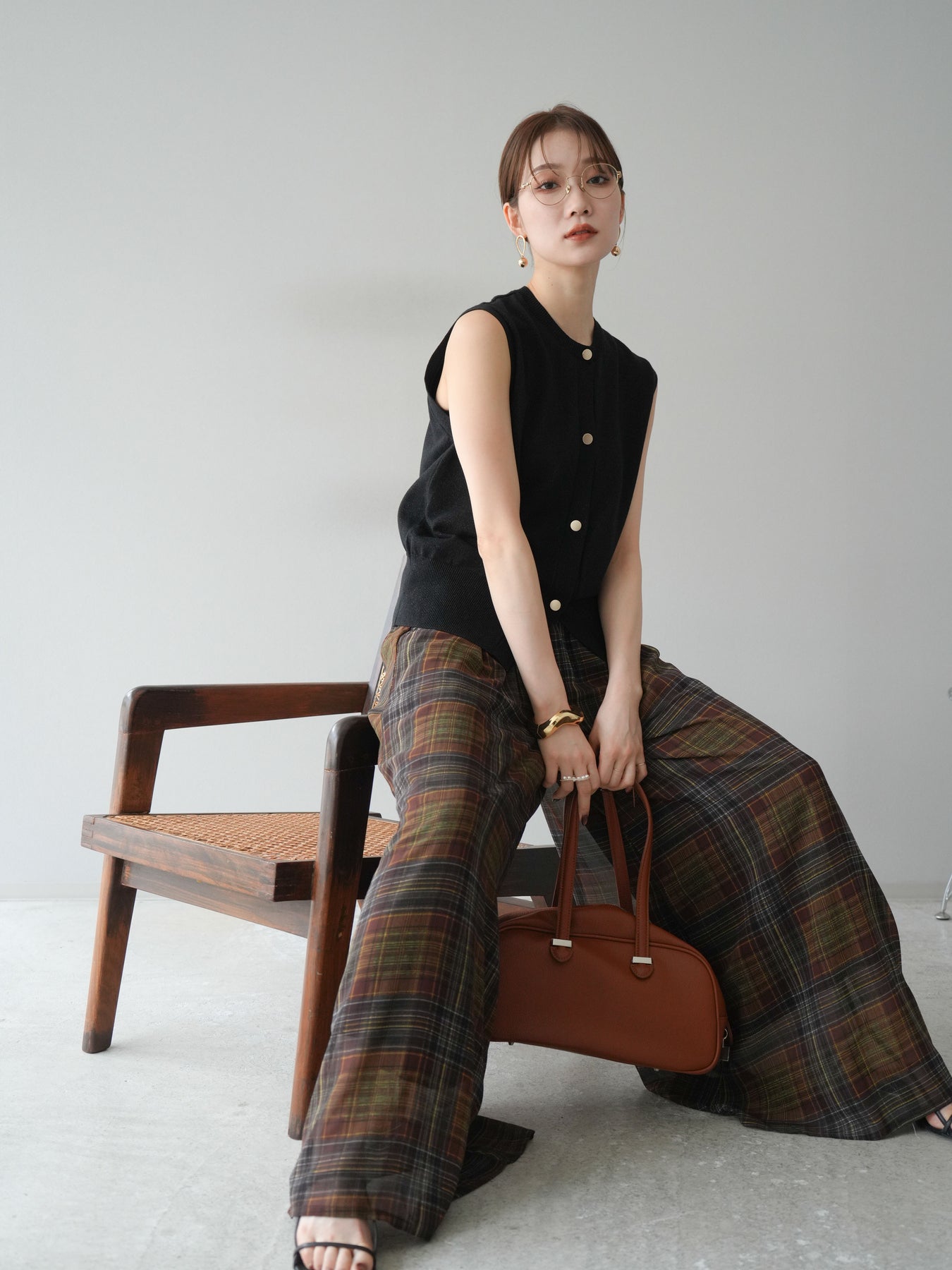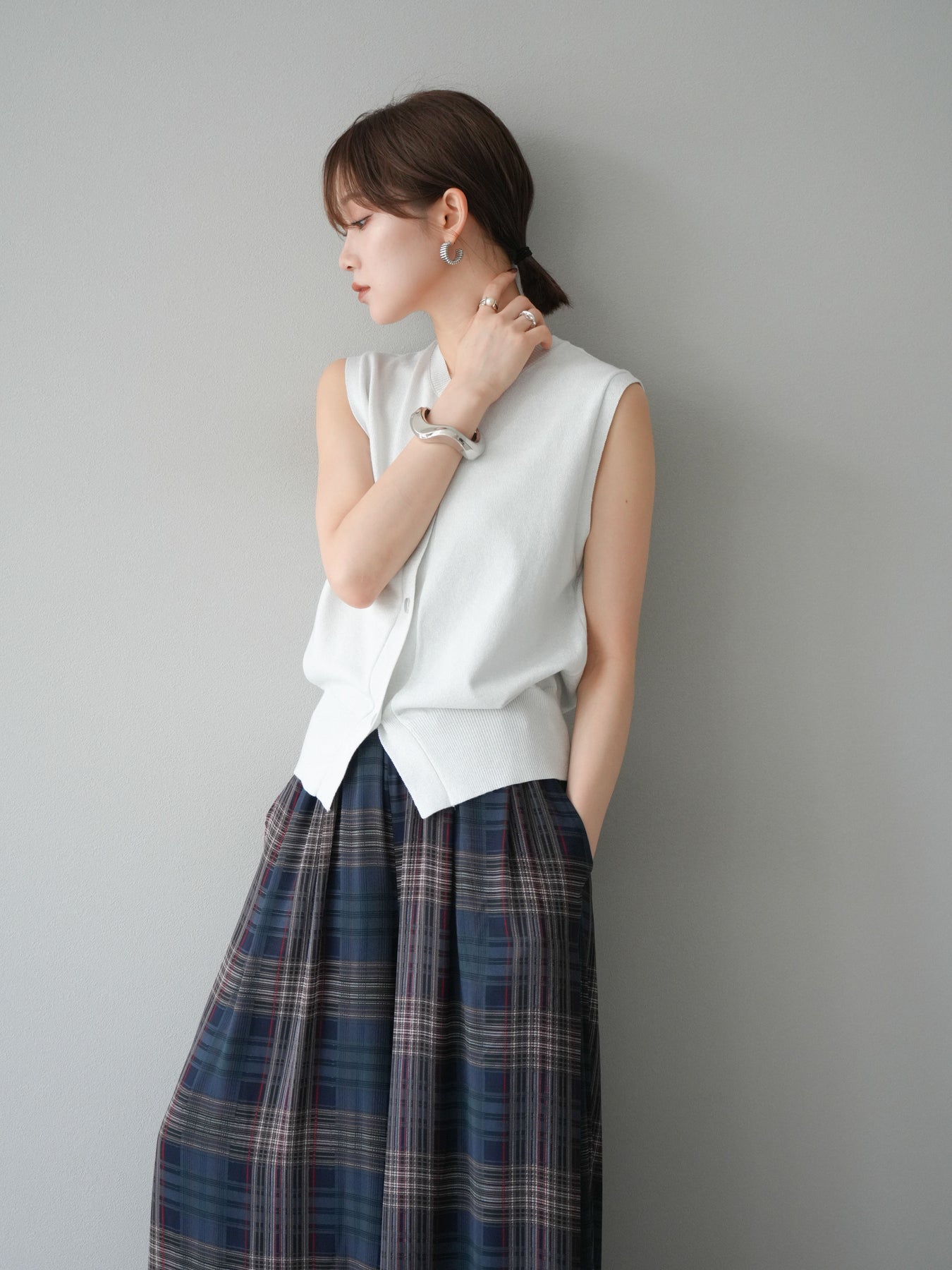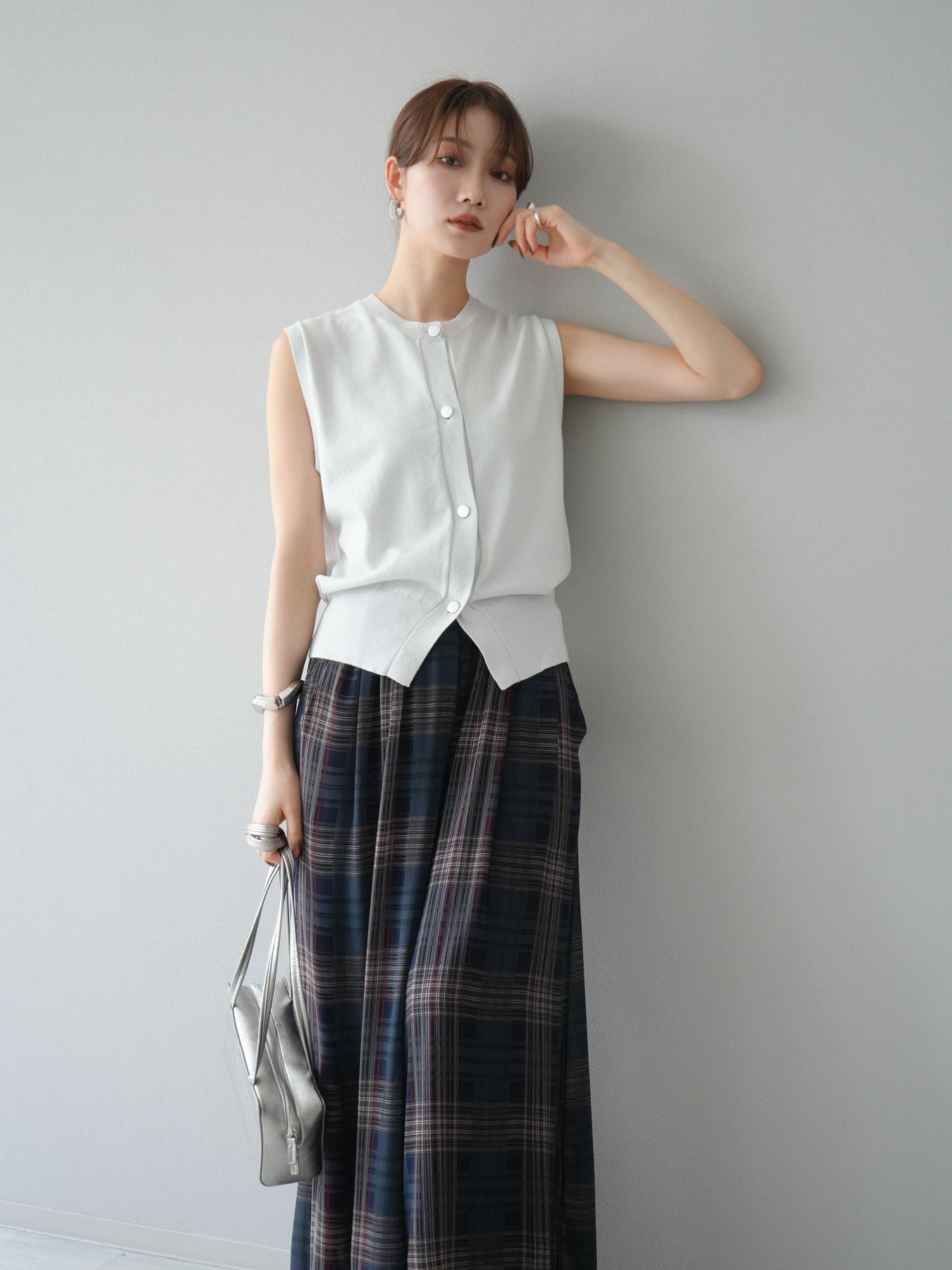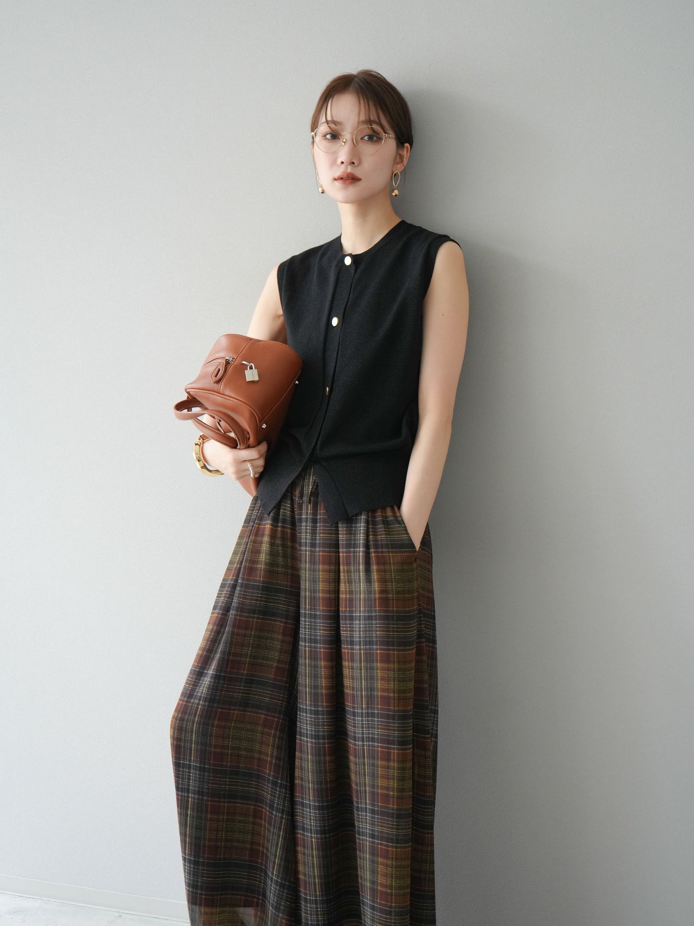 無袖針織背心,帶有微妙的閃光,閃耀優雅。 正面的金屬紐扣增添了經典的點綴,營造出簡約優雅的外觀。 它由柔軟的針織材料製成,可以單獨穿著,也可以與襯衫或剪裁上衣搭配。 該設計允許您將其在前面敞開作為背心穿著,使其成為可以在任何季節穿著的多功能服裝。 ※除下裝、吊帶背心(內衣)以外的商品均不含內衣。
