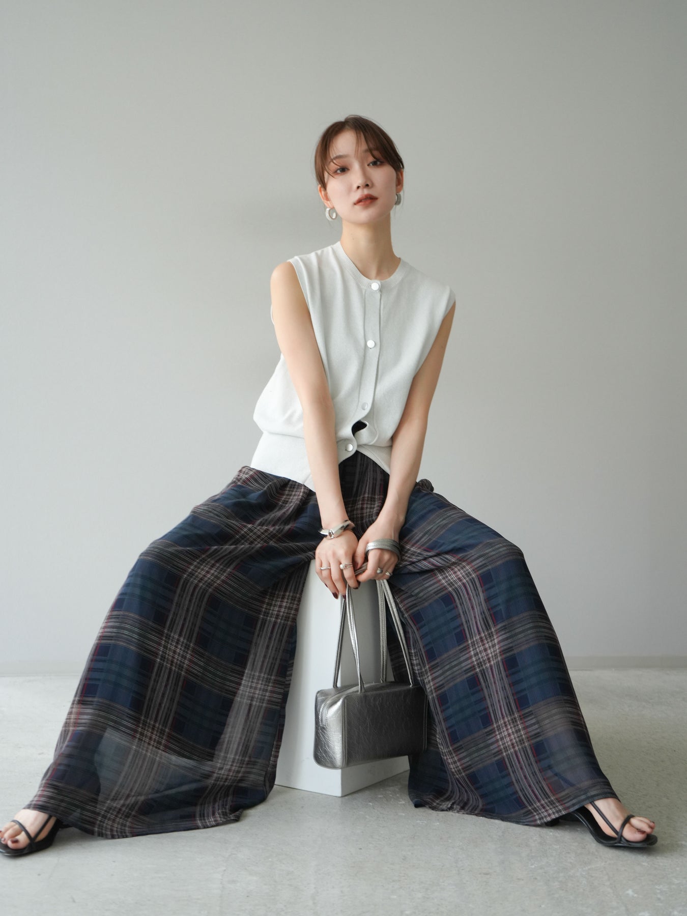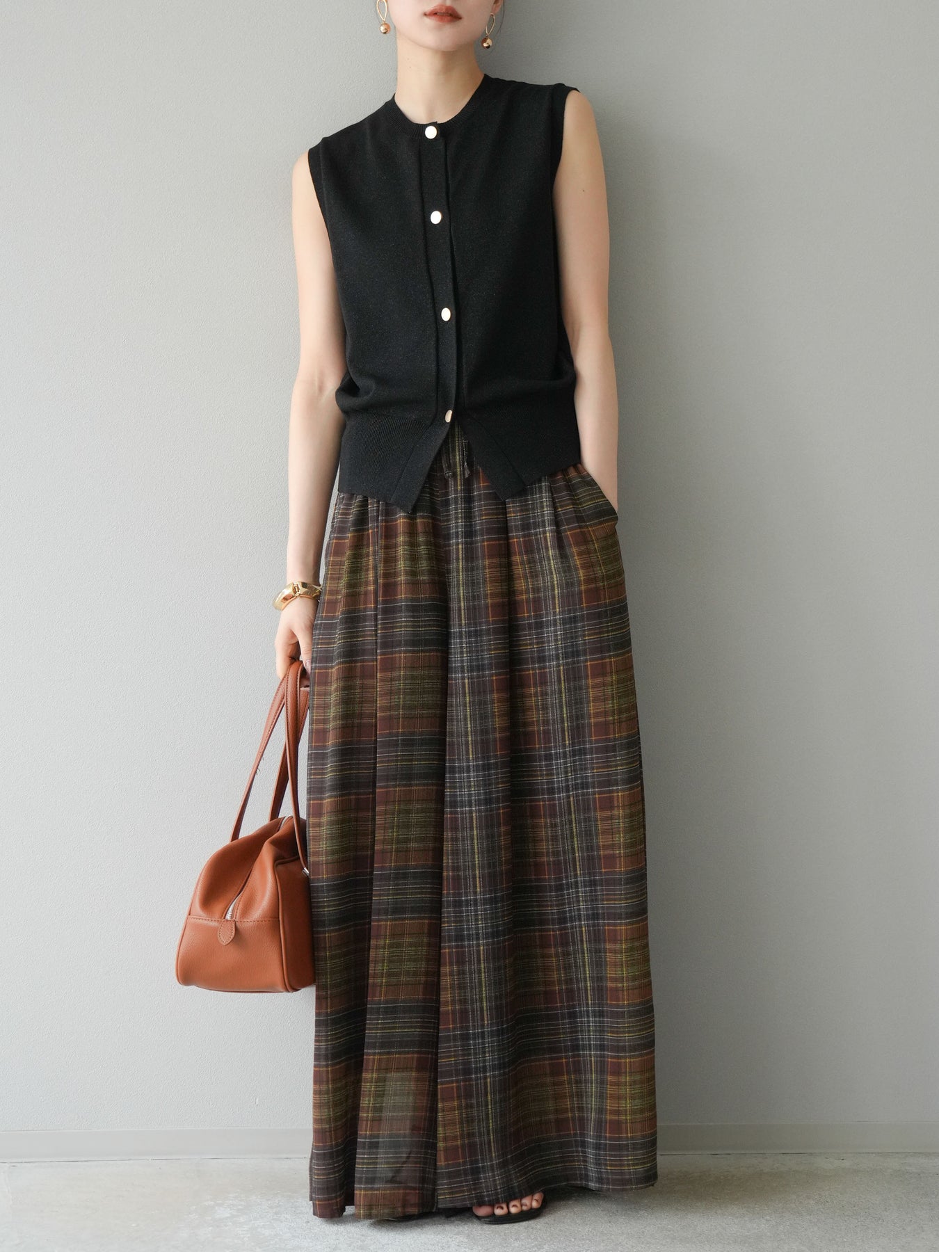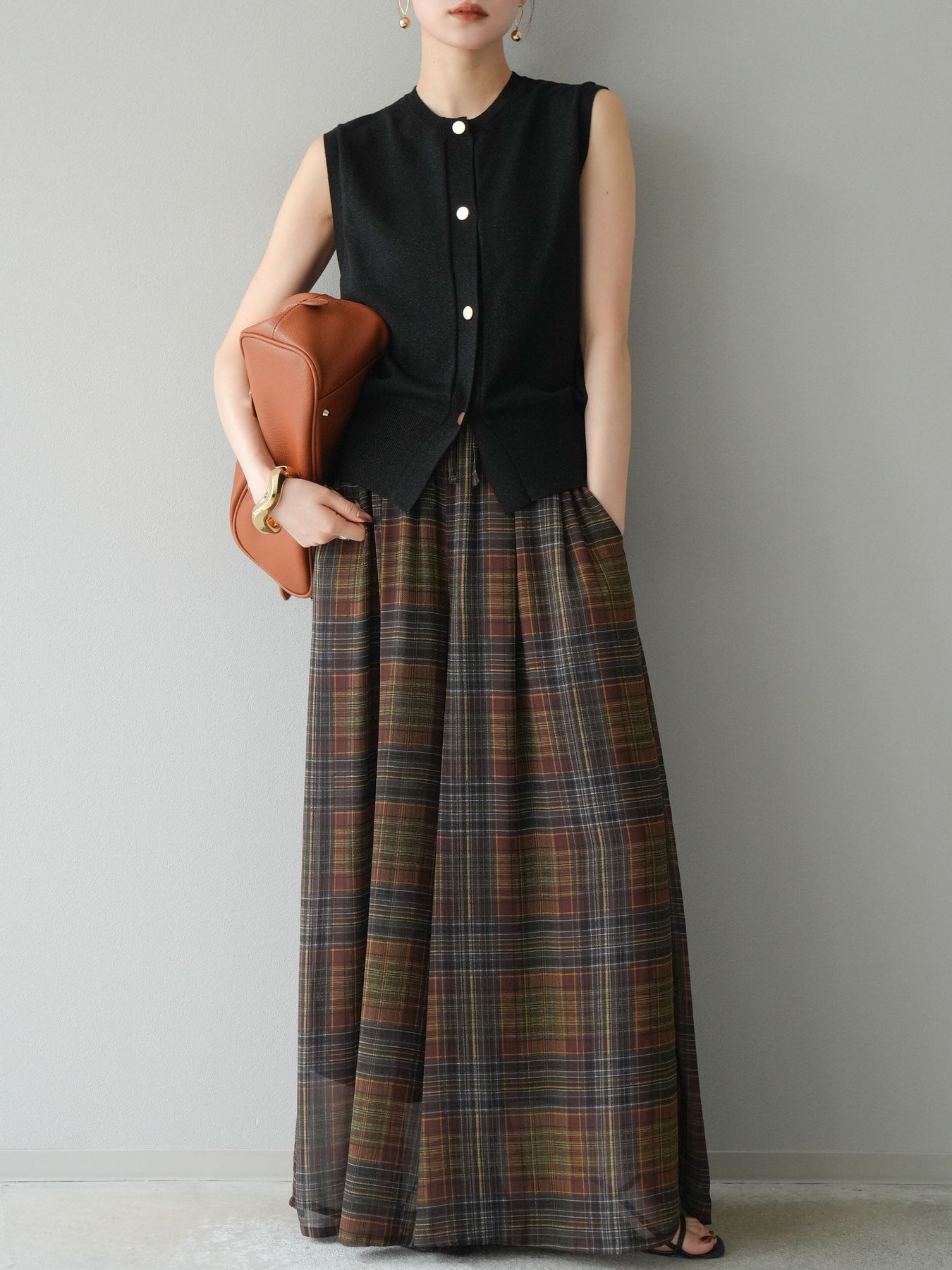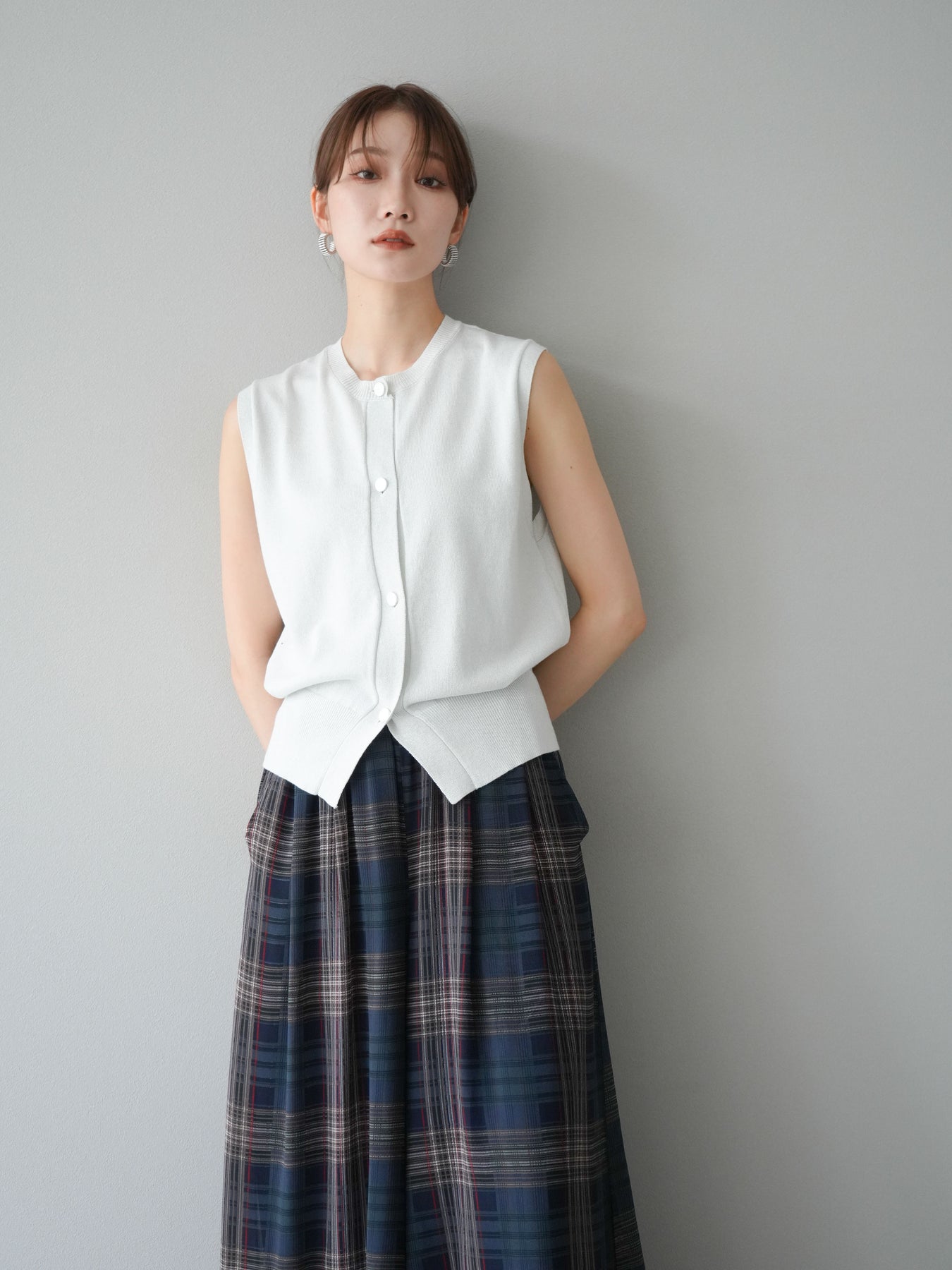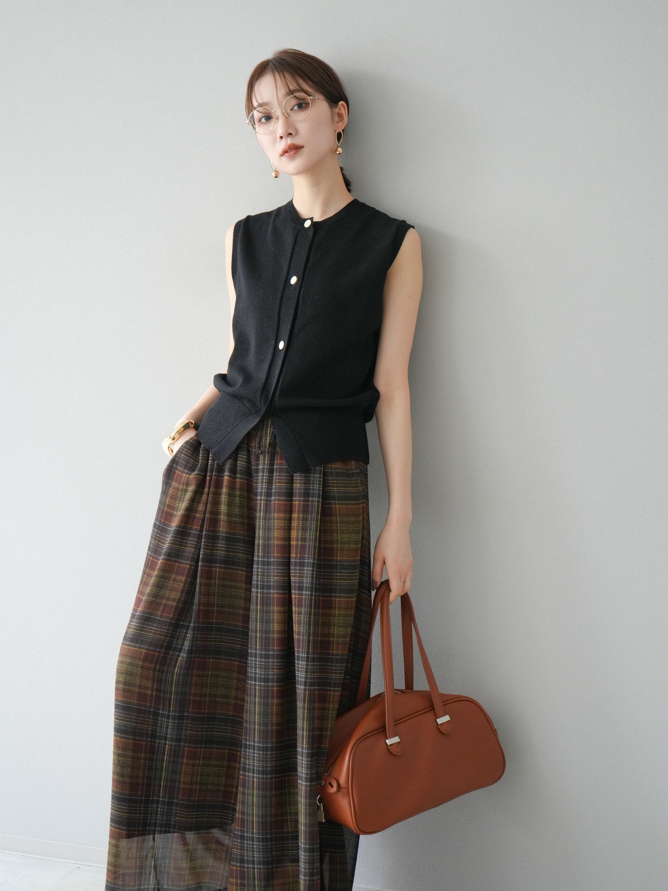 無袖針織背心,帶有微妙的閃光,閃耀優雅。 正面的金屬紐扣增添了經典的點綴,營造出簡約優雅的外觀。 它由柔軟的針織材料製成,可以單獨穿著,也可以與襯衫或剪裁上衣搭配。 該設計允許您將其在前面敞開作為背心穿著,使其成為可以在任何季節穿著的多功能服裝。 ※除下裝、吊帶背心(內衣)以外的商品均不含內衣。