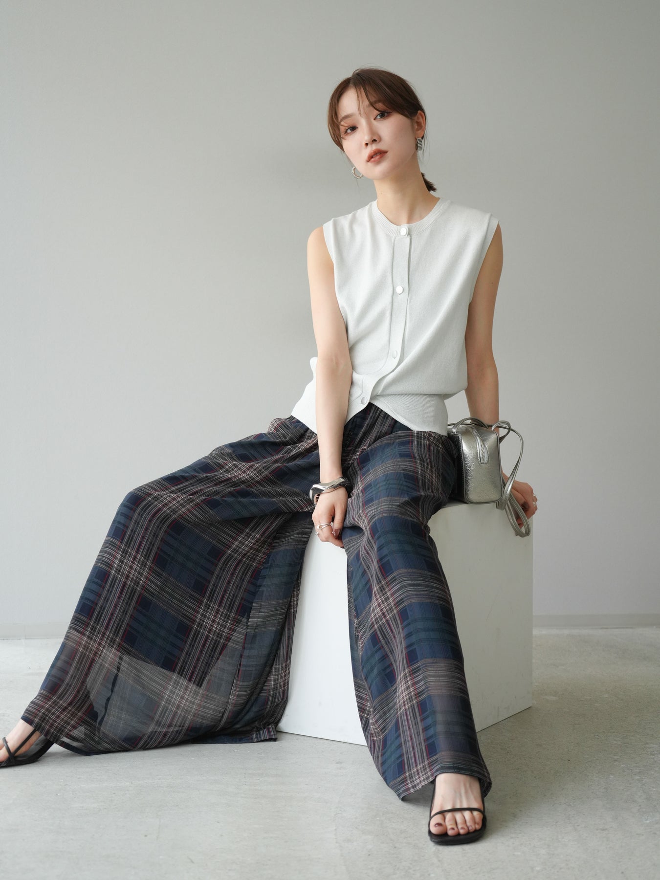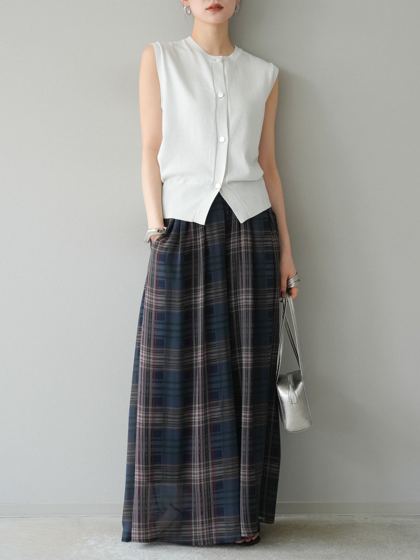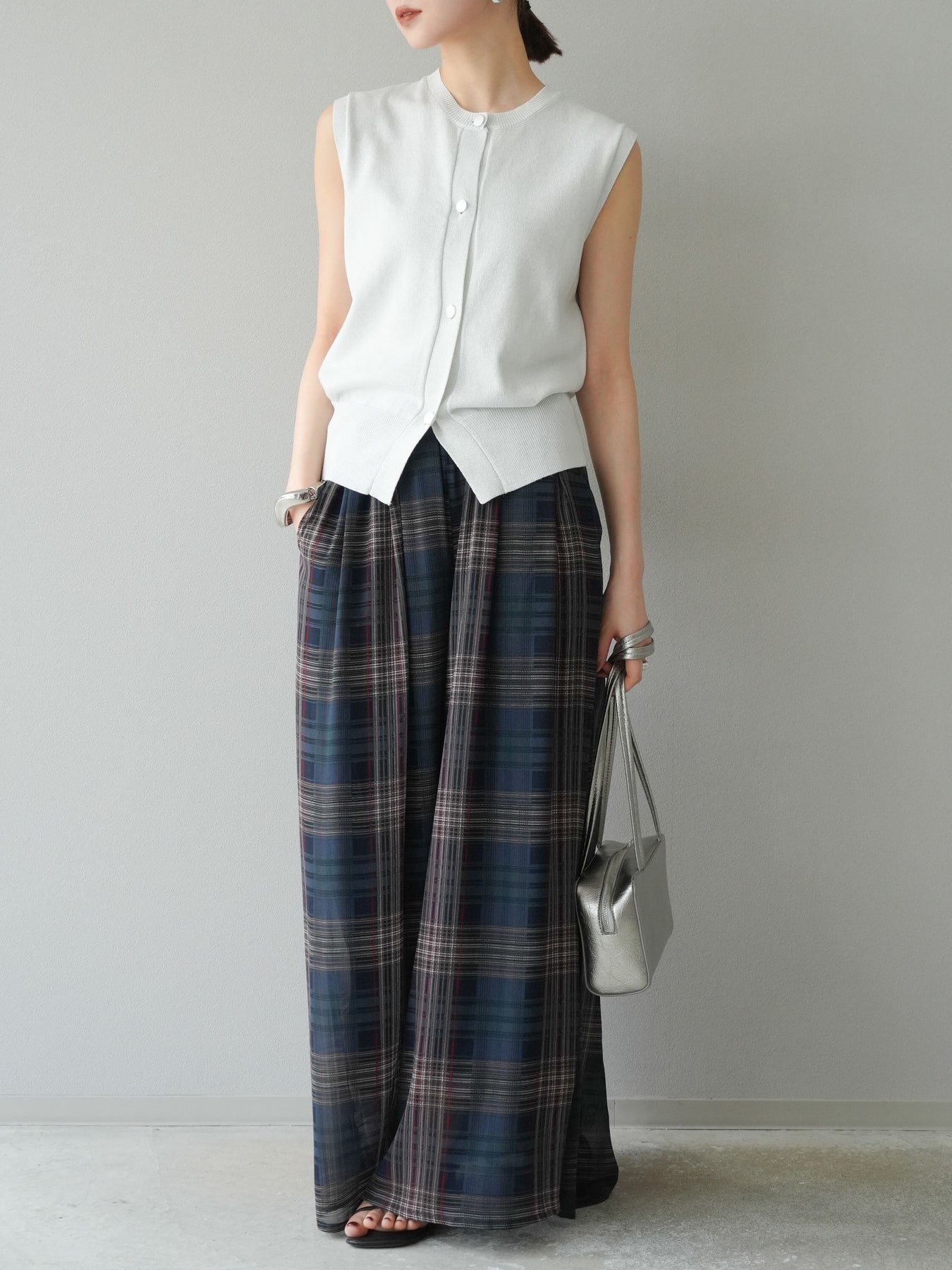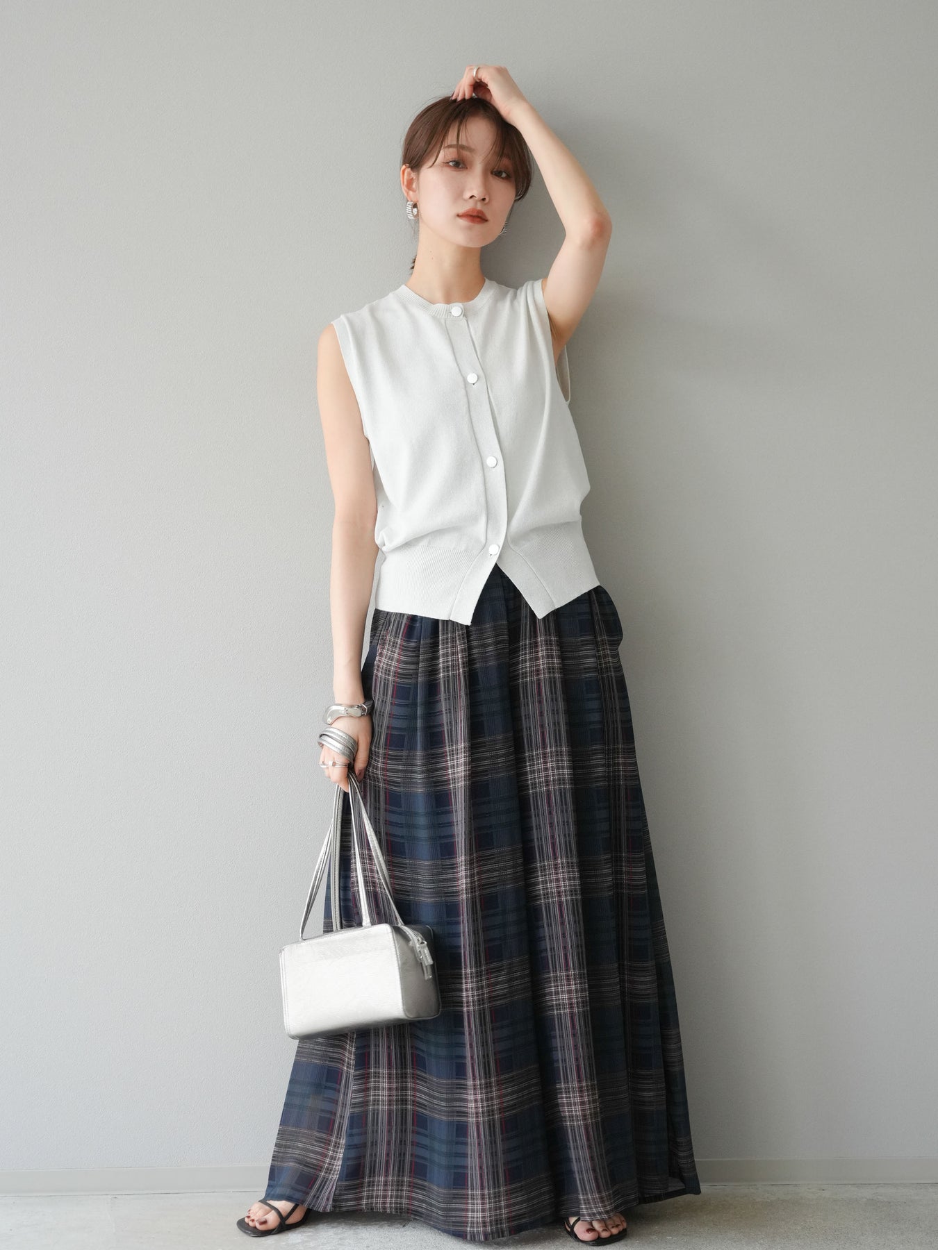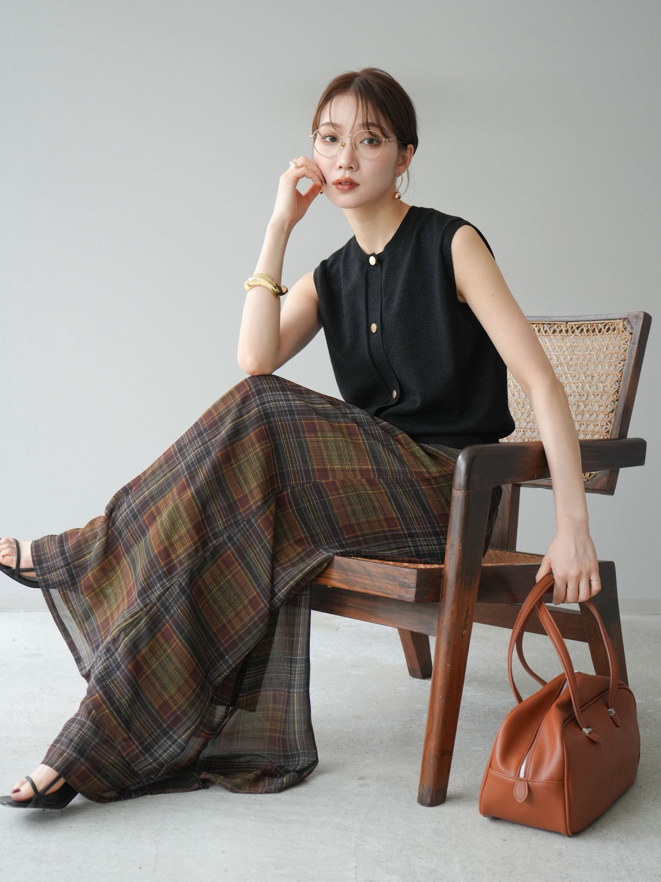 無袖針織背心,帶有微妙的閃光,閃耀優雅。 正面的金屬紐扣增添了經典的點綴,營造出簡約優雅的外觀。 它由柔軟的針織材料製成,可以單獨穿著,也可以與襯衫或剪裁上衣搭配。 該設計允許您將其在前面敞開作為背心穿著,使其成為可以在任何季節穿著的多功能服裝。 ※除下裝、吊帶背心(內衣)以外的商品均不含內衣。