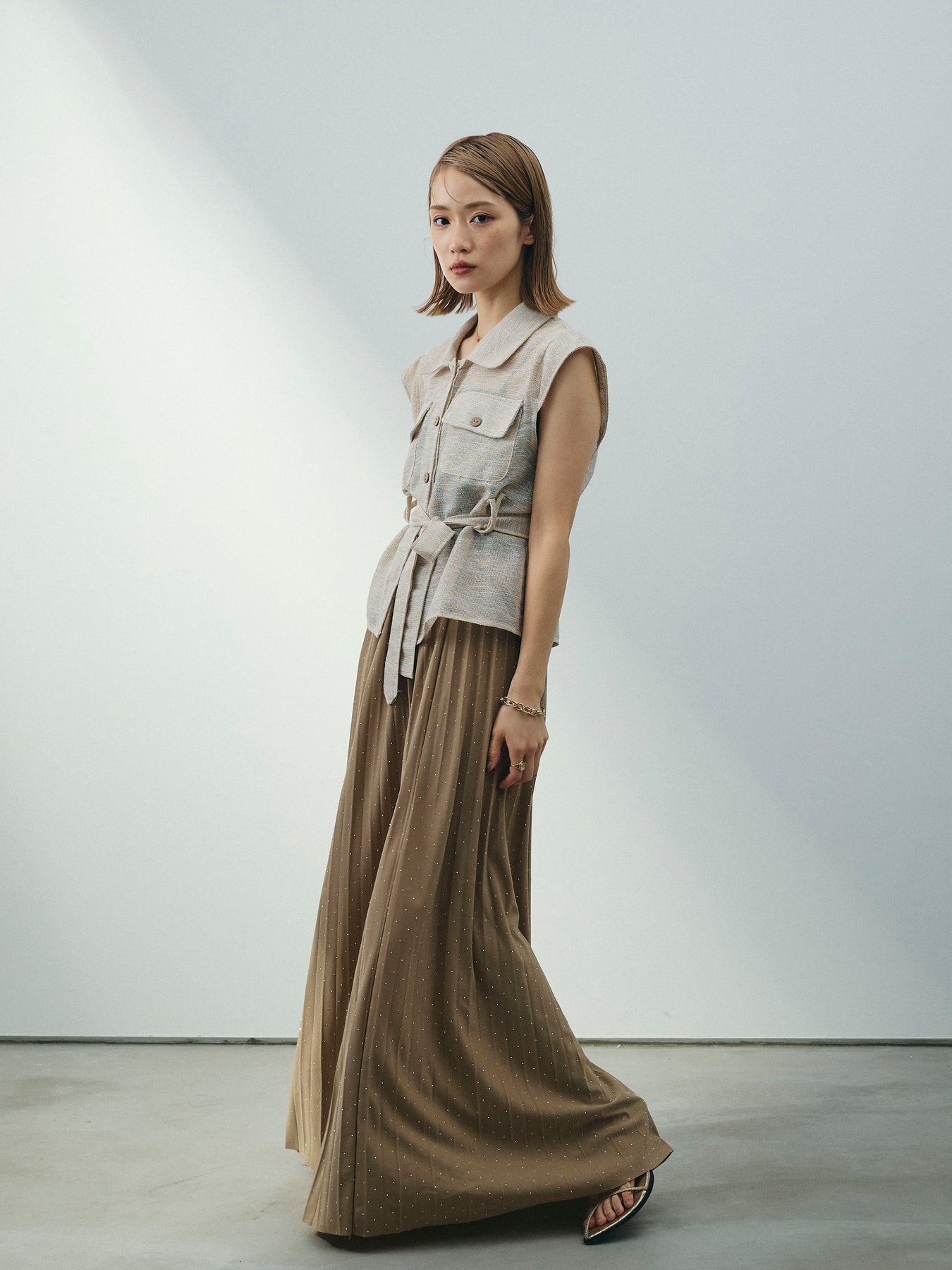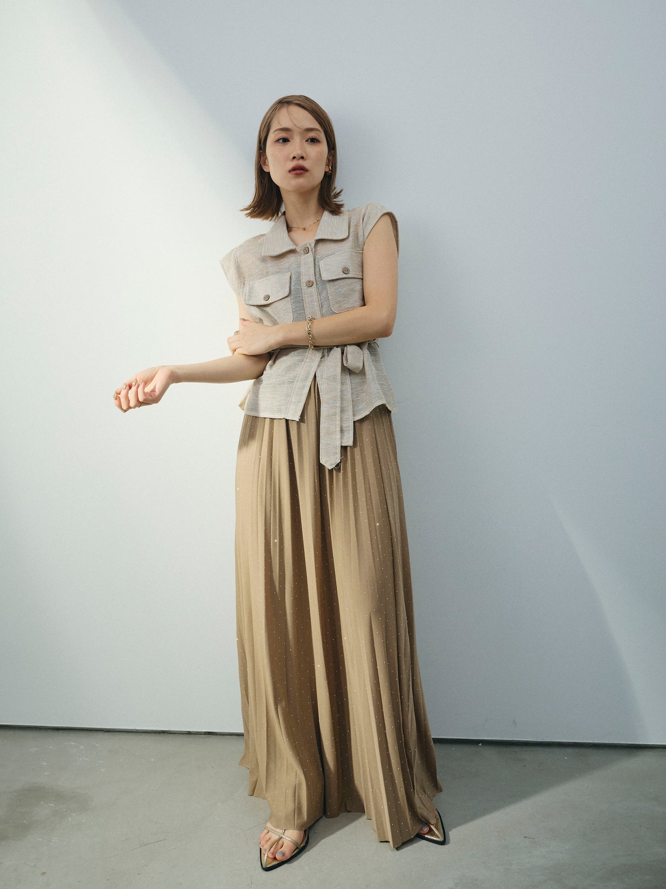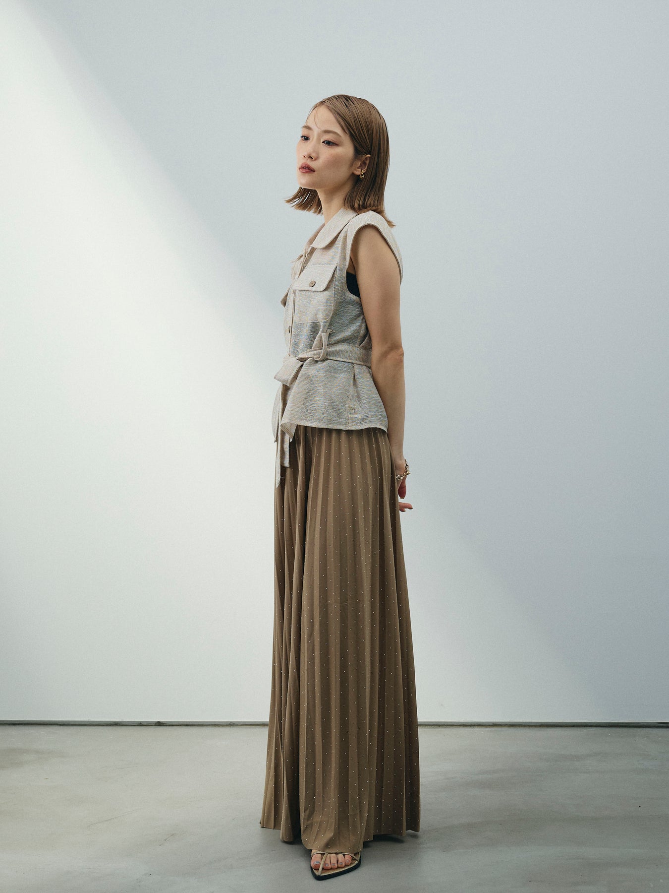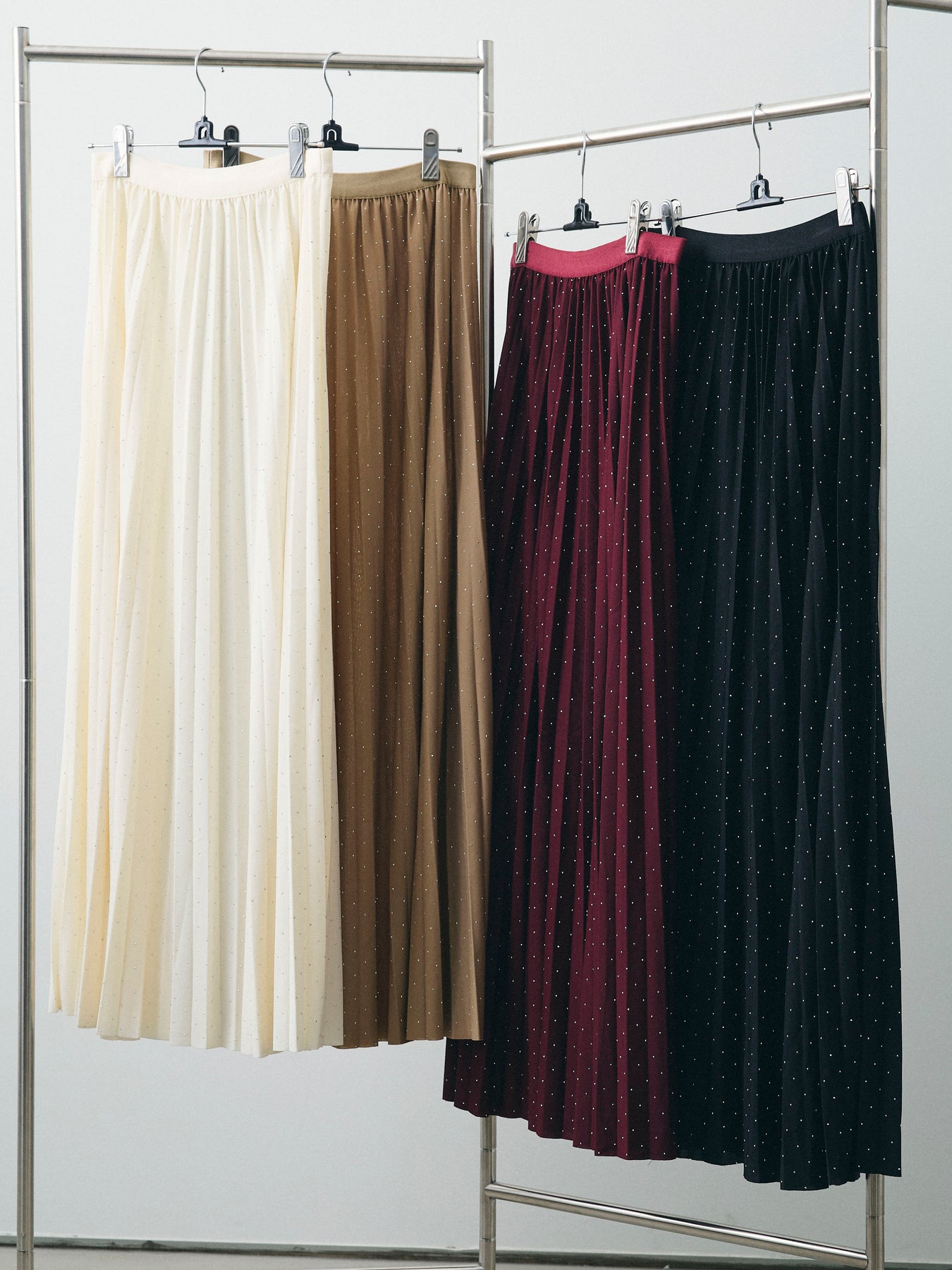 きらりと輝くラインストーンが散りばめられた、華やかさと上品さを兼ね備えたプリーツスカート。 動くたびに繊細な輝きを放ち、コーディネートにアクセントを加えてくれる主役級アイテムです。 しなやかに揺れる細やかなプリーツが美しいシルエットを生み出し、歩くだけで優雅な印象に。 ウエストはゴム仕様で、ストレスフリーな履き心地と自然なフィット感を実現します。 ニットやスウェットと合わせてカジュアルダウンさせたり、ブラウスと合わせてオケージョンスタイルにも◎ シーズンレスで着回せる、ワードローブに加えたい一着です。 カラーはベーシックからアクセントカラーまで豊富にラインナップ。気分やスタイルに合わせてお選びいただけます。