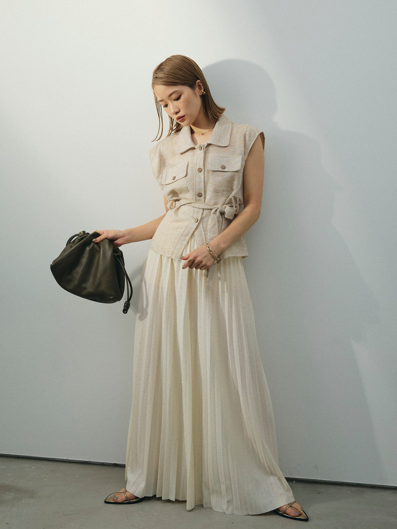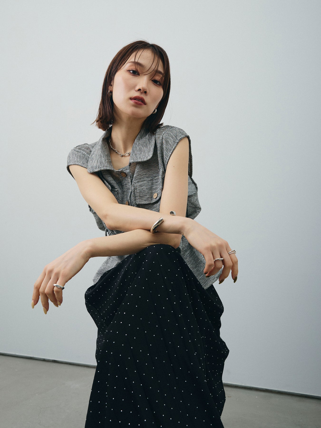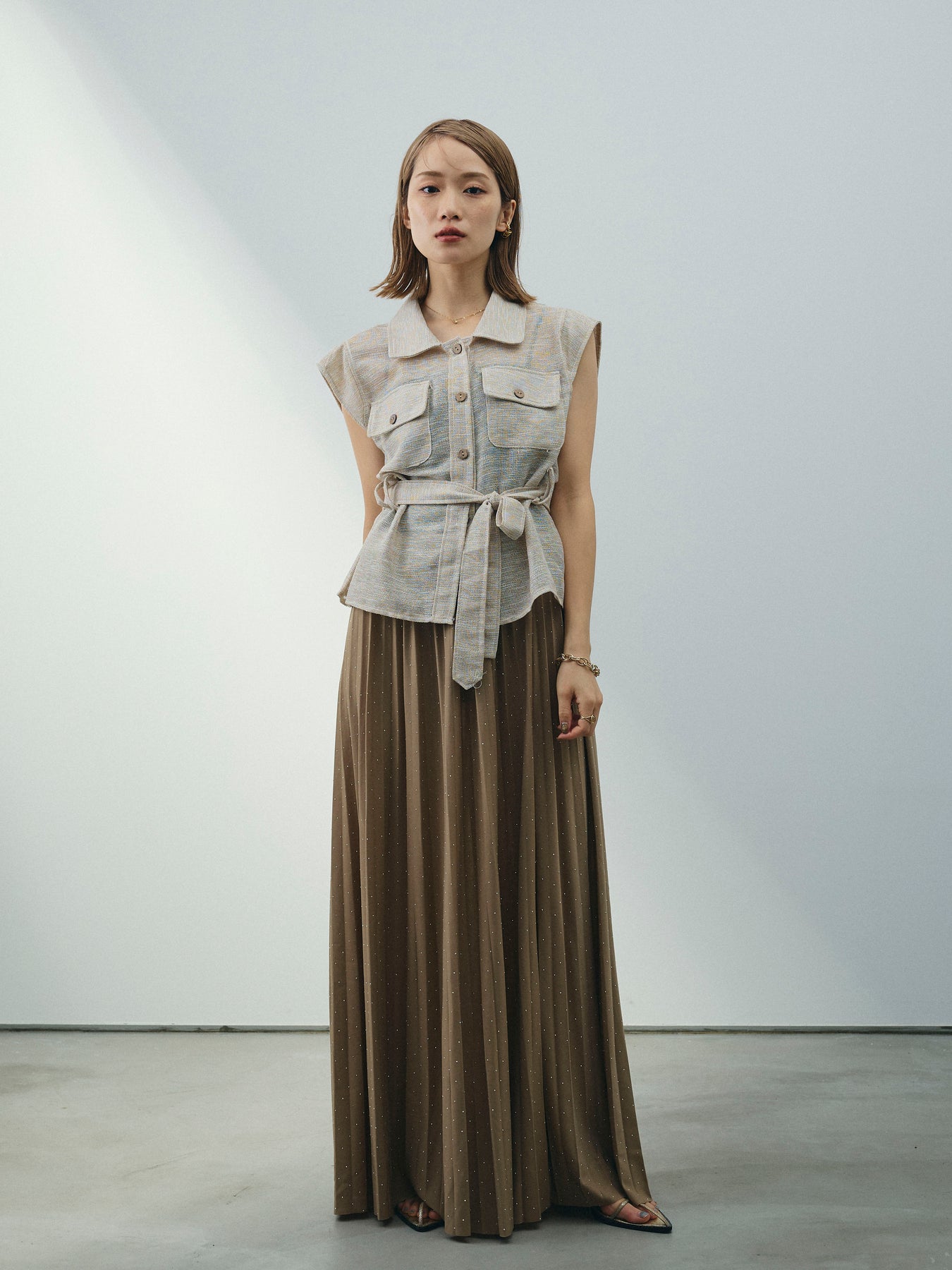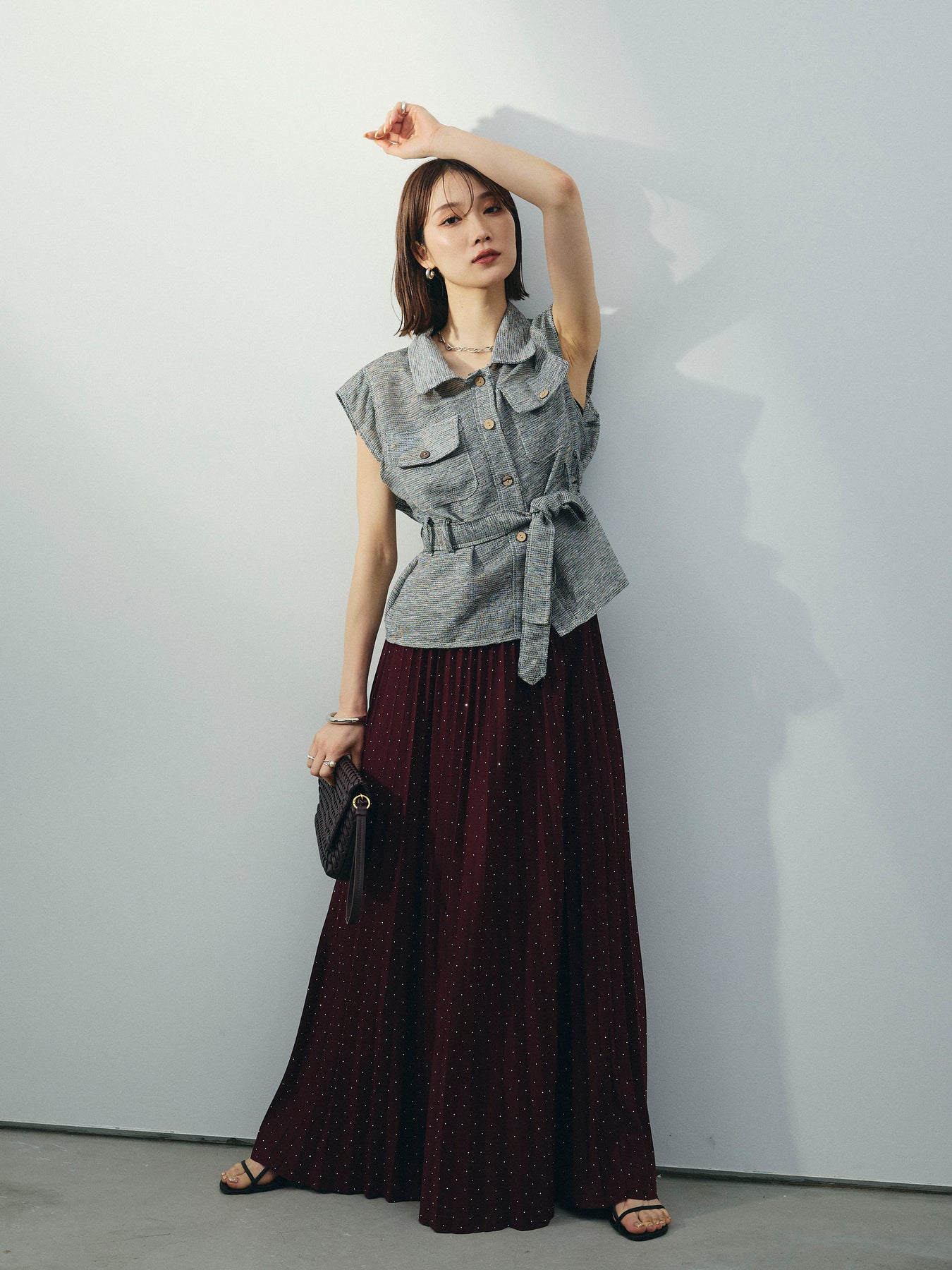 きらりと輝くラインストーンが散りばめられた、華やかさと上品さを兼ね備えたプリーツスカート。 動くたびに繊細な輝きを放ち、コーディネートにアクセントを加えてくれる主役級アイテムです。 しなやかに揺れる細やかなプリーツが美しいシルエットを生み出し、歩くだけで優雅な印象に。 ウエストはゴム仕様で、ストレスフリーな履き心地と自然なフィット感を実現します。 ニットやスウェットと合わせてカジュアルダウンさせたり、ブラウスと合わせてオケージョンスタイルにも◎ シーズンレスで着回せる、ワードローブに加えたい一着です。 カラーはベーシックからアクセントカラーまで豊富にラインナップ。気分やスタイルに合わせてお選びいただけます。