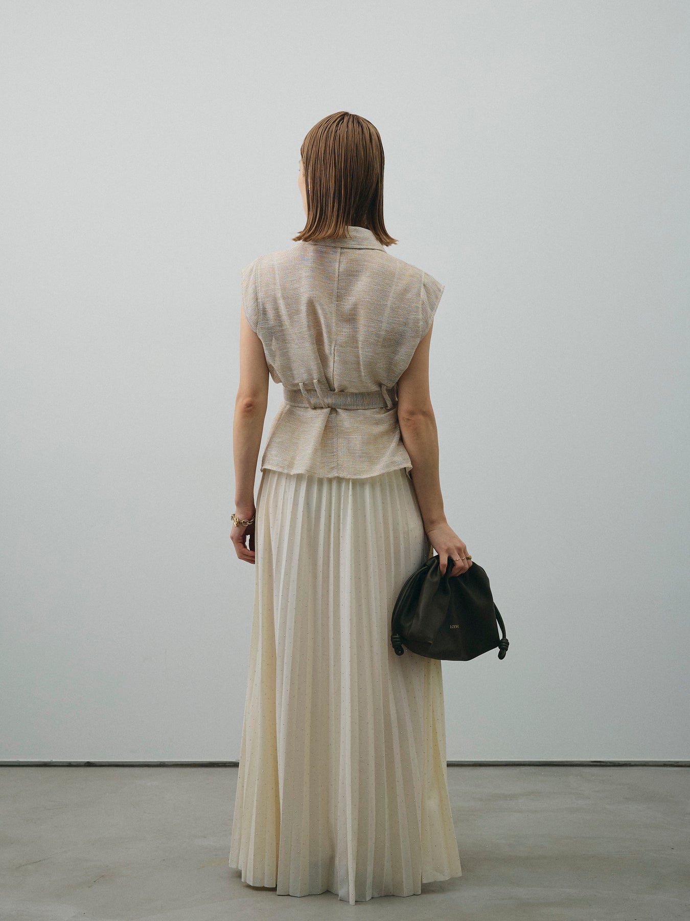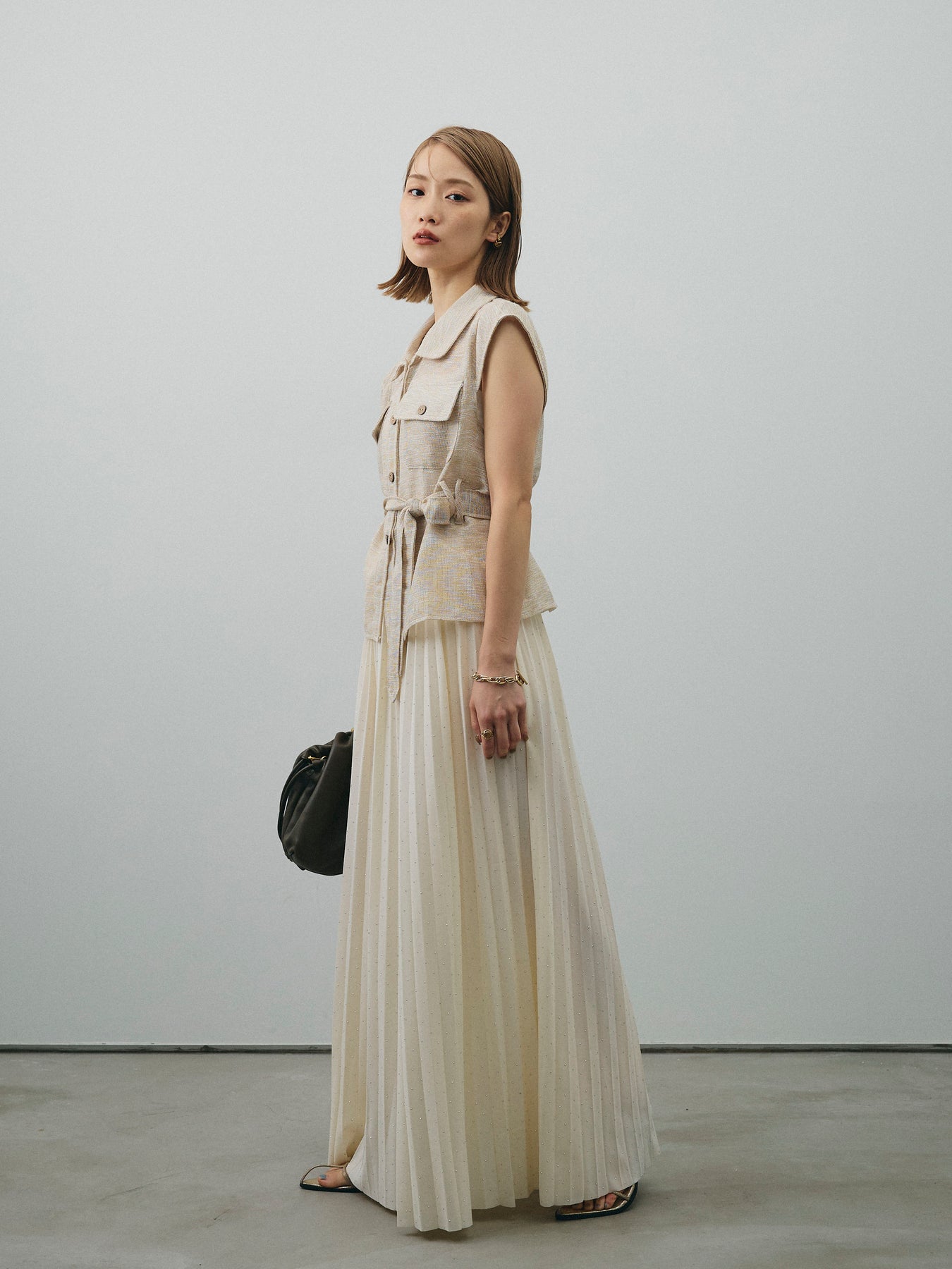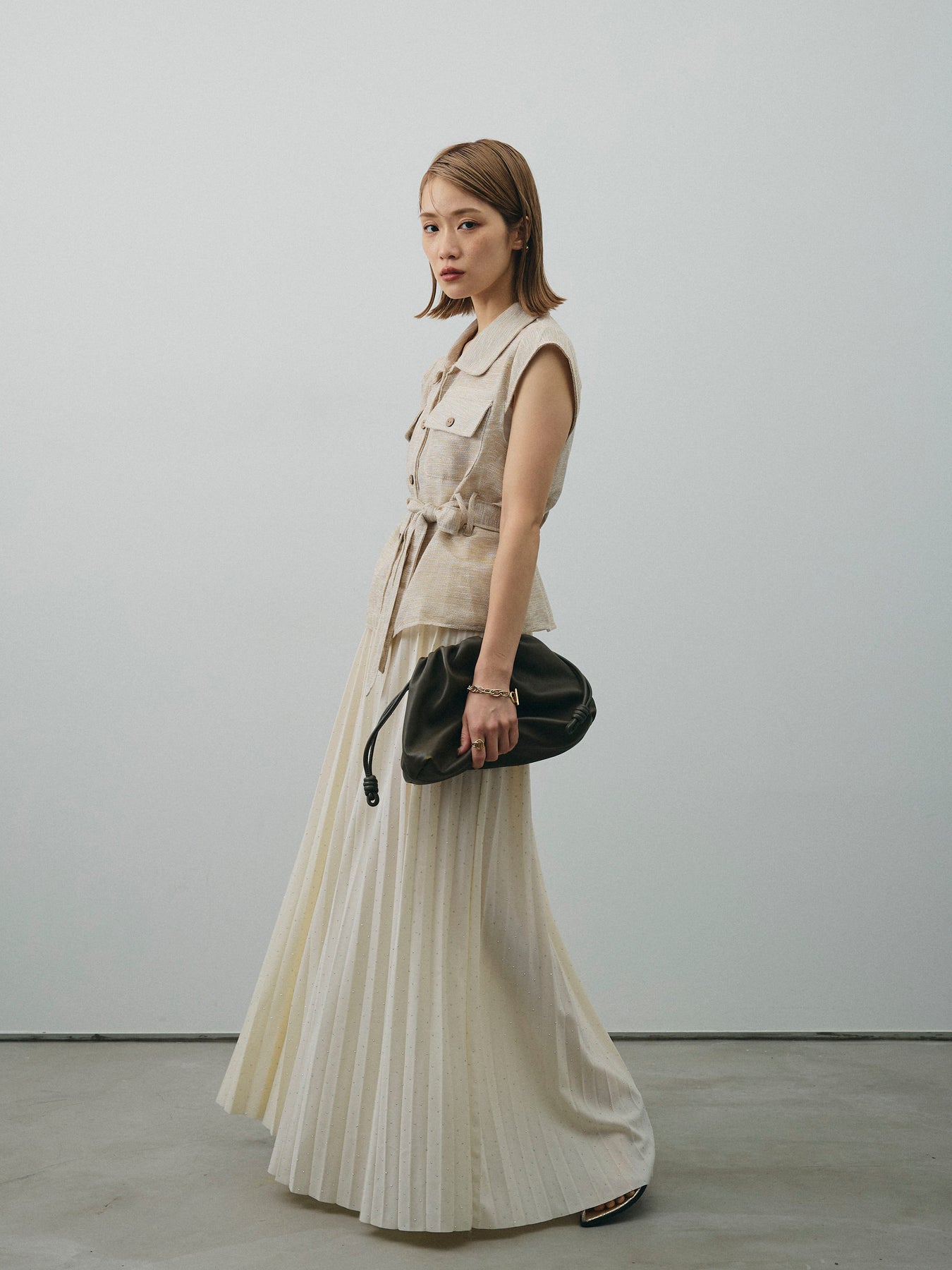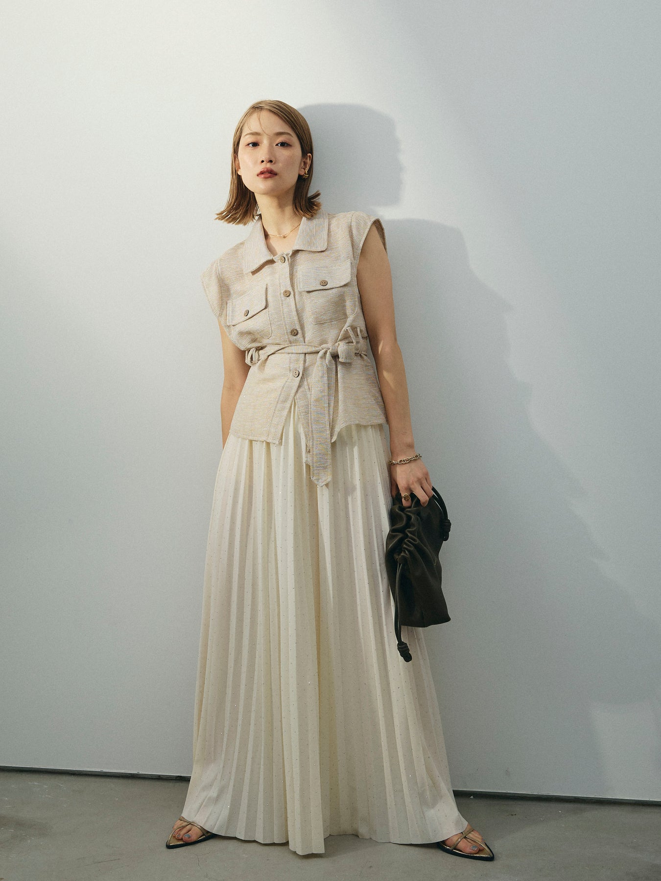 きらりと輝くラインストーンが散りばめられた、華やかさと上品さを兼ね備えたプリーツスカート。 動くたびに繊細な輝きを放ち、コーディネートにアクセントを加えてくれる主役級アイテムです。 しなやかに揺れる細やかなプリーツが美しいシルエットを生み出し、歩くだけで優雅な印象に。 ウエストはゴム仕様で、ストレスフリーな履き心地と自然なフィット感を実現します。 ニットやスウェットと合わせてカジュアルダウンさせたり、ブラウスと合わせてオケージョンスタイルにも◎ シーズンレスで着回せる、ワードローブに加えたい一着です。 カラーはベーシックからアクセントカラーまで豊富にラインナップ。気分やスタイルに合わせてお選びいただけます。