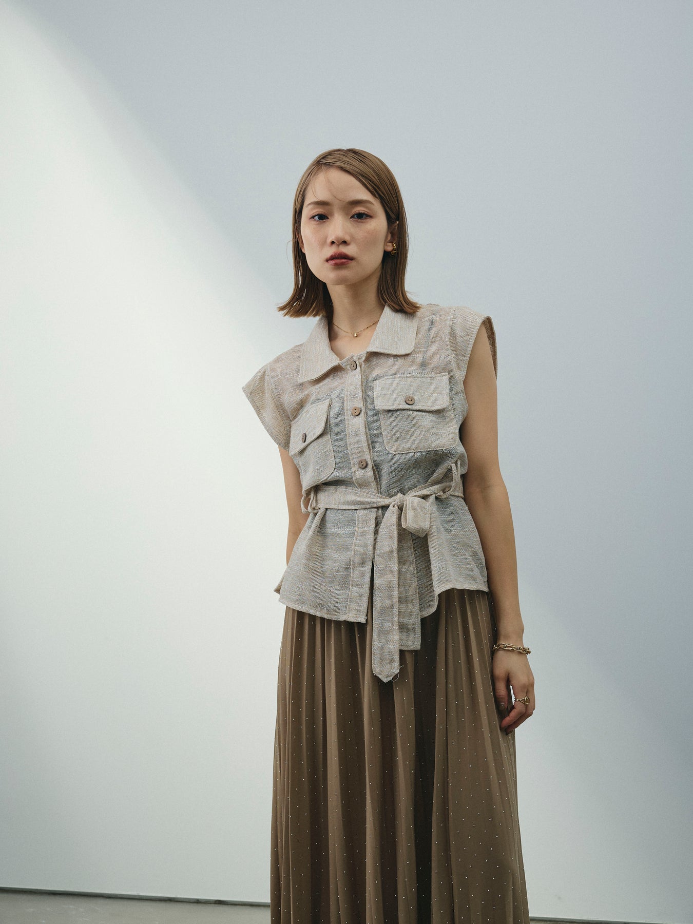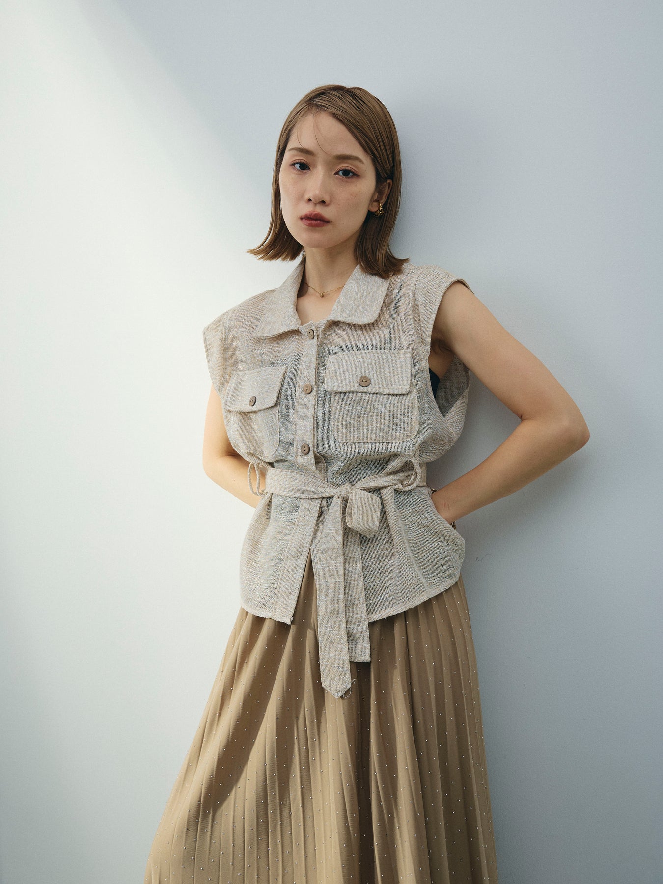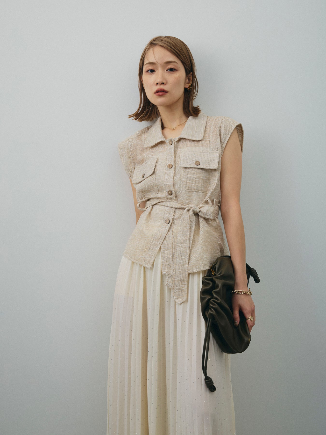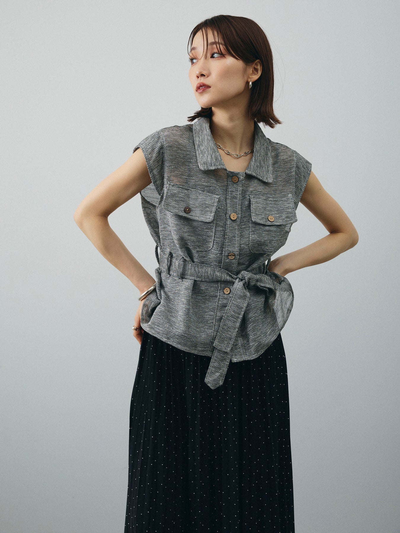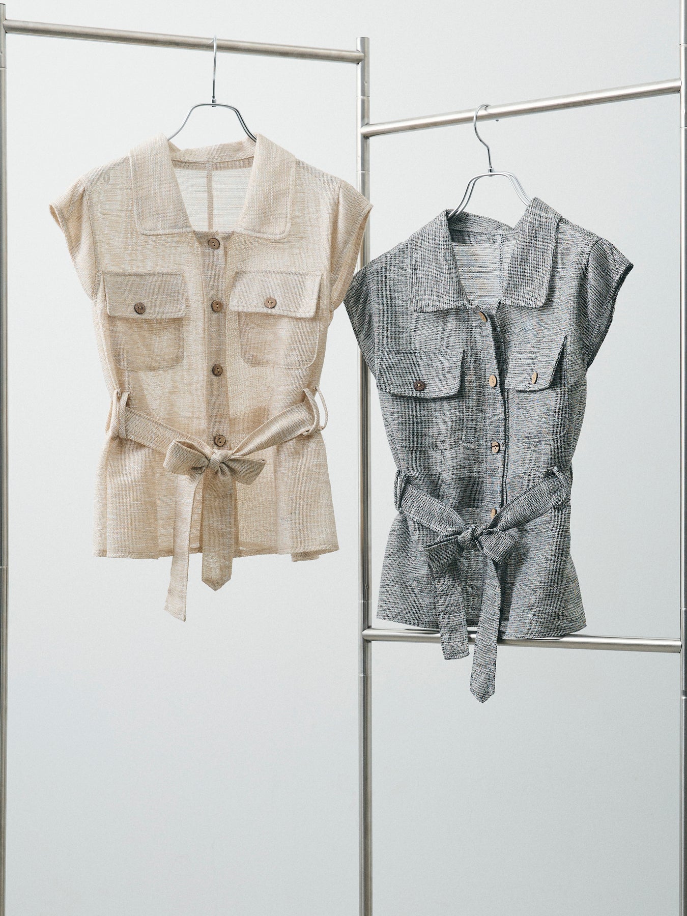 異素材のミックスヤーンで編み上げた、表情豊かなメッシュ素材が魅力のノースリーブブラウス。 通気性に優れた軽やかな着心地と、ニュアンスのある色合いが大人の抜け感を演出します。 ウエストは共布リボン付きで、シルエットにメリハリを出した着こなしが可能。 胸元の大きめポケットや開襟デザインが、カジュアルながらもきちんと感をプラスします。 インナー次第で季節を問わず着回しができ、パンツにもスカートにも合わせやすい万能アイテム。 一枚で主役になる、大人のための涼しげサマーブラウスです。