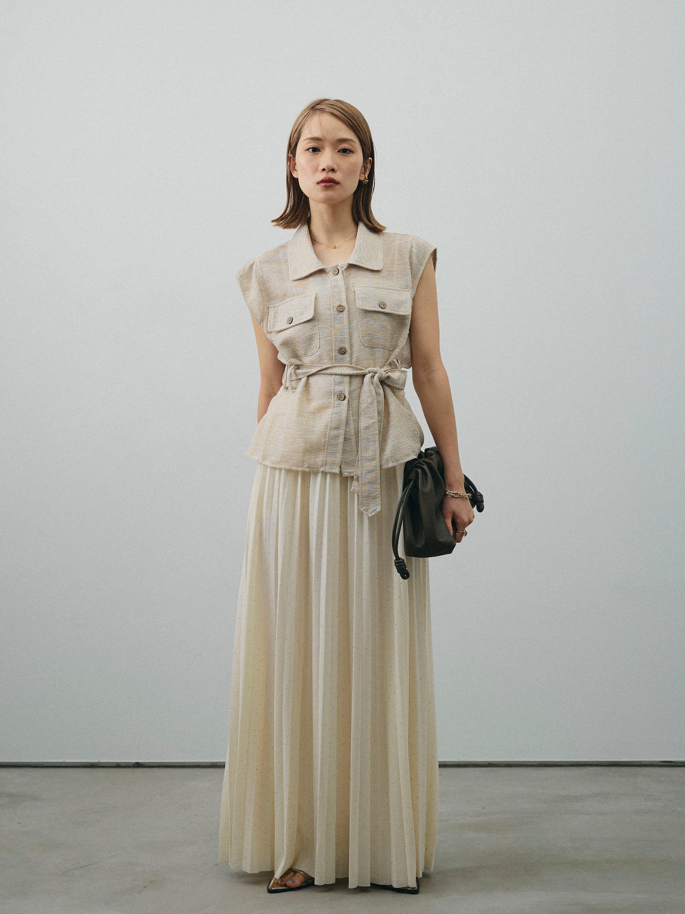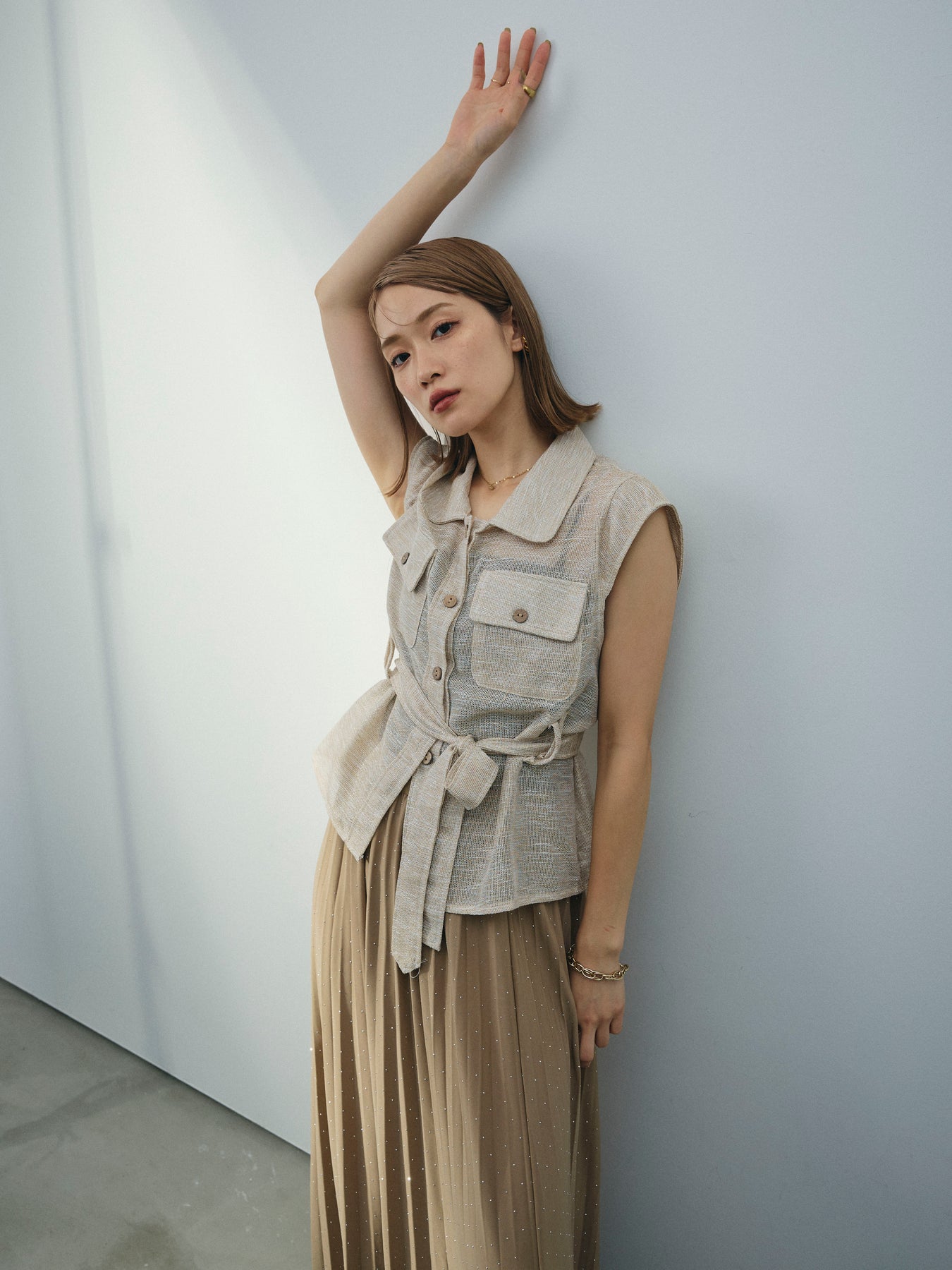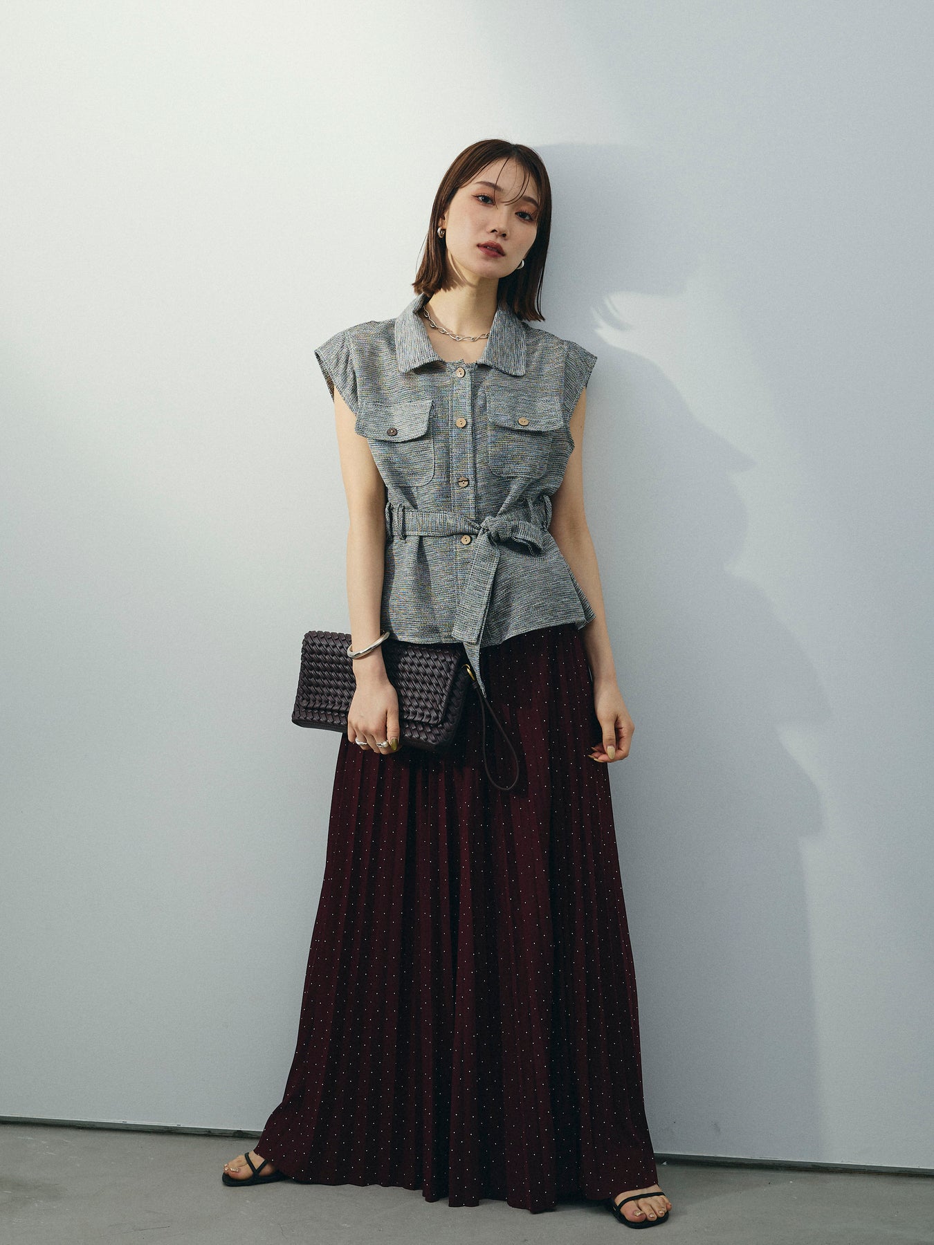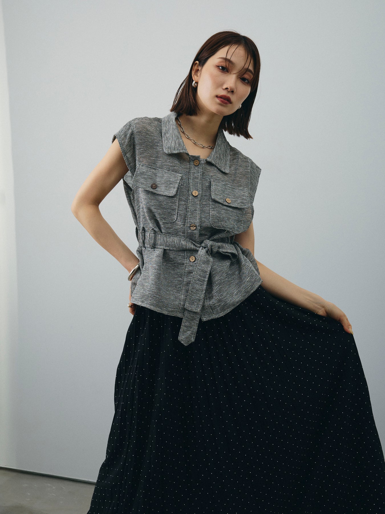 異素材のミックスヤーンで編み上げた、表情豊かなメッシュ素材が魅力のノースリーブブラウス。 通気性に優れた軽やかな着心地と、ニュアンスのある色合いが大人の抜け感を演出します。 ウエストは共布リボン付きで、シルエットにメリハリを出した着こなしが可能。 胸元の大きめポケットや開襟デザインが、カジュアルながらもきちんと感をプラスします。 インナー次第で季節を問わず着回しができ、パンツにもスカートにも合わせやすい万能アイテム。 一枚で主役になる、大人のための涼しげサマーブラウスです。