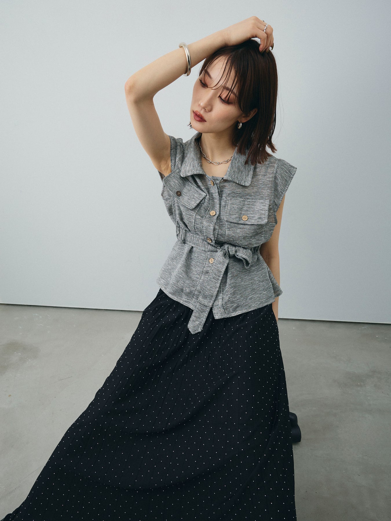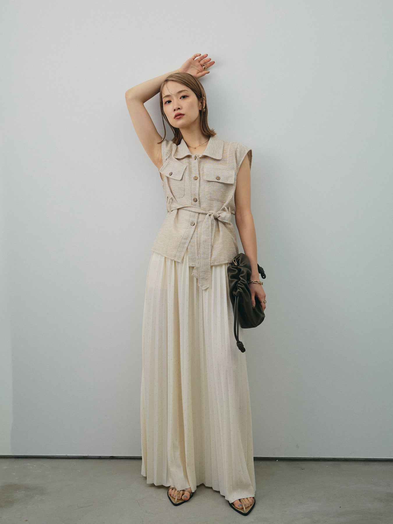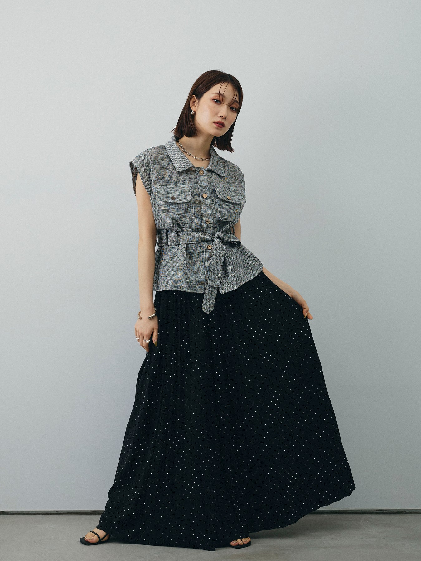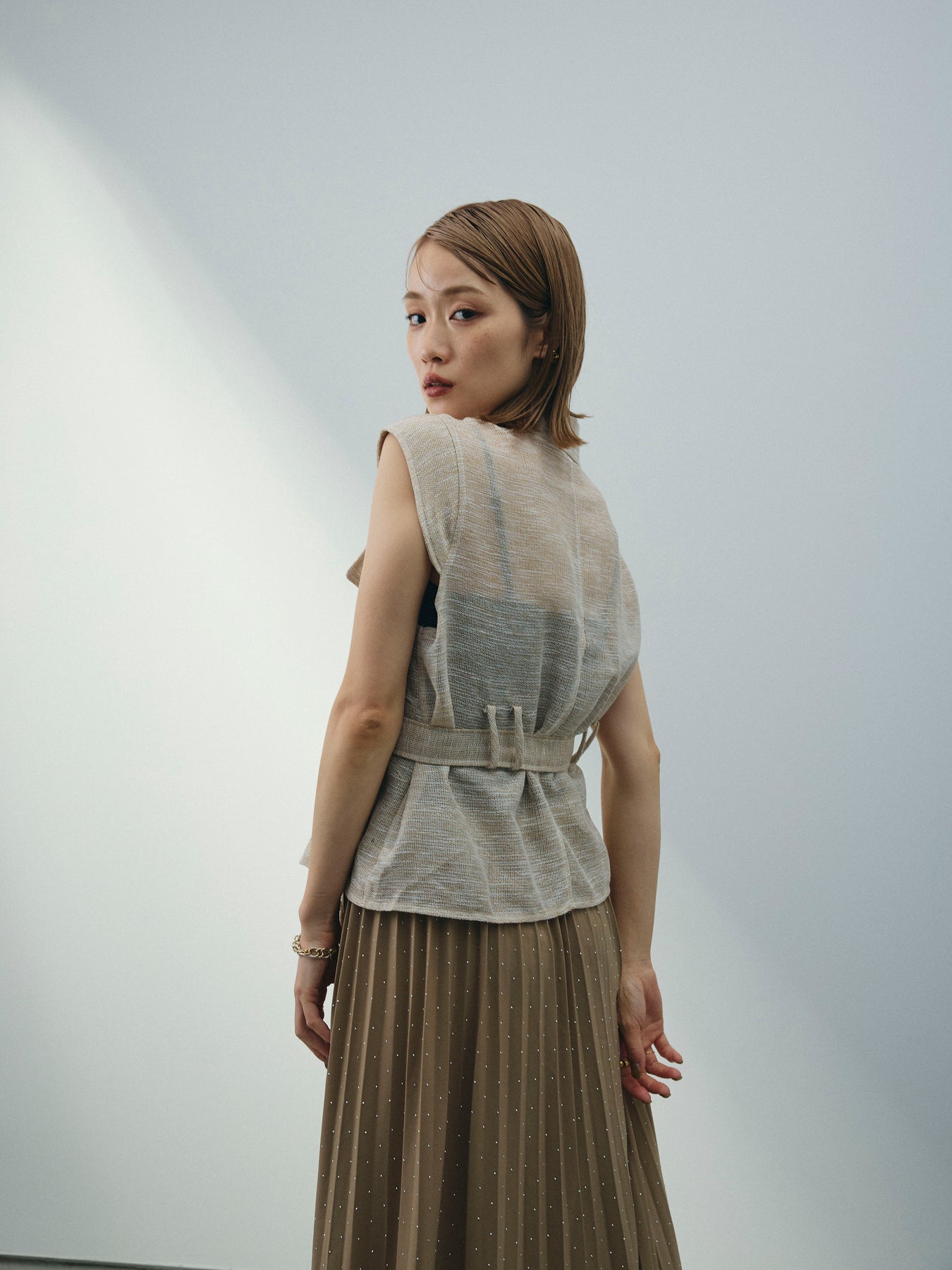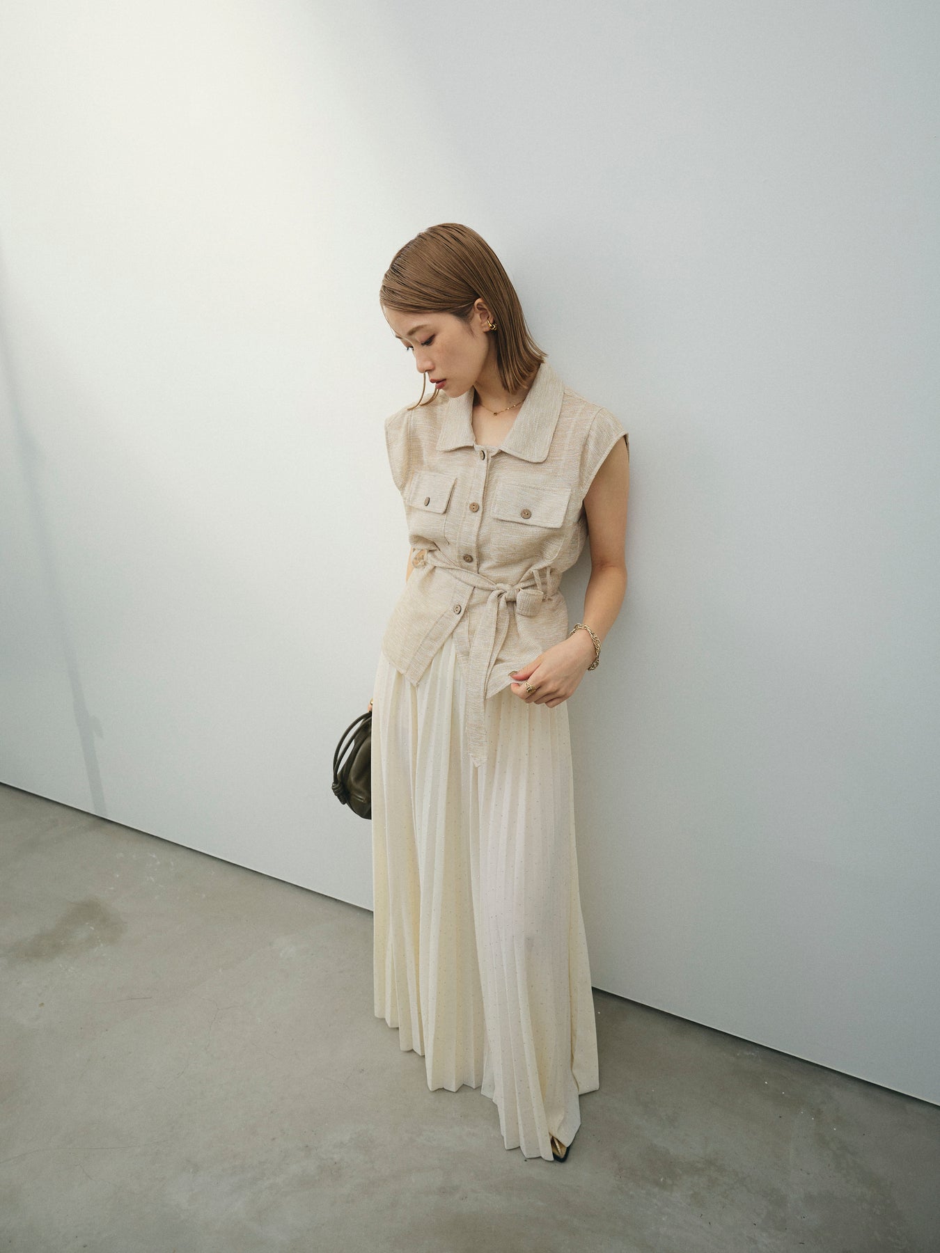異素材のミックスヤーンで編み上げた、表情豊かなメッシュ素材が魅力のノースリーブブラウス。 通気性に優れた軽やかな着心地と、ニュアンスのある色合いが大人の抜け感を演出します。 ウエストは共布リボン付きで、シルエットにメリハリを出した着こなしが可能。 胸元の大きめポケットや開襟デザインが、カジュアルながらもきちんと感をプラスします。 インナー次第で季節を問わず着回しができ、パンツにもスカートにも合わせやすい万能アイテム。 一枚で主役になる、大人のための涼しげサマーブラウスです。