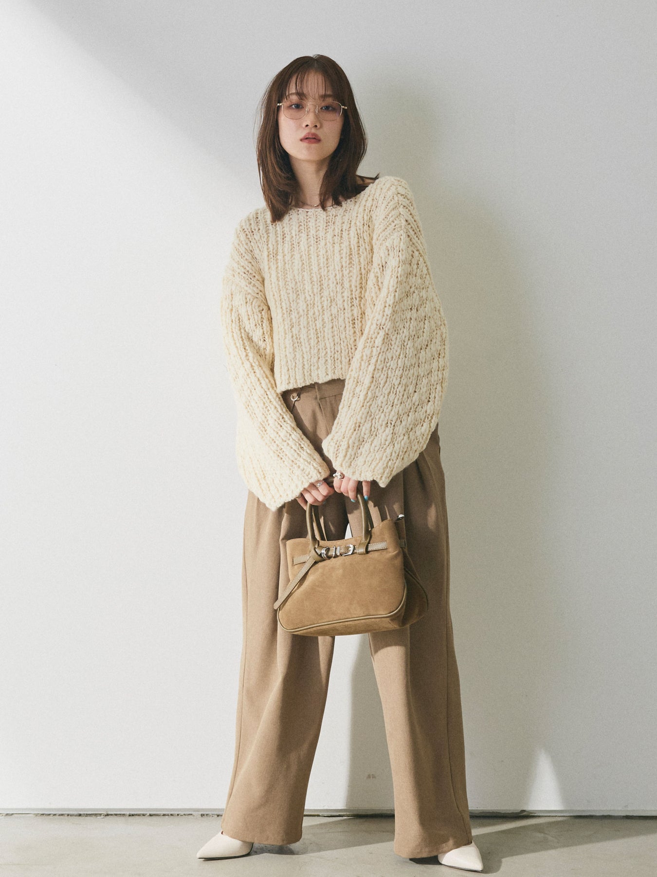立体感のあるスラブ糸を使用した、表情豊かなチャンキーニットプルオーバー。 ざっくりとした編み地が存在感を放ちつつ、クロップド丈のバランスにより重たく見えにくい仕上がりです。 程よくボリュームのある袖とコンパクトな丈感が、自然なメリハリを生み、ワイドパンツやハイウエストボトムスとも好相性。シンプルなスタイリングでも、ニットの質感がコーディネートに奥行きを加えてくれます。 一枚で着映えし、季節感を取り入れたスタイリングを楽しめるアイテムです。 ※ボトムス、キャミソール(インナー)以外の商品は一律でインナーは付属していません。