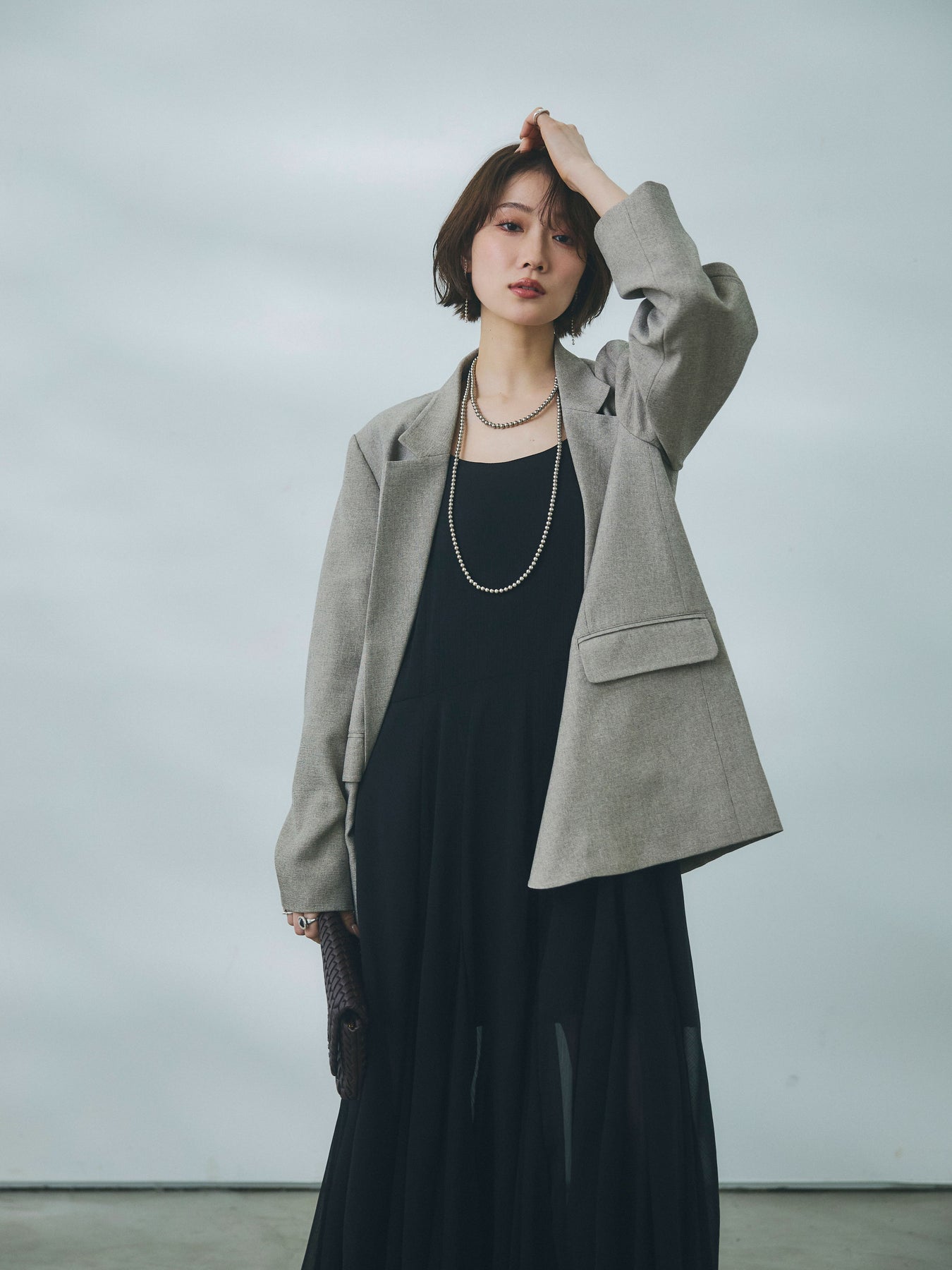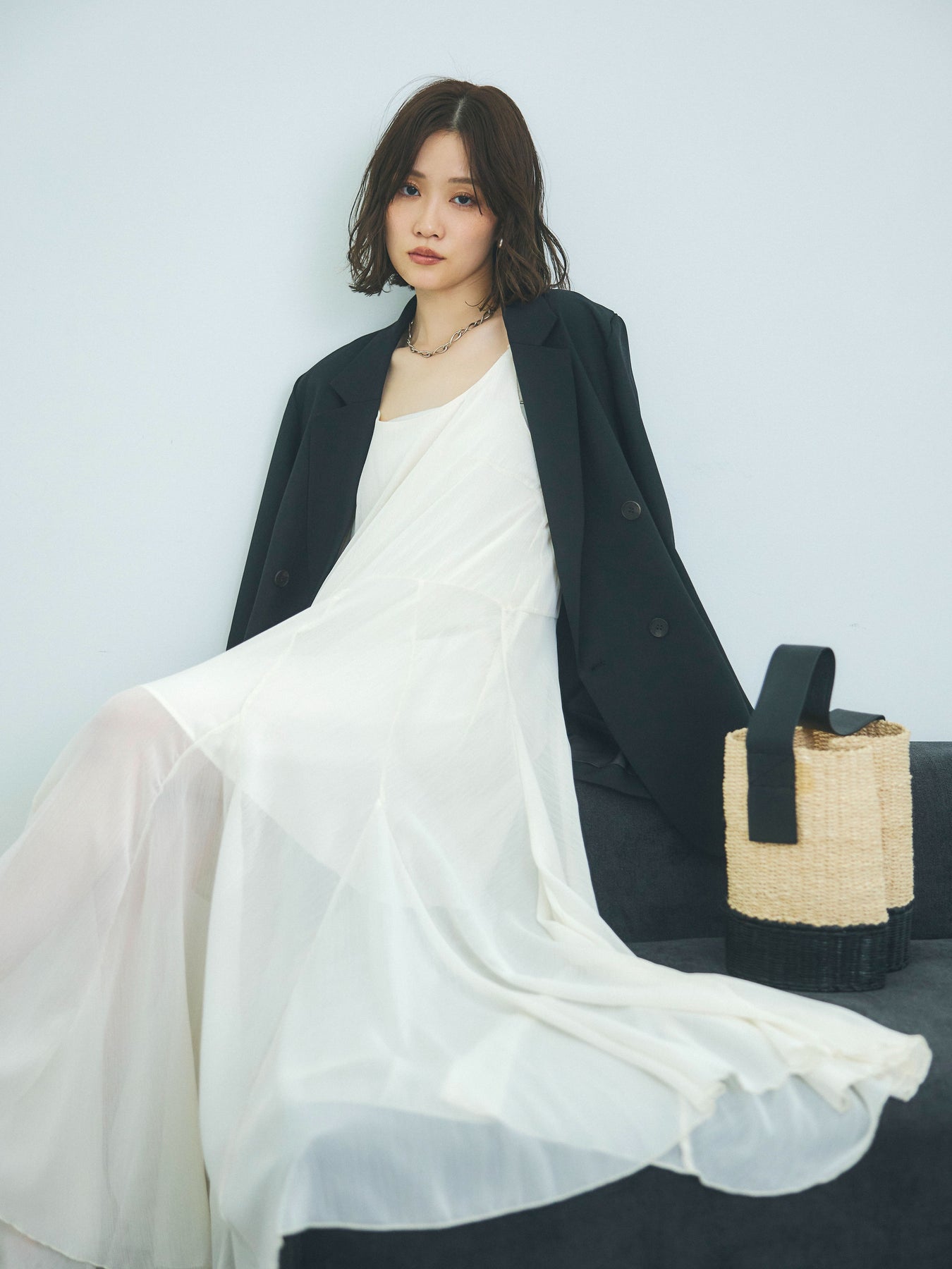 A camisole dress with a light sheer material and a striking bow tie design. The delicate sheer fabric sways softly with movement, adding a touch of effortless elegance and glamour to your styling. The mplebow tie tail then leat the nem 片 集 y mple leh. and sophisticated look. The moderately relaxed silhouette allows for comfortable wear, and it can be styled in various ways depending on how you layer it with innerwear. It's perfect for wearing on its own but al'sed orremends ” it versatile for a wide range of occasions, from daily wear to going out. *Please note that innerwear is not included with any items other than bottoms and camisoles (innerwear).