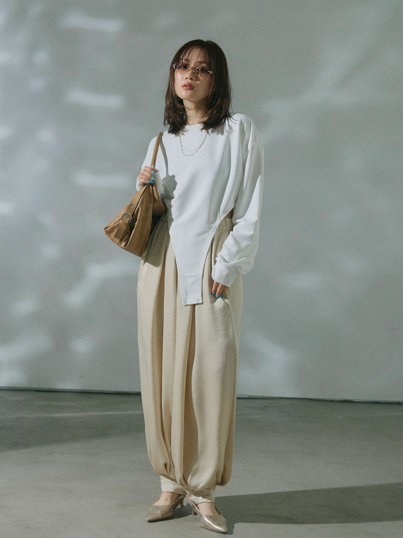 スウェットライクな素材感でラフさときちんと感を両立したボディスーツ。程よくフィットするシルエットが身体のラインをすっきりと見せ、インせずともスタイリングが決まるのが魅力です。本体は軽やかなポリエステル素材、リブ部分には伸縮性のある混紡素材を使用し、快適な着心地を実現。デニムやスラックス、スカートまで幅広く合わせやすく、デイリーに活躍する一着です。