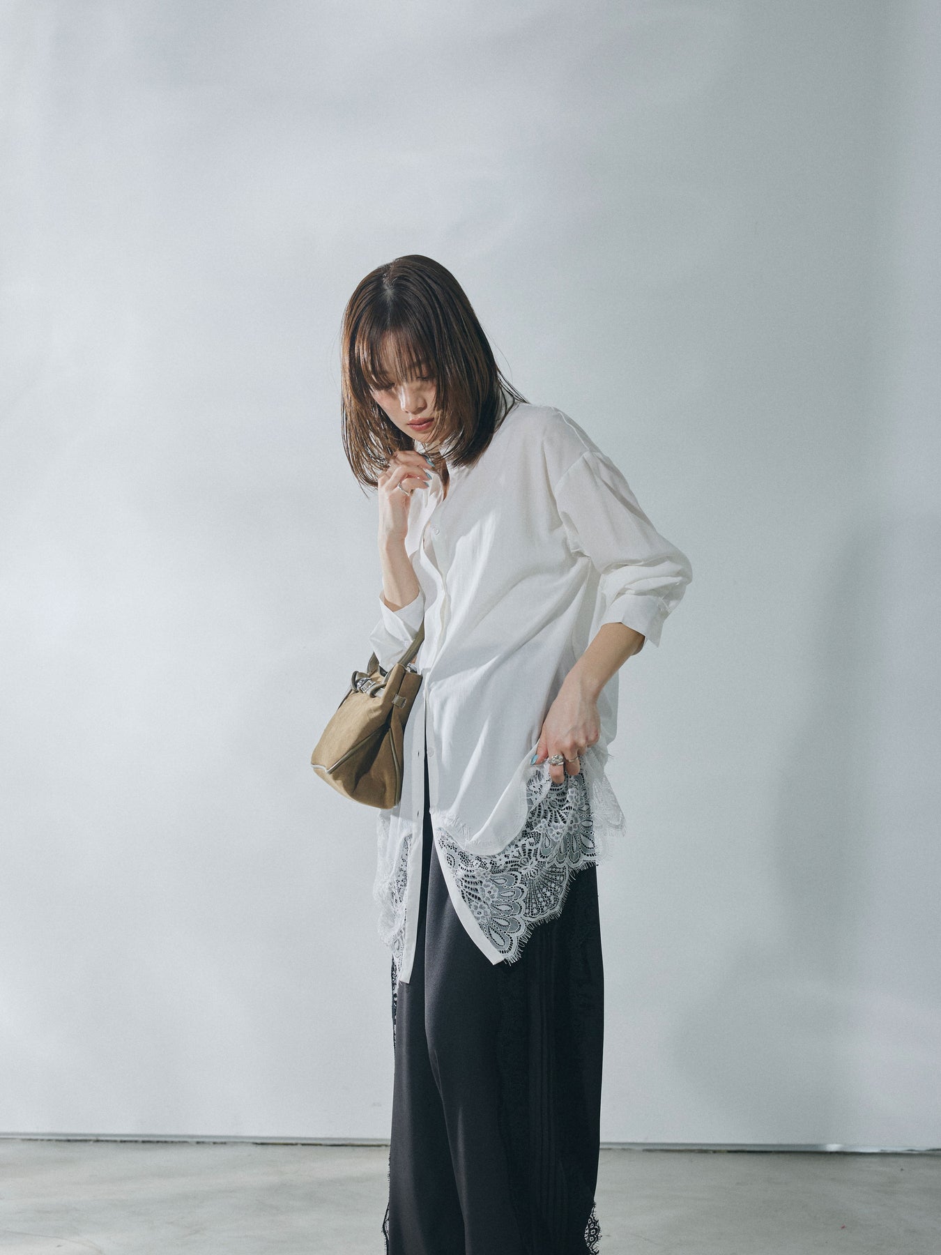 ハリ感のあるポプリン素材に、裾レースをあしらった上品な印象のシャツ。シンプルなデザインをベースに、裾のレースディテールがさりげない華やかさと抜け感をプラスします。程よくゆとりのあるシルエットで一枚着としてはもちろん、レイヤードスタイルにも取り入れやすく、デイリーからお出かけまで幅広く活躍する一着です。