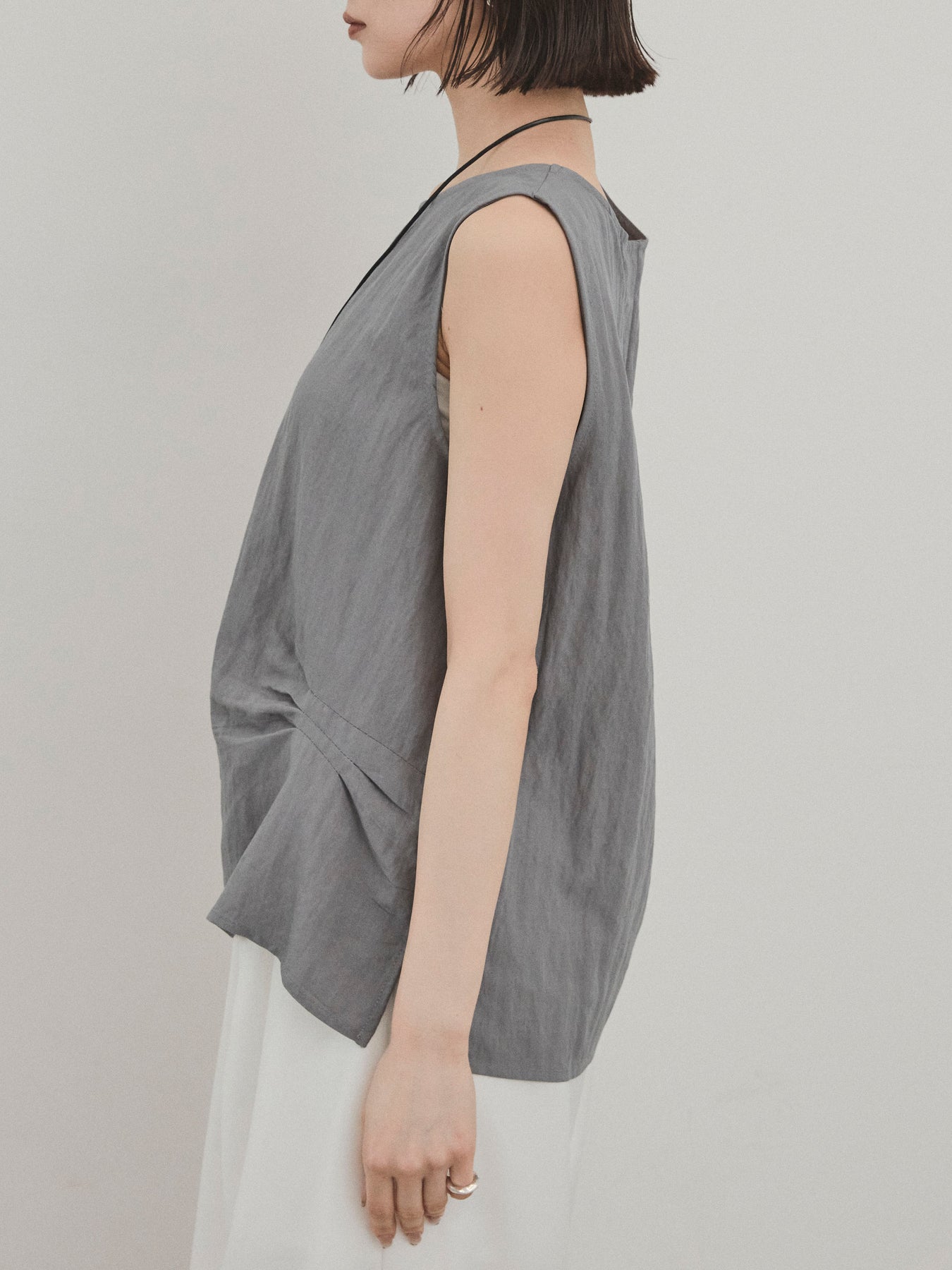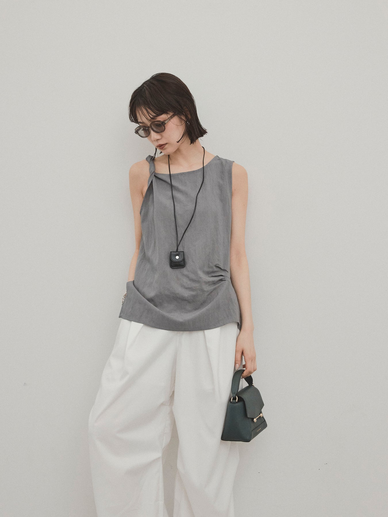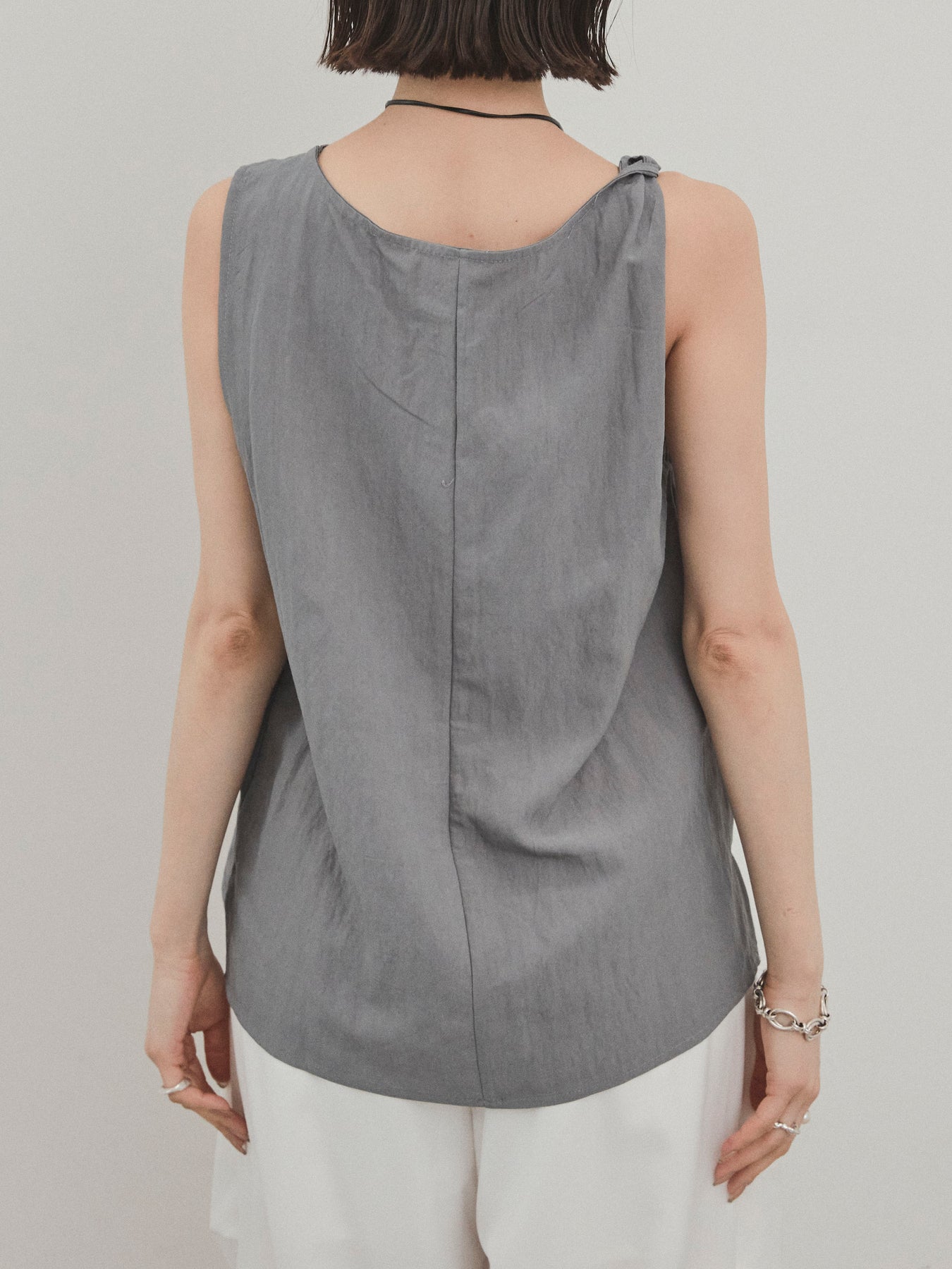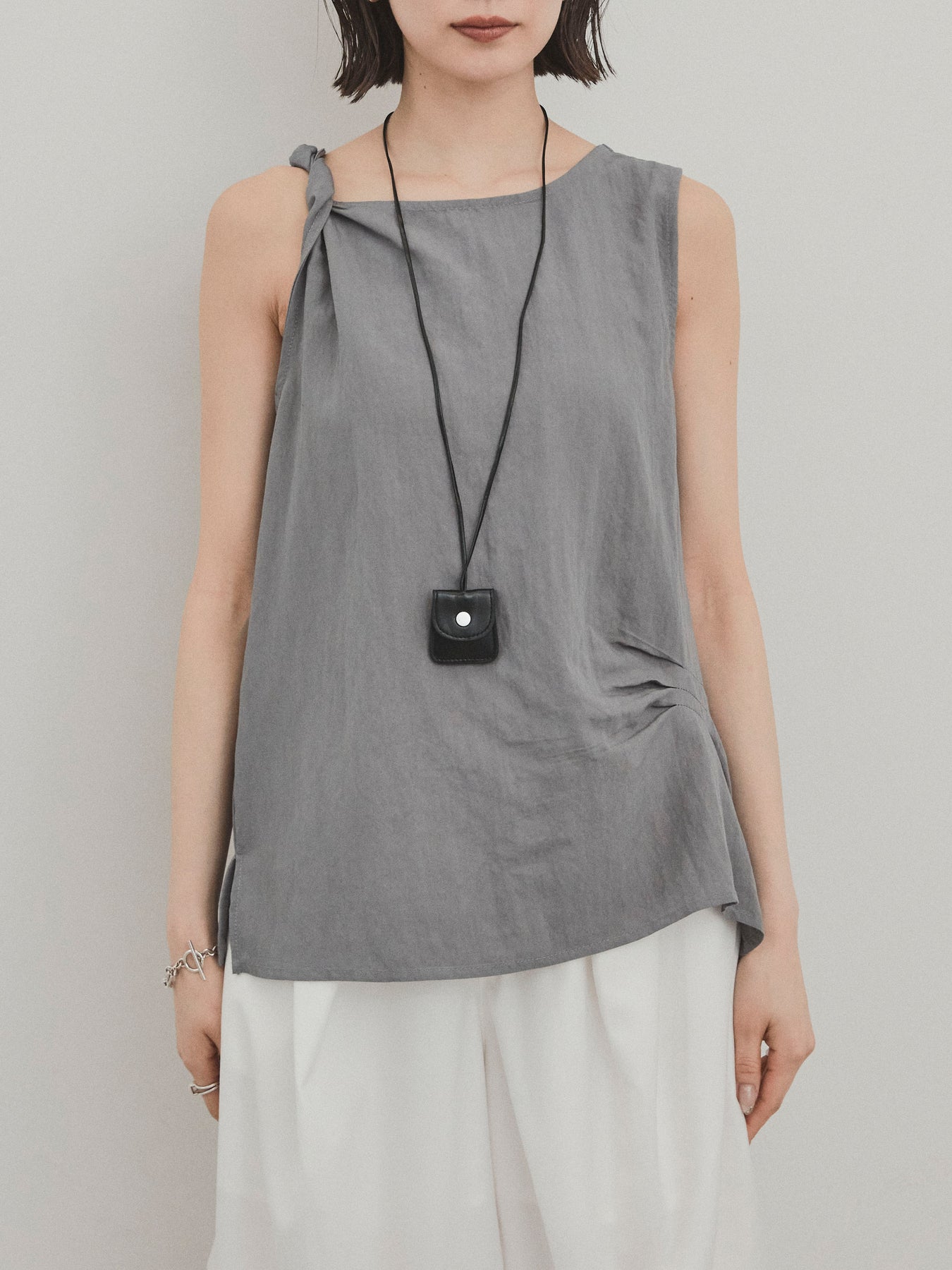 無袖上衣,採用令人印象深刻的扭曲肩部設計,散發出精緻的外觀。 這種材質手感乾燥,輕便,即使在炎熱的天氣穿著也很舒適。 扭曲的細節增加了造型的深度,但仍然很簡單。 套裝中的皮革項鍊是可拆卸的,因此您可以根據自己的心情和服裝隨意搭配。 它與寬褲和牛仔褲很相配,與裙子搭配時也能營造出女性化的外觀。 這是一款多功能上衣,單獨穿著看起來很棒,並且散發著時尚的感覺。