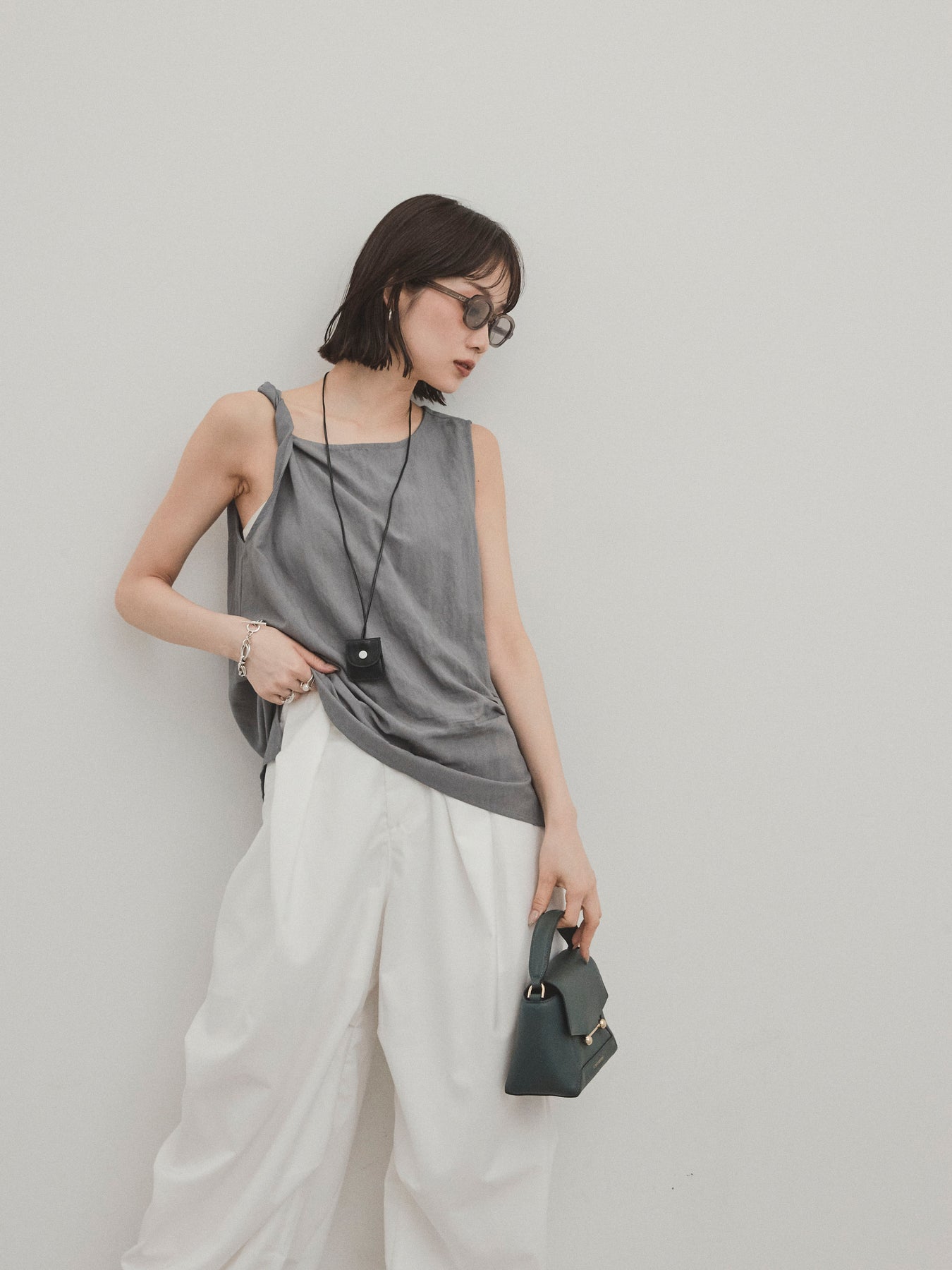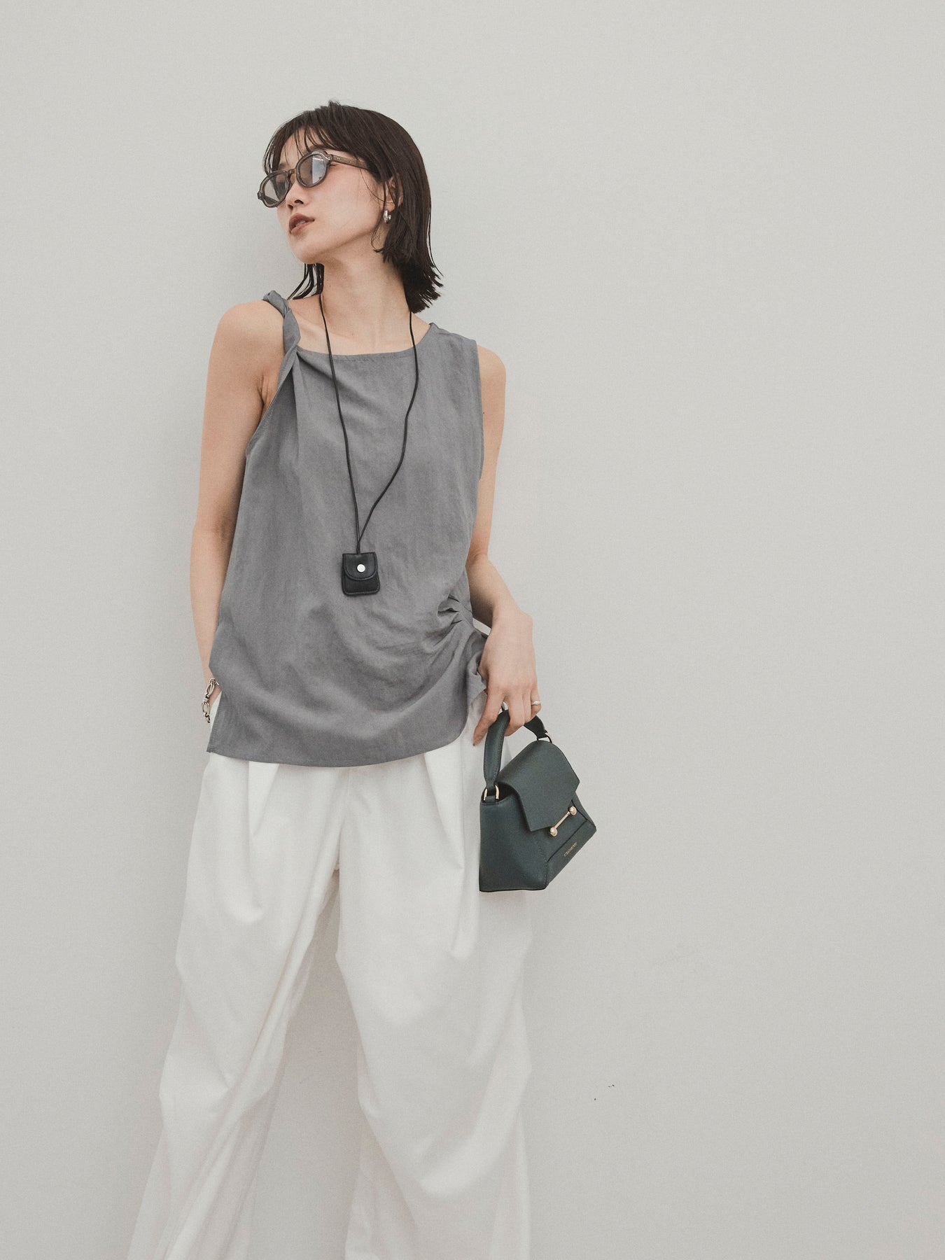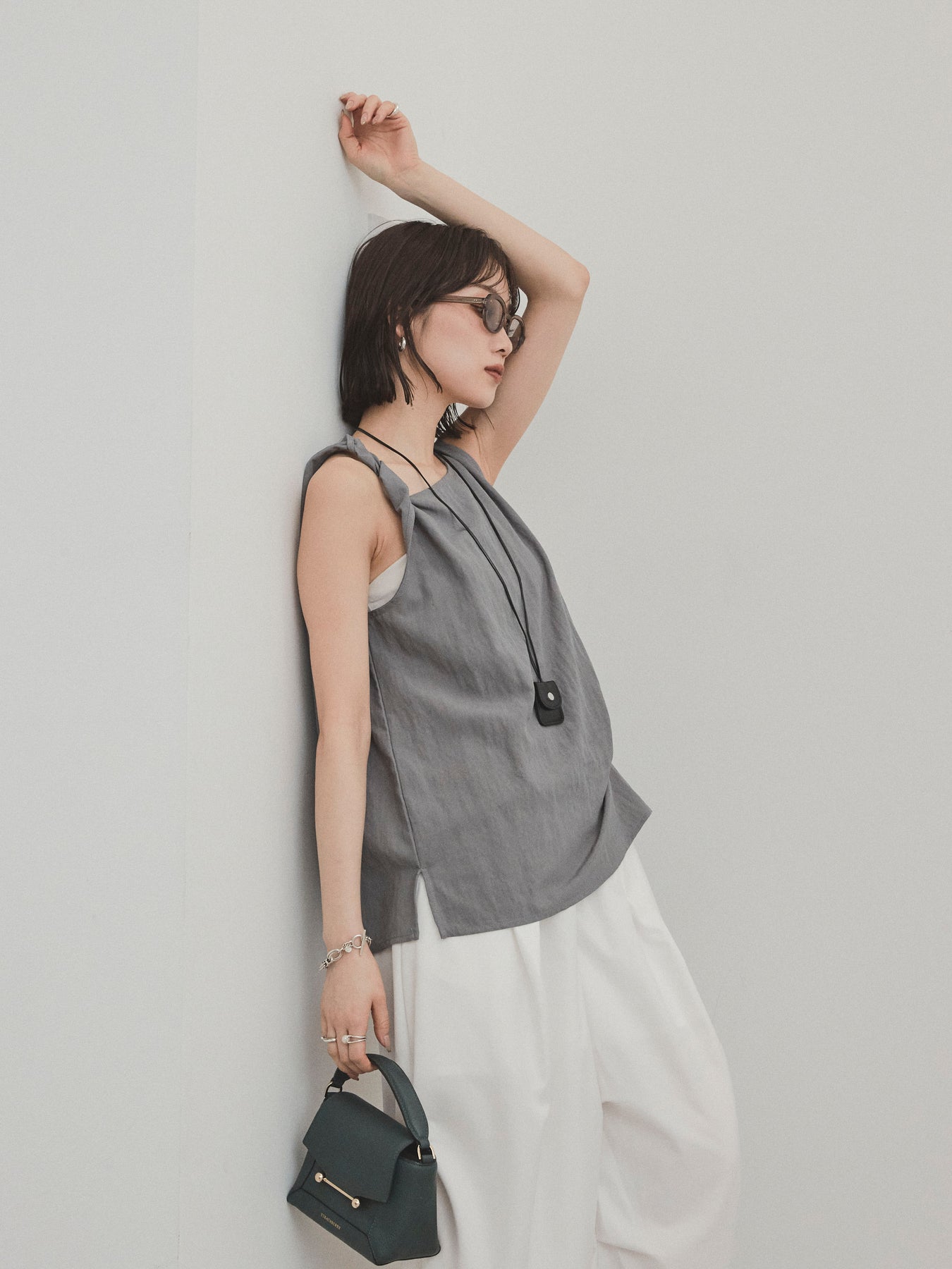 無袖上衣,採用令人印象深刻的扭曲肩部設計,散發出精緻的外觀。 這種材質手感乾燥,輕便,即使在炎熱的天氣穿著也很舒適。 扭曲的細節增加了造型的深度,但仍然很簡單。 套裝中的皮革項鍊是可拆卸的,因此您可以根據自己的心情和服裝隨意搭配。 它與寬褲和牛仔褲很相配,與裙子搭配時也能營造出女性化的外觀。 這是一款多功能上衣,單獨穿著看起來很棒,並且散發著時尚的感覺。