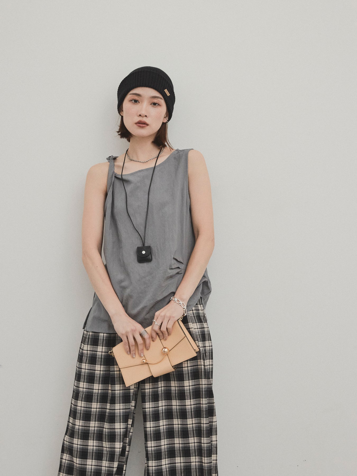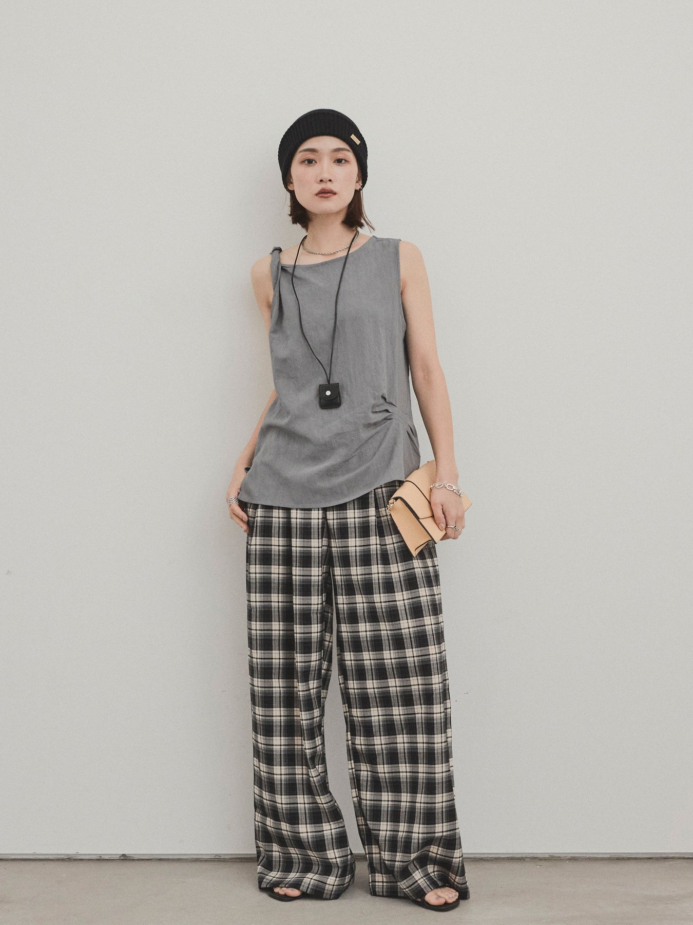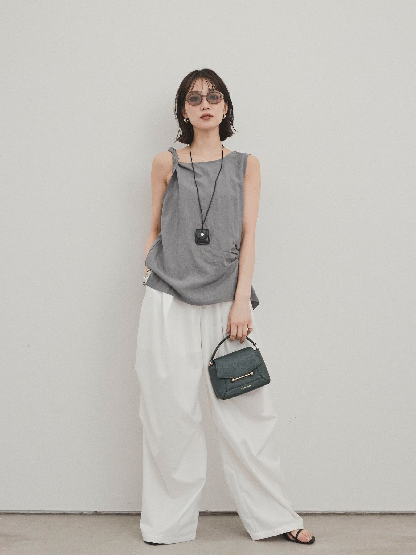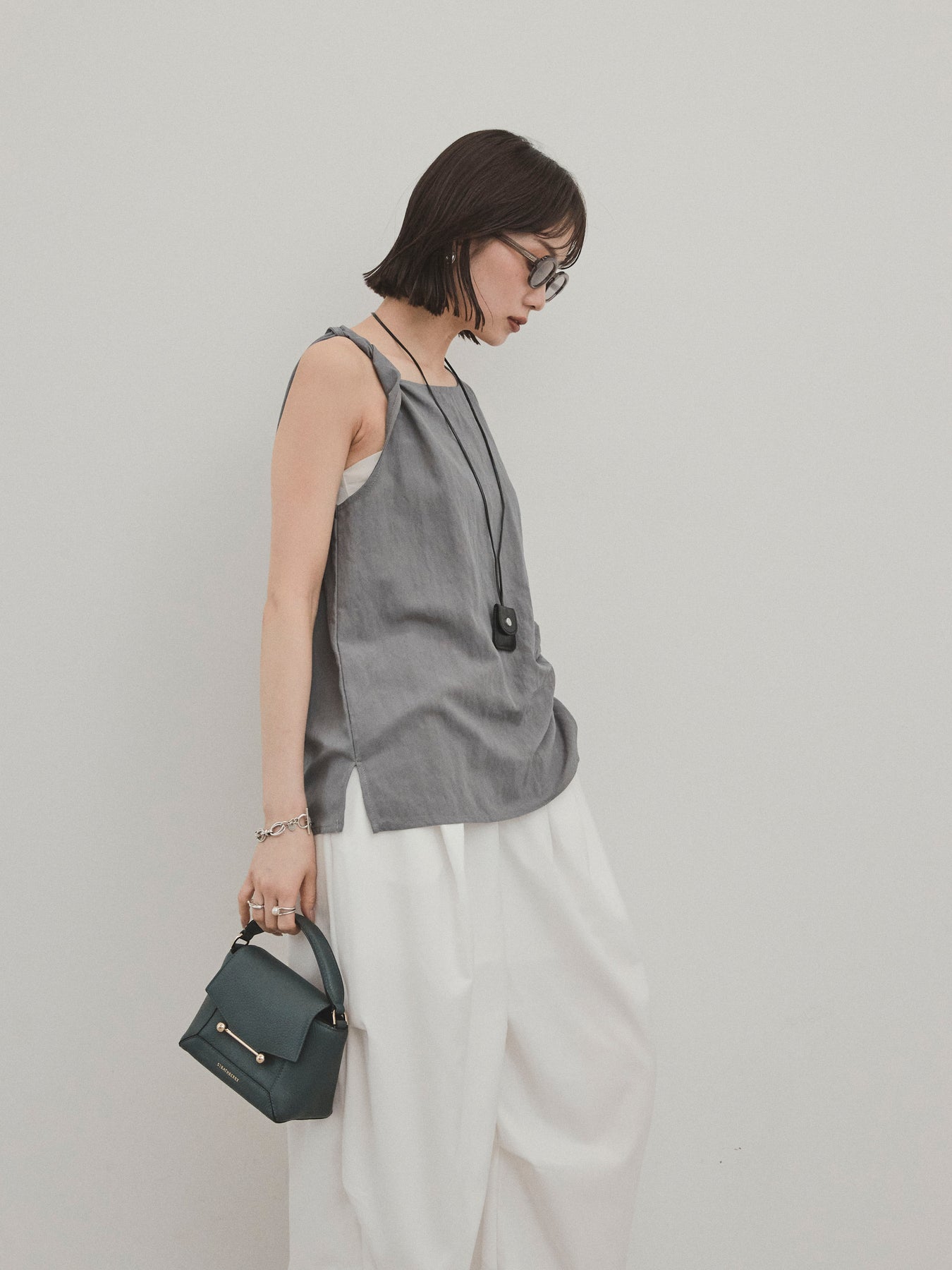 無袖上衣,採用令人印象深刻的扭曲肩部設計,散發出精緻的外觀。 這種材質手感乾燥,輕便,即使在炎熱的天氣穿著也很舒適。 扭曲的細節增加了造型的深度,但仍然很簡單。 套裝中的皮革項鍊是可拆卸的,因此您可以根據自己的心情和服裝隨意搭配。 它與寬褲和牛仔褲很相配,與裙子搭配時也能營造出女性化的外觀。 這是一款多功能上衣,單獨穿著看起來很棒,並且散發著時尚的感覺。