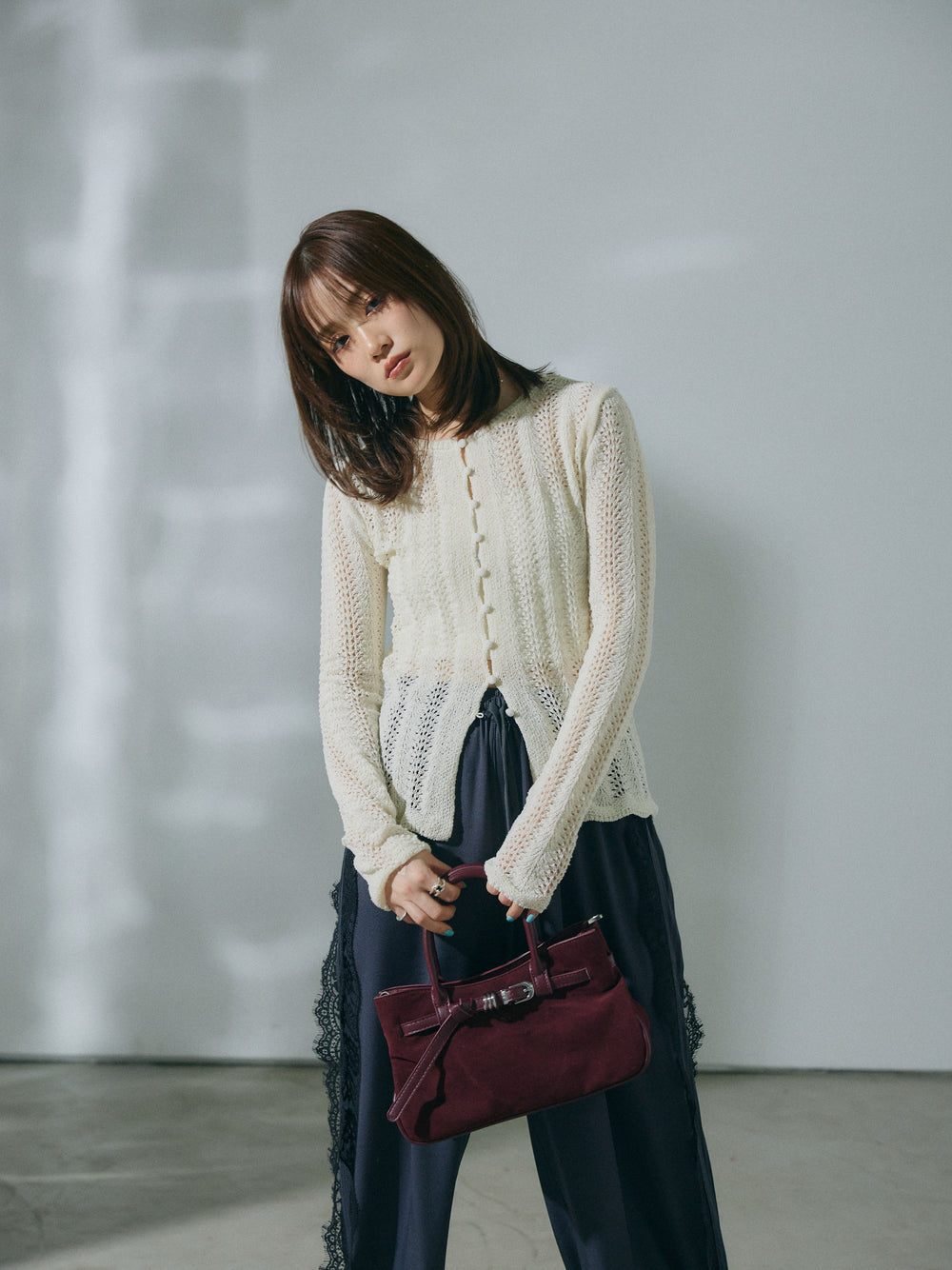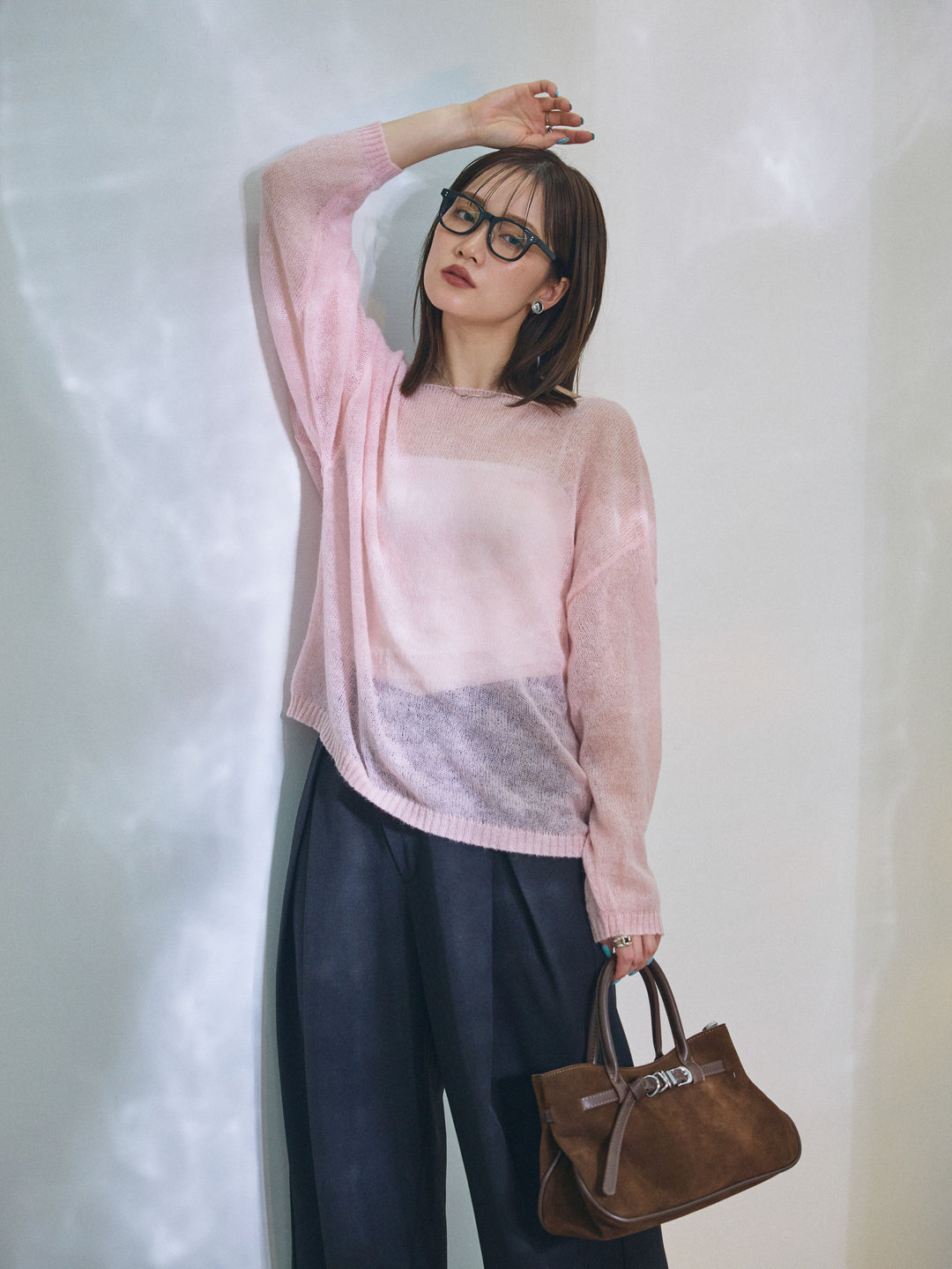 [予約]モヘアタッチ透かし編みボートネックニットプルオーバー/pink
