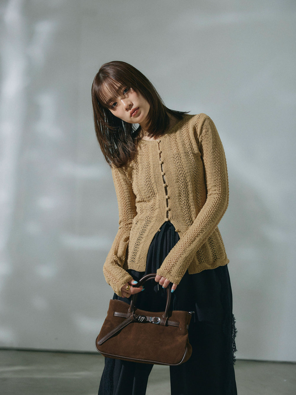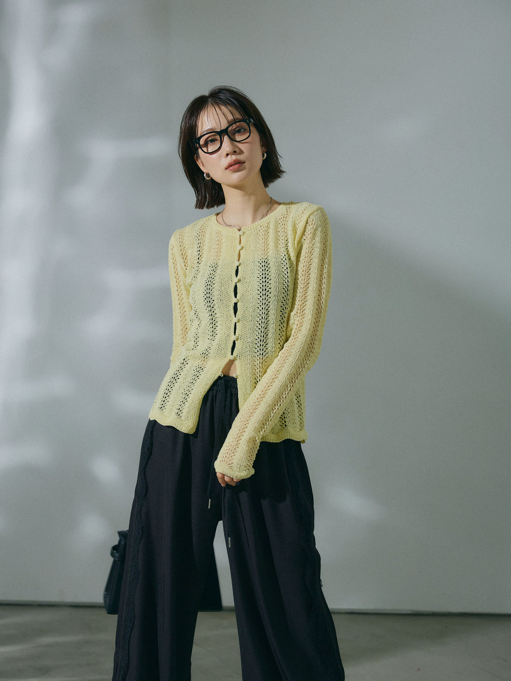 [予約]モヘアタッチ透かし編みボートネックニットプルオーバー/yellow