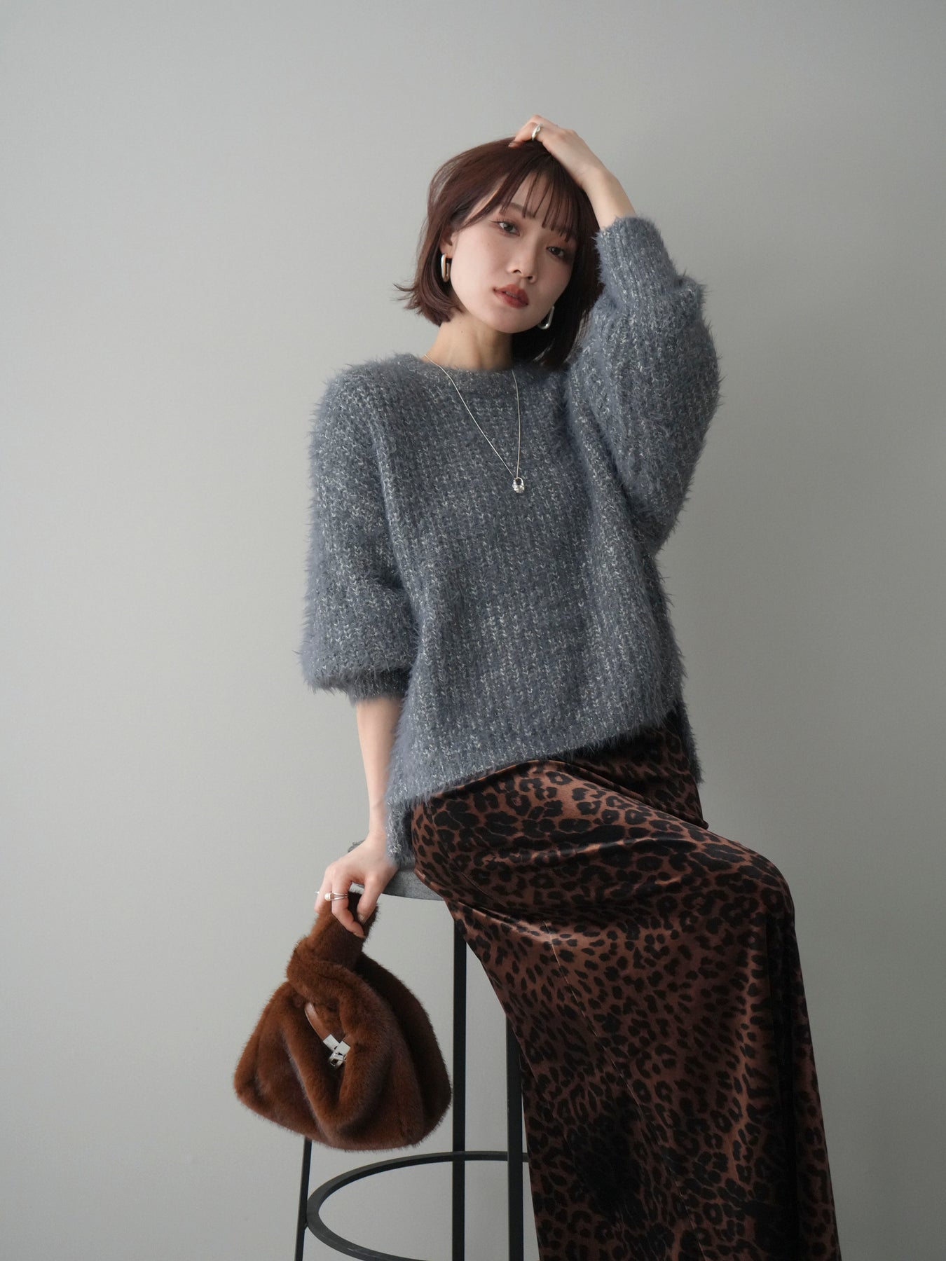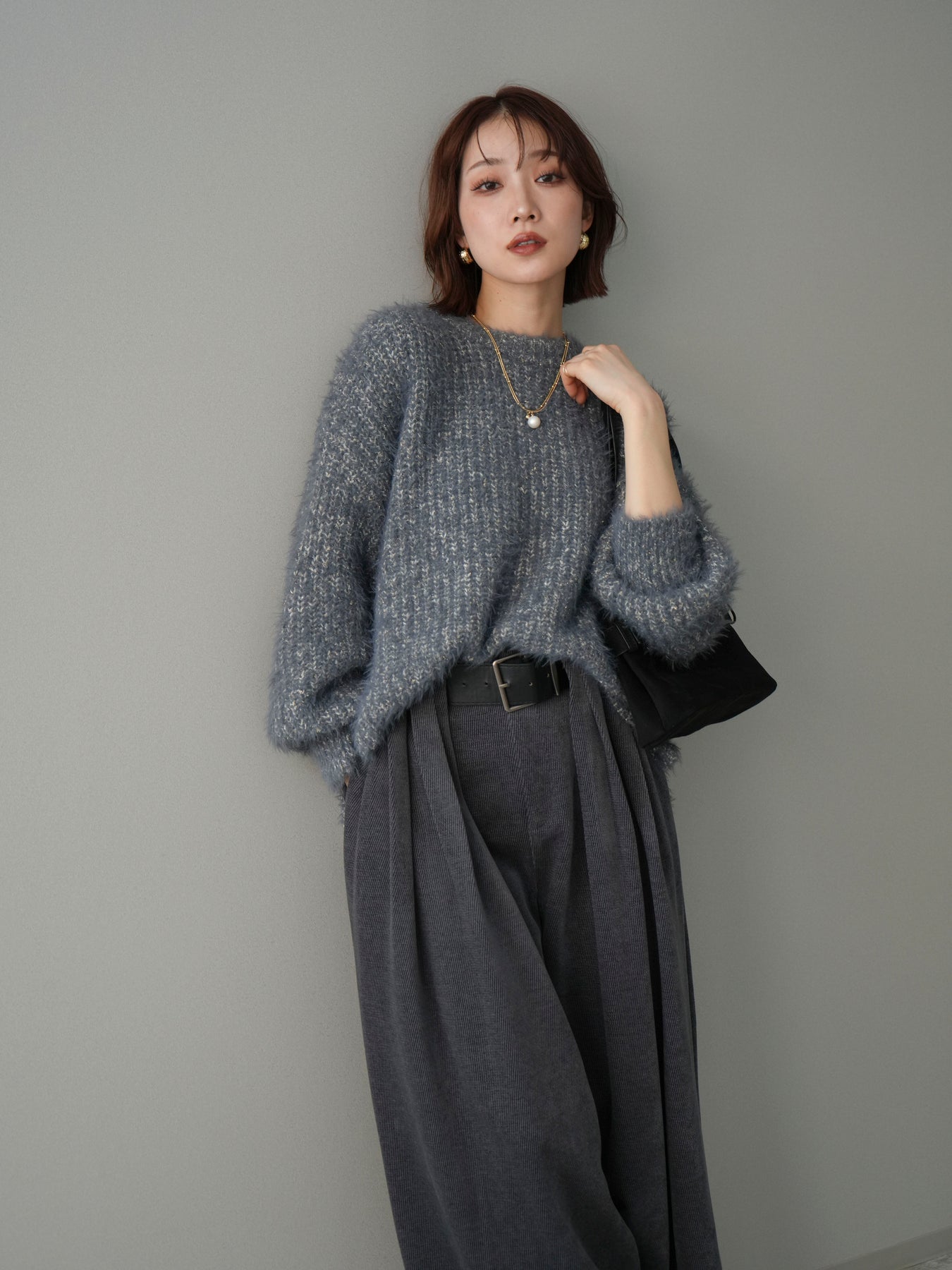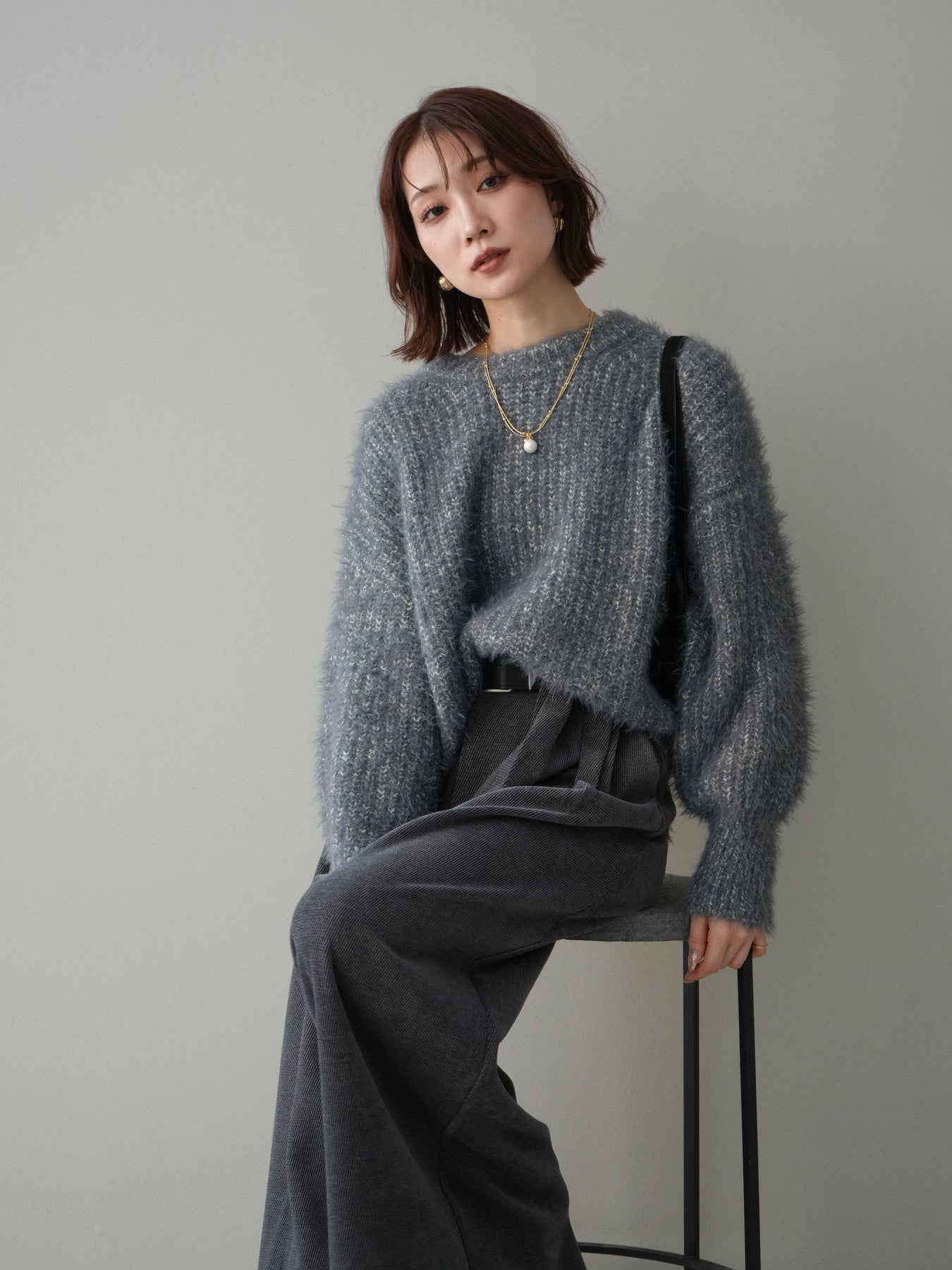 シャギー感のあるミックスニット素材を使用したプルオーバー。ふんわりとしたボリュームスリーブが程よい存在感を演出し、シンプルながらも着映えするデザインに仕上げています。一枚でコーディネートが決まり、デイリーに取り入れやすい一着です。