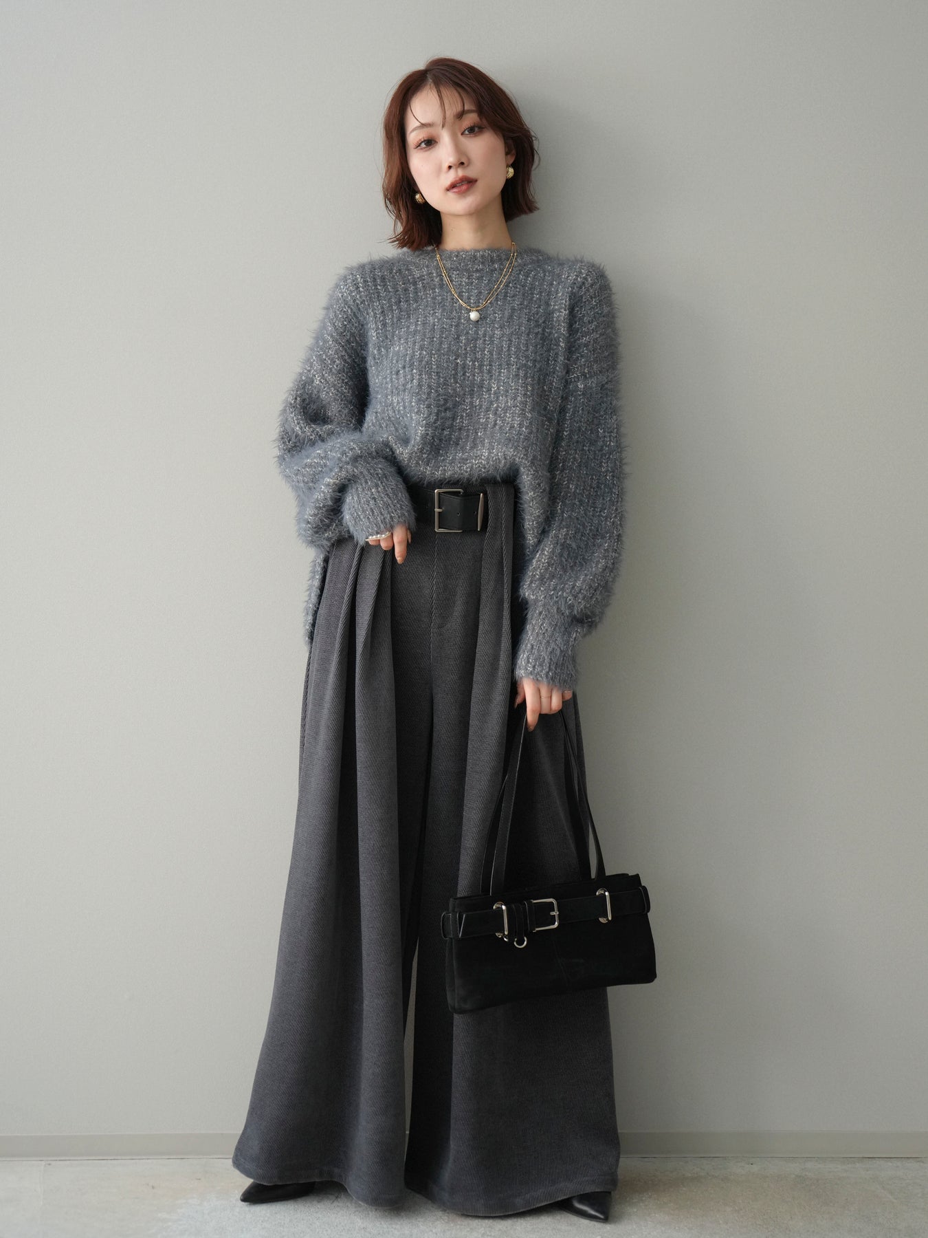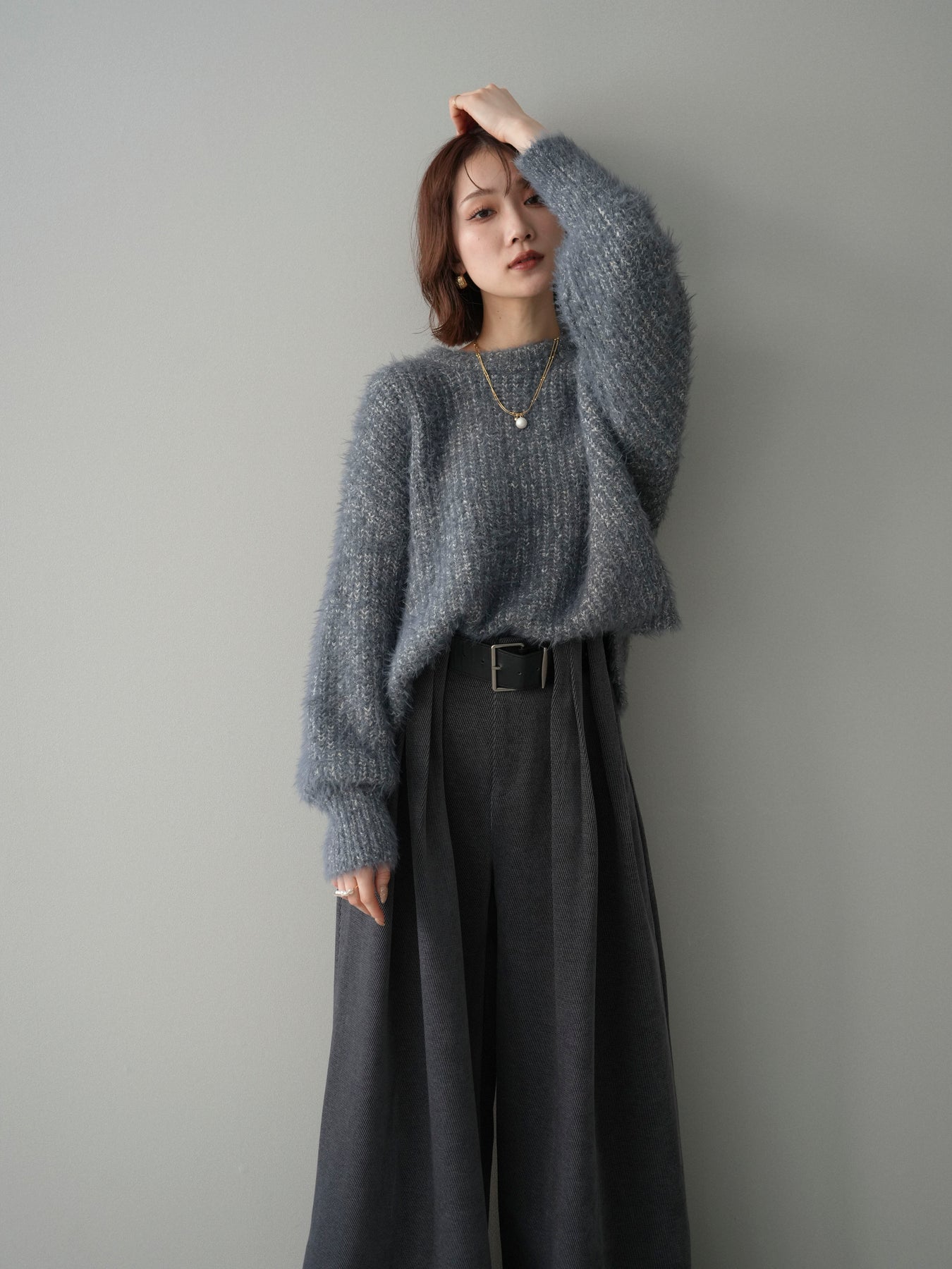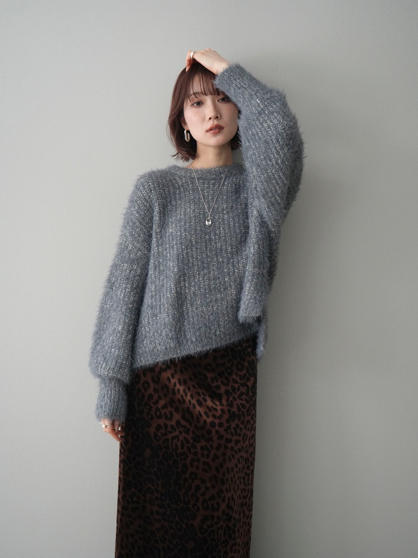 シャギー感のあるミックスニット素材を使用したプルオーバー。ふんわりとしたボリュームスリーブが程よい存在感を演出し、シンプルながらも着映えするデザインに仕上げています。一枚でコーディネートが決まり、デイリーに取り入れやすい一着です。