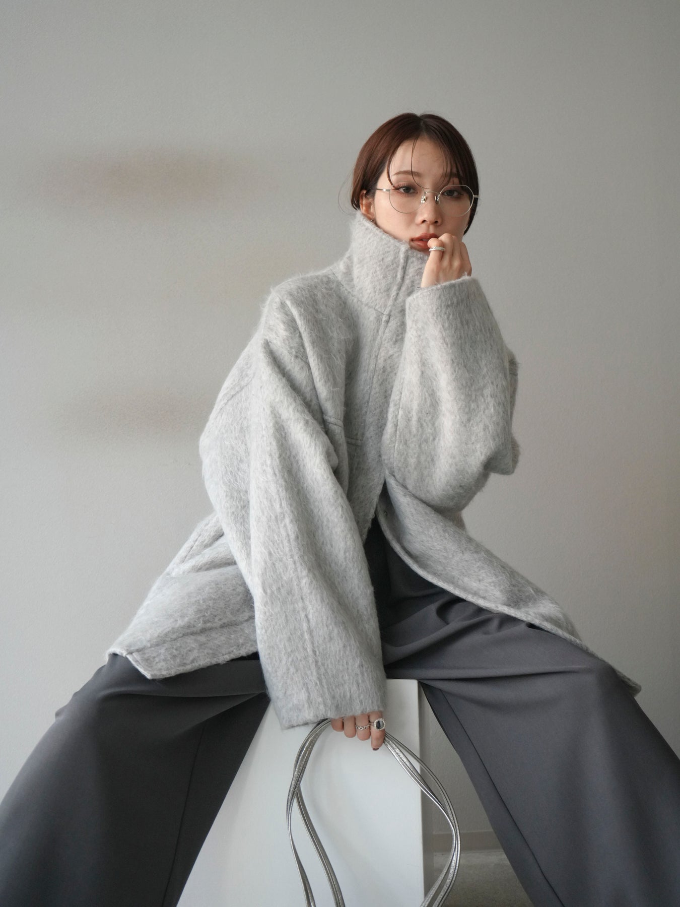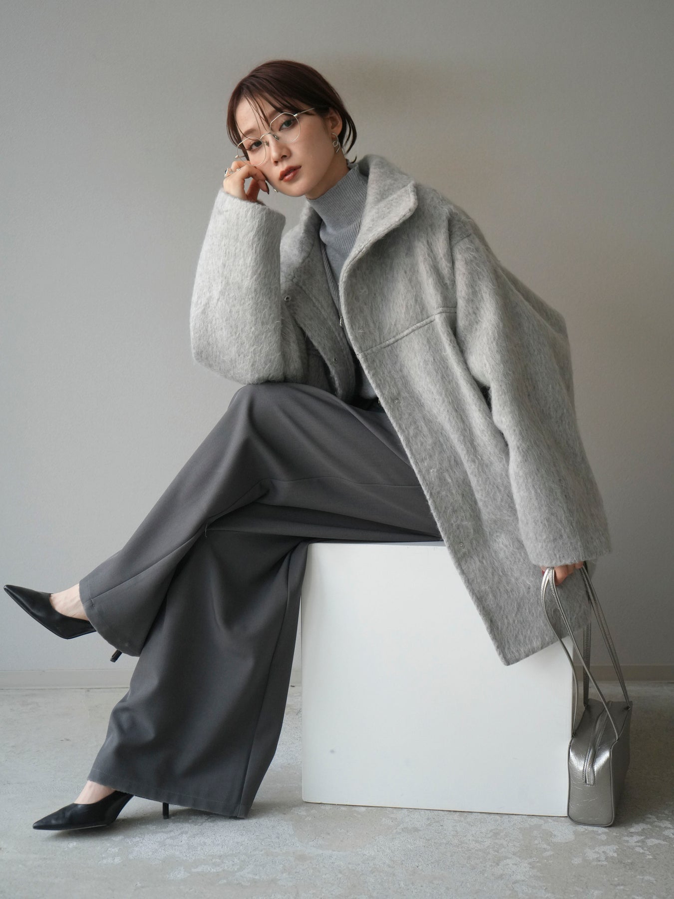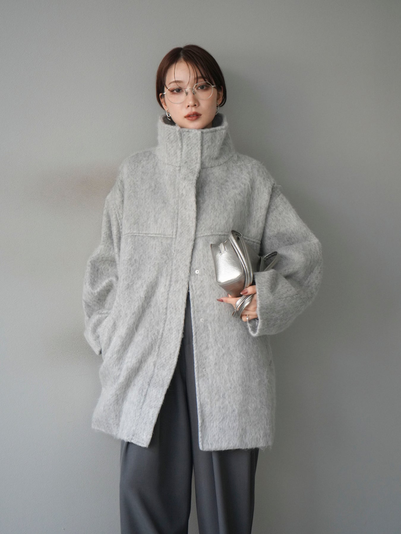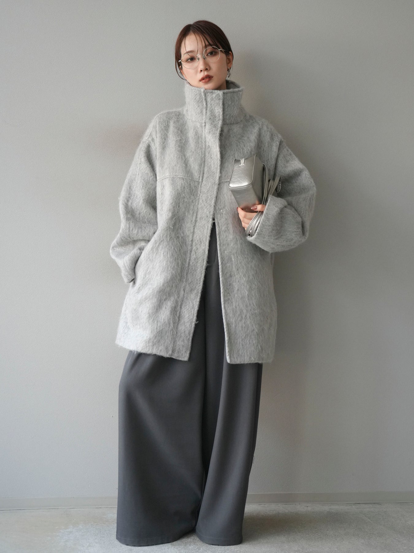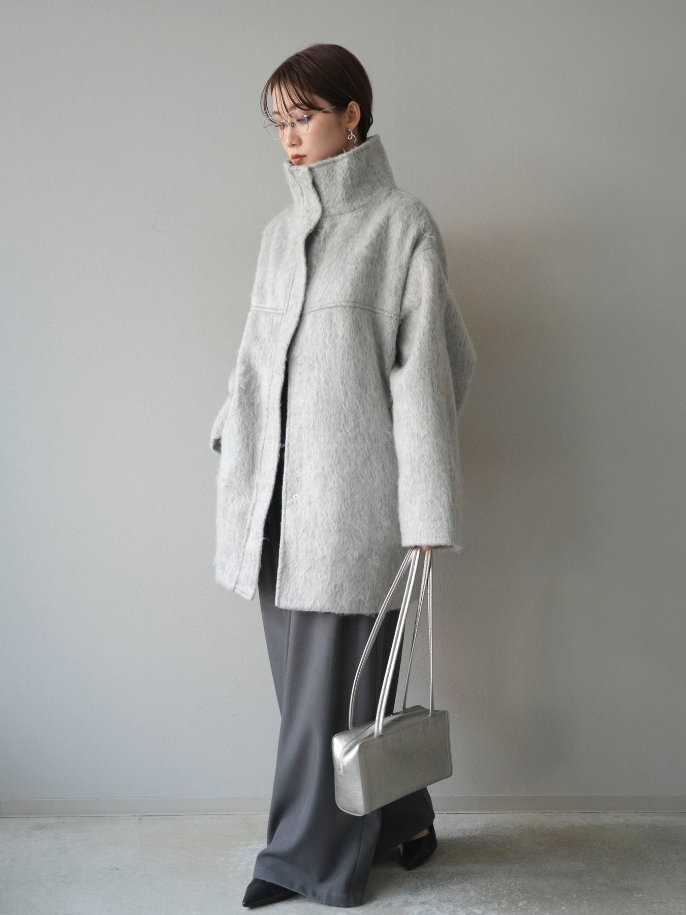 ふんわりとしたシャギー素材が上品な印象を与えるスタンドカラーコート。 柔らかな風合いと軽やかな着心地で、冬の装いにぬくもりをプラスします。 スタンドカラーが顔まわりをすっきり見せつつ、首元までしっかり暖かく包み込むデザイン。 ヒップまで隠れるミドル丈で、バランスの取りやすいシルエットも魅力です。 シンプルながらも素材の表情が引き立つ1着で、カジュアルにもきれいめにも合わせやすい万能アウターです。 ※ボトムス、キャミソール(インナー)以外の商品は一律でインナーは付属していません。