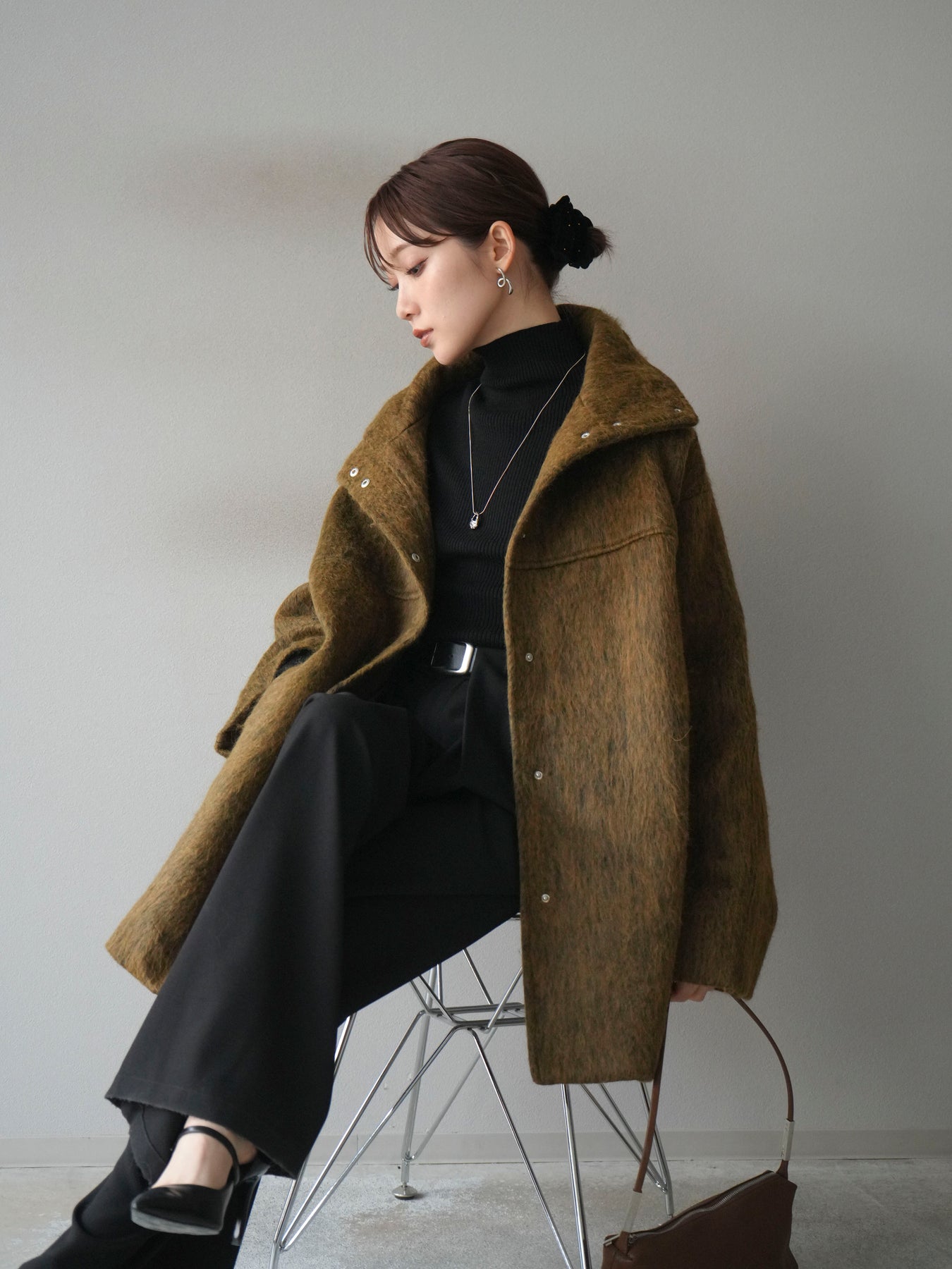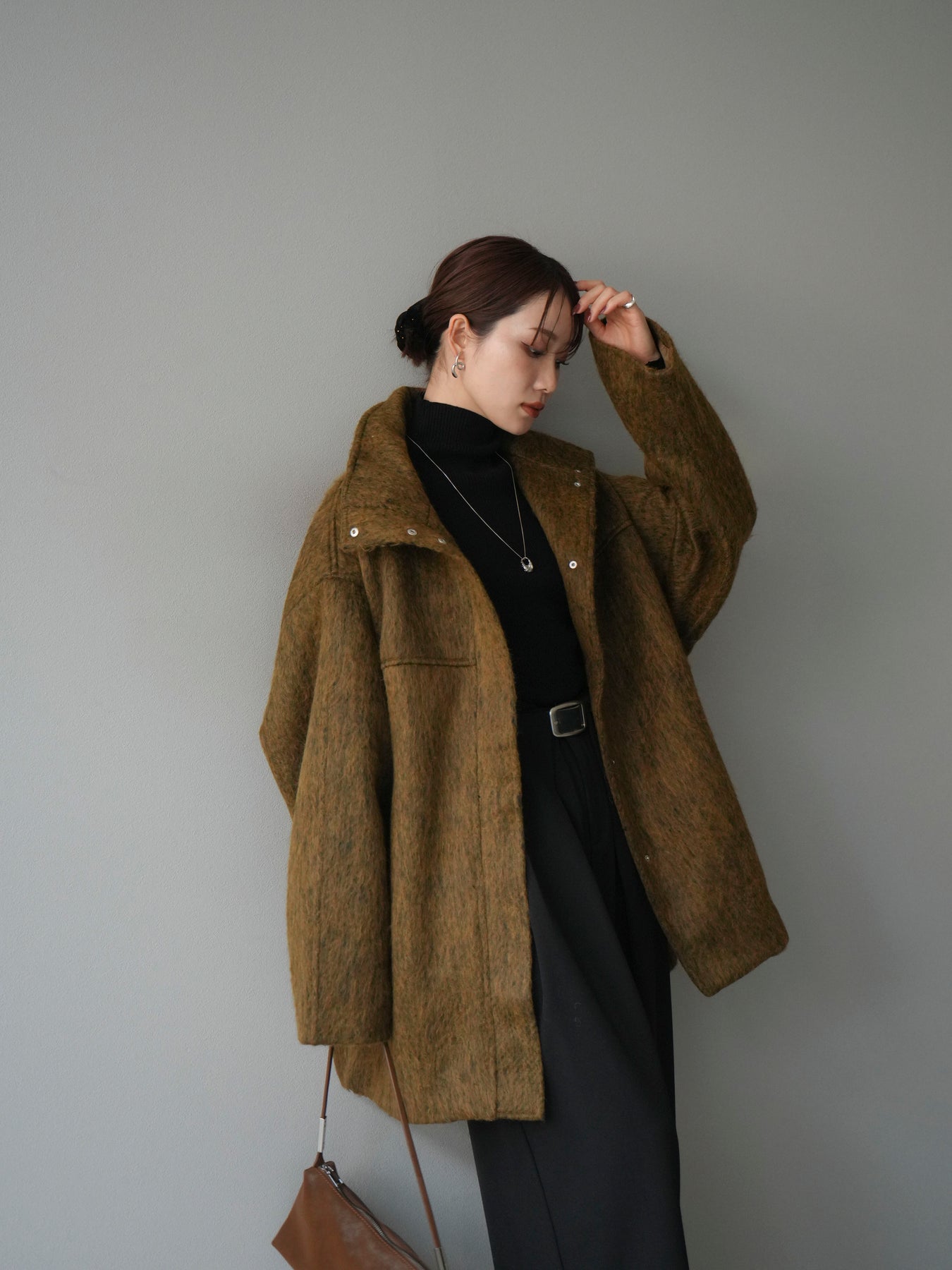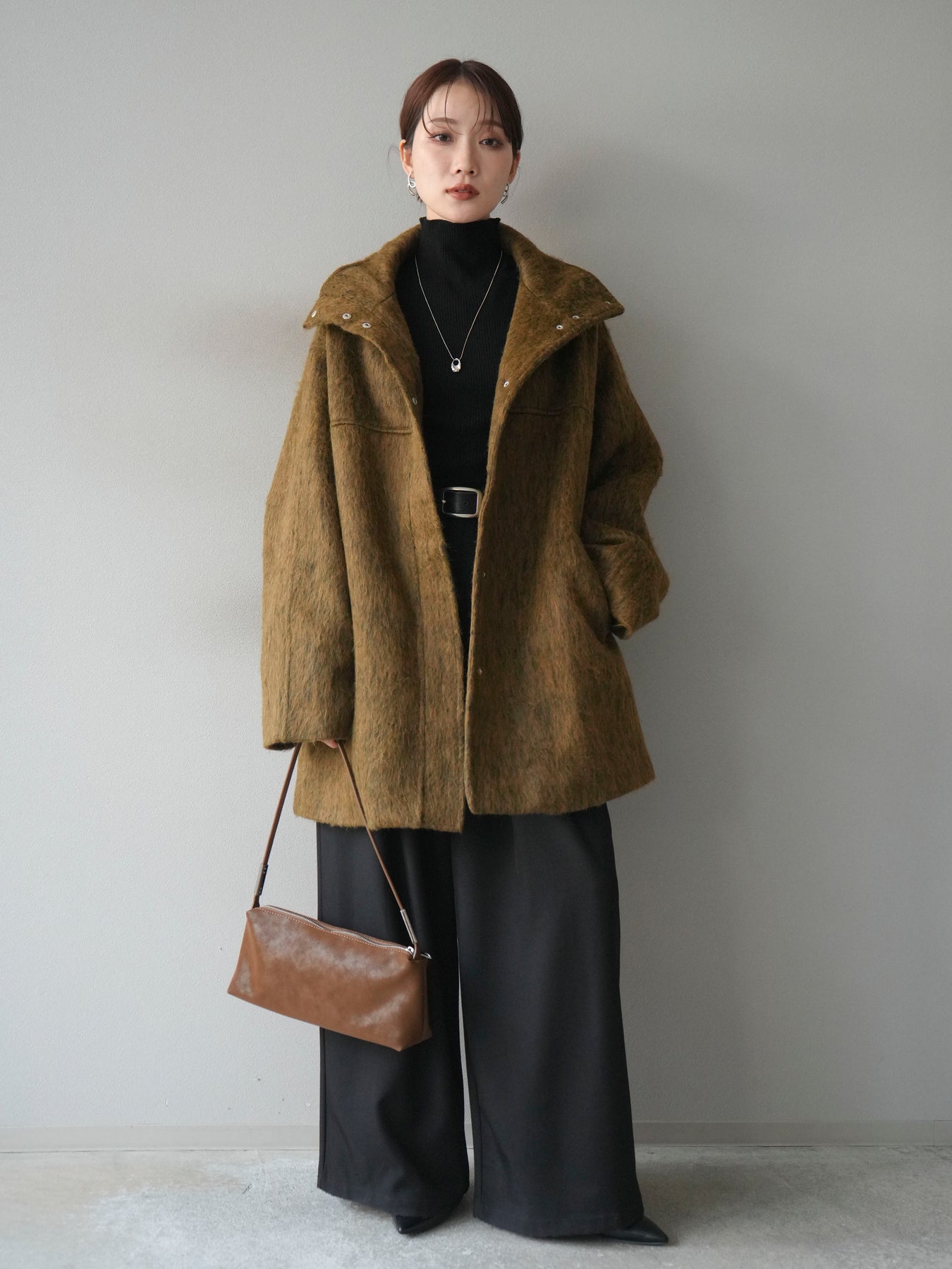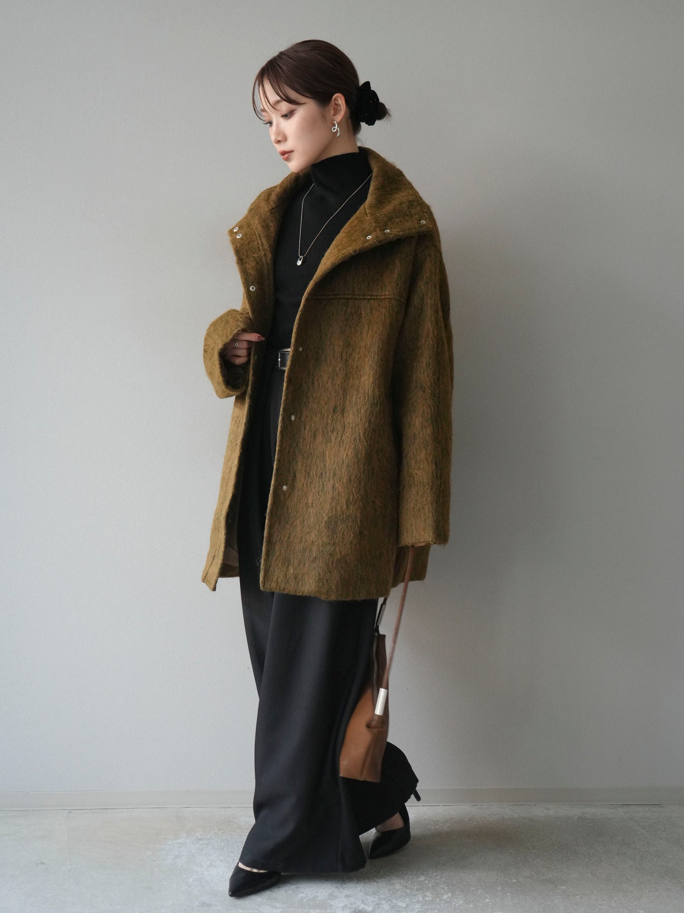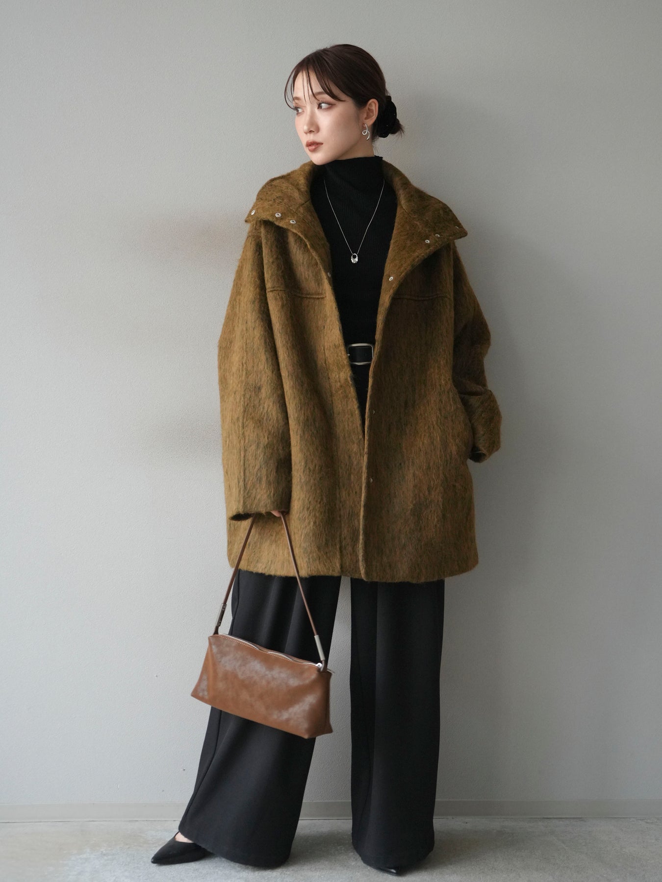 ふんわりとしたシャギー素材が上品な印象を与えるスタンドカラーコート。 柔らかな風合いと軽やかな着心地で、冬の装いにぬくもりをプラスします。 スタンドカラーが顔まわりをすっきり見せつつ、首元までしっかり暖かく包み込むデザイン。 ヒップまで隠れるミドル丈で、バランスの取りやすいシルエットも魅力です。 シンプルながらも素材の表情が引き立つ1着で、カジュアルにもきれいめにも合わせやすい万能アウターです。 ※ボトムス、キャミソール(インナー)以外の商品は一律でインナーは付属していません。