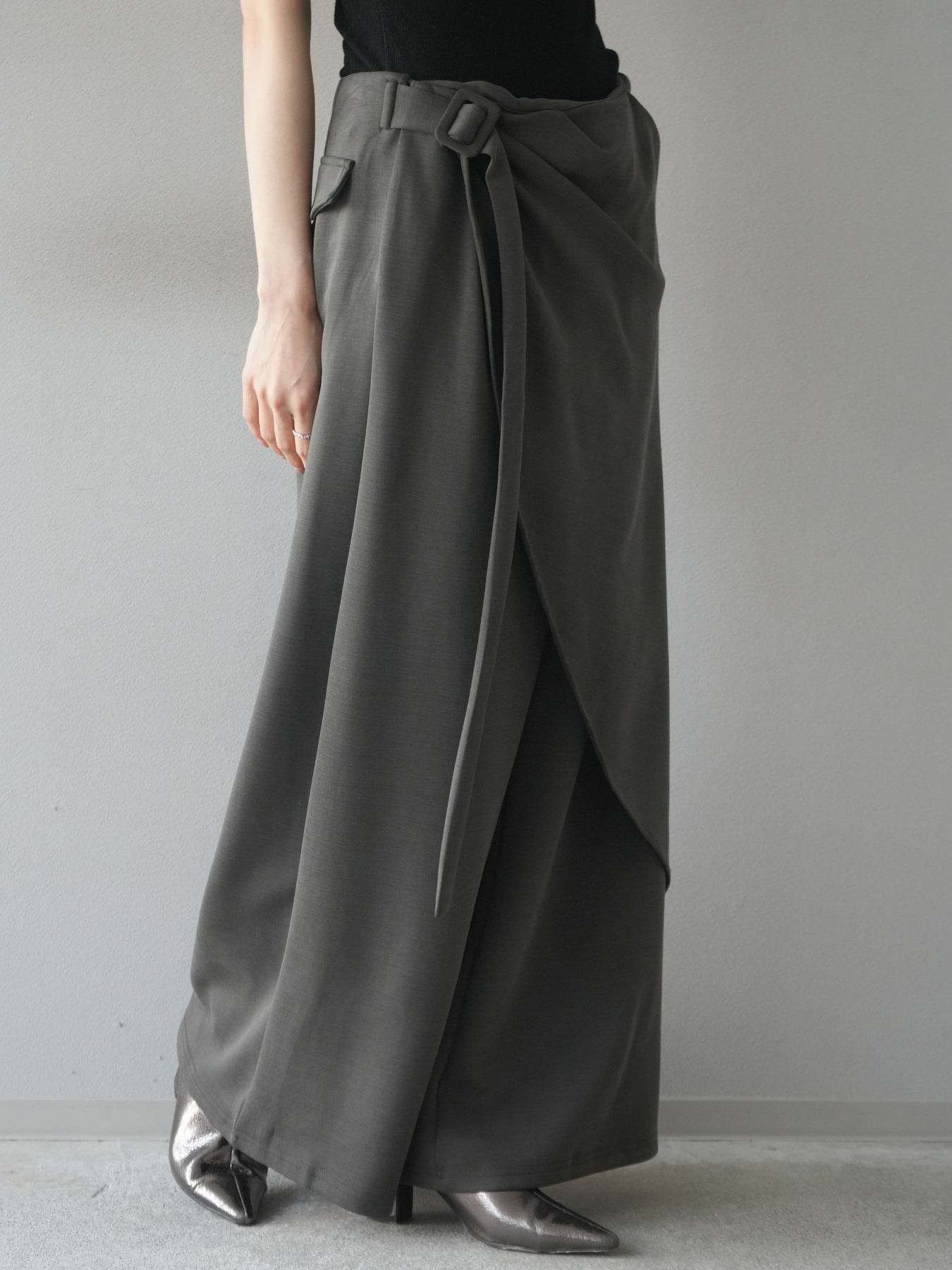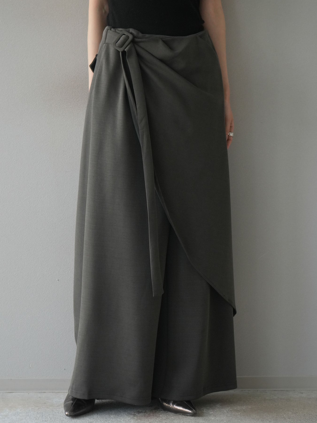 ラップデザインが印象的なポンチ素材のワイドパンツ。程よいハリ感と落ち感を兼ね備えた生地が、上品でリラクシーなシルエットを演出します。フロントに重ねられた生地が動くたびに揺れ、女性らしい抜け感をプラス。ウエストのバックルデザインがスタイリングのアクセントになり、シンプルながらも洗練された印象に仕上げています。カジュアルにもきれいめにも合わせやすく、デイリーに活躍する万能ボトムです。